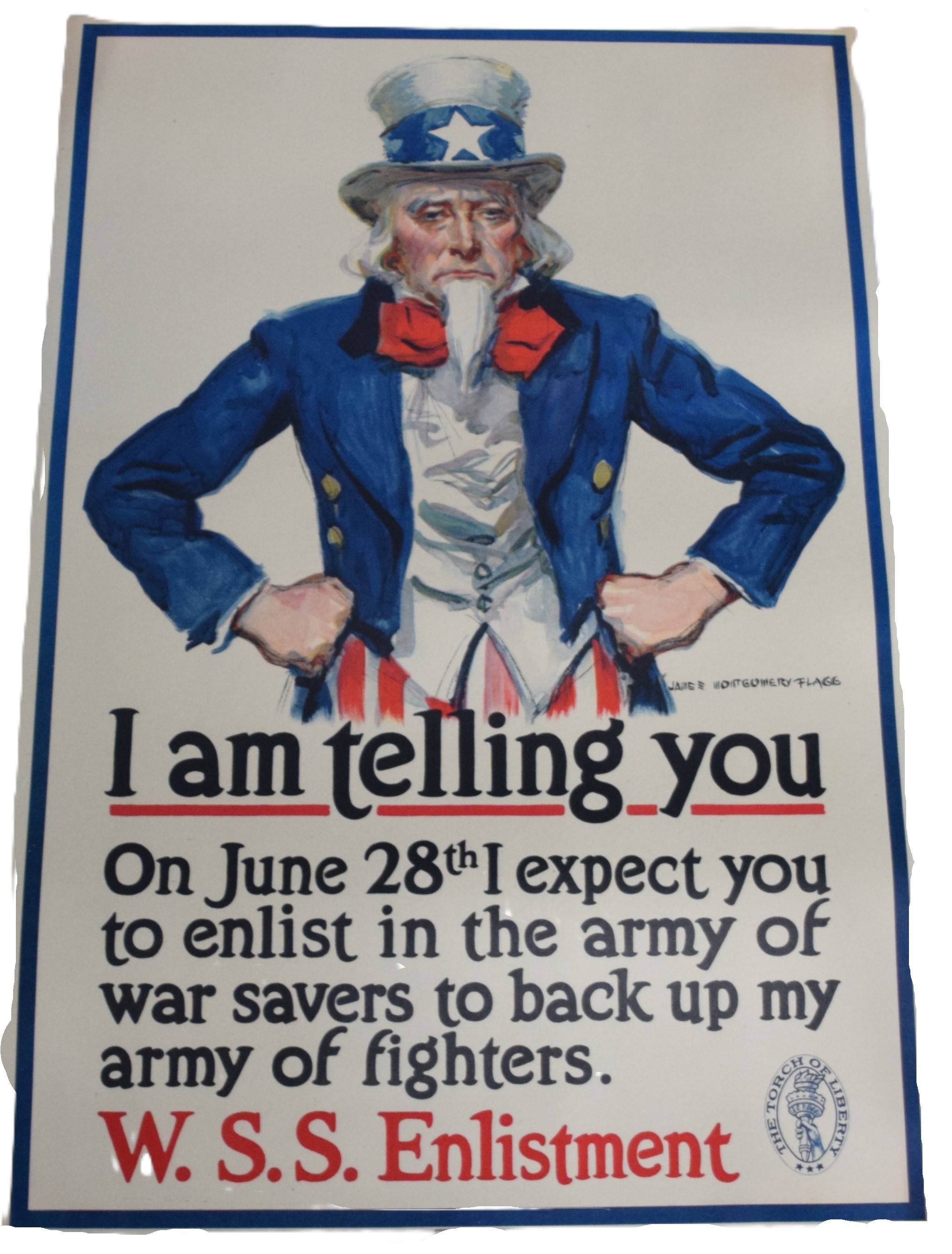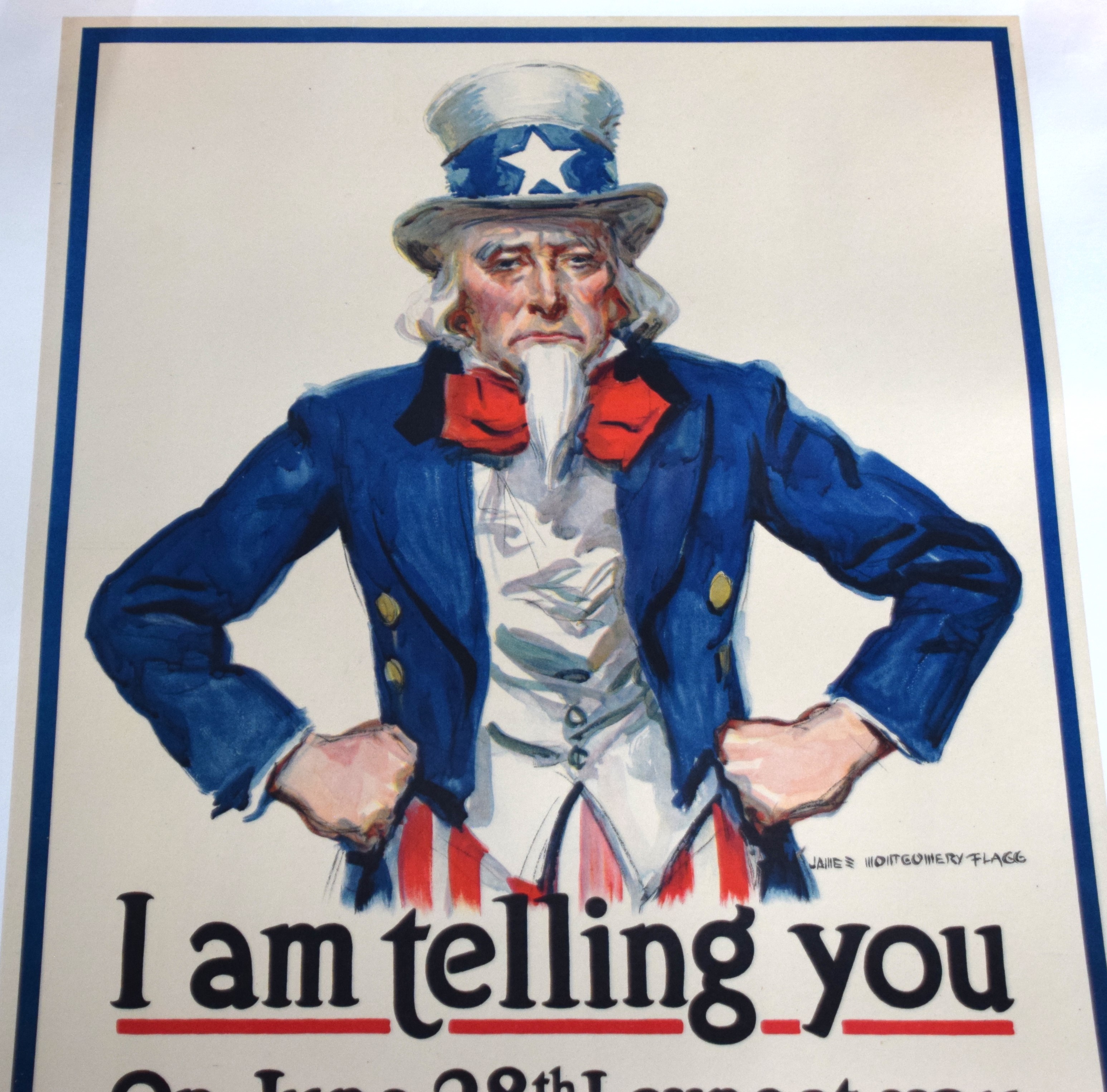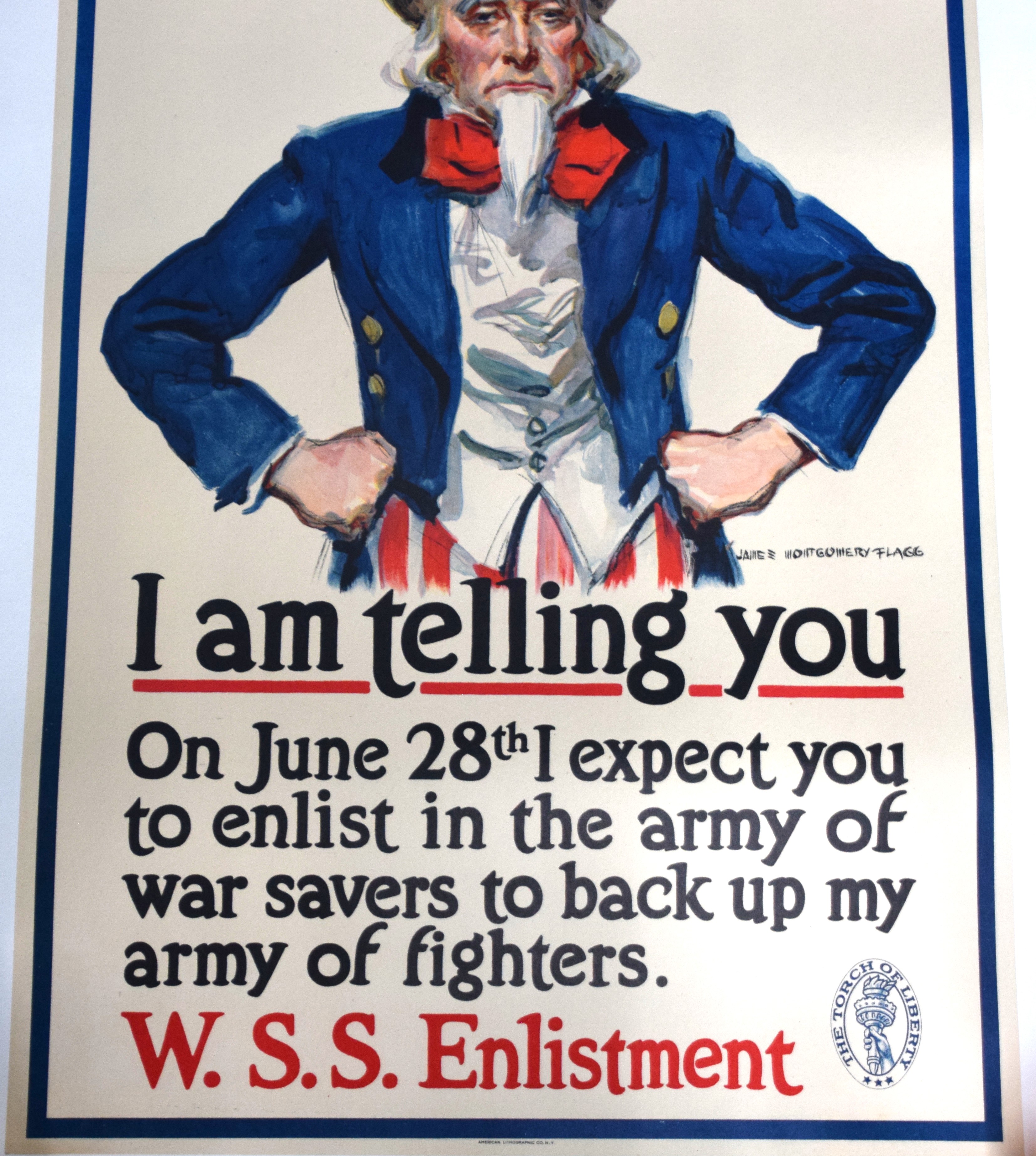 1918 World War I Uncle Sam poster announcing “I am Telling You- On June 28th I Expect You To Enlist In The Army Of Savers To Back My Fighters”. Printed by the American Lithograph Company. Dimensions: 30″ x 19″