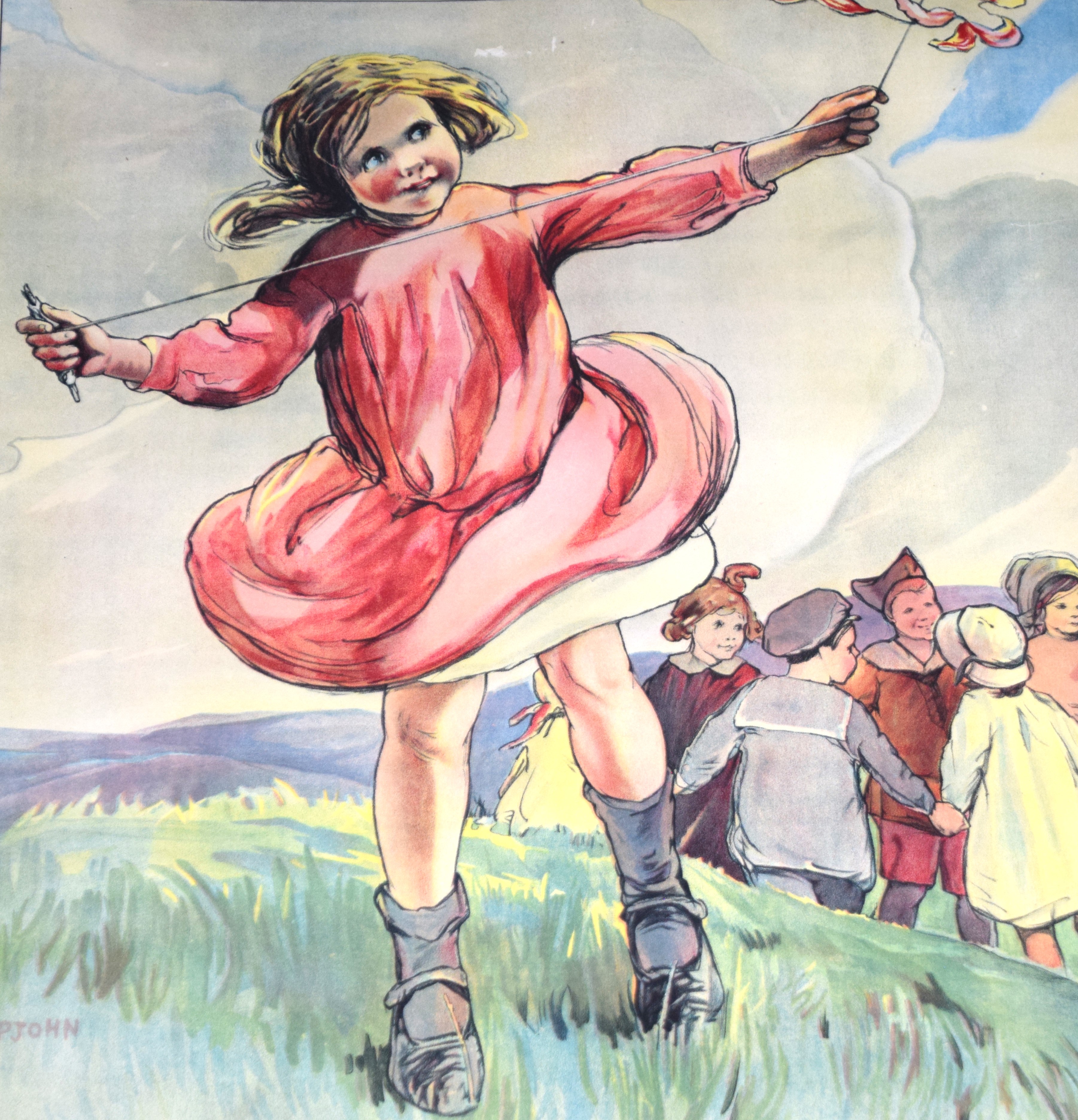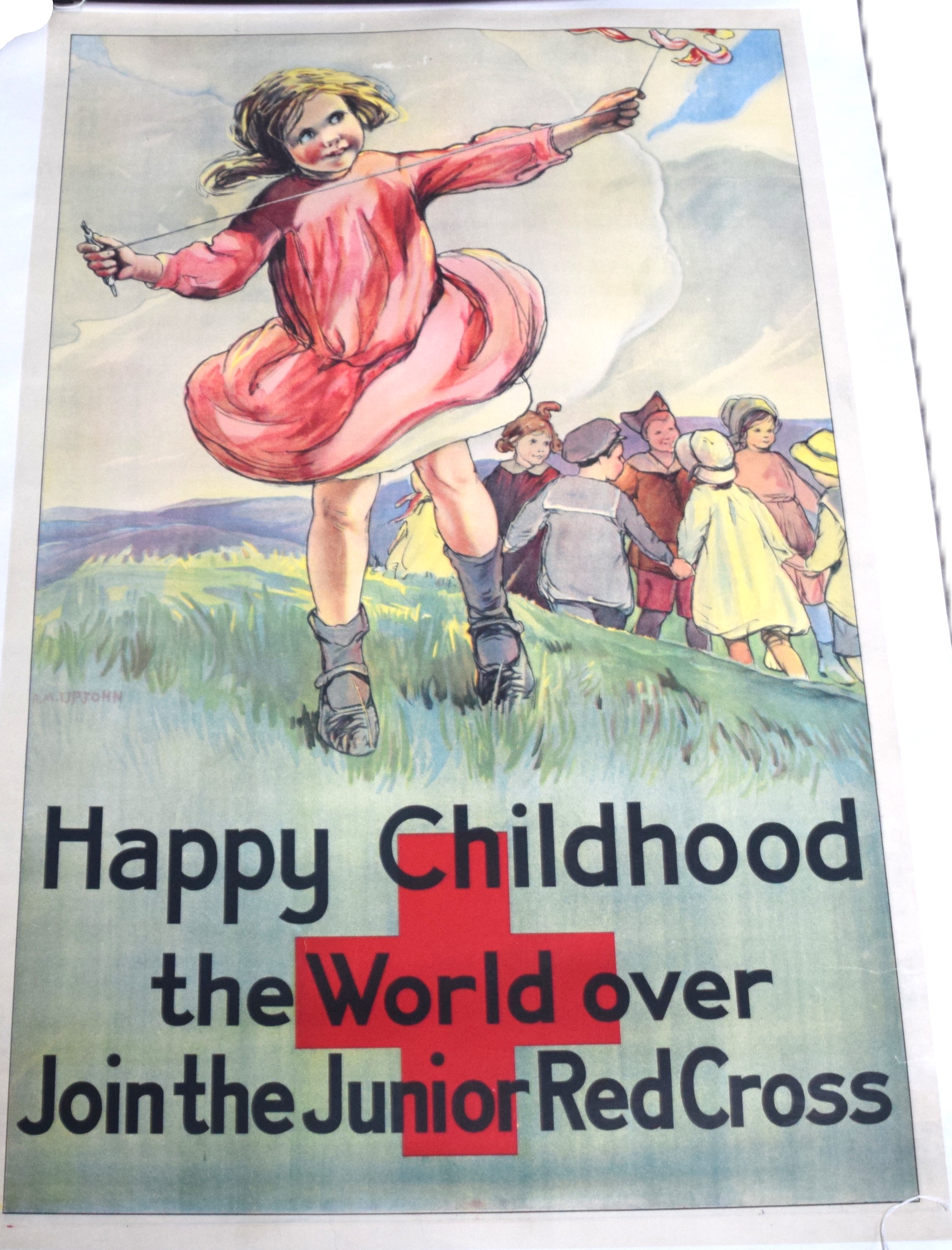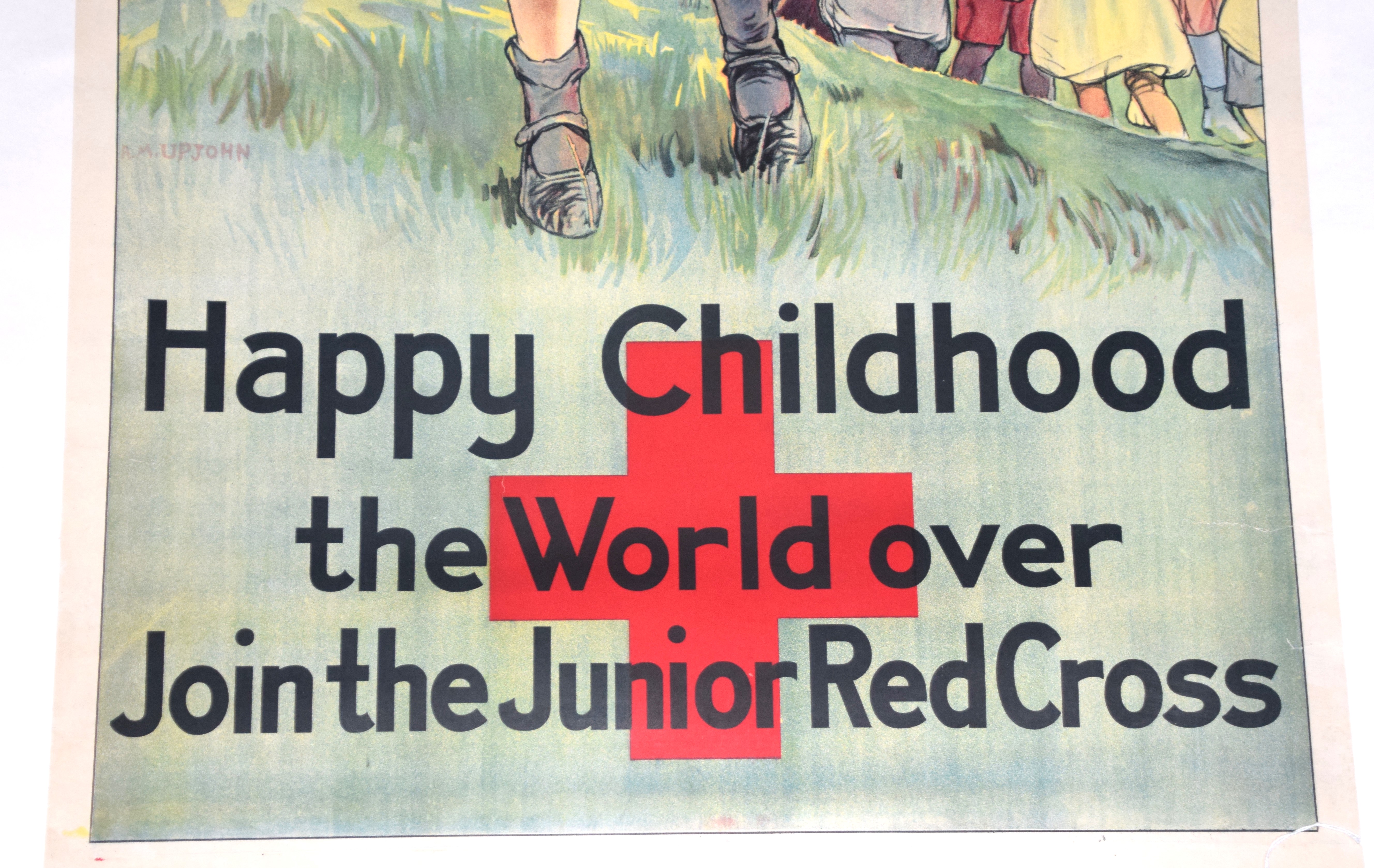 1918 World War I Junior Red Cross poster announcing “Happy Childhood The World Over, Join The Junior Red Cross”. Dimensions: 37.5″ x 24″