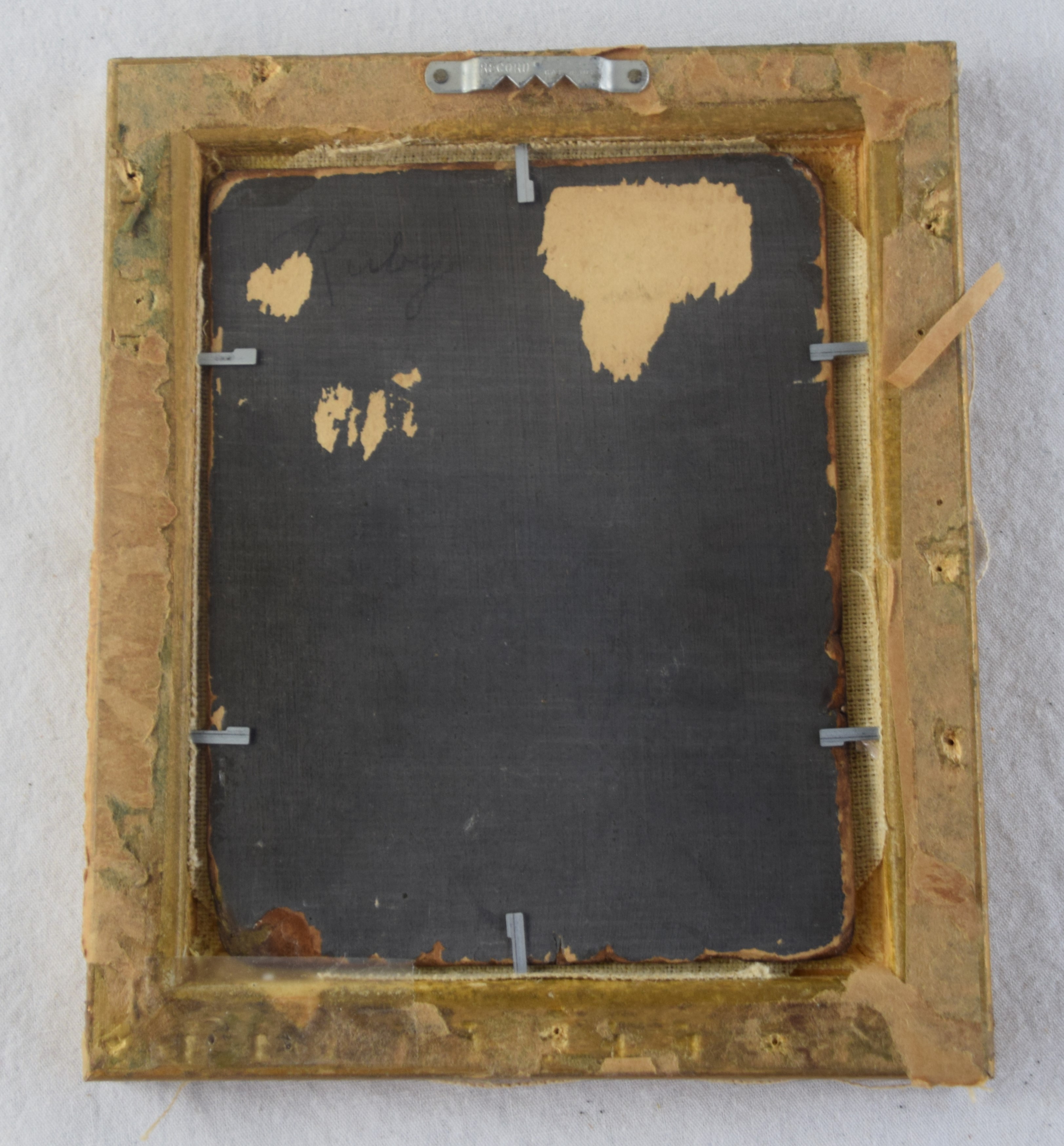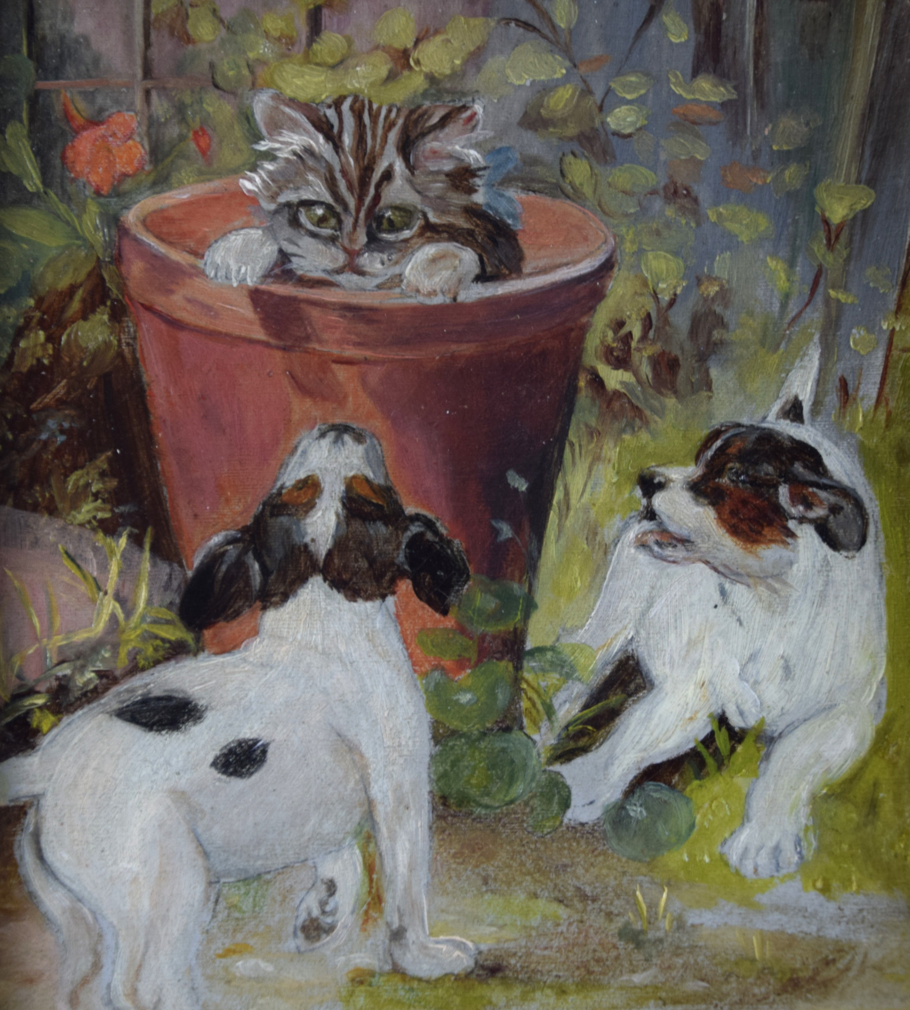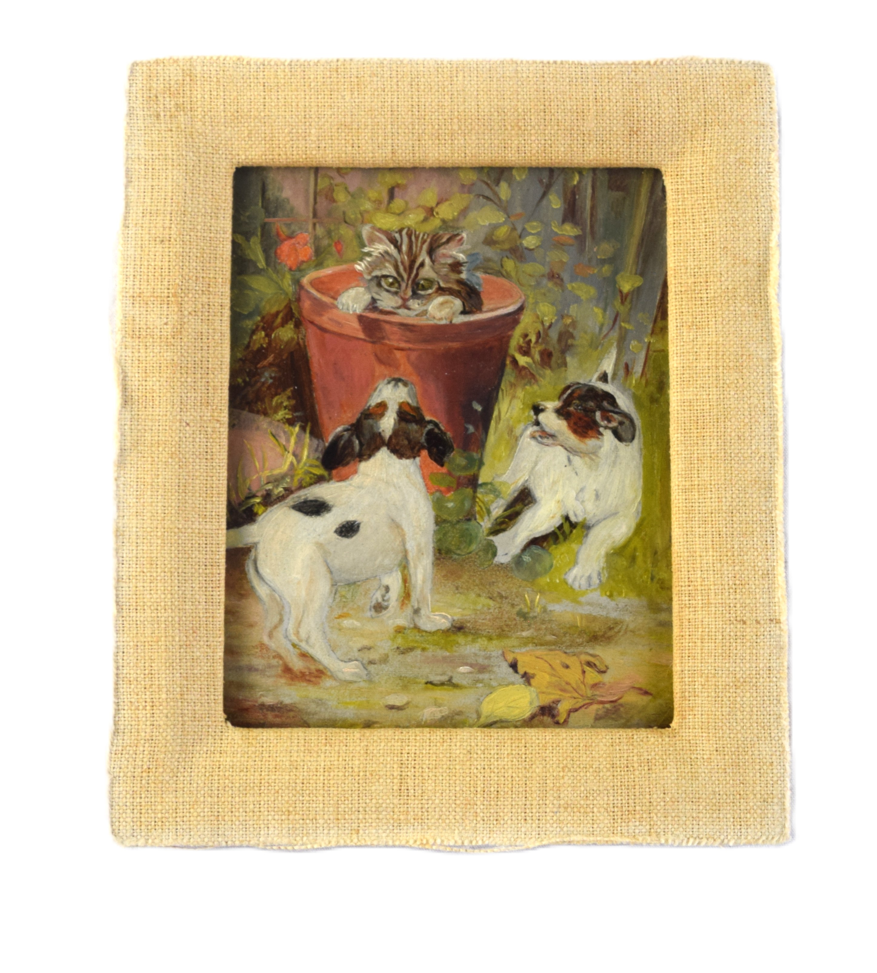 Framed oil on canvas of two dogs facing a cat in a flower pot. Attributed to Sidney Lawrence Brackett (1852-1910) was born in Boston and studied under John B. Johnson and Frederic Porter Vinton. He was a member of the Boston Art Club, where his work appeared in exhibitions throughout the 1890s and into the first decade of the twentieth century. Brackett is particularly known for his detailed and lifelike animal paintings. Dimensions: 5.5″ x 4.5″ Image size