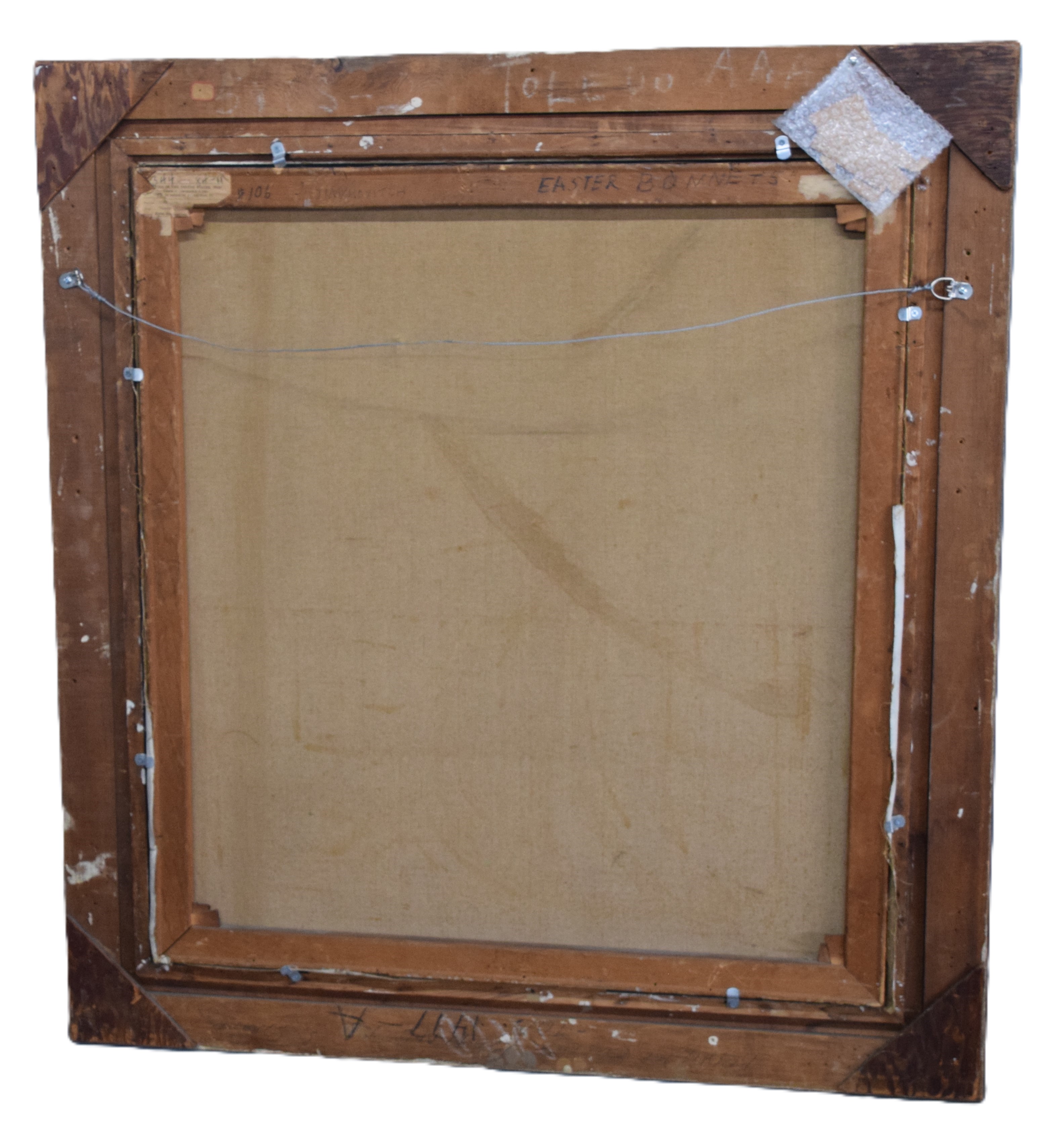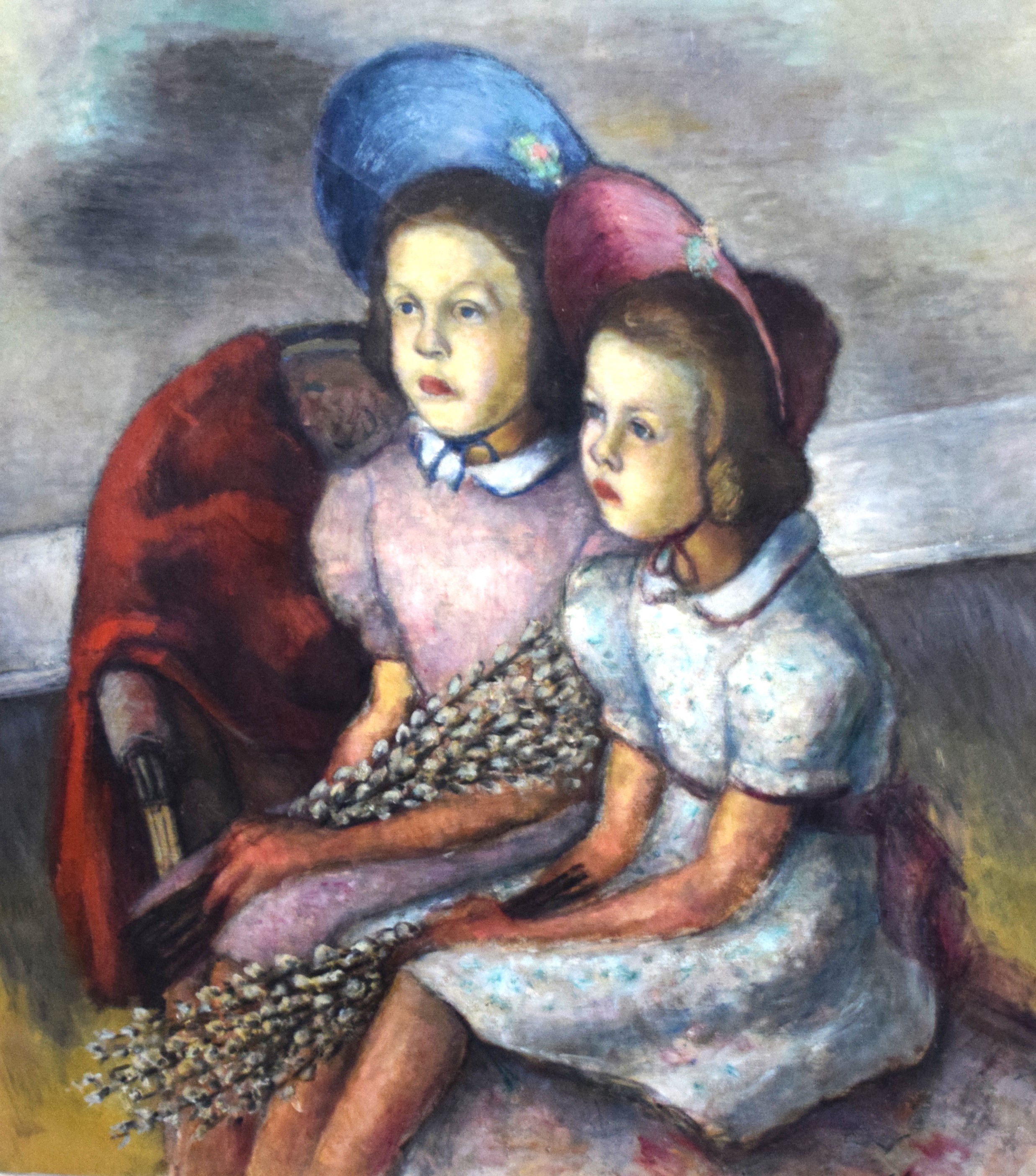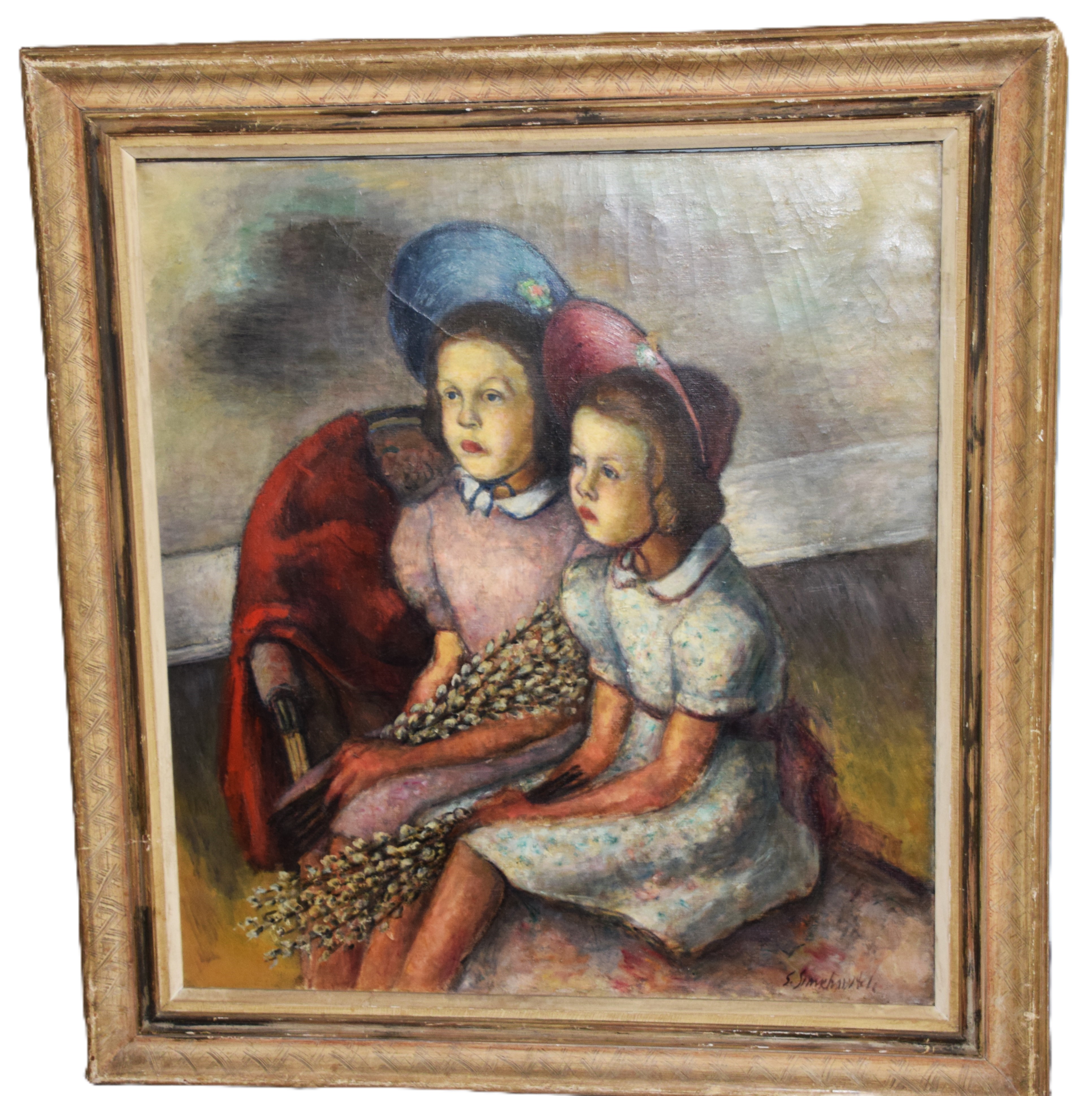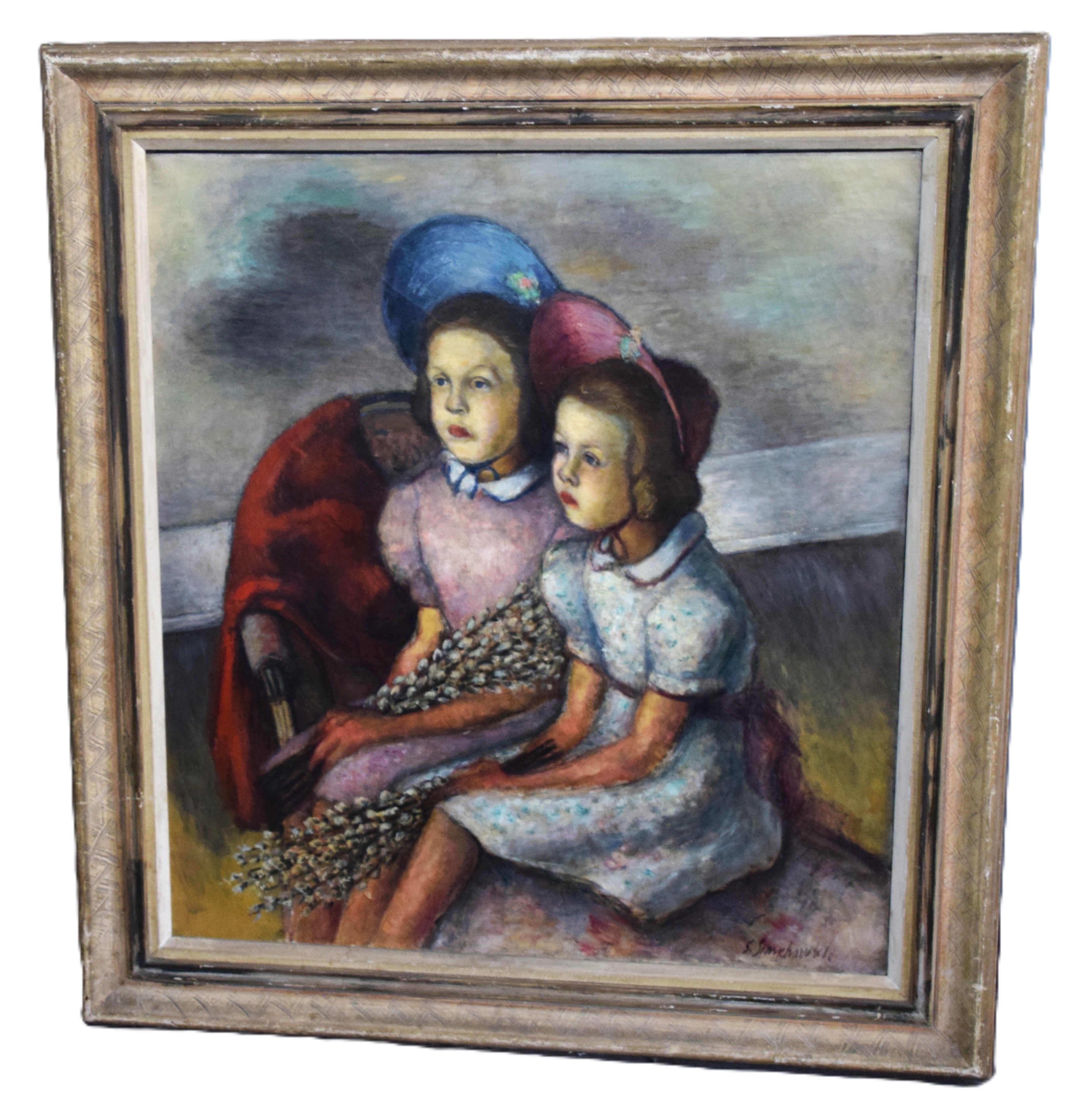 Framed and signed LR oil painting on canvas depicting two children with Easter bonnets with fine Spring dresses, sitting on a chair. The children are the Nauman sisters, Rhoda and Barbara, friends of Sonya, Simka’s daughter. Simka Simkhovitch (1893 – 1949) worked in New York, Connecticut and Ukraine. He emigrated to the United States in 1924. Provenance: Carnegie Institute and Milch Galleries of NY. Dimensions: 36″ x 32″