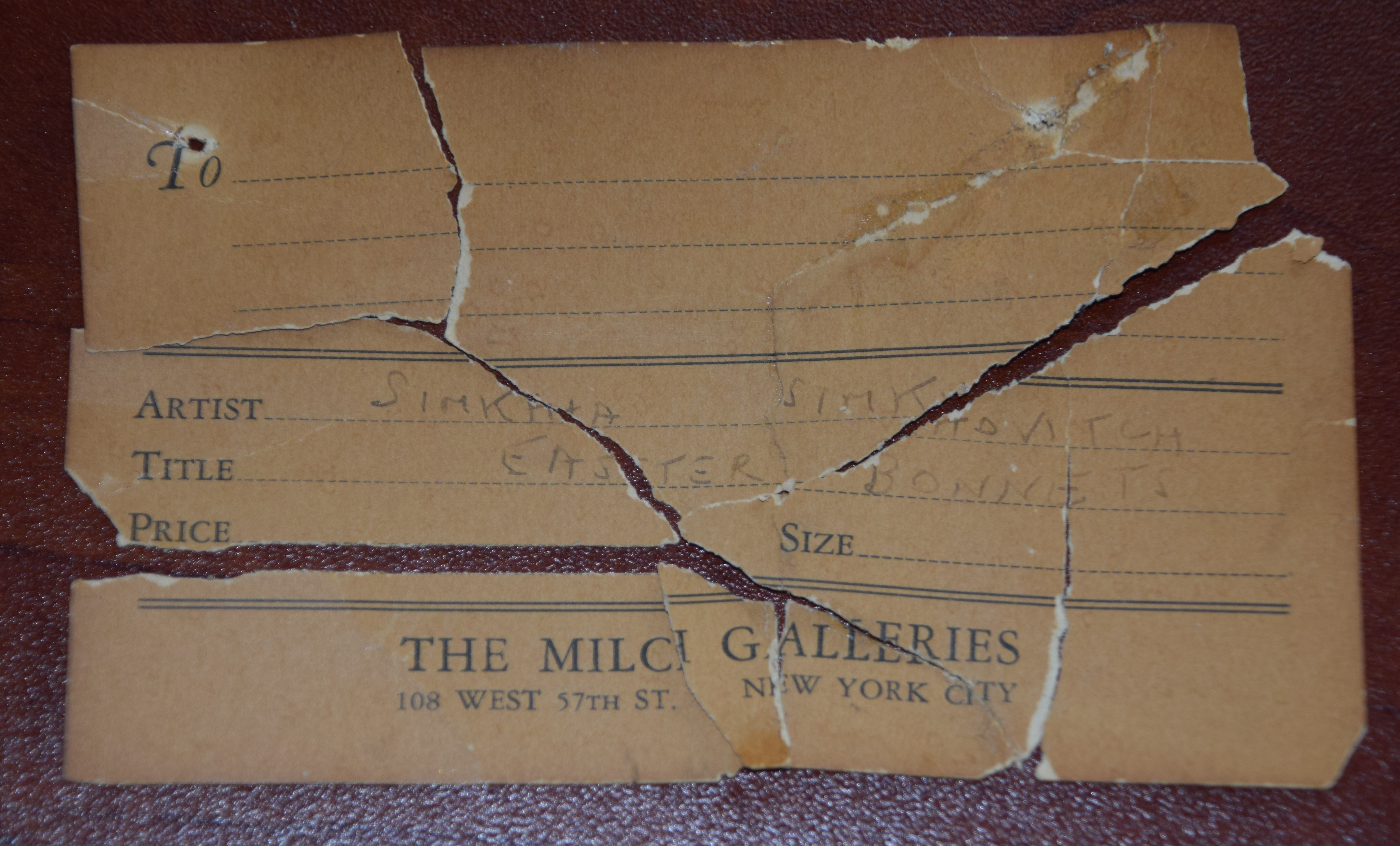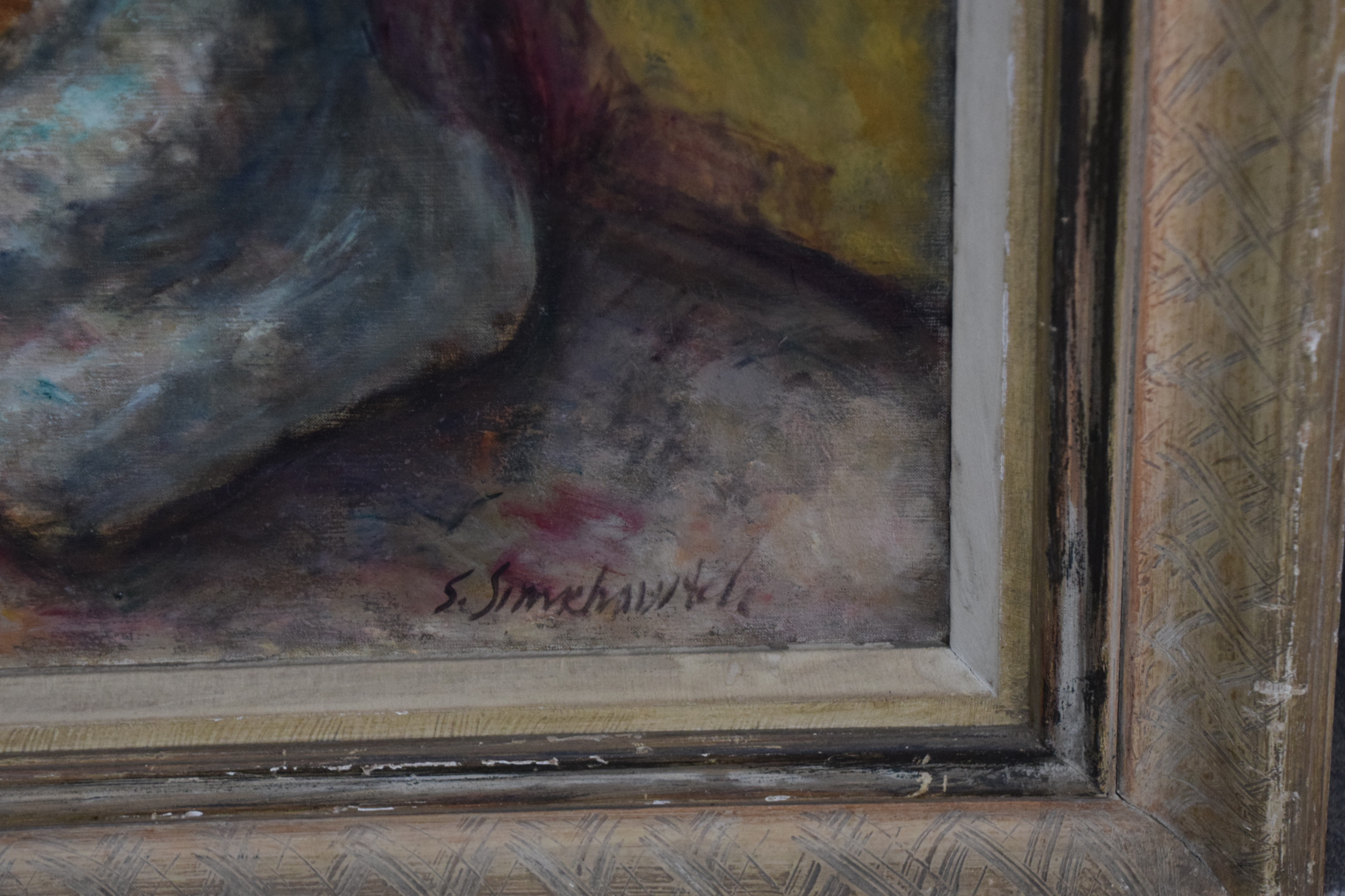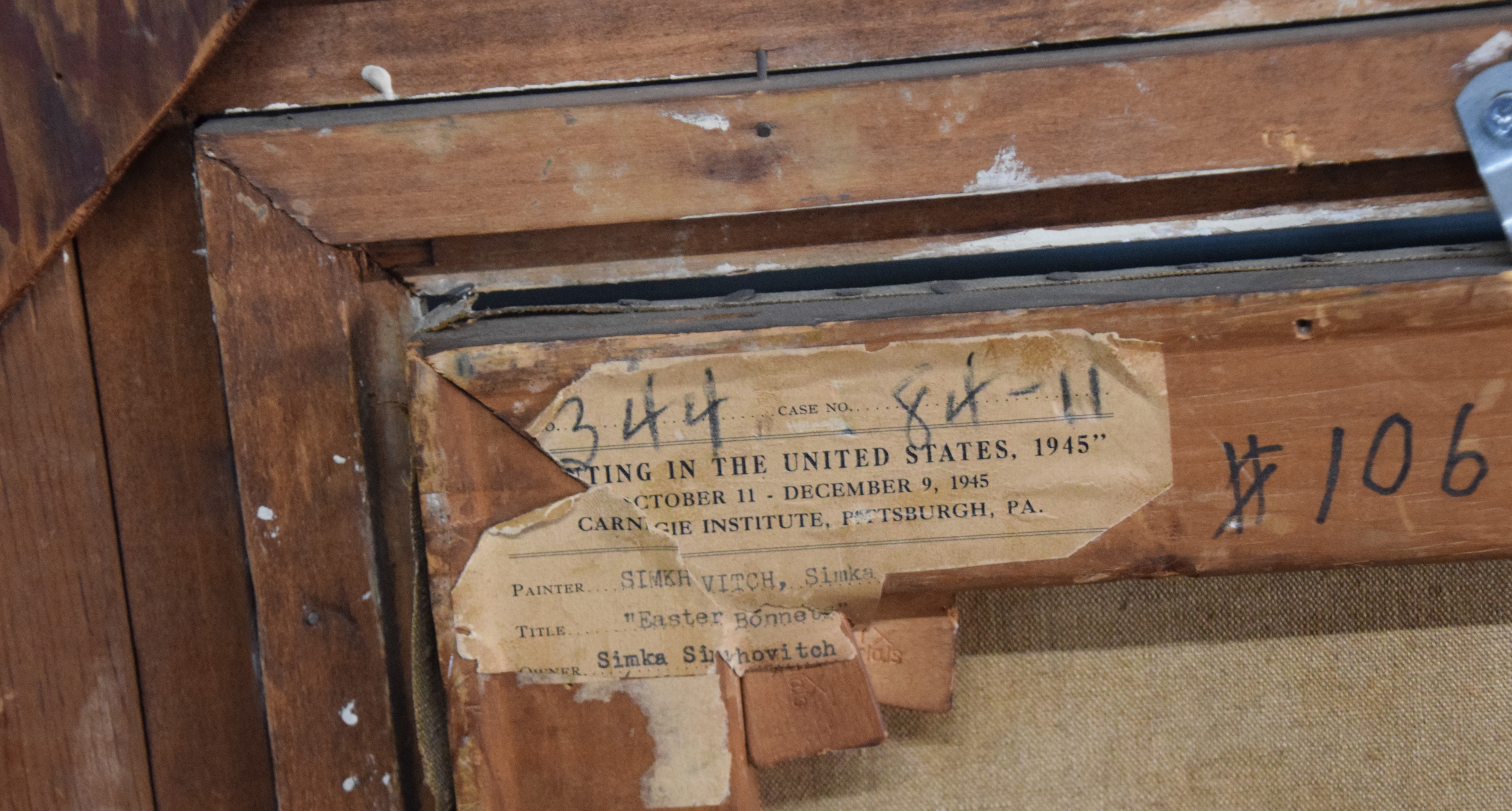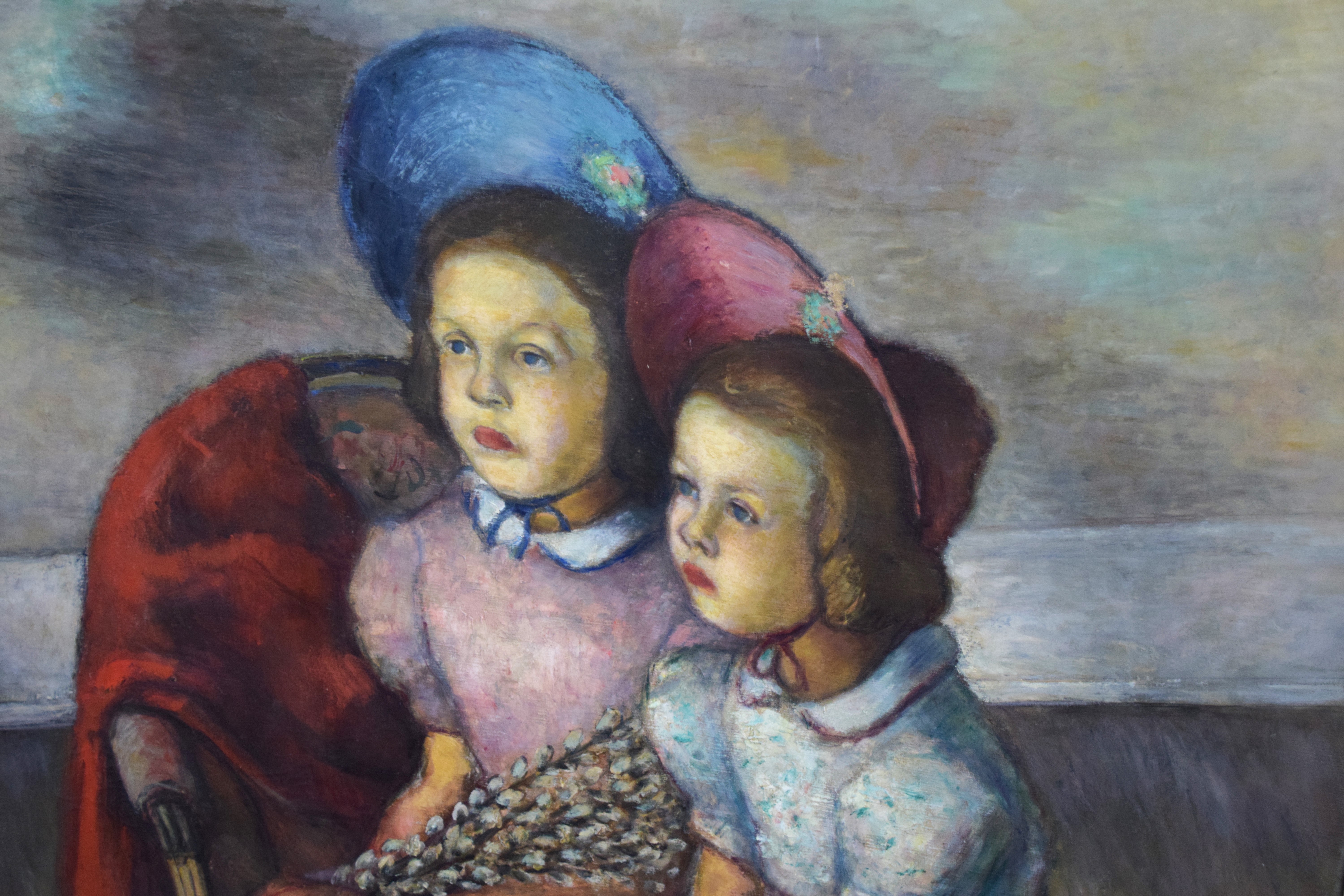 Framed and signed LR oil painting on canvas depicting two children with Easter bonnets with fine Spring dresses, sitting on a chair. The children are the Nauman sisters, Rhoda and Barbara, friends of Sonya, Simka’s daughter. Simka Simkhovitch (1893 – 1949) worked in New York, Connecticut and Ukraine. He emigrated to the United States in 1924. Provenance: Carnegie Institute and Milch Galleries of NY. Dimensions: 36″ x 32″