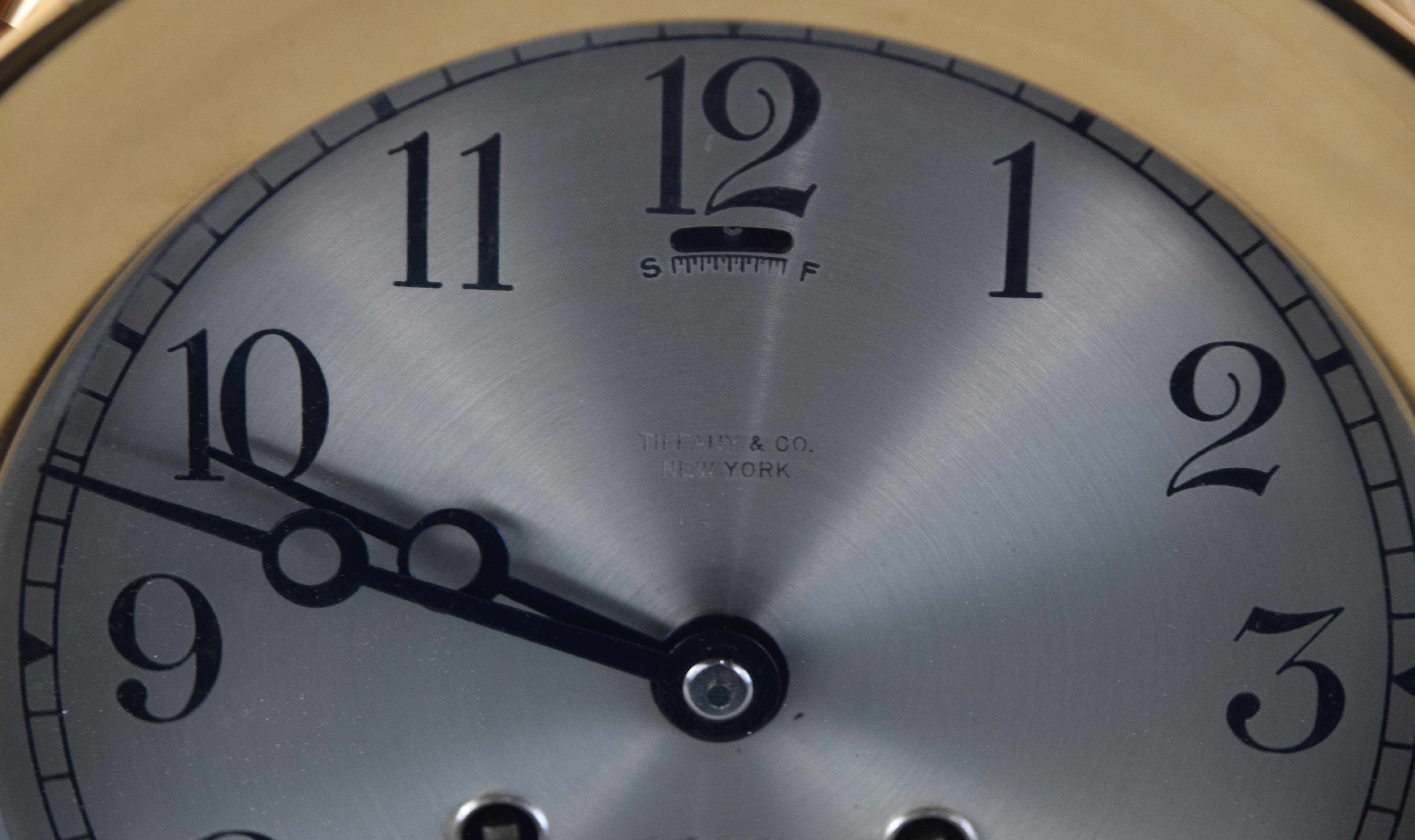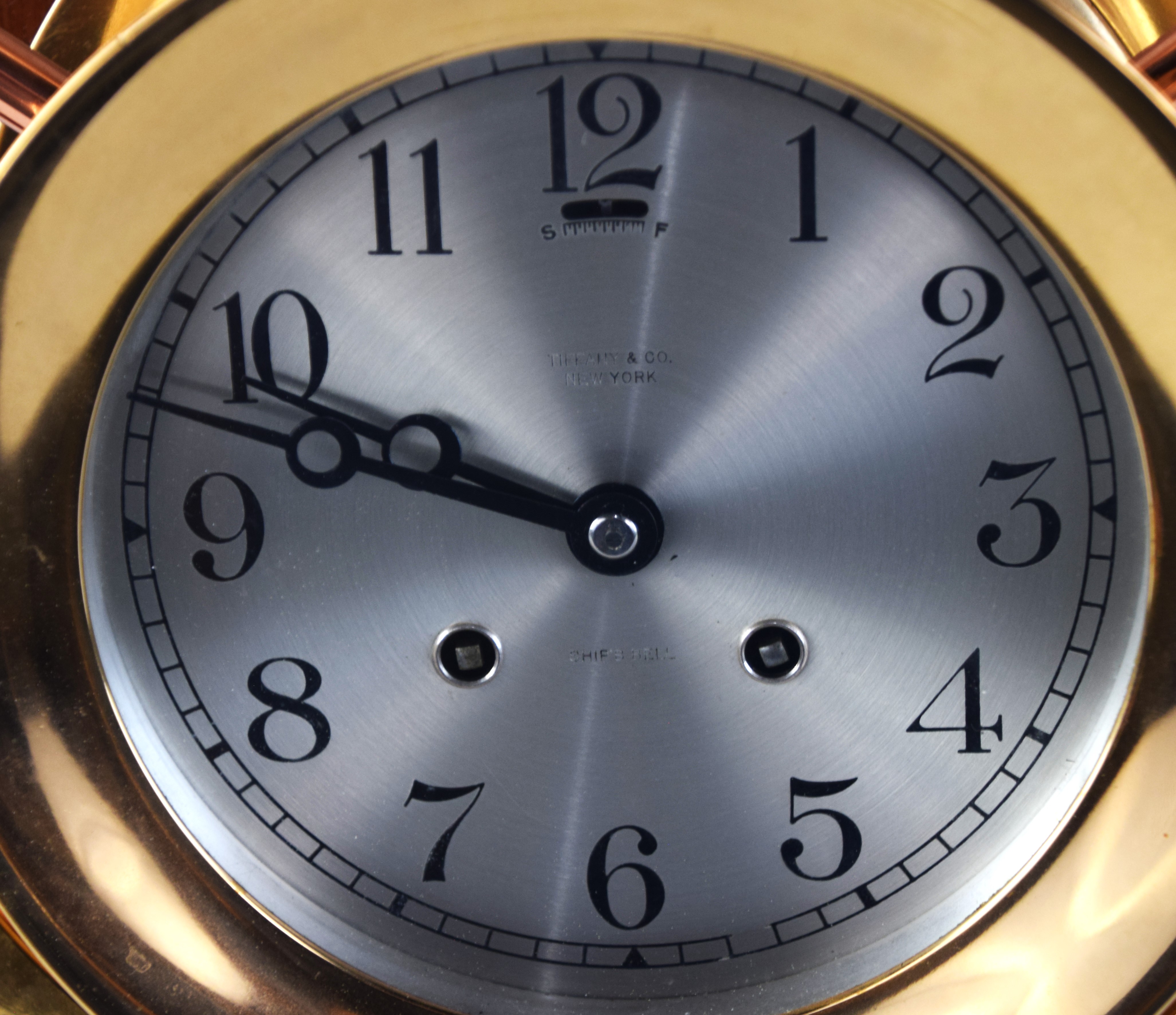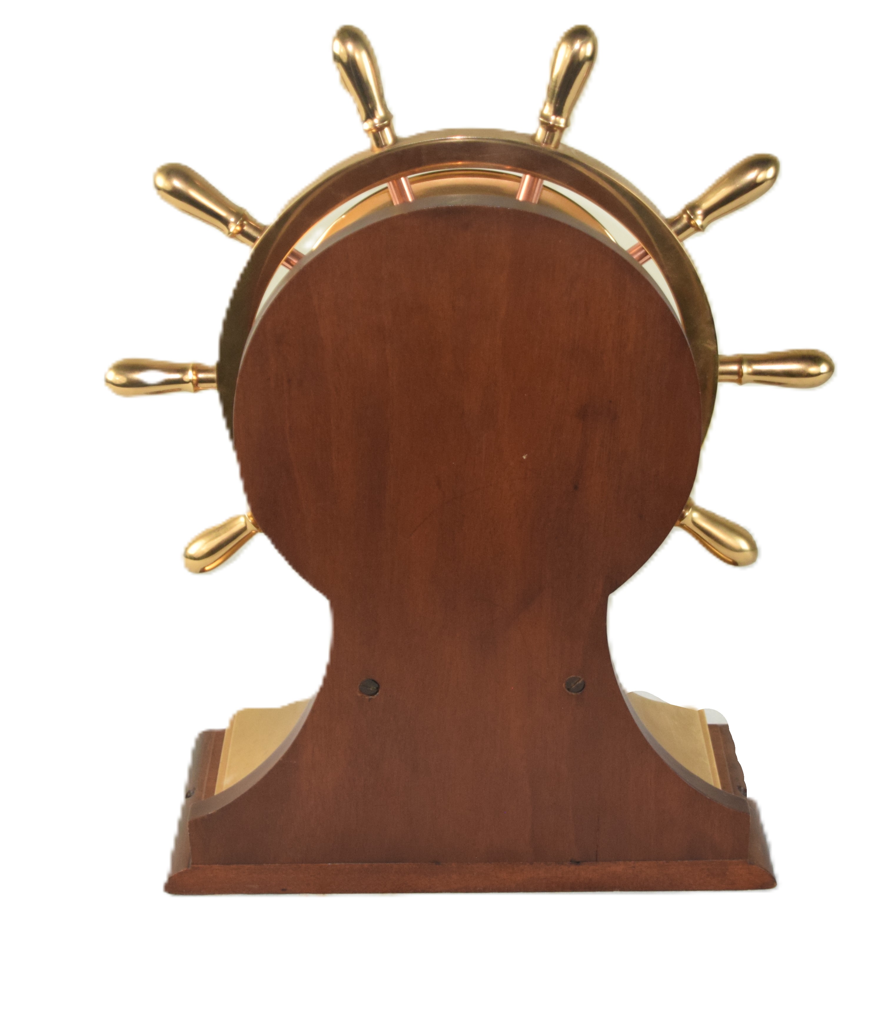Brass ships clock with ship’s wheel design, dial signed Tiffany & Co. with Roman numerals resting on a wooden base. Dimensions: 15″ H x 12″ W and a 5″ Dial