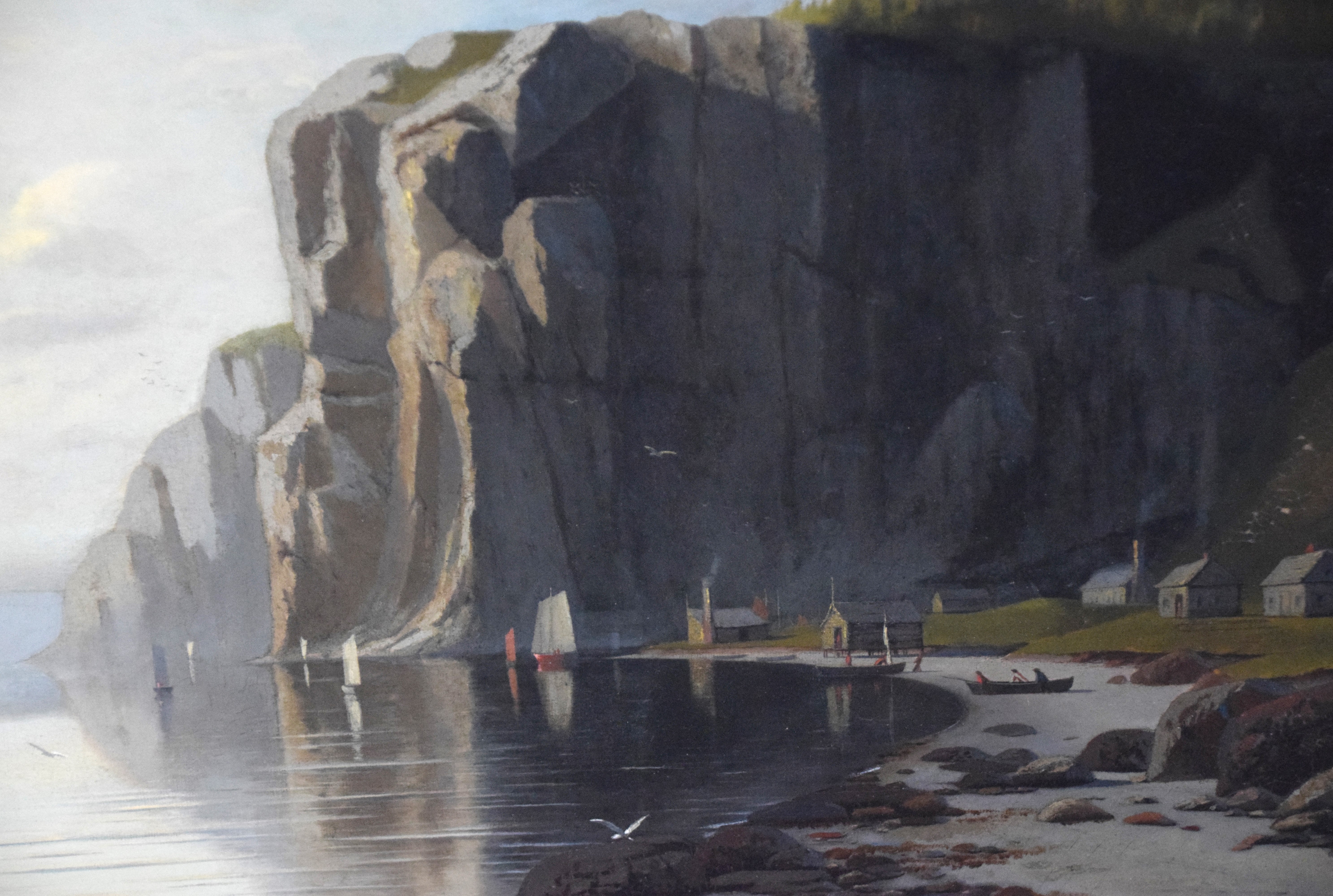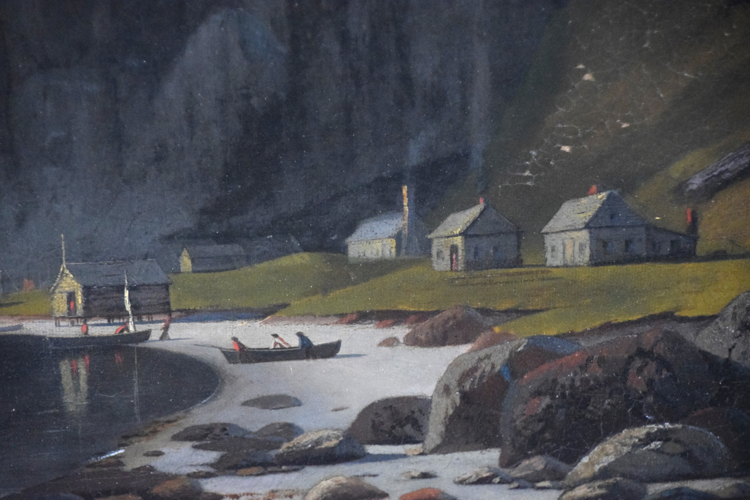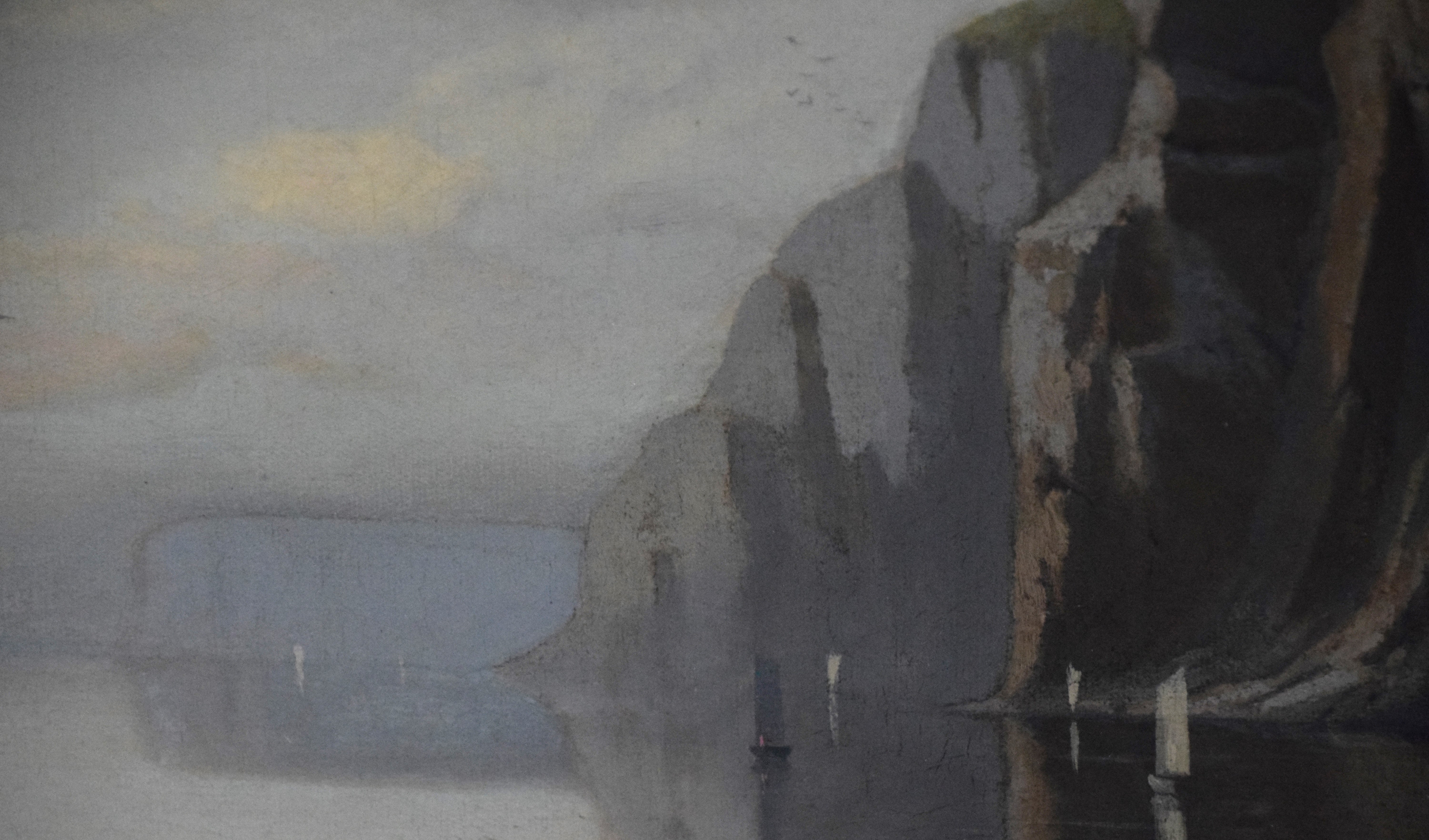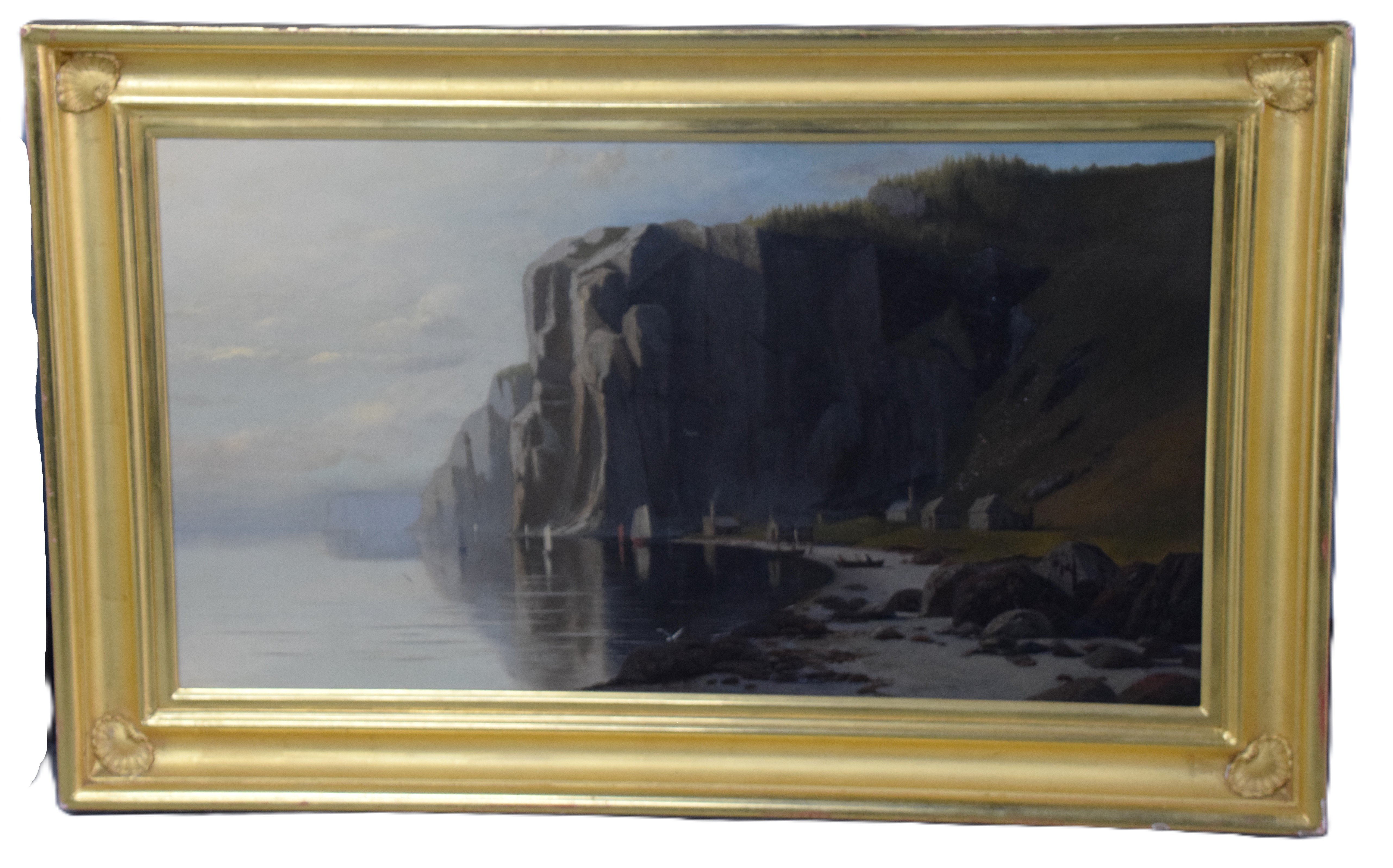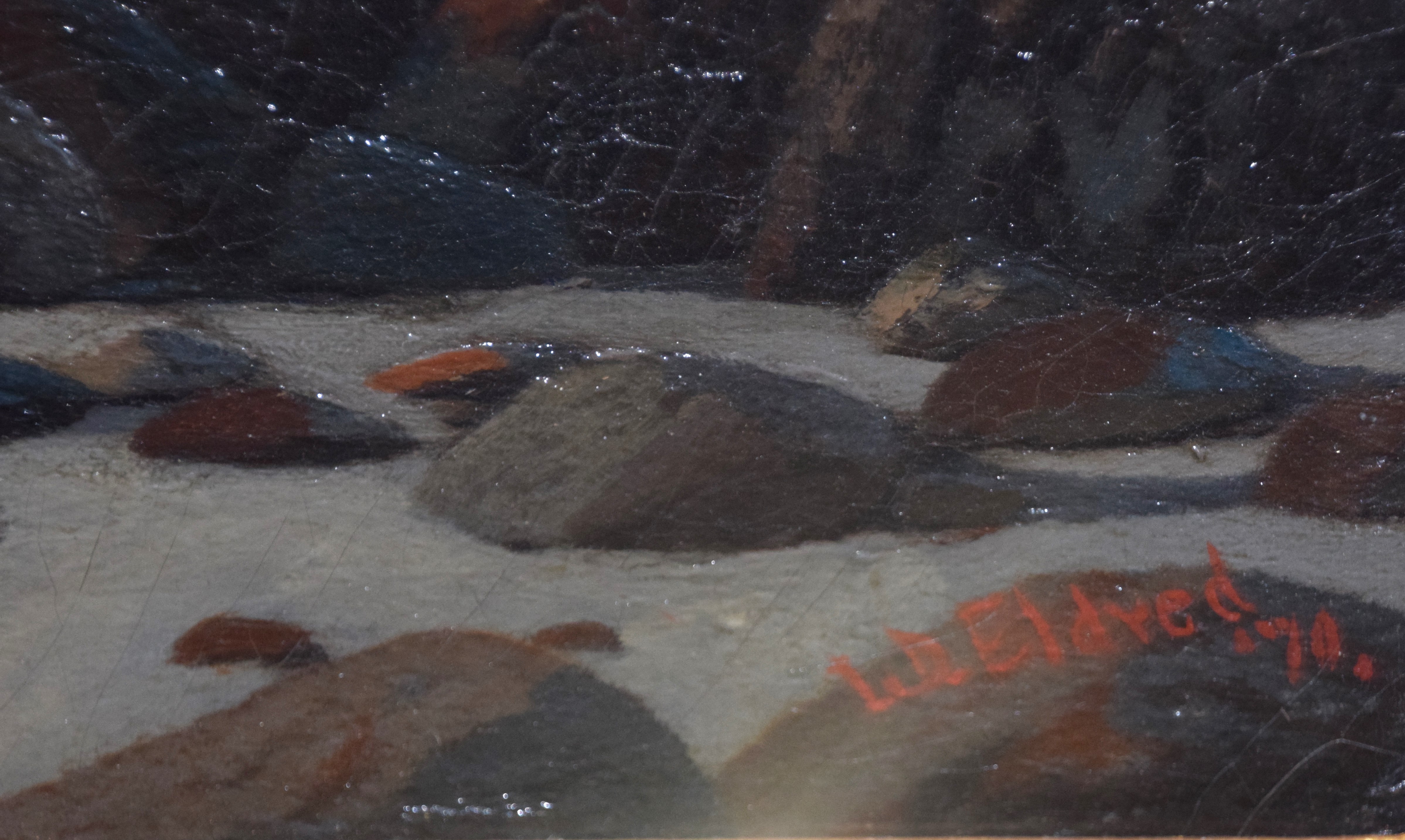 Oil on canvas seascape signed lower right L. D. Eldred 74. In a very attractive frame. Marine painter and etcher Lemuel D. Eldred (1850-1921) was born and raised in Fairhaven, Massachusetts near New Bedford’s whaling community. His work typifies the late Hudson River School. Dimensions: 20″ x 35″ Image size, 27″ x 43″ Overall