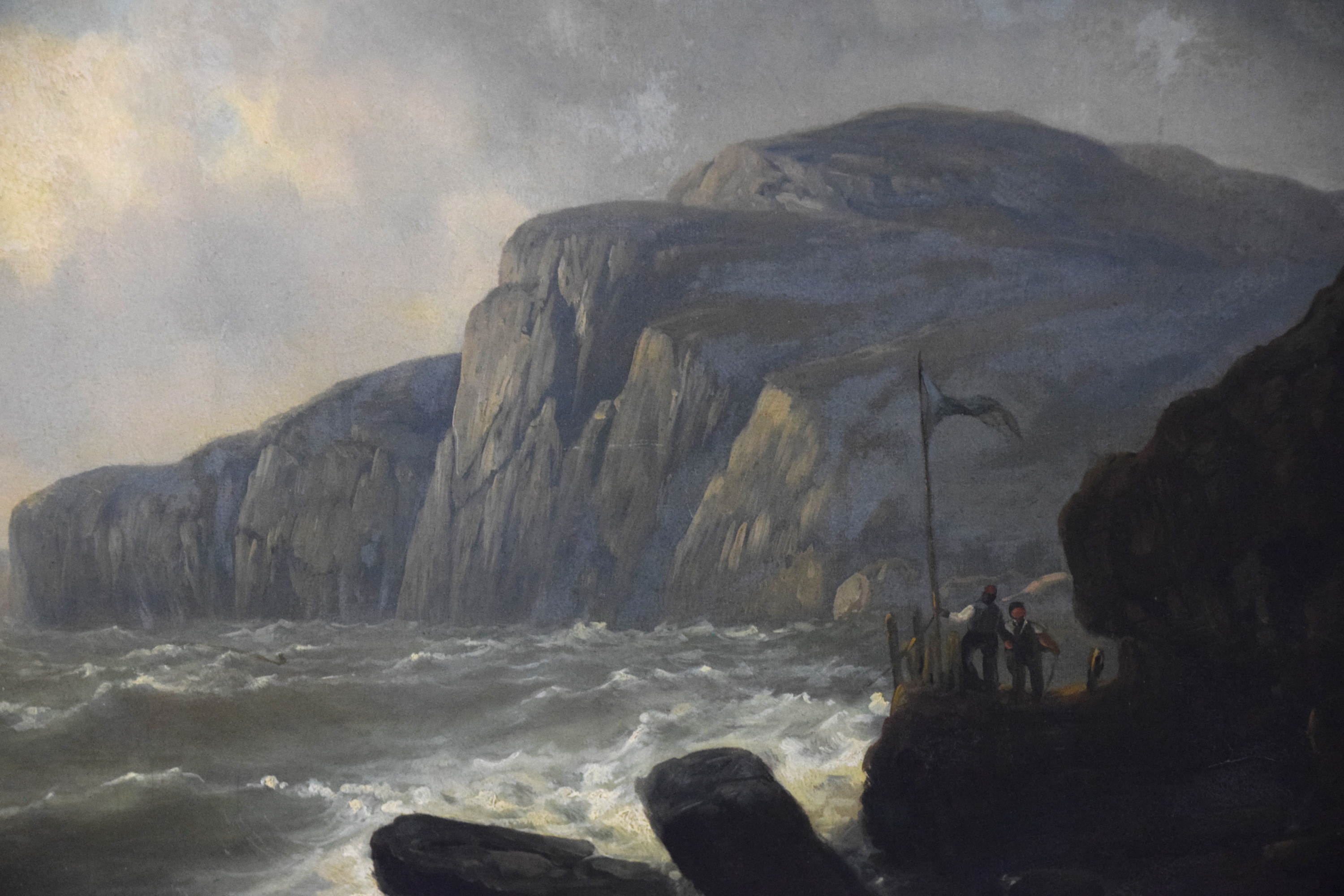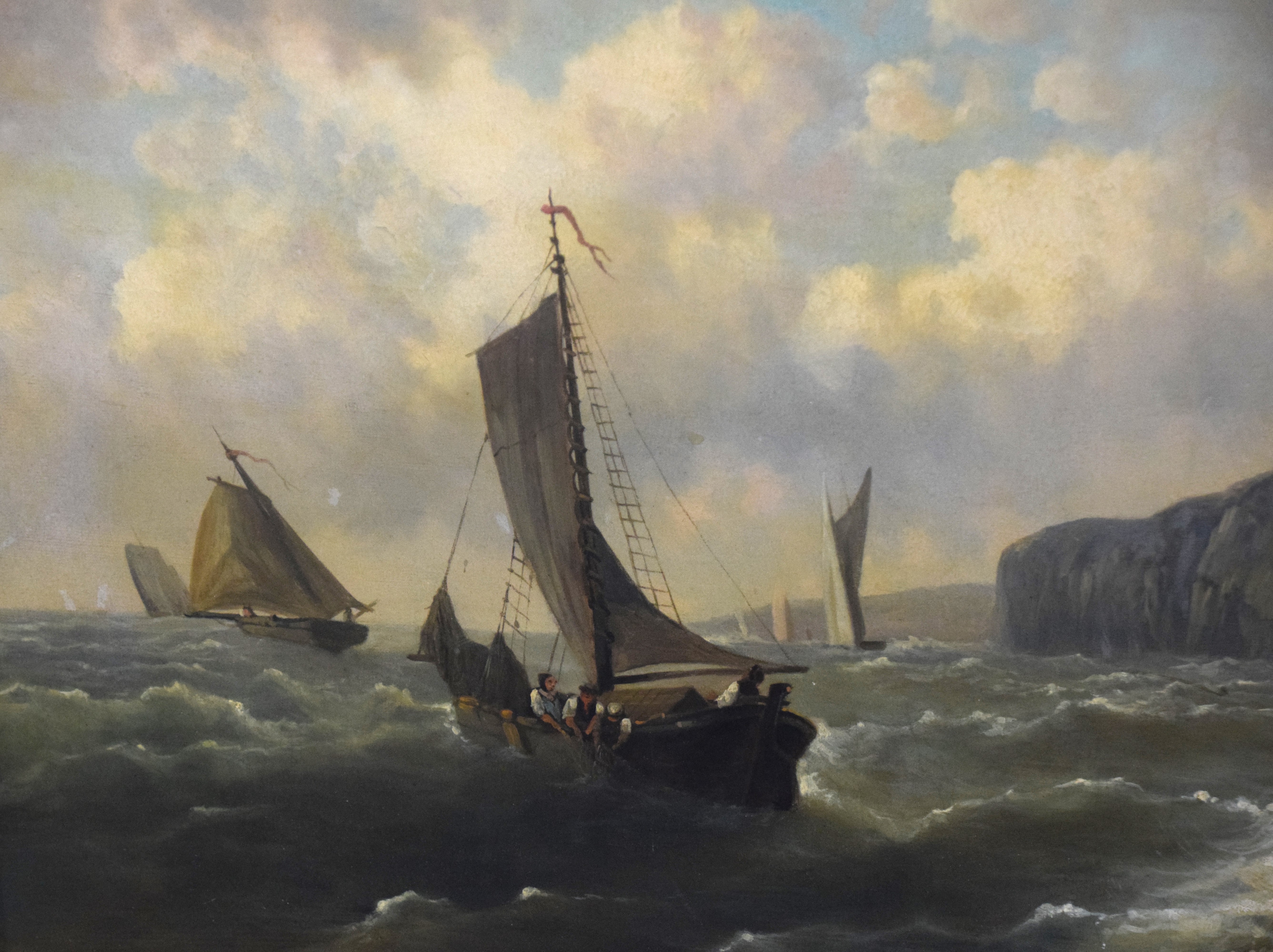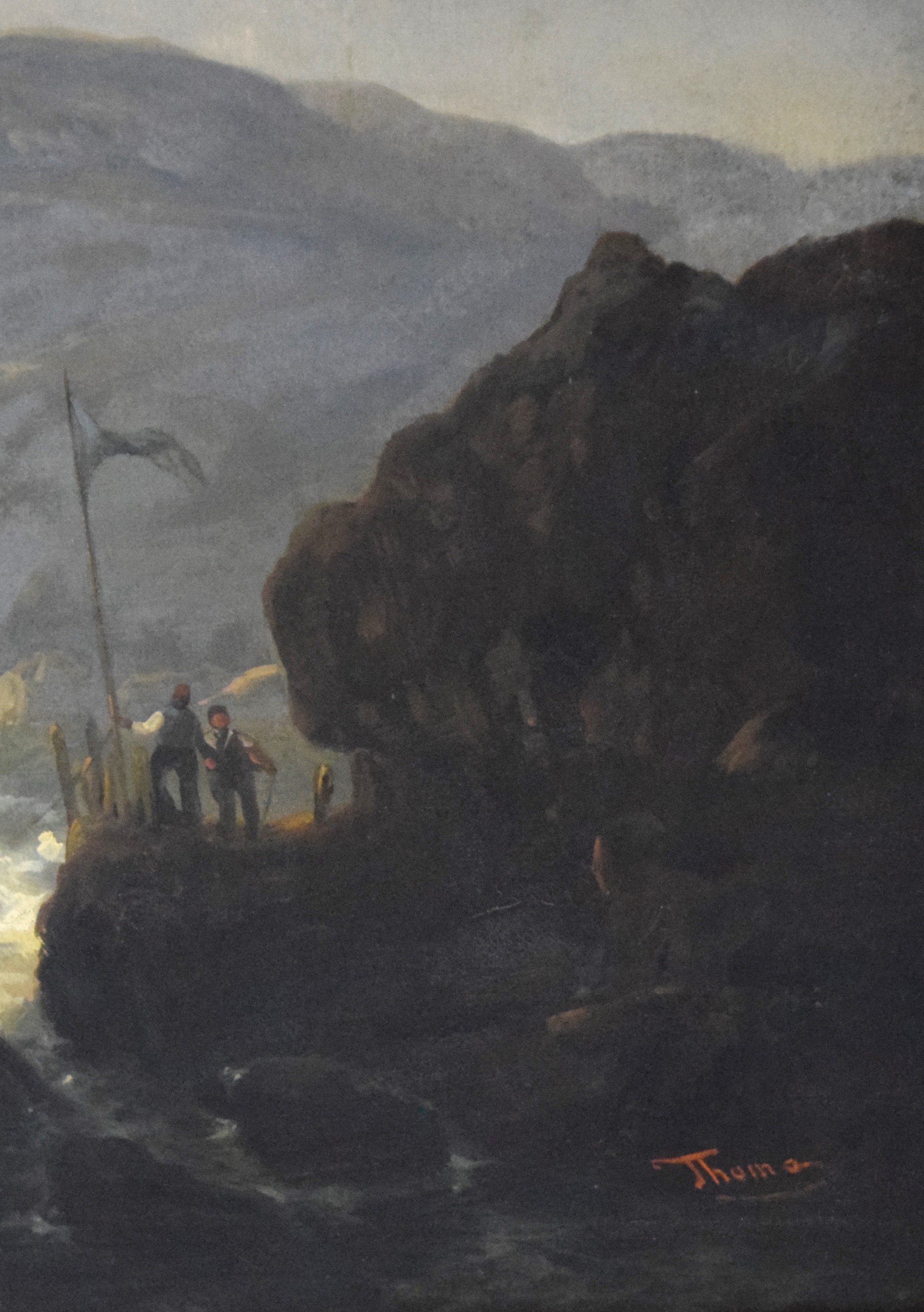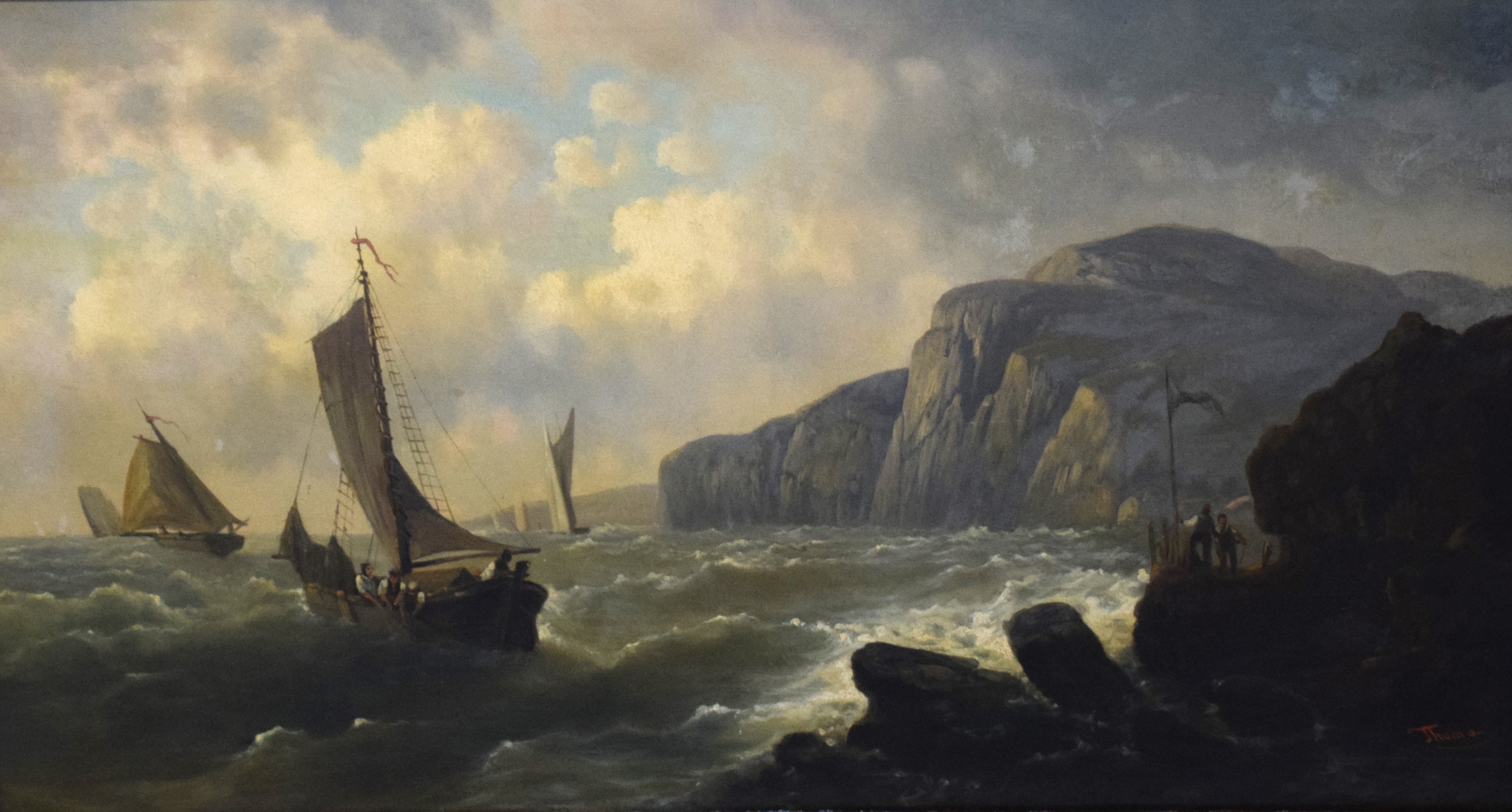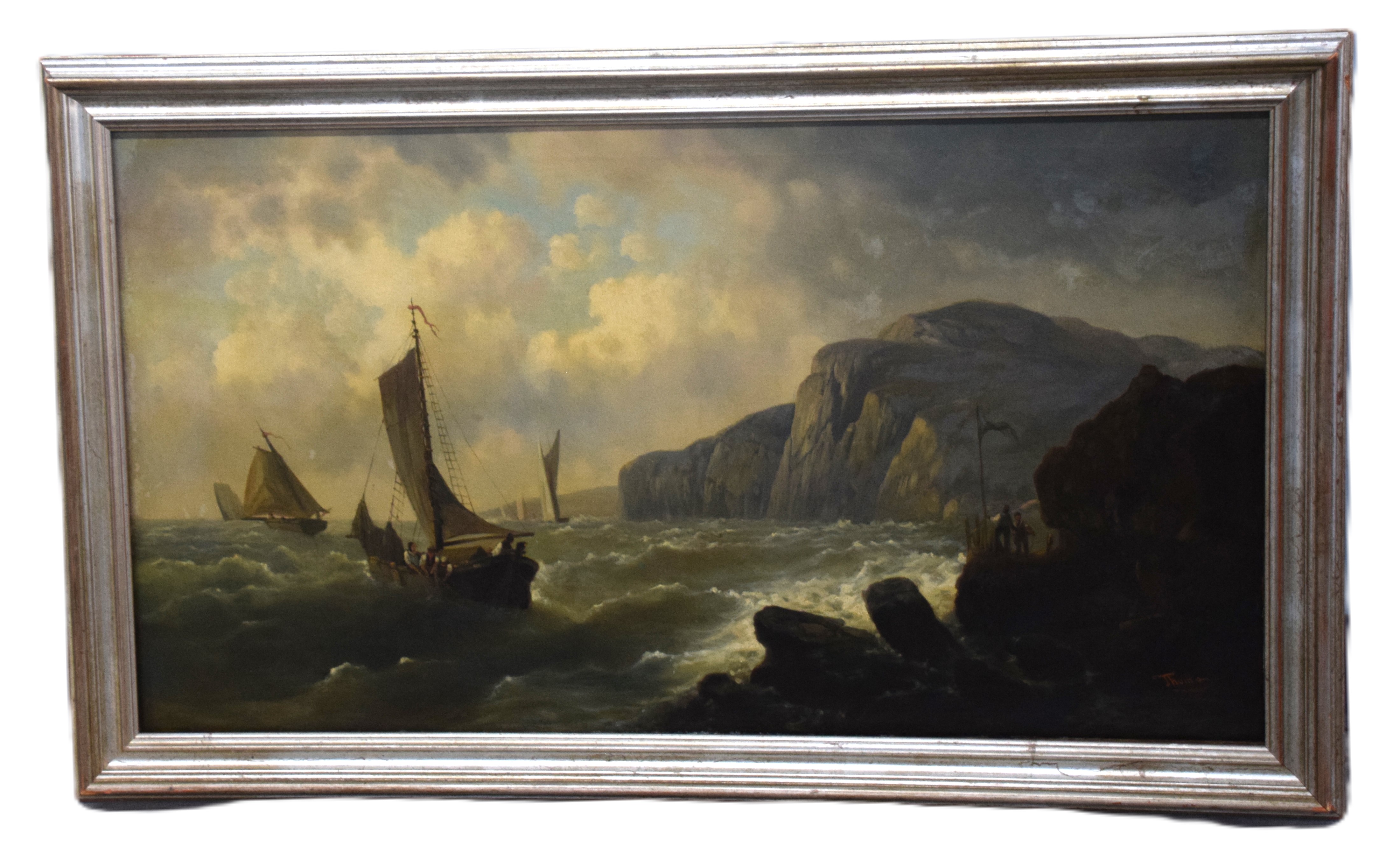 Framed and signed oil on canvas seascape of sailboats and cliffs. Signed lower right, Thoma. Matthias Rudolf Toma (1792 – 1869) was active/lived in Austria. Dimensions: 21″ x 36.5″