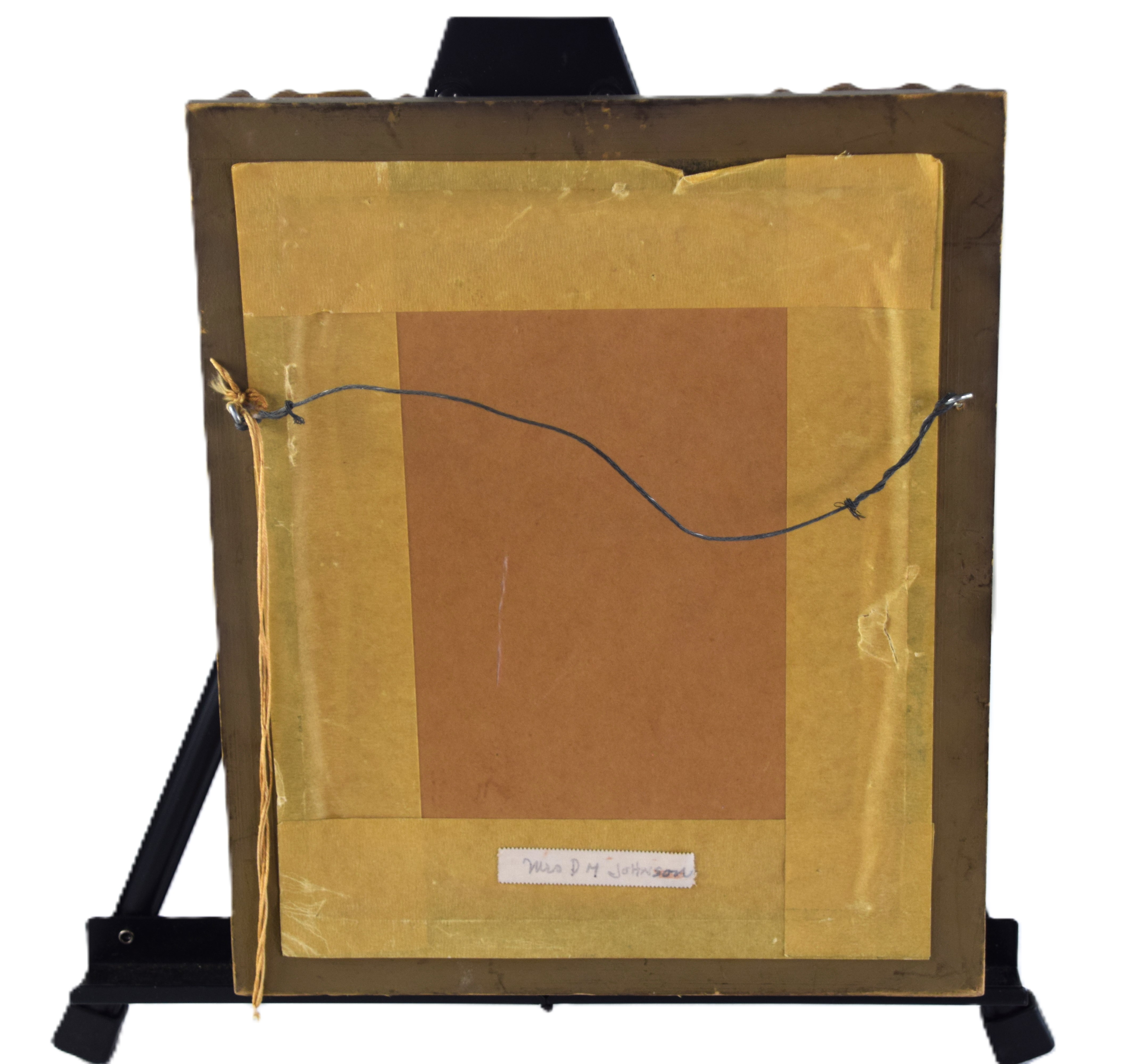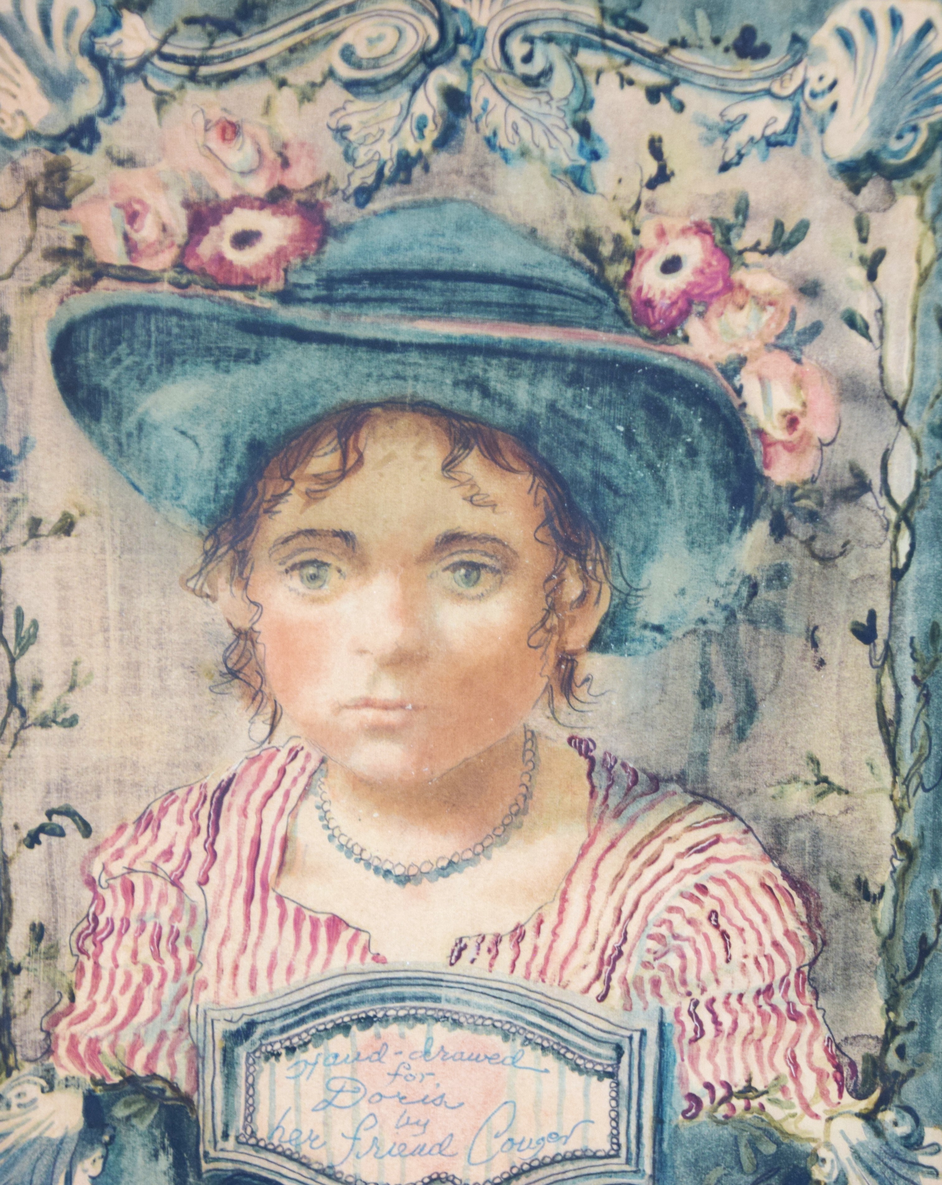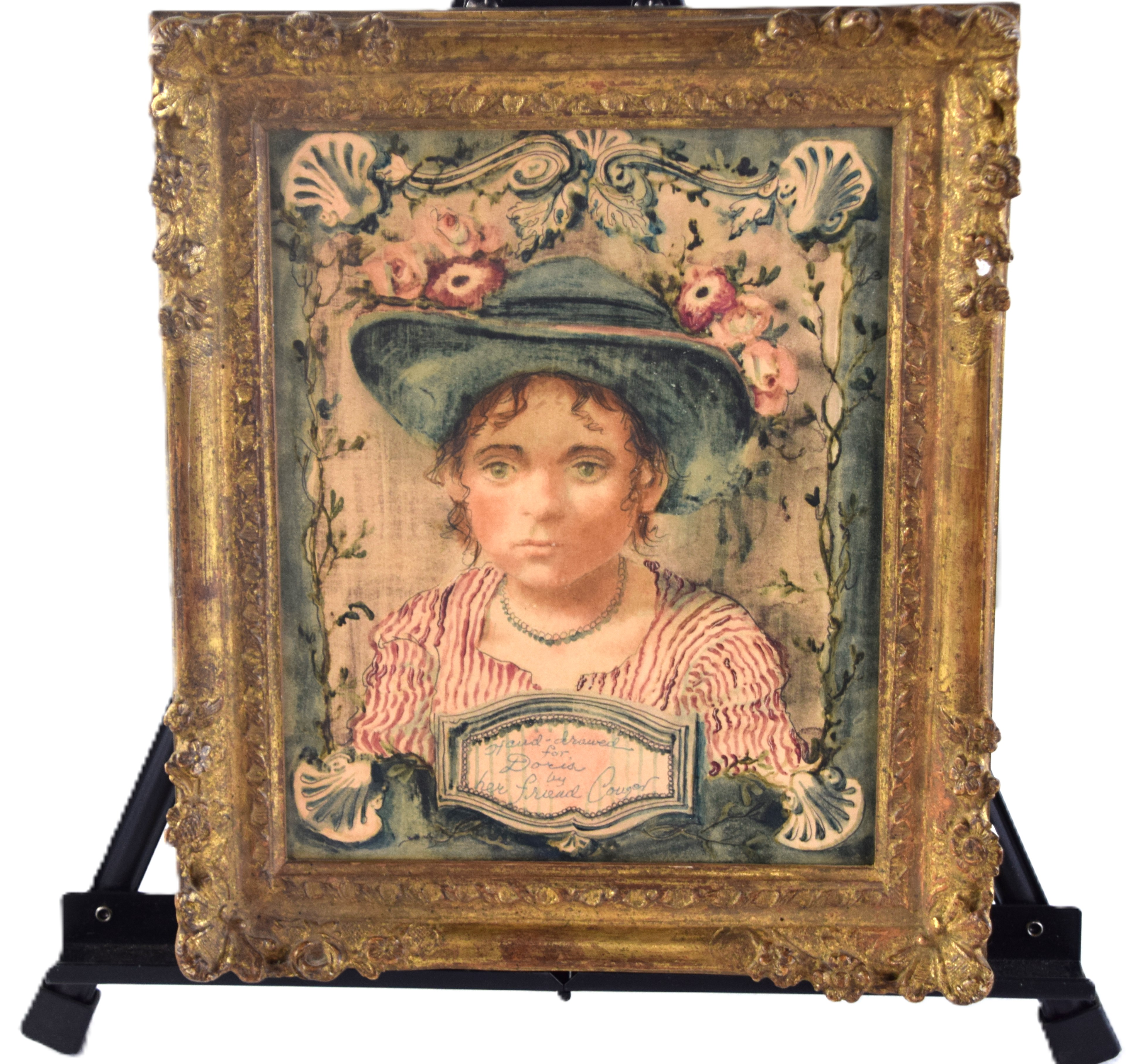 Framed Conger Metcalf watercolor of her friend Doris Johnson, wearing a hat. Conger A. Metcalf (1914 – 1998) was active/lived in Massachusetts and Iowa and is known for Figure-genre, floral, wildlife paintings. Dimensions: 9.5″ x 7.5″ Image size