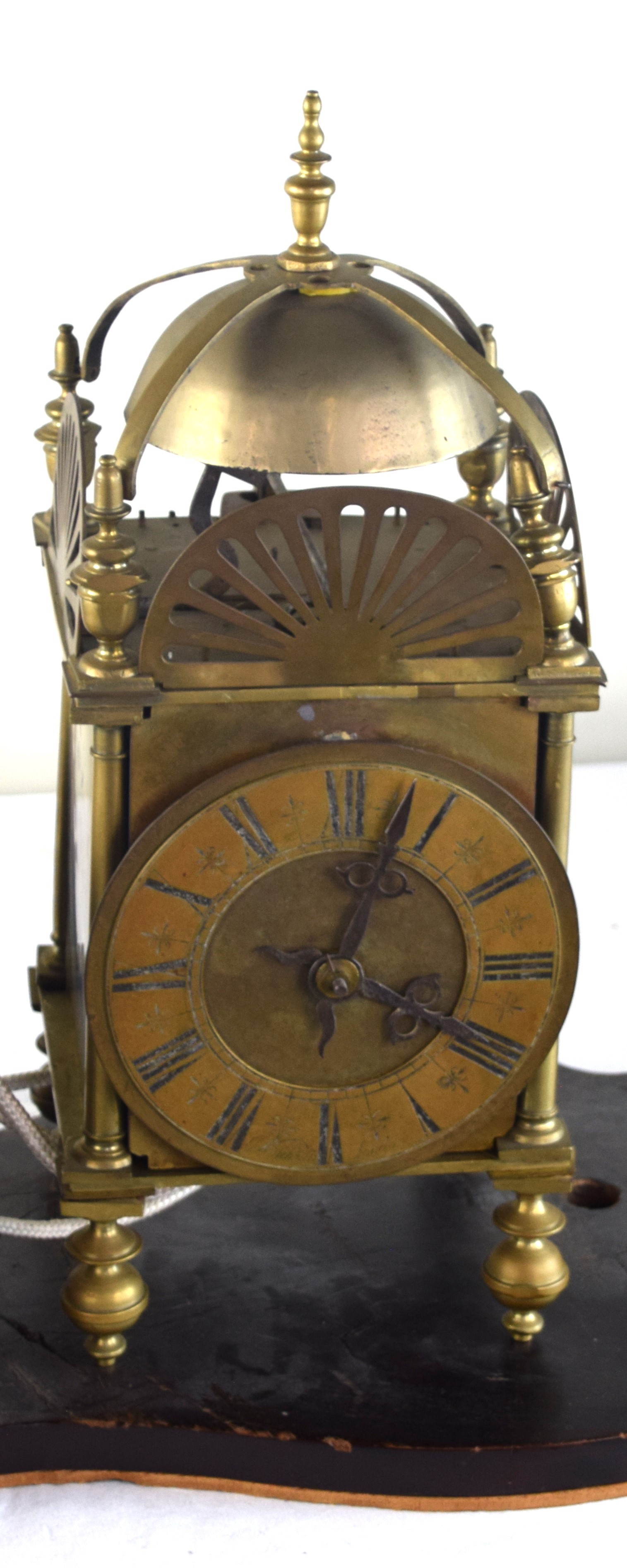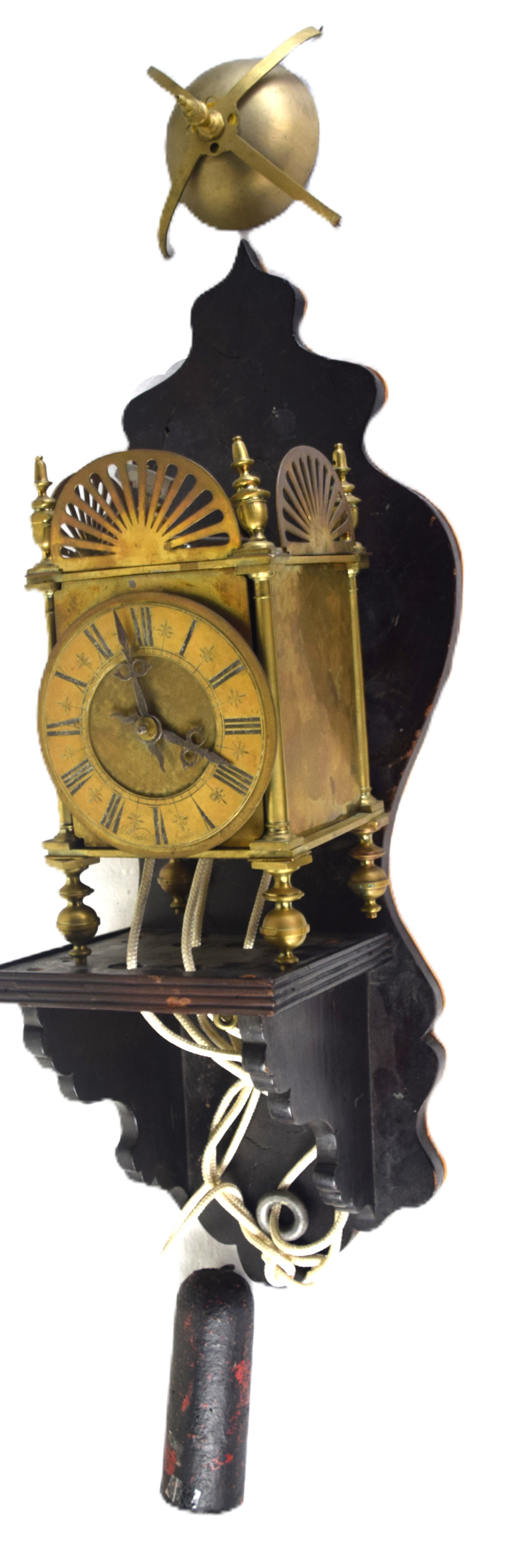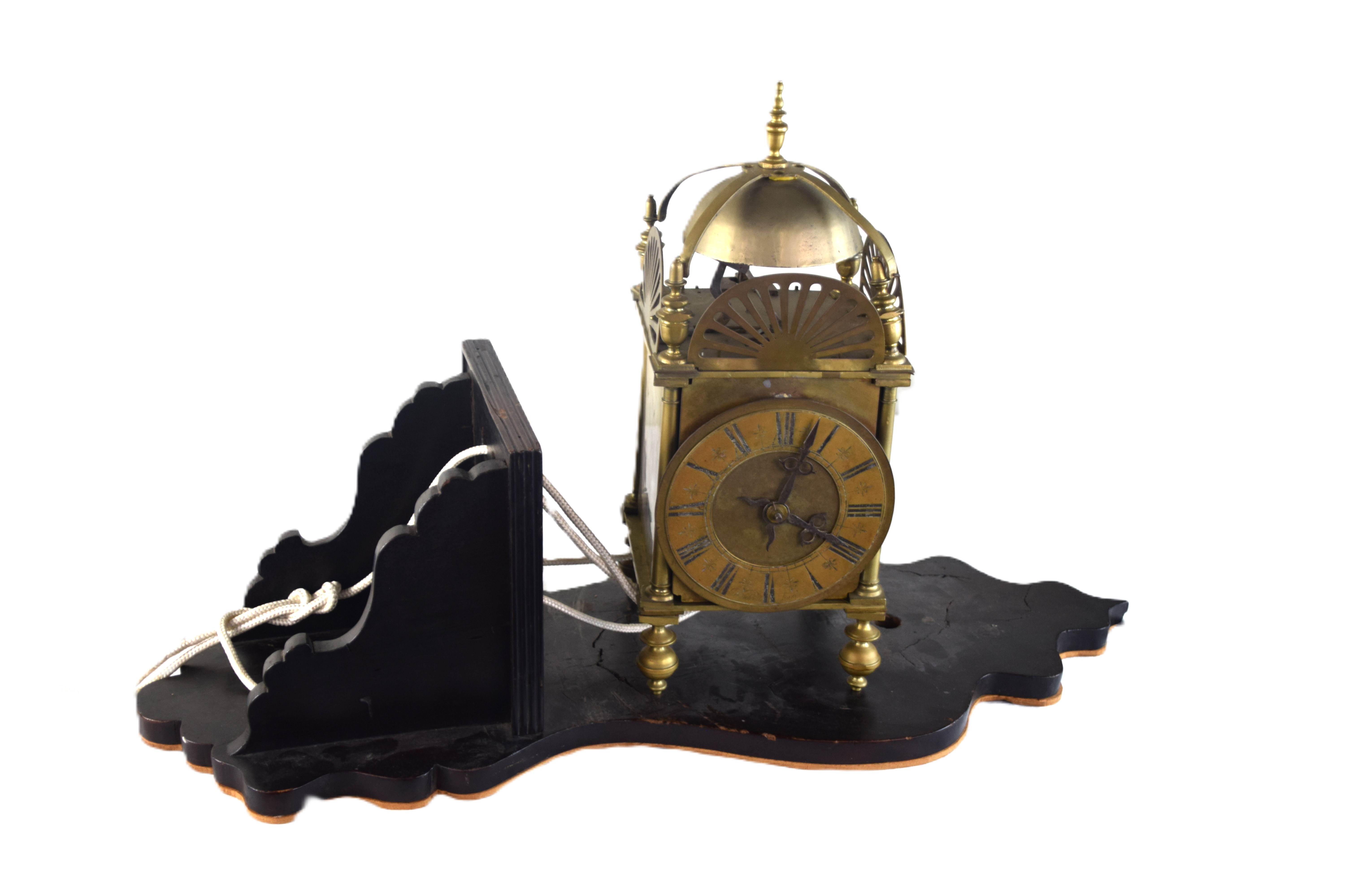 18th/19th century brass lantern clock with a bell formed top, brass reticulated gallery, finials, Roman numerals dial on small turned feet. Resting on a wooden bracket. Dimensions: 15″ Clock Height