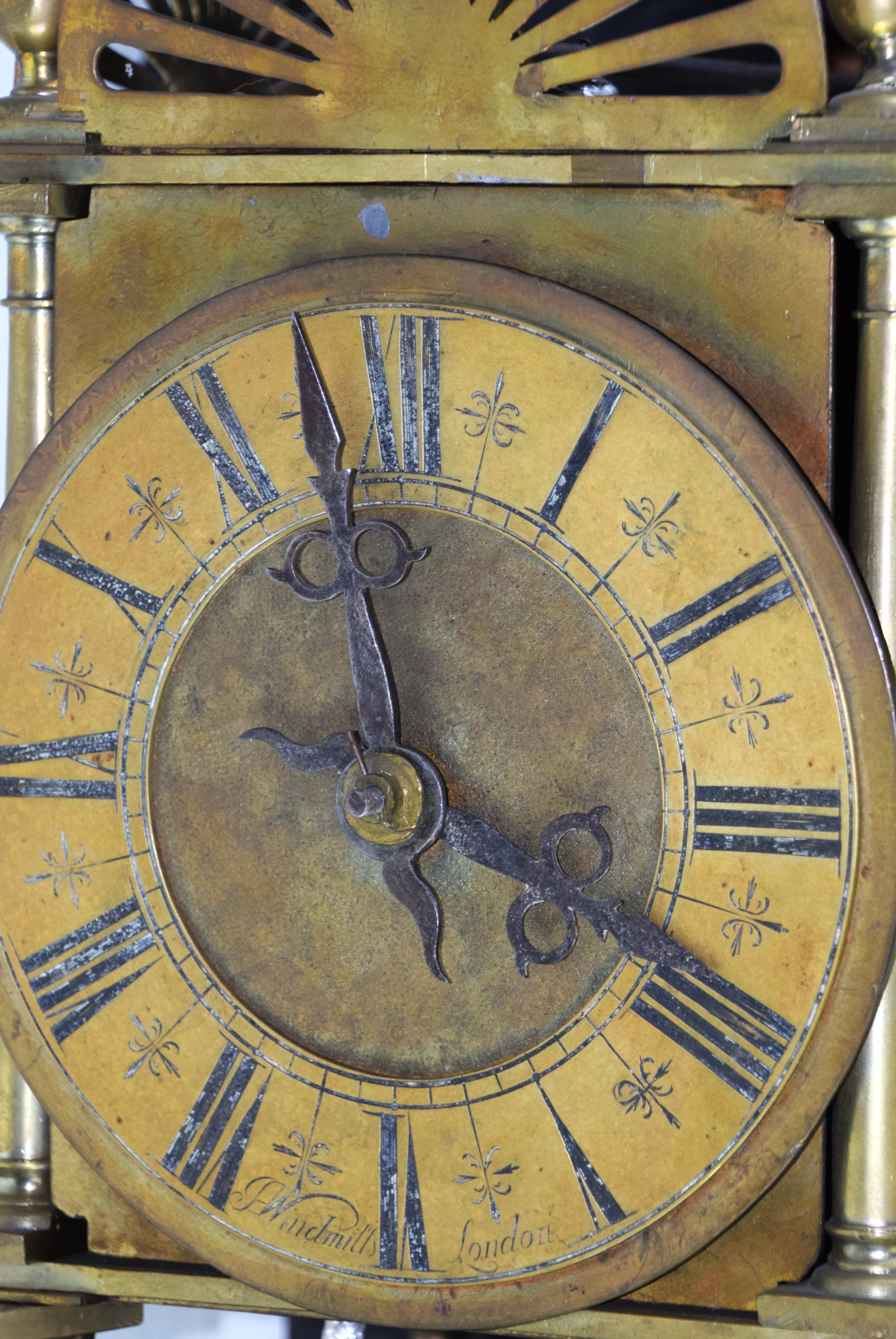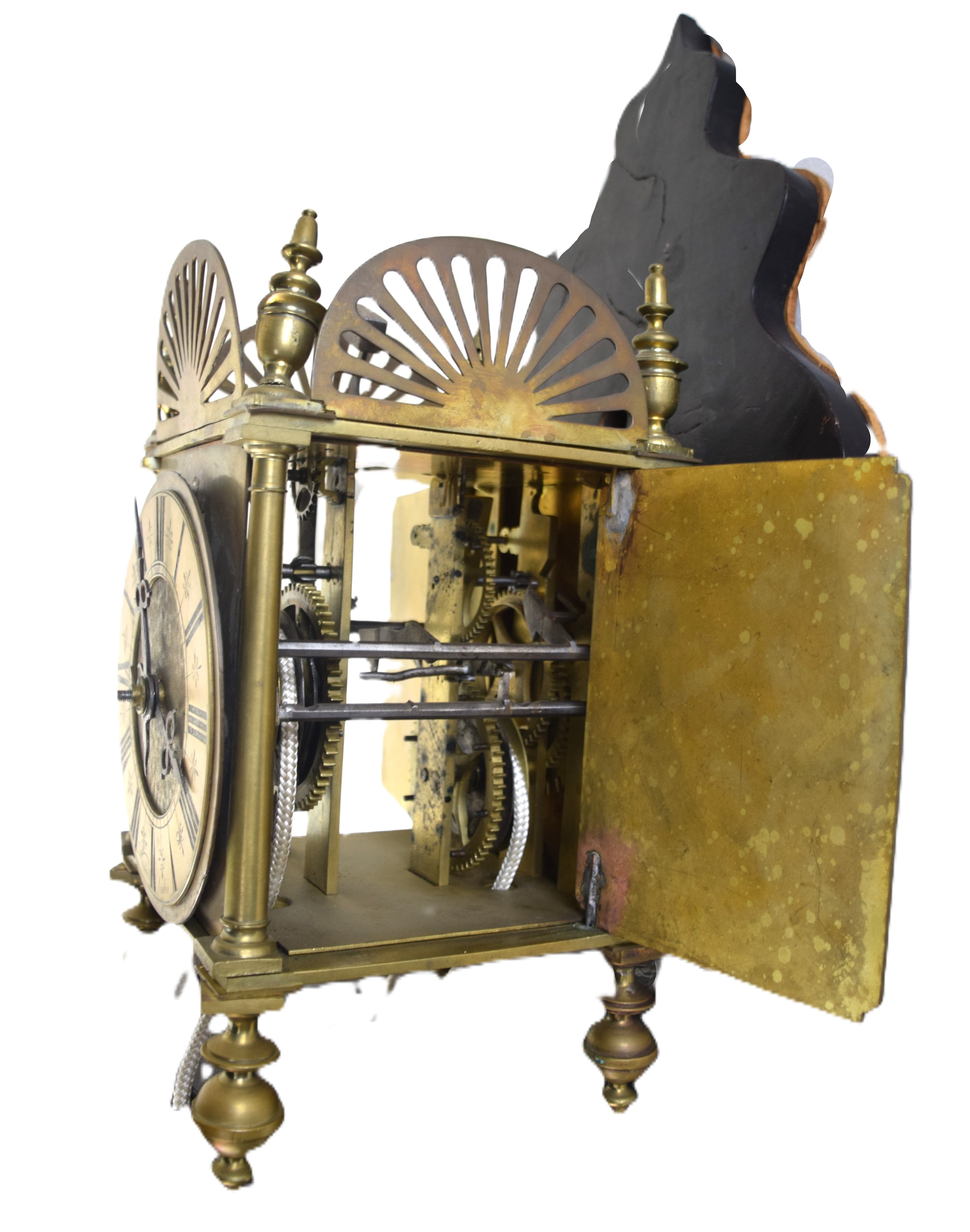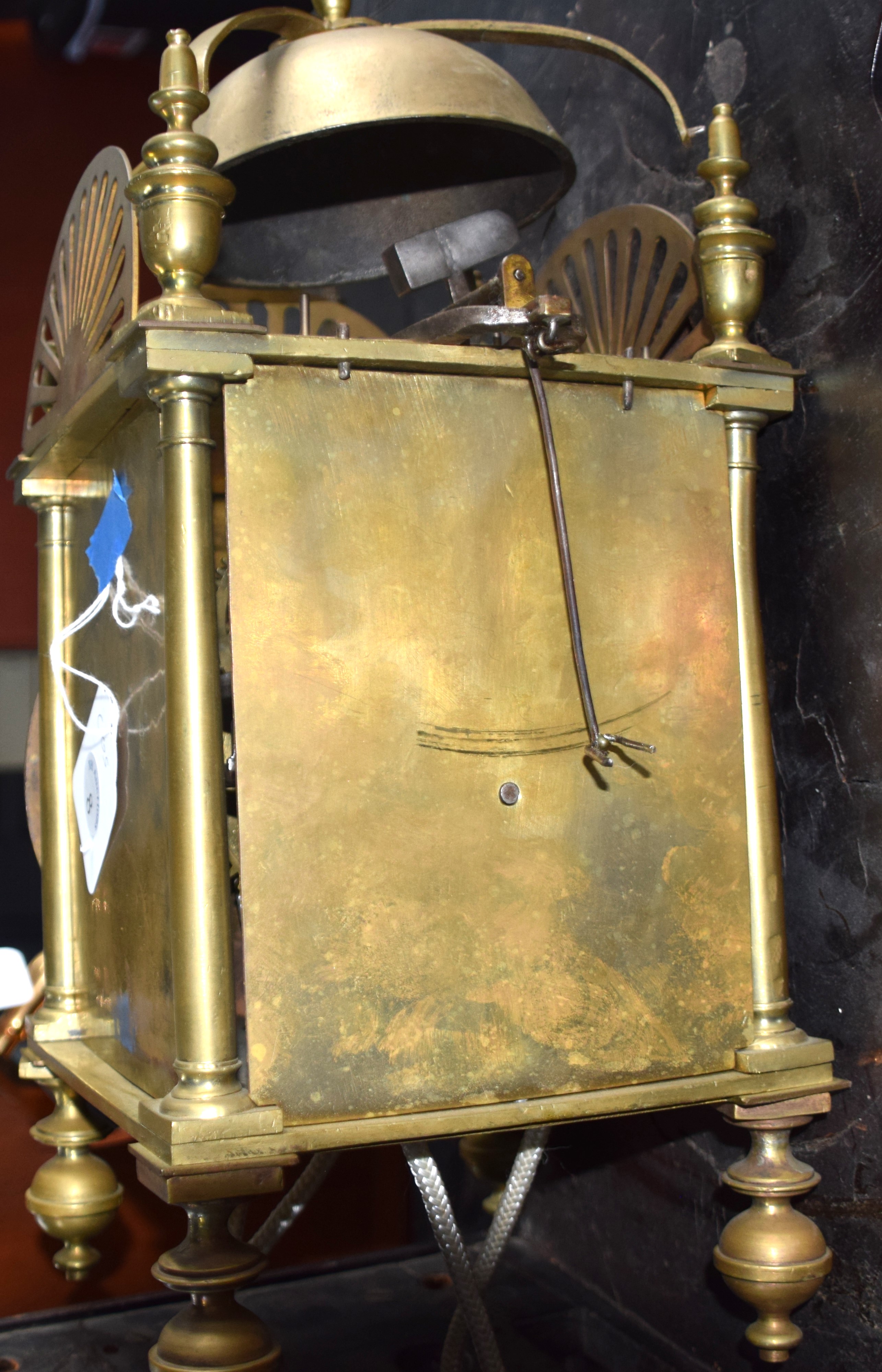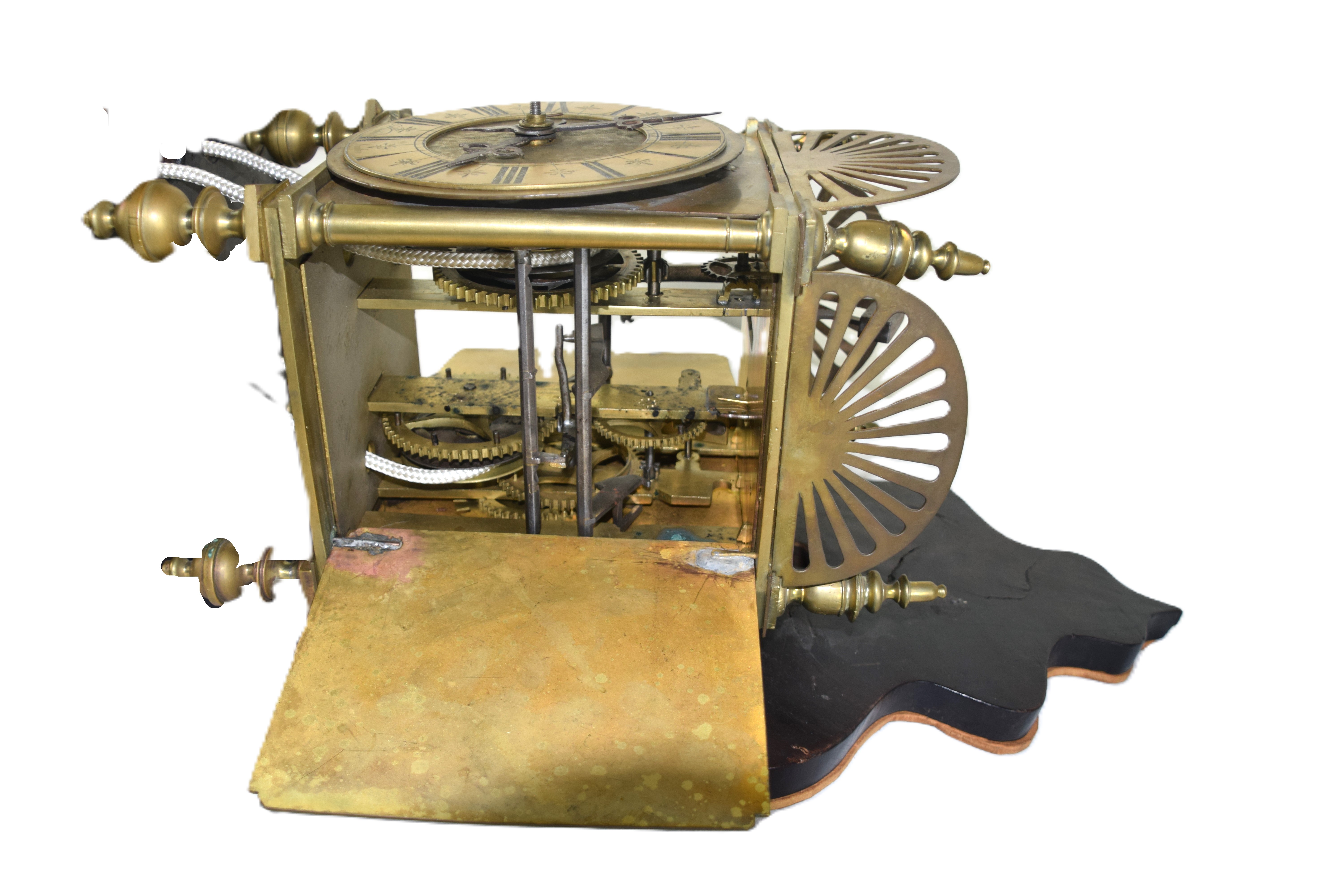 18th/19th century brass lantern clock with a bell formed top, brass reticulated gallery, finials, Roman numerals dial on small turned feet. Resting on a wooden bracket. Dimensions: 15″ Clock Height