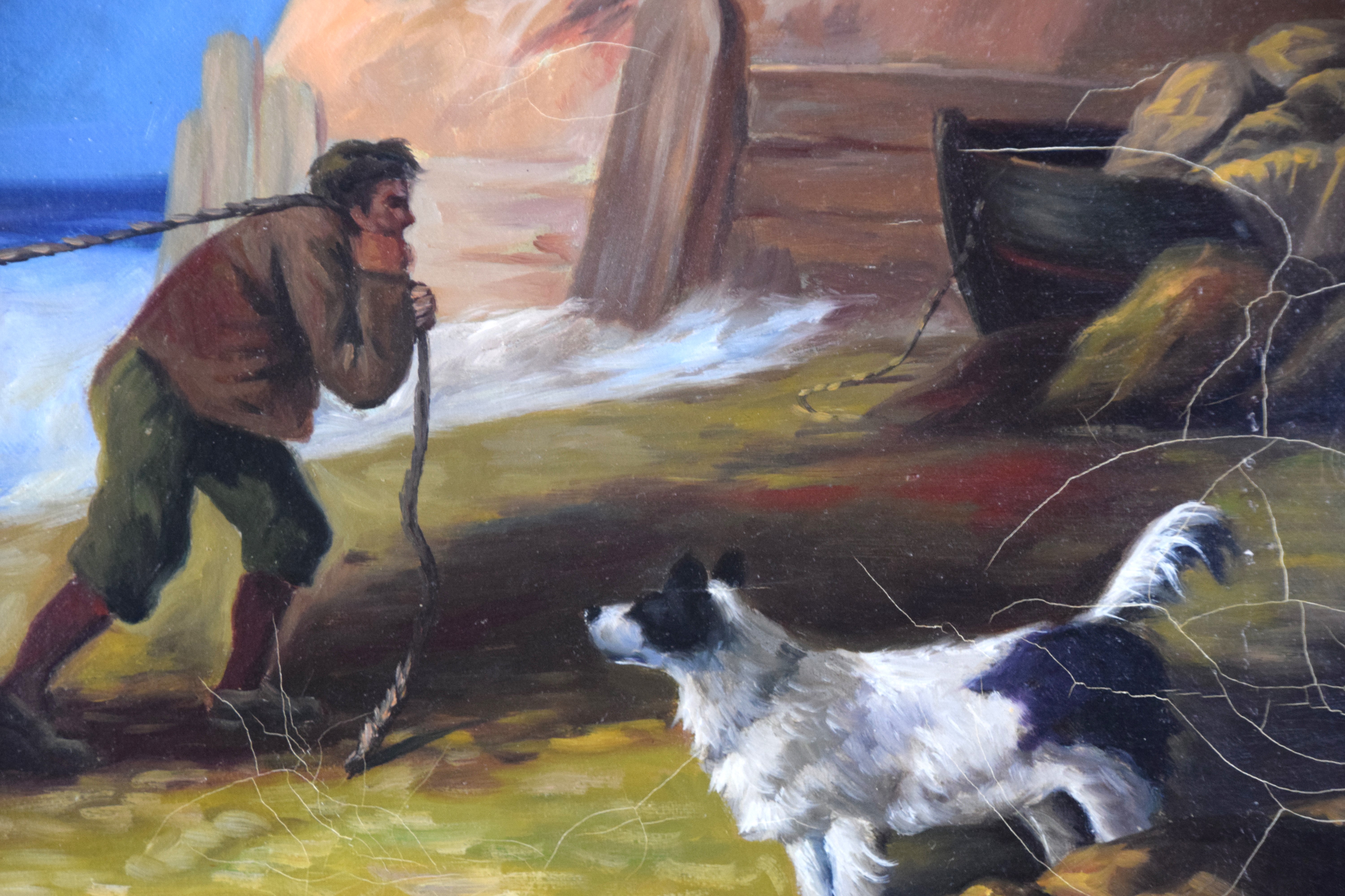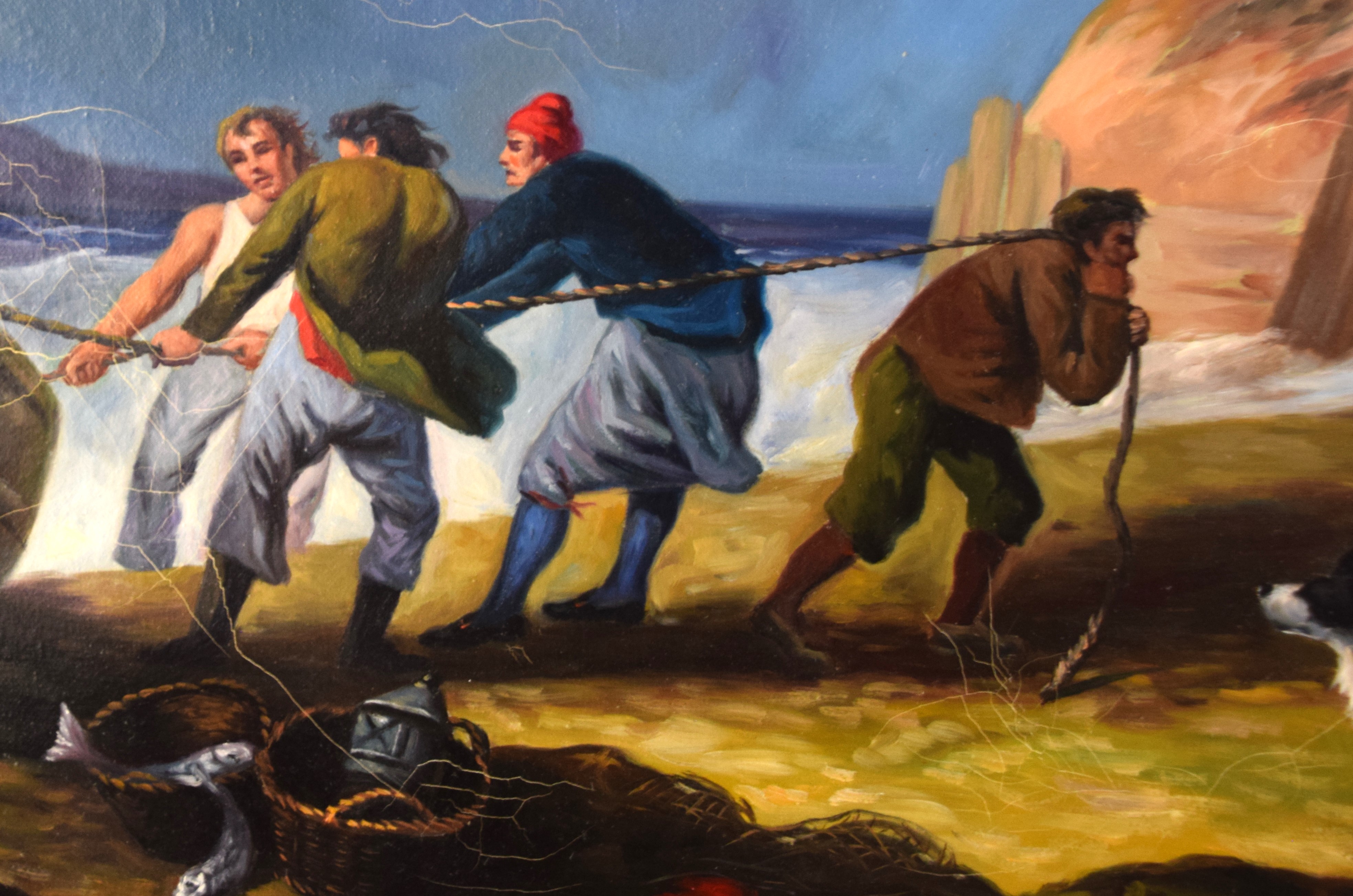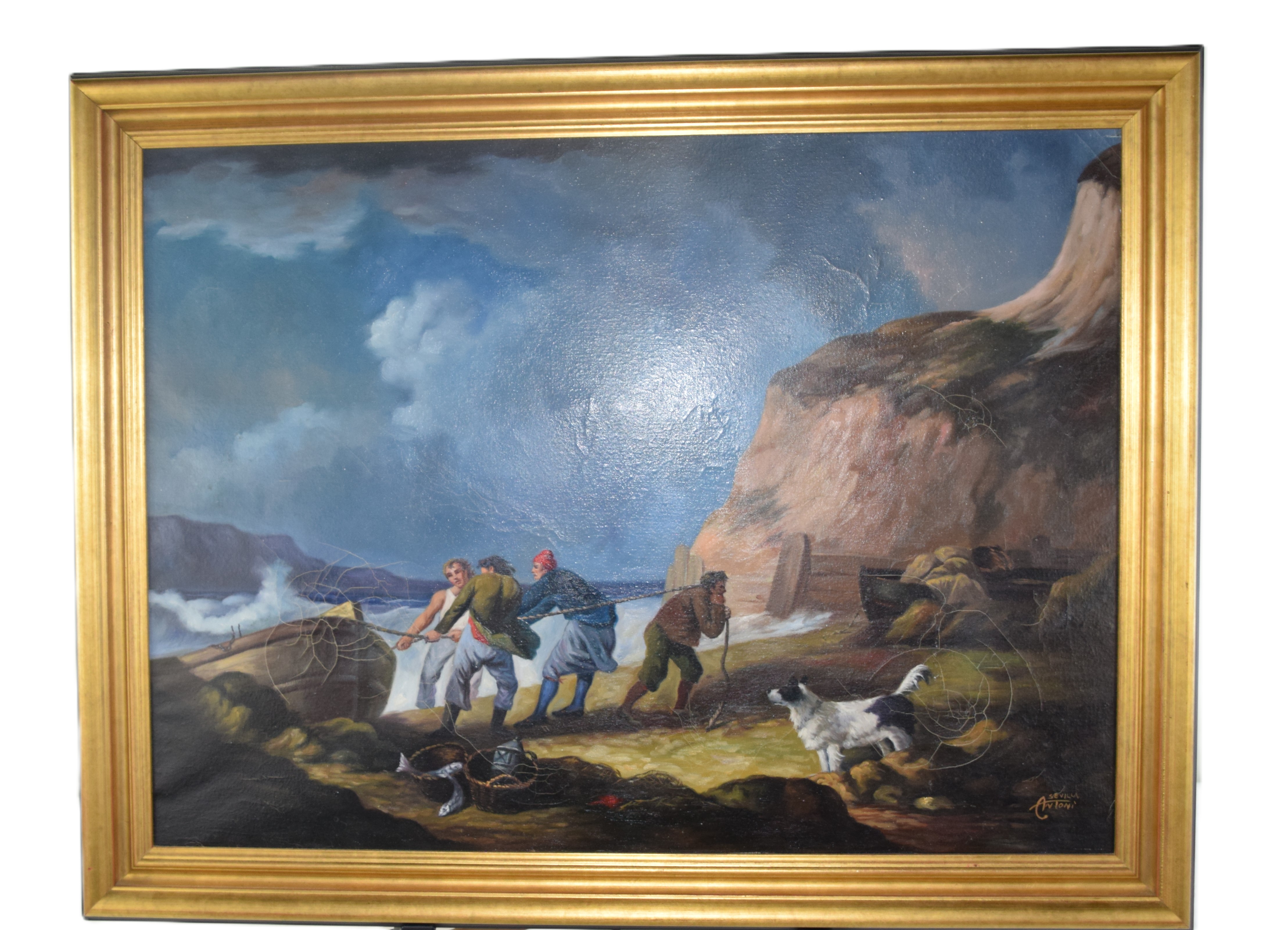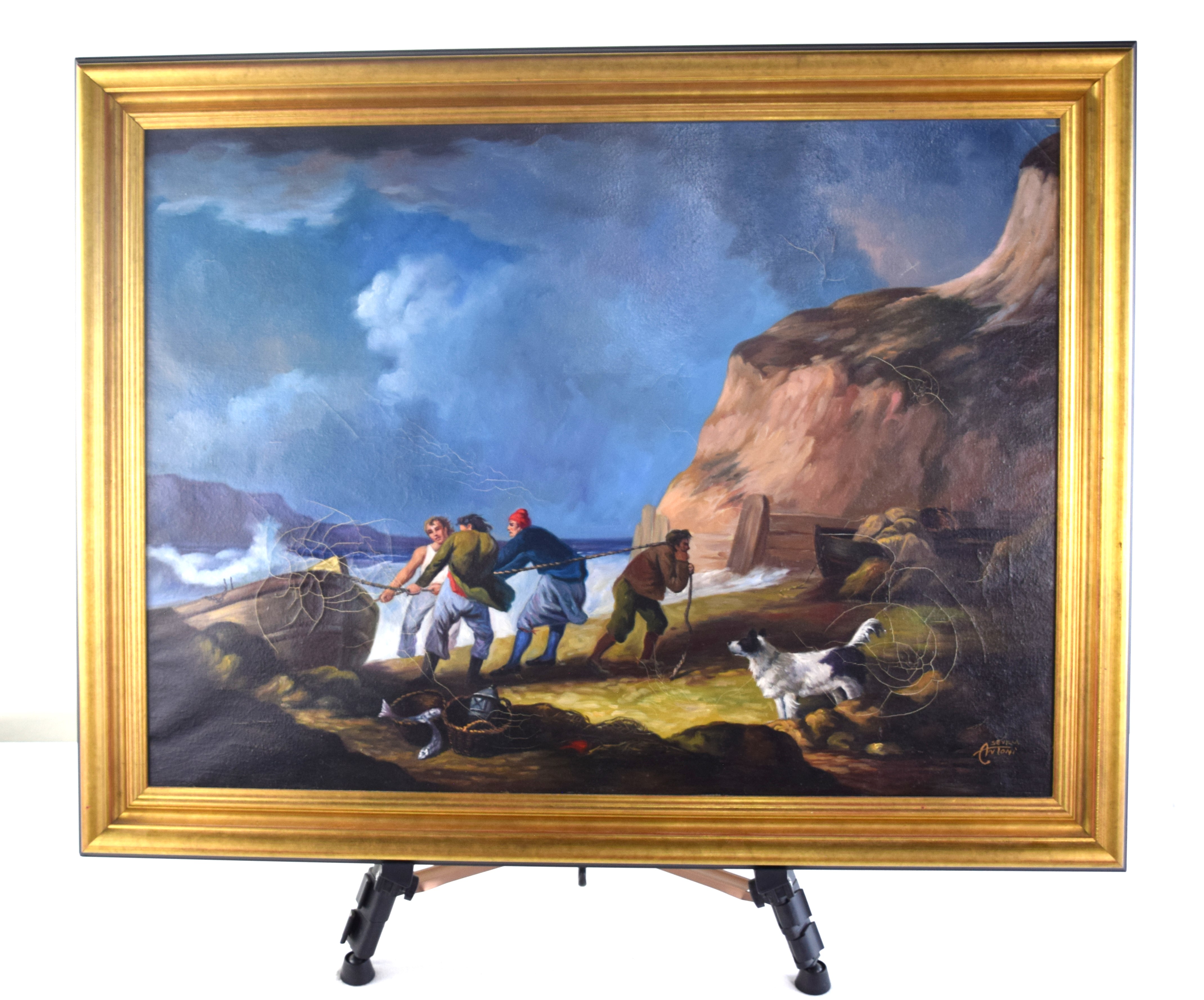 Attractive and signed oil painting of a fishing scene of men pulling a boat onshore in a cove surrounded by a cliff. Dimensions: 21″ X 28″