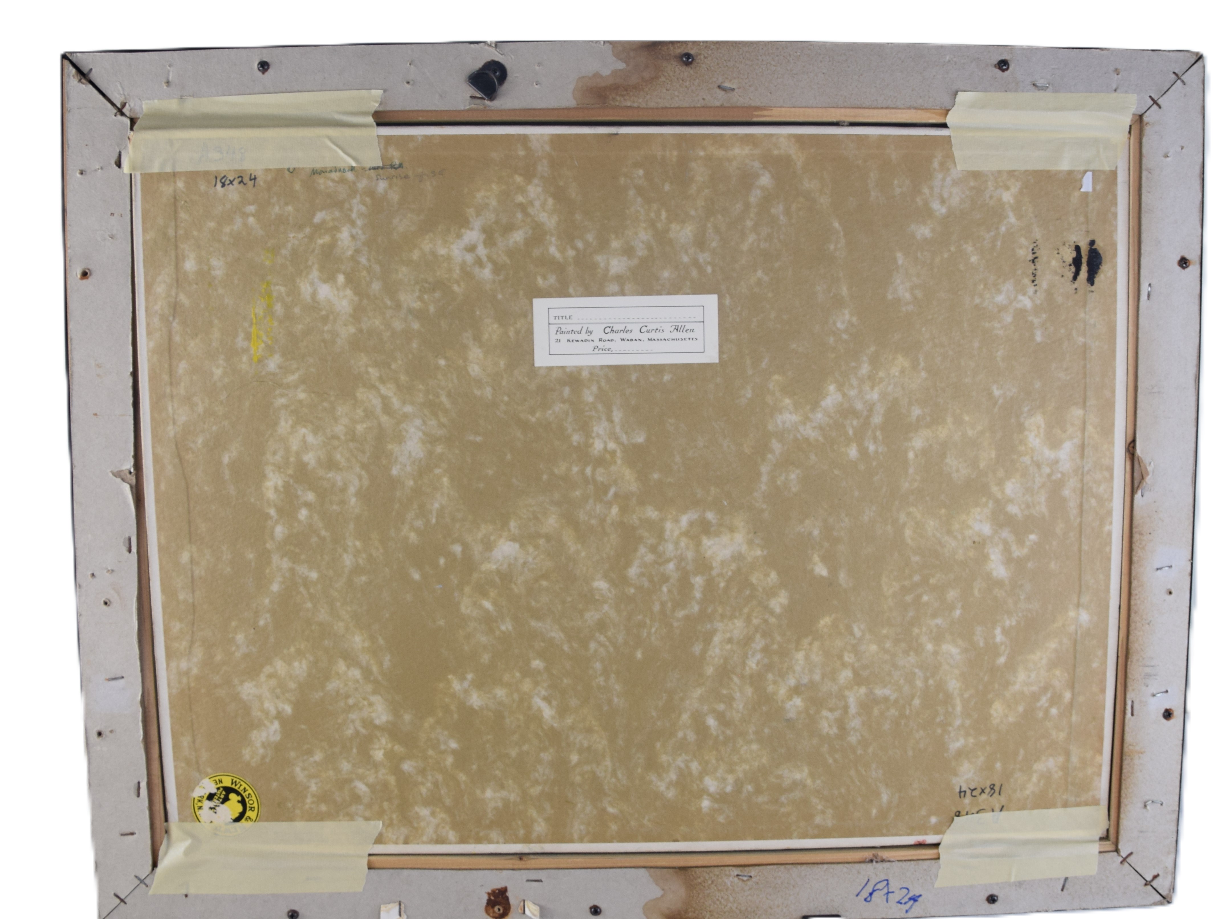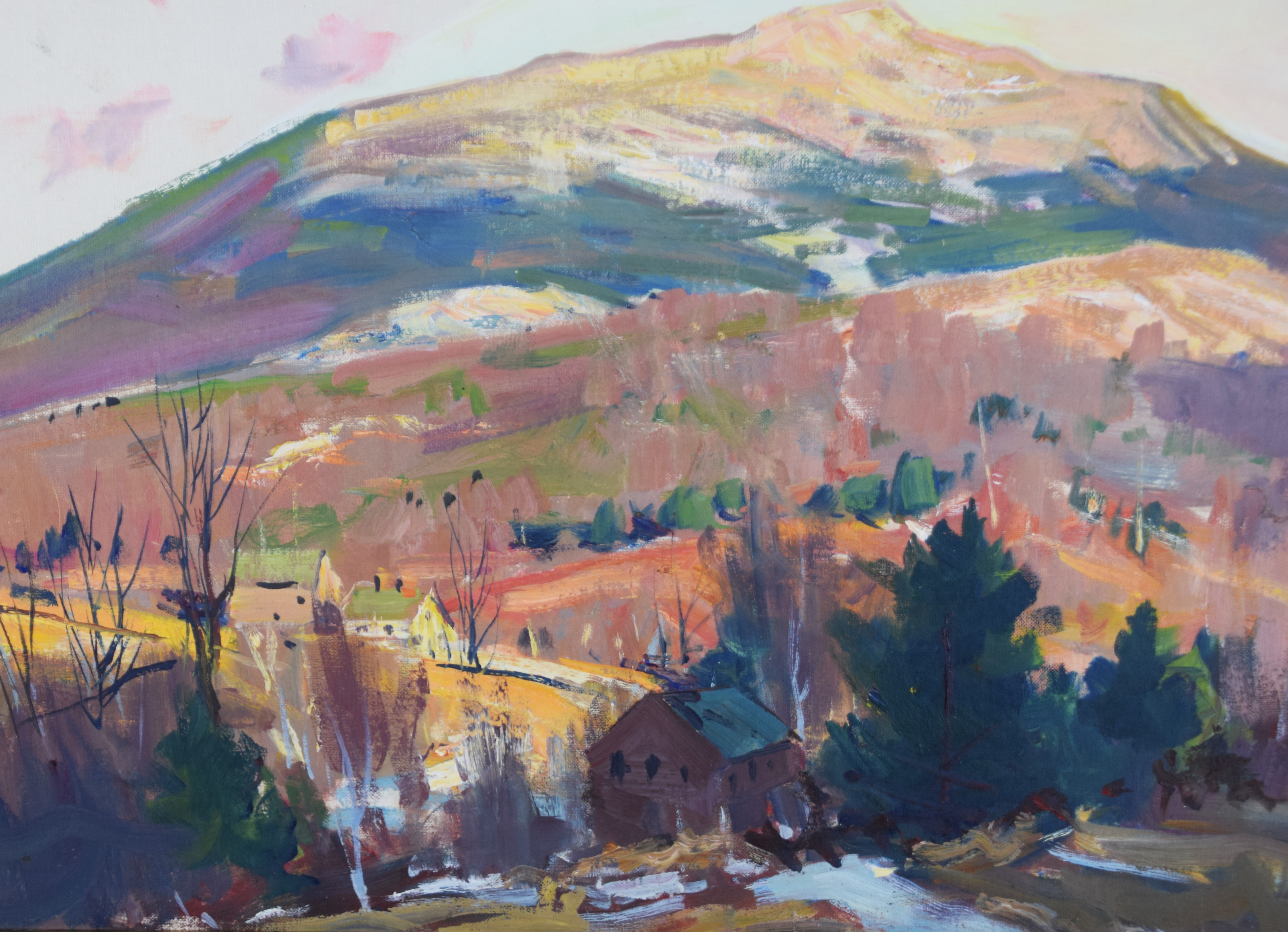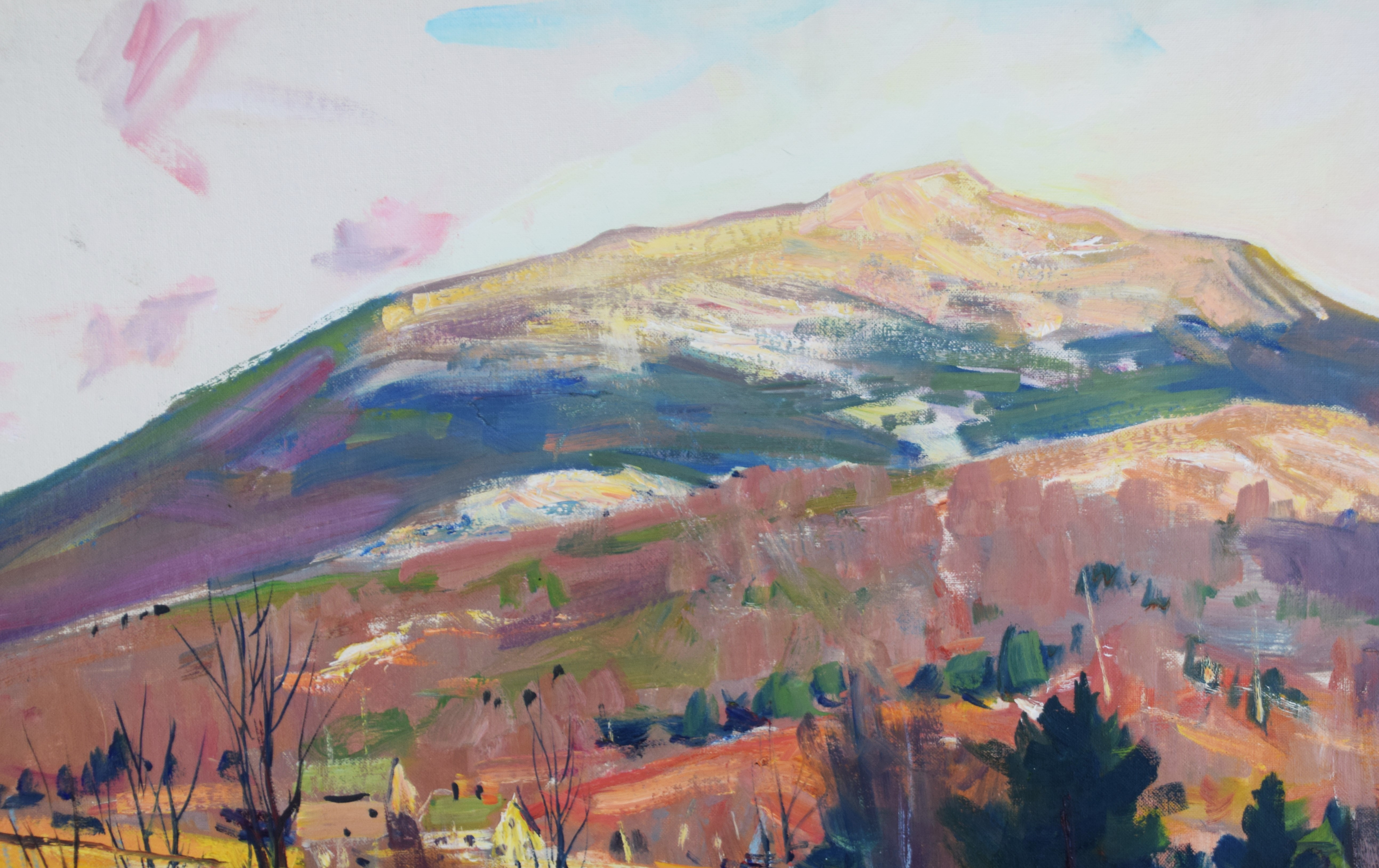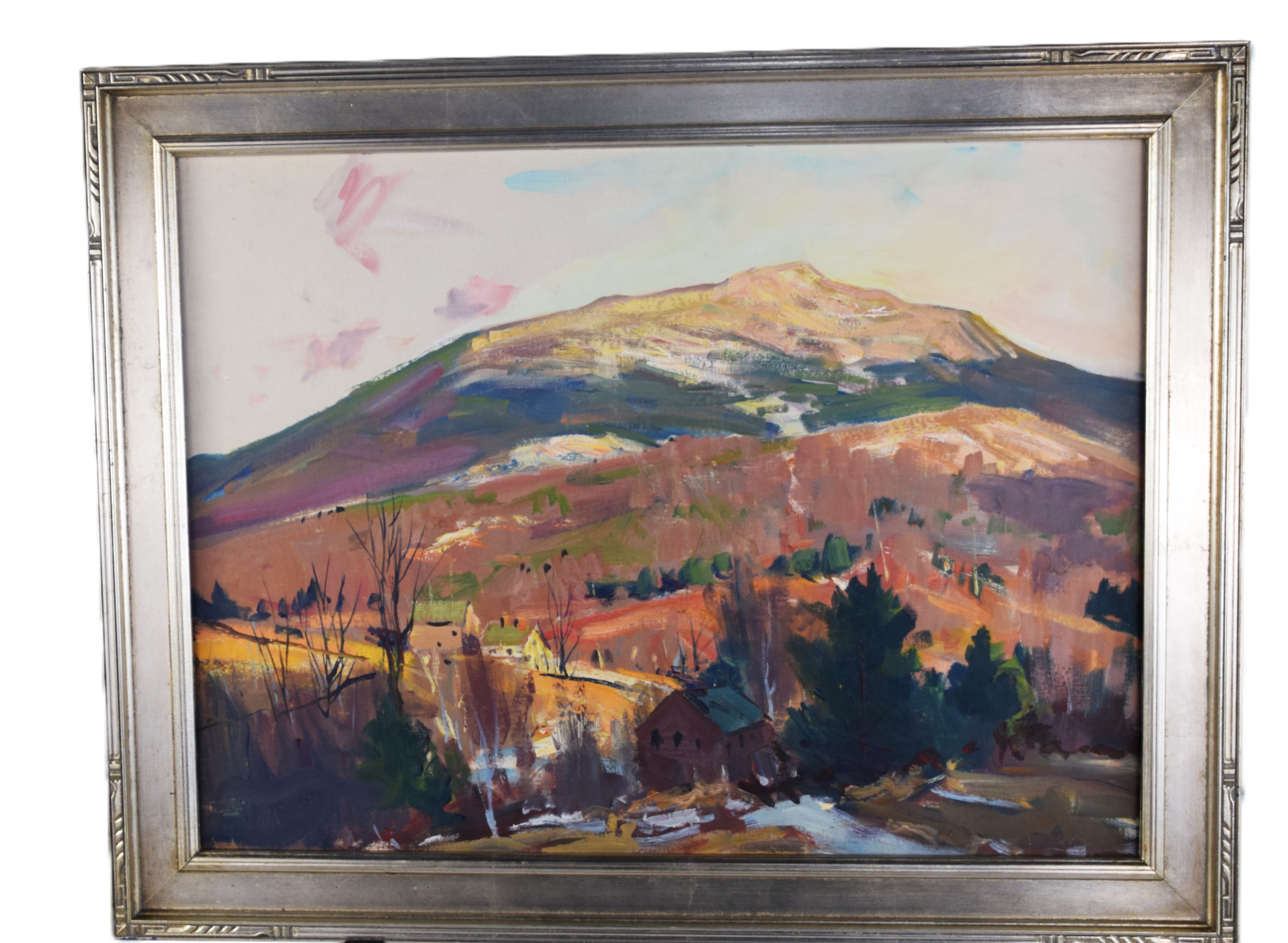 Charles Curtis Allen oil on canvas of Mount Monadnock with a NH village. Artist label on back. Charles Curtis Allen (1886 – 1950) worked in Massachusetts and Vermont. and is known for Impressionist mountain landscape and coastal view painting. Dimensions: 17″ x 23″ Image size, 18″ x 24″ Overall