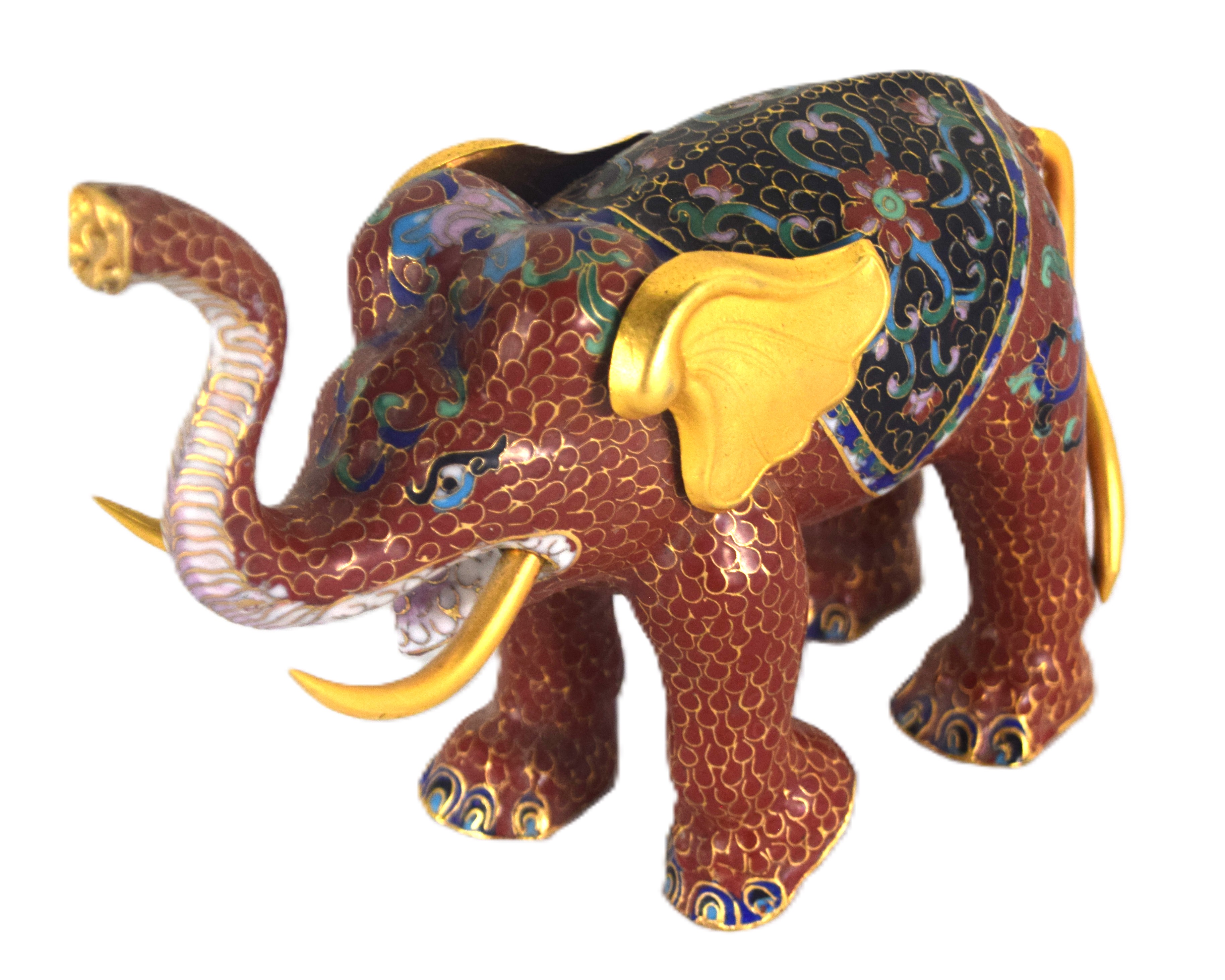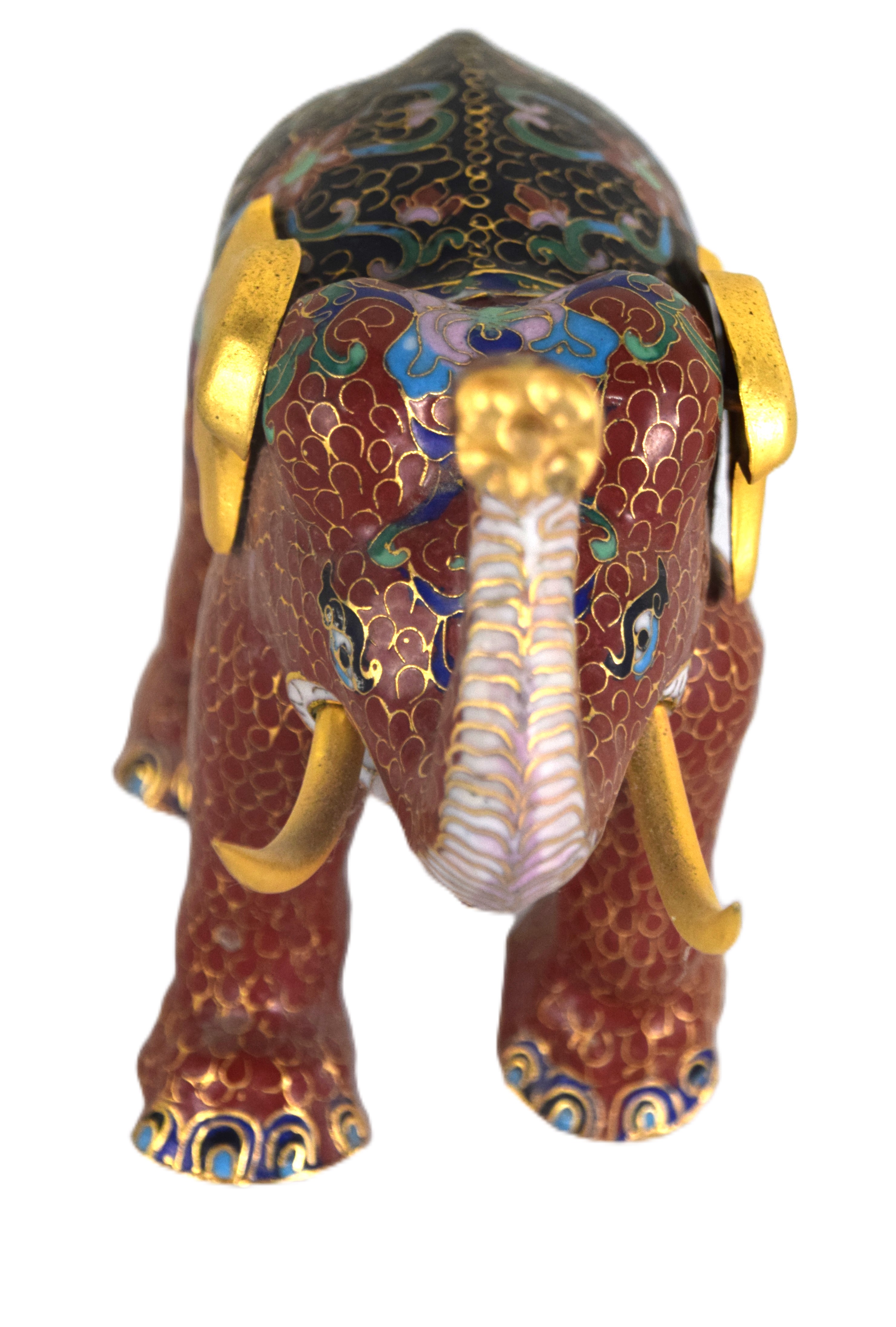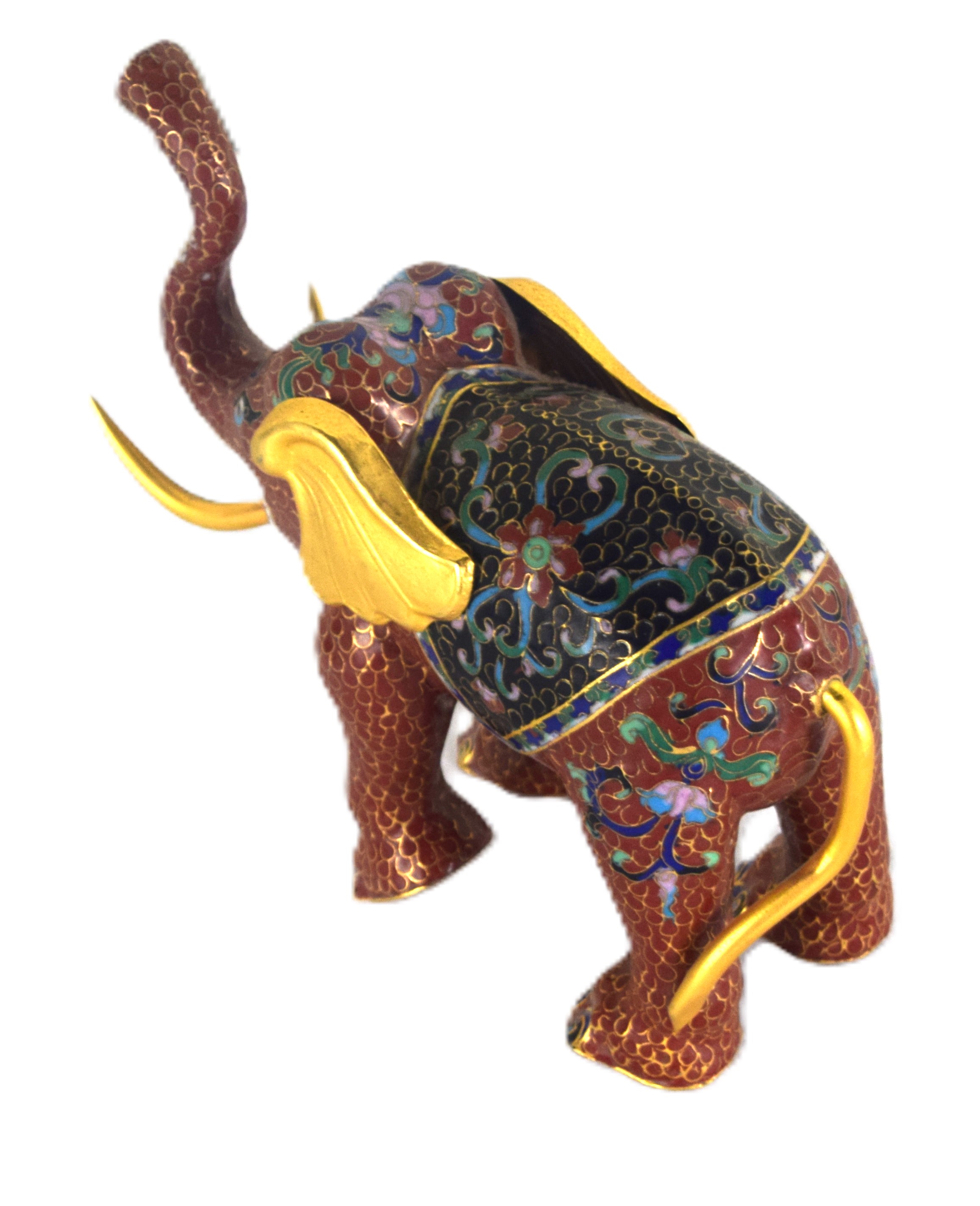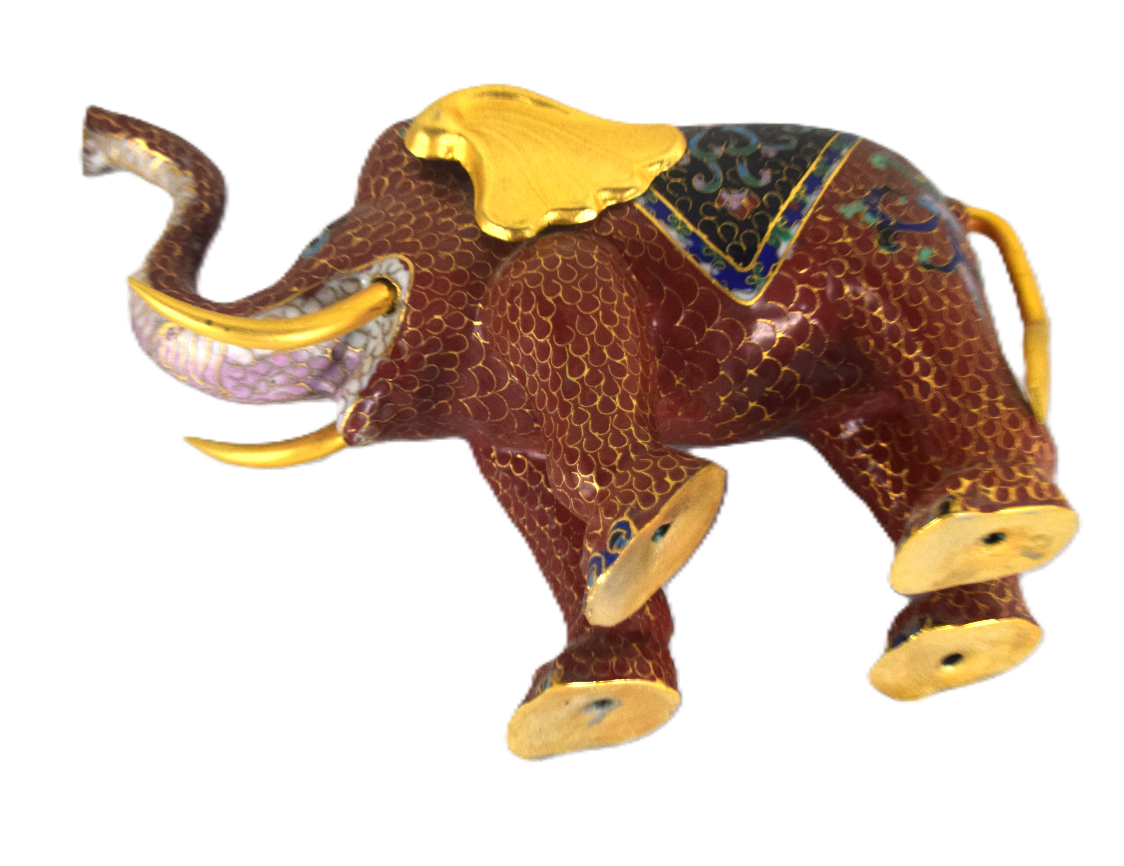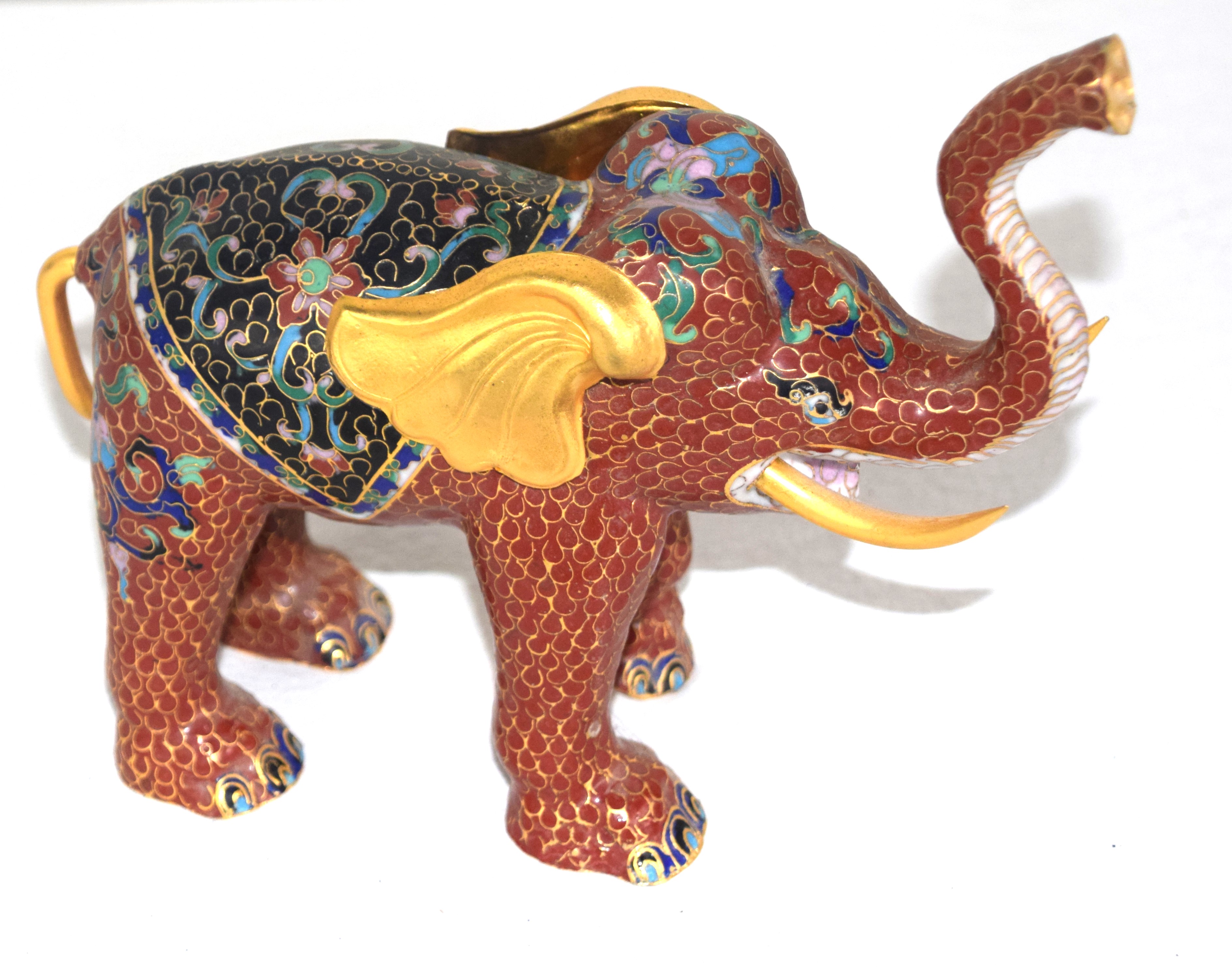 Enameled cloisonne elephant, multi-color designs with gold ears. Dimensions: 7″ H, 8″ L