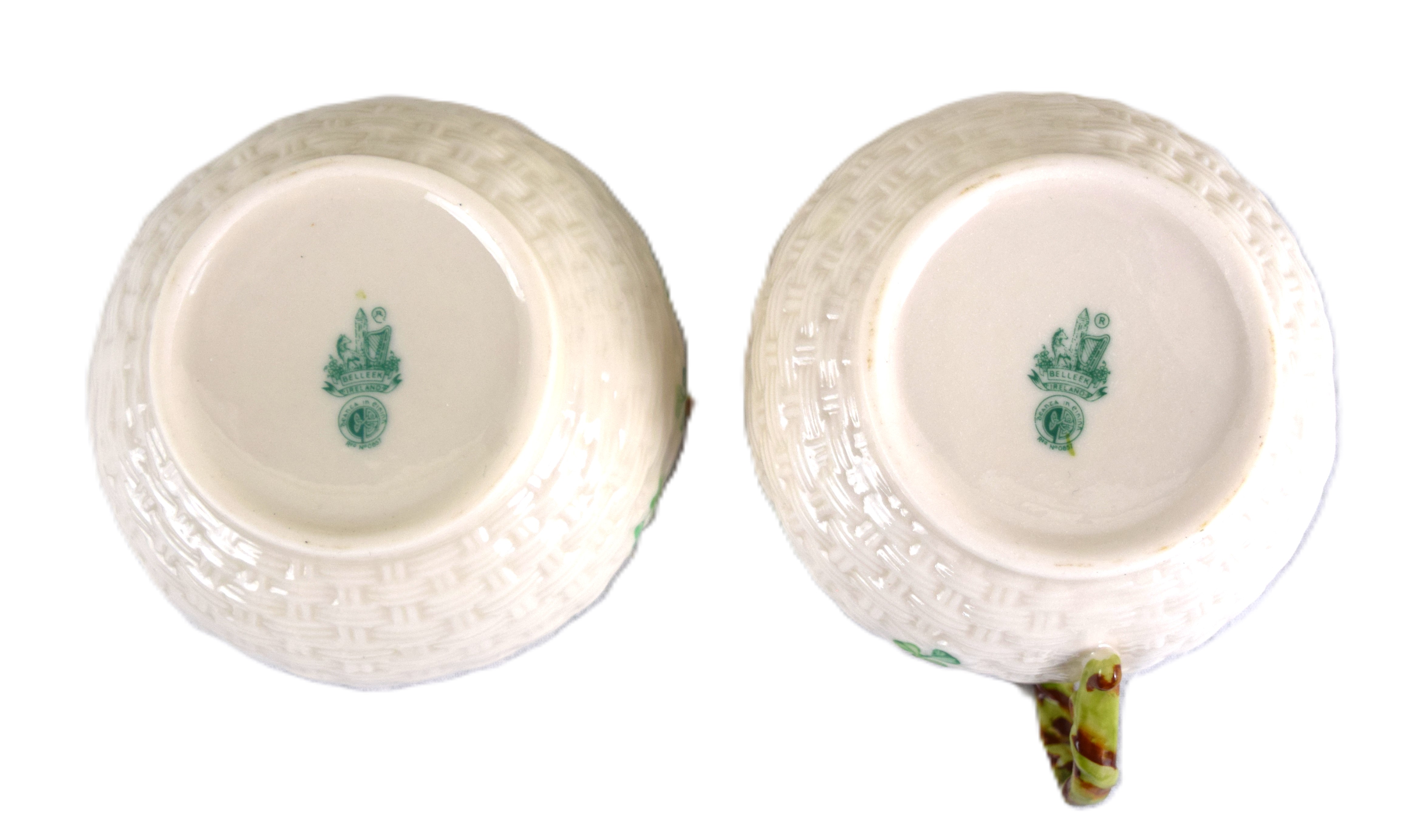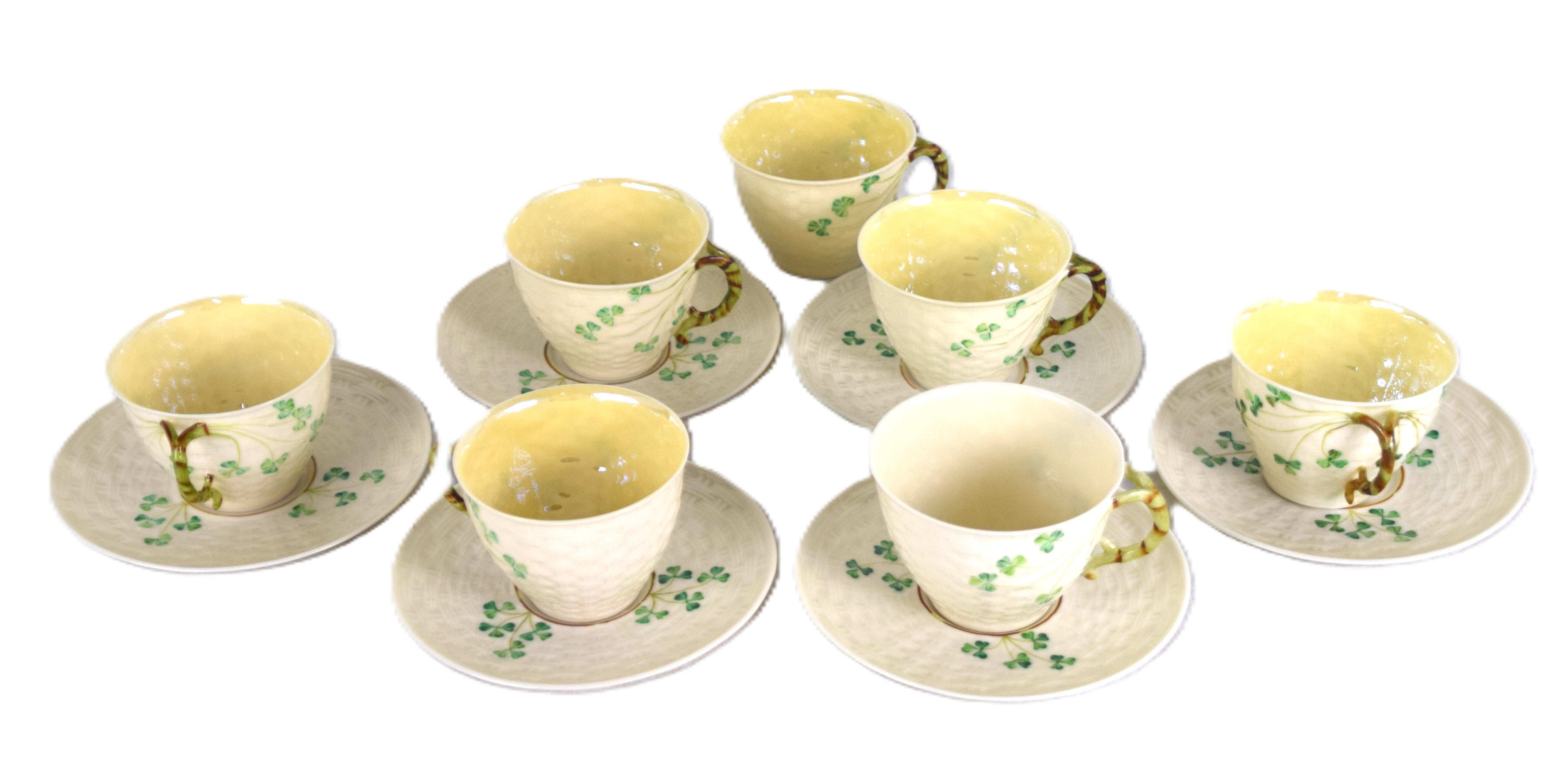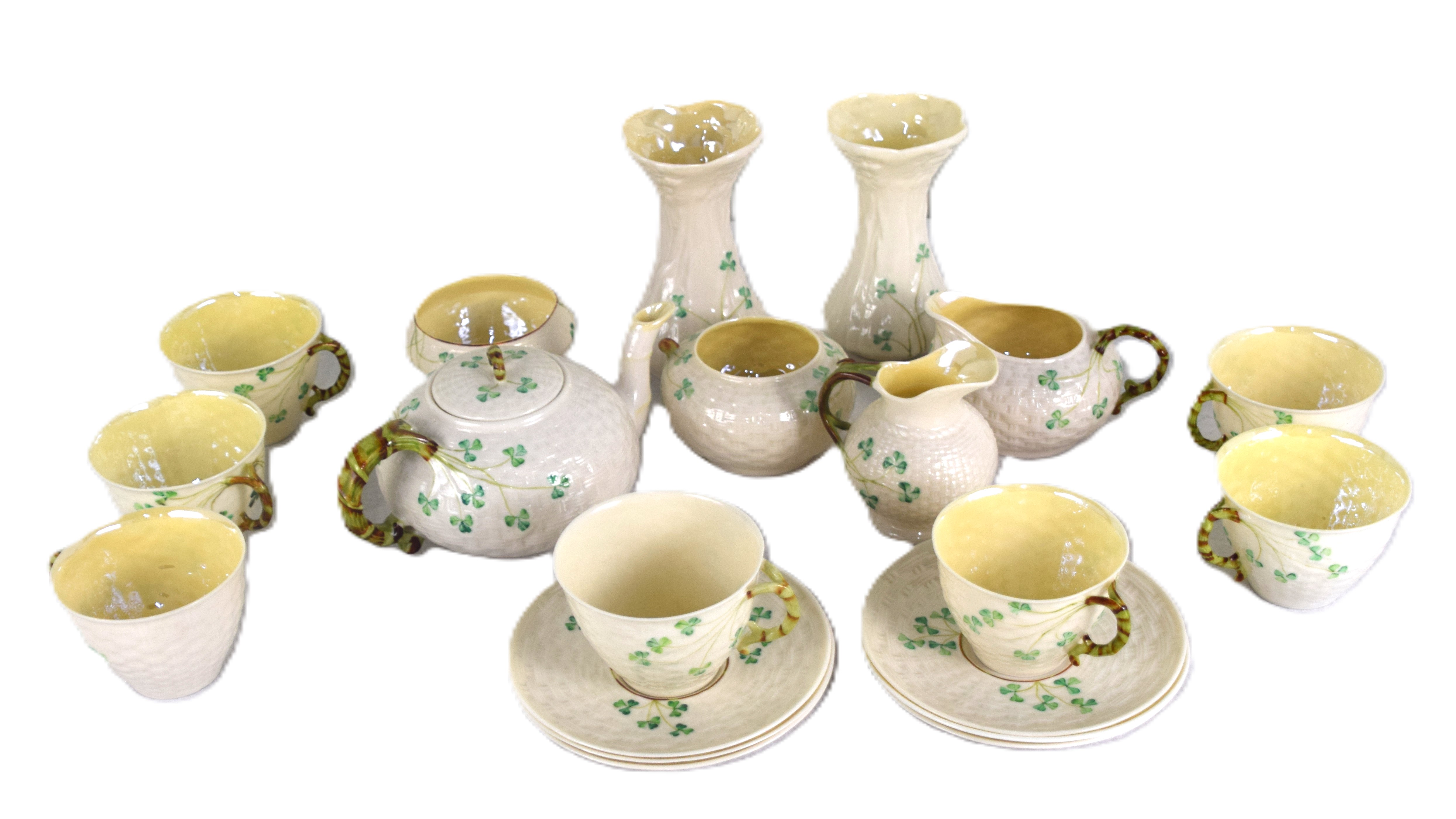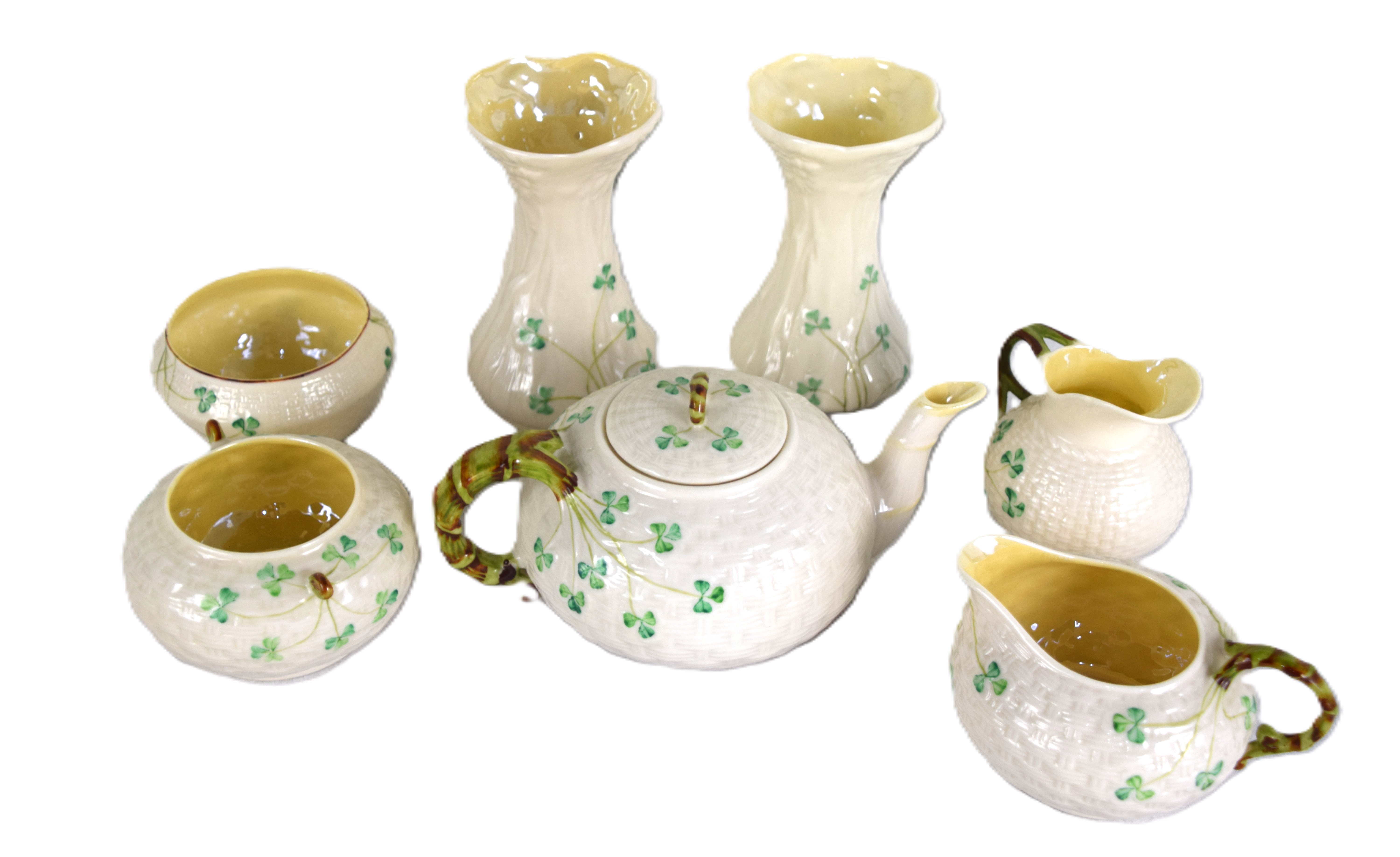 Great Belleek tea set to include a teapot (4.5″ H), 2 creamers, 2 sugars, 2 vases (6″ H) and 7 cups with 6 saucers.