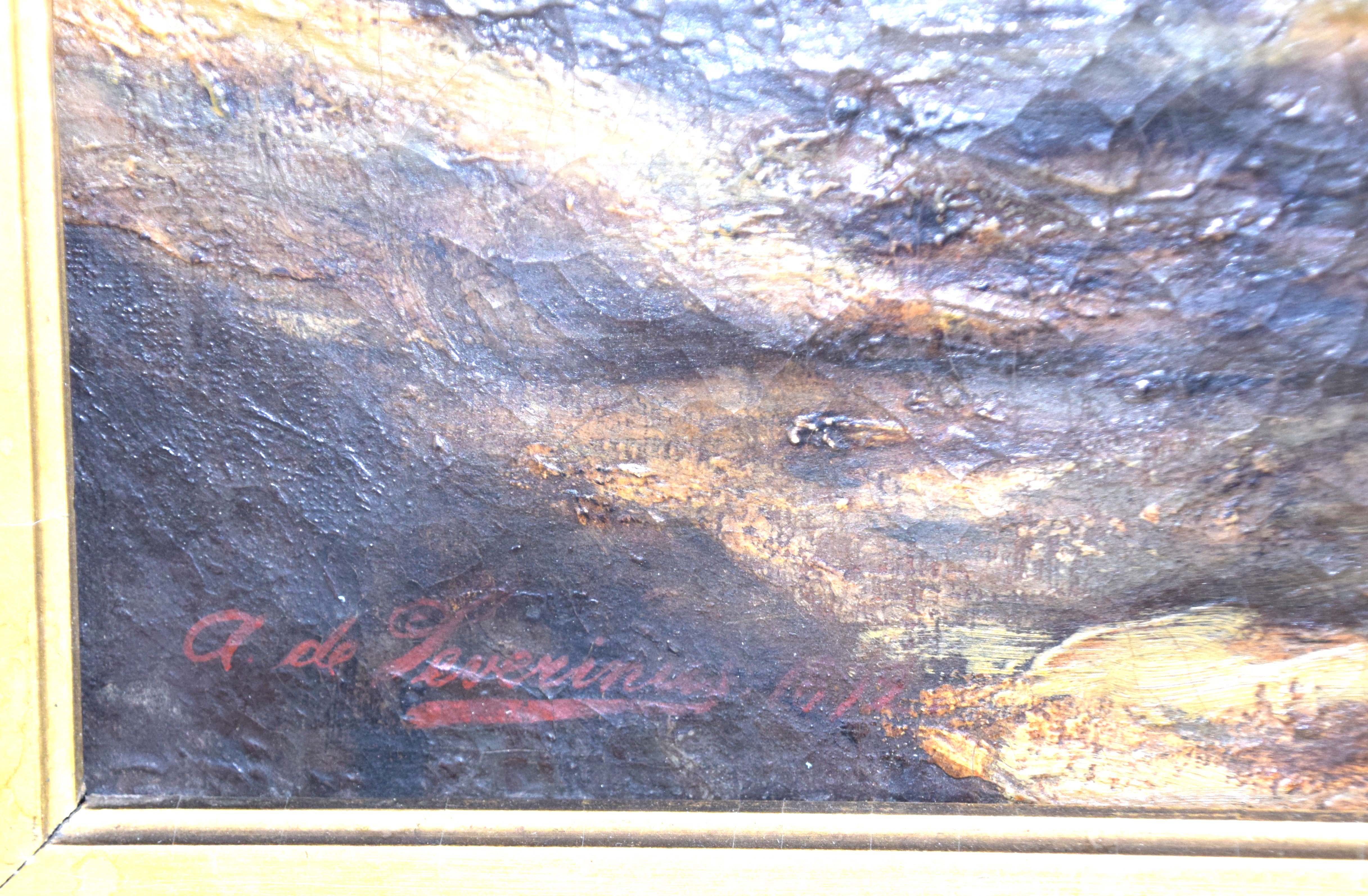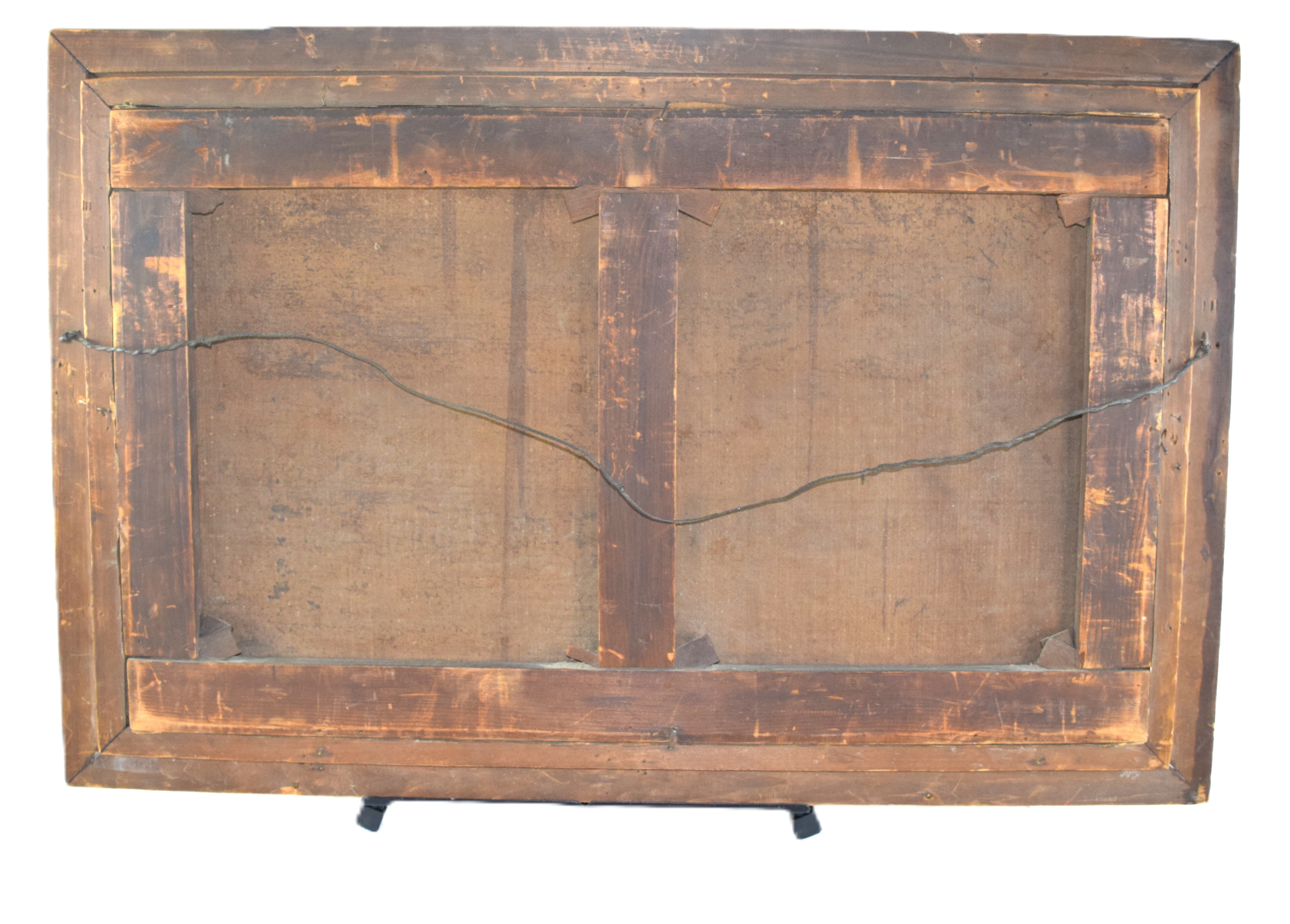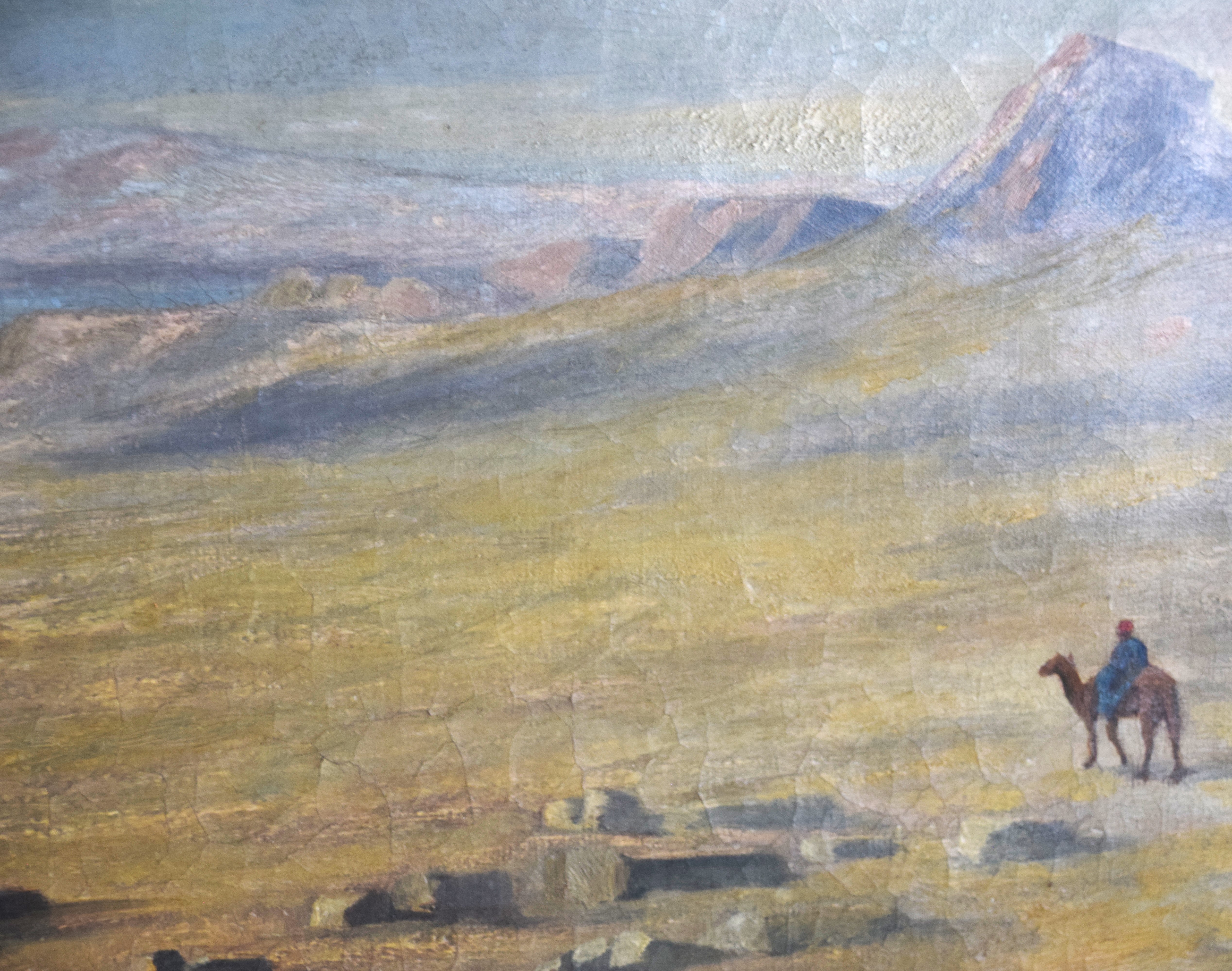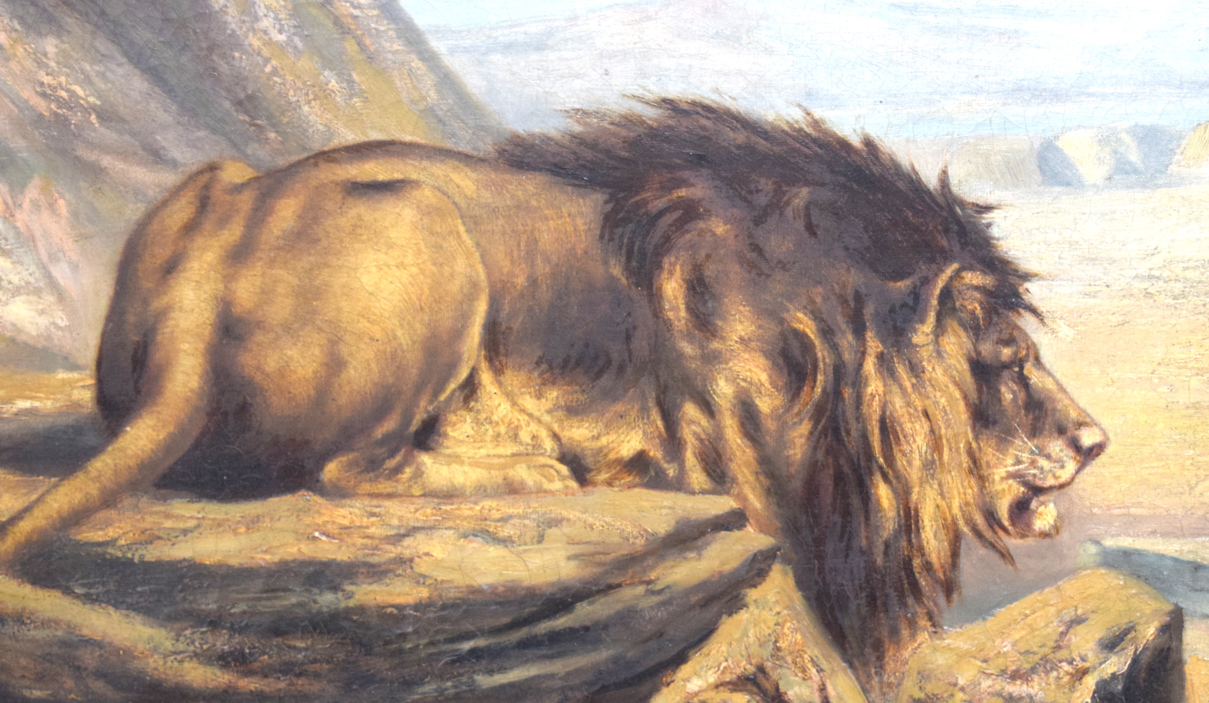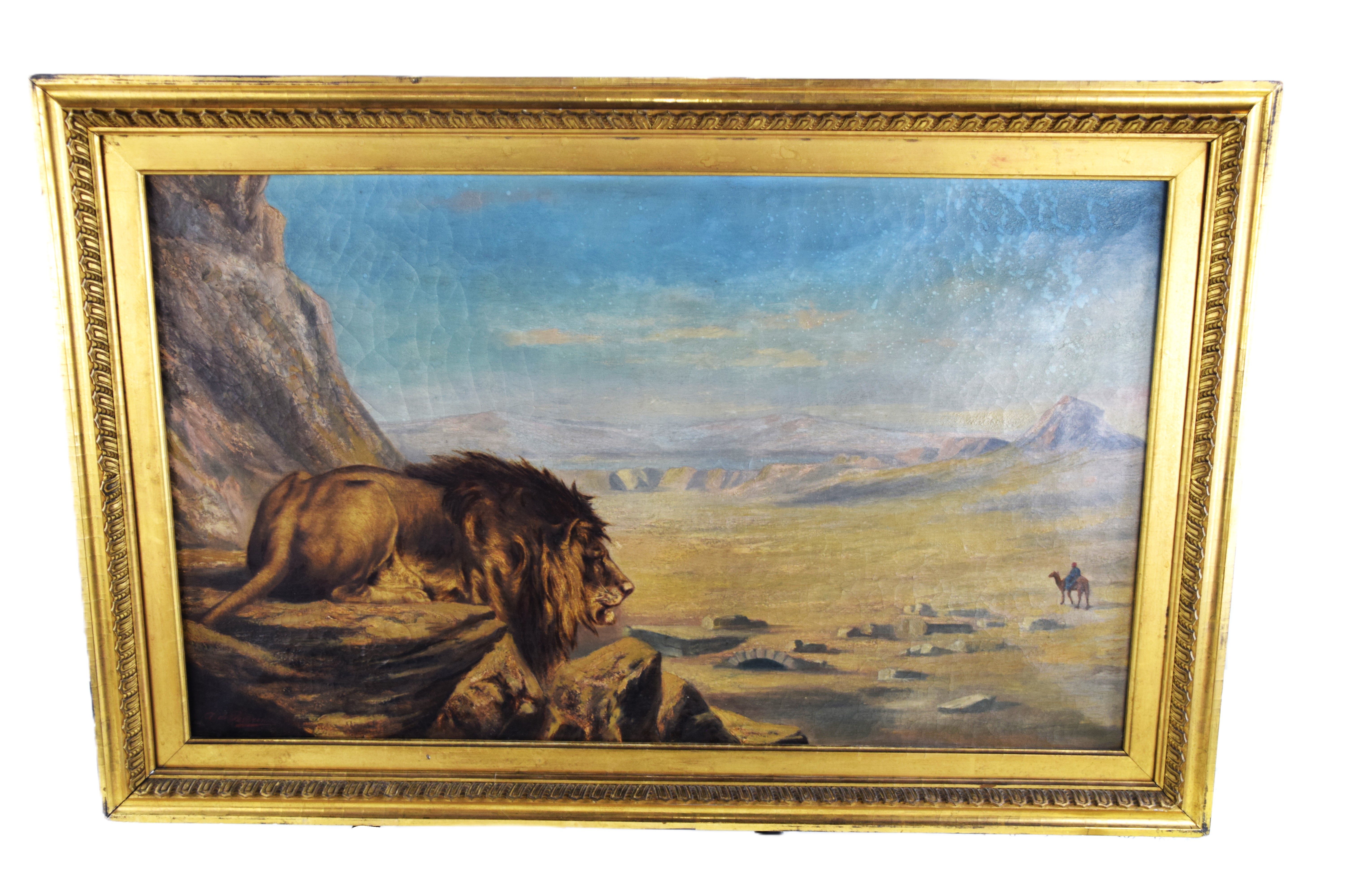 Framed and signed illegibly of a 19th Century desert landscape with a lion on a mountain ledge eying a man on a camel in the desert. Dimensions: 17″ x 29.5″ Image size