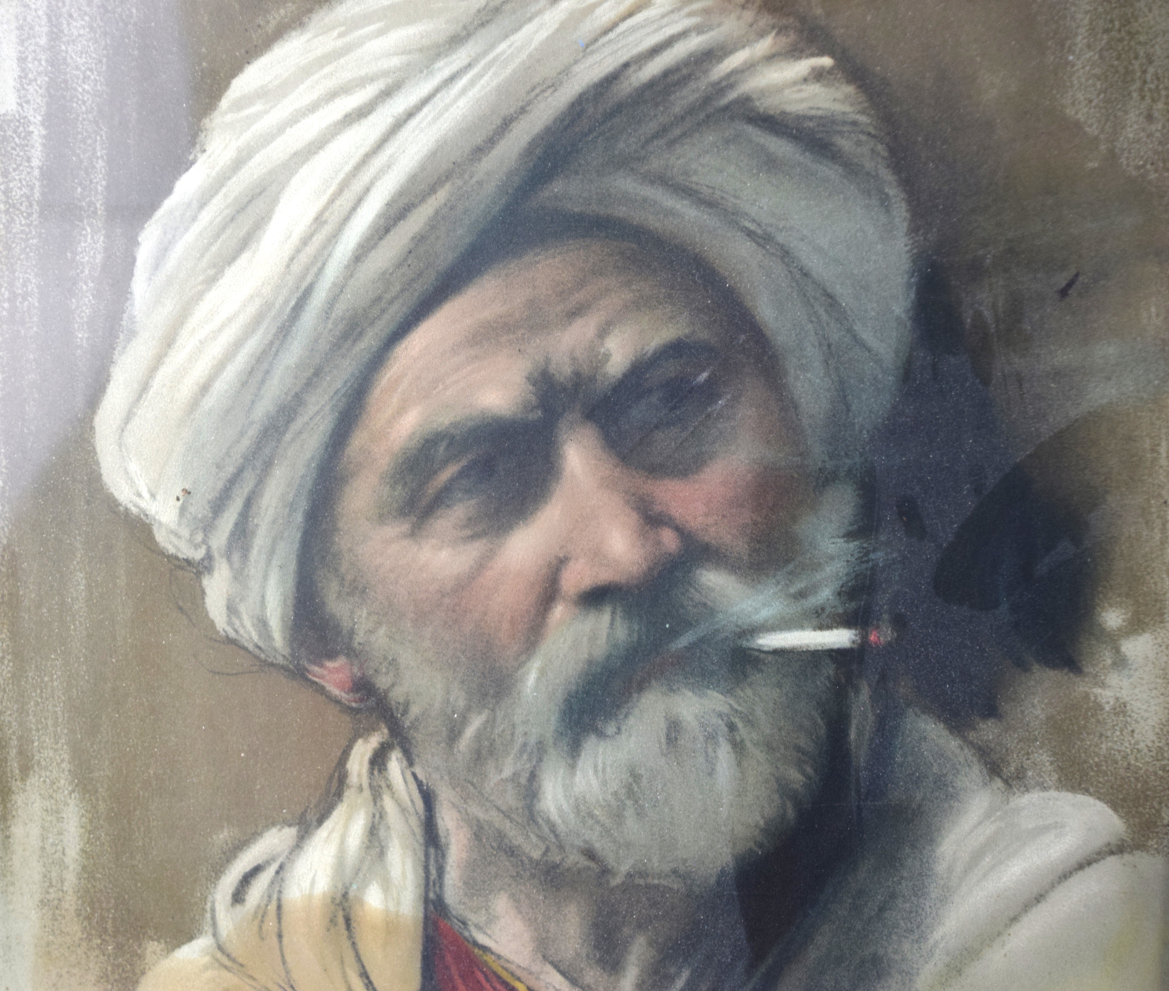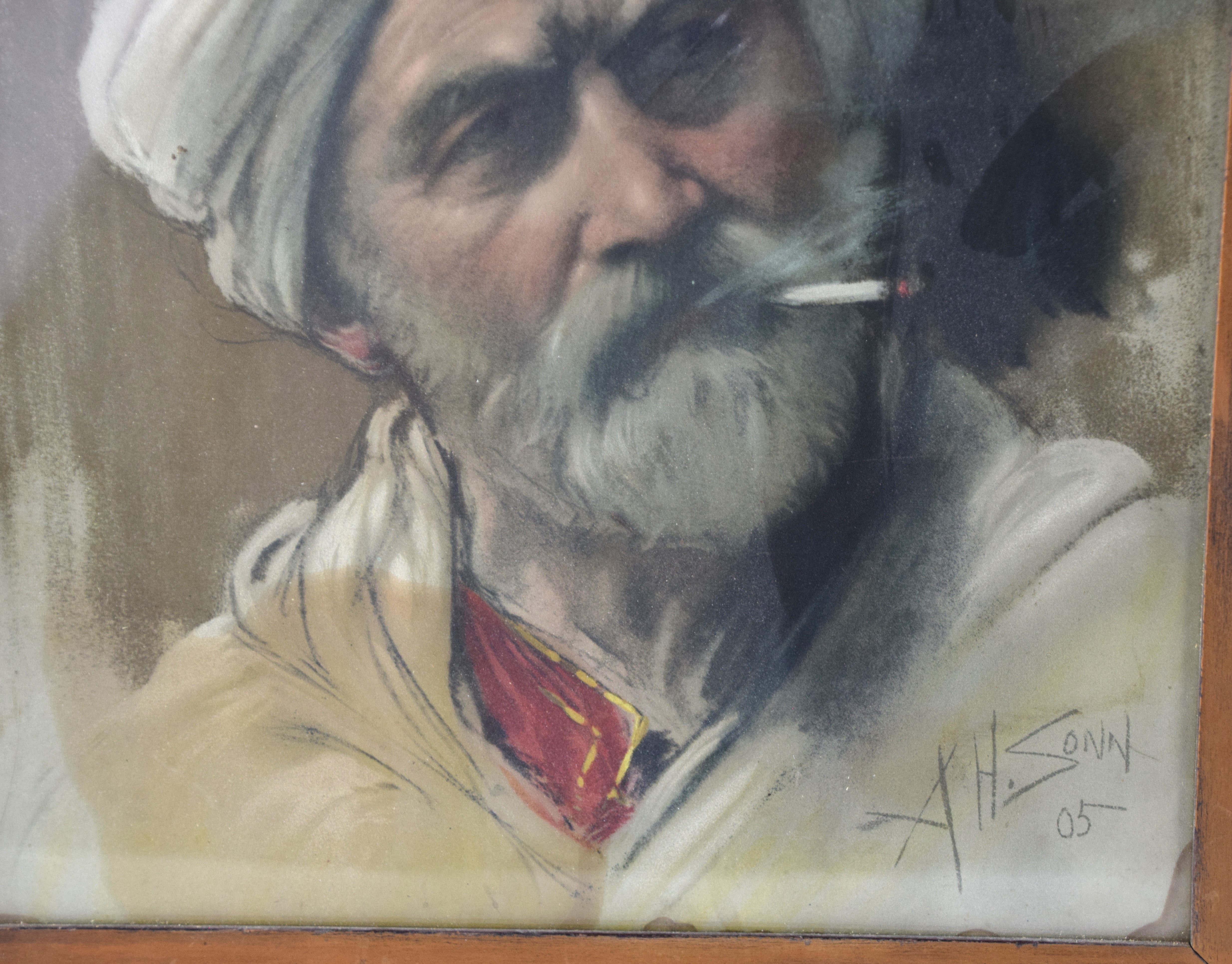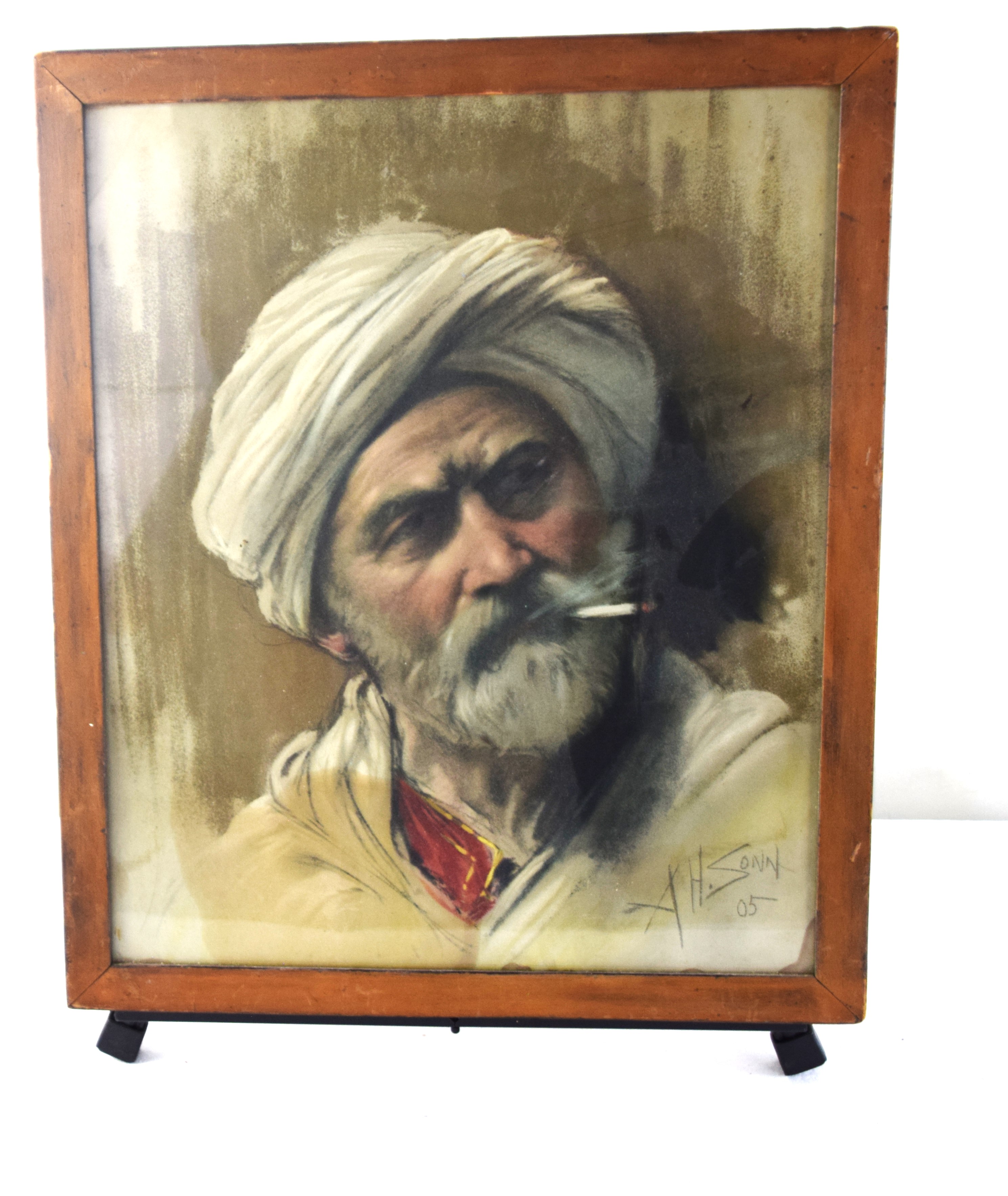 A framed Arab pastel portrait of a man smoking a cigarette, Signed A. H. Sonn, 1905. Albert H. Sonn (1869 – 1936) was active/lived in New Jersey and New York and is known for Illustration, lithography and genre painting. Dimensions: 16 3/4″ x 13″ Image size