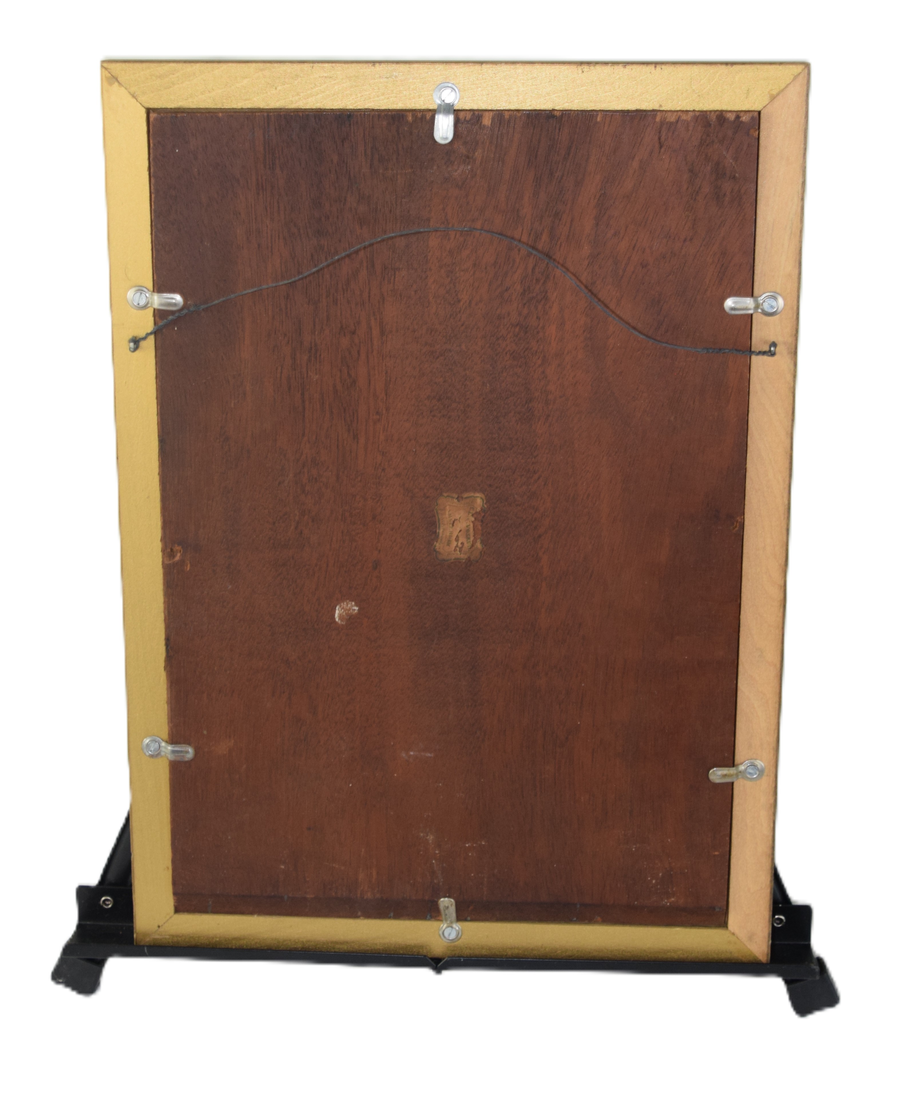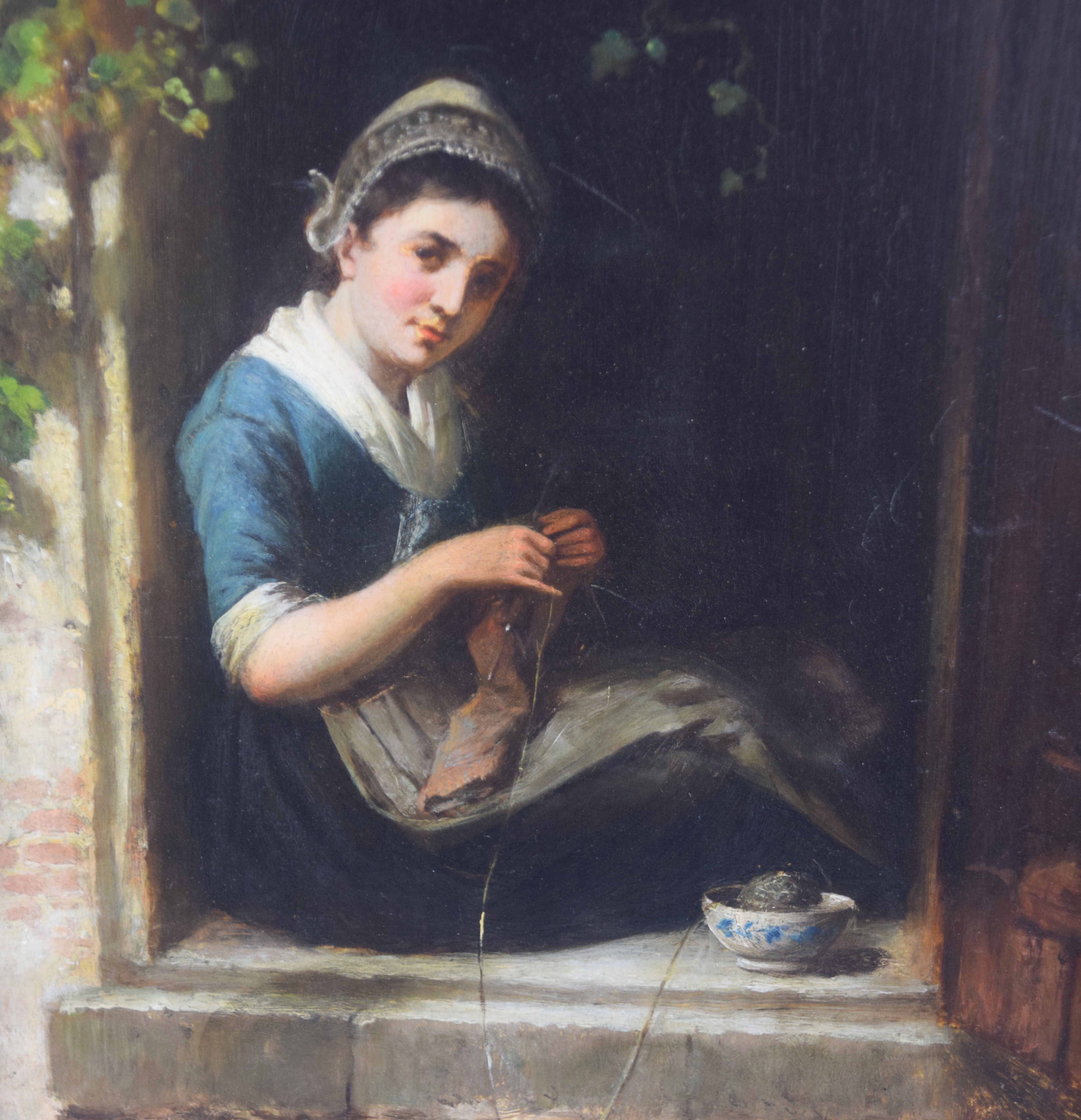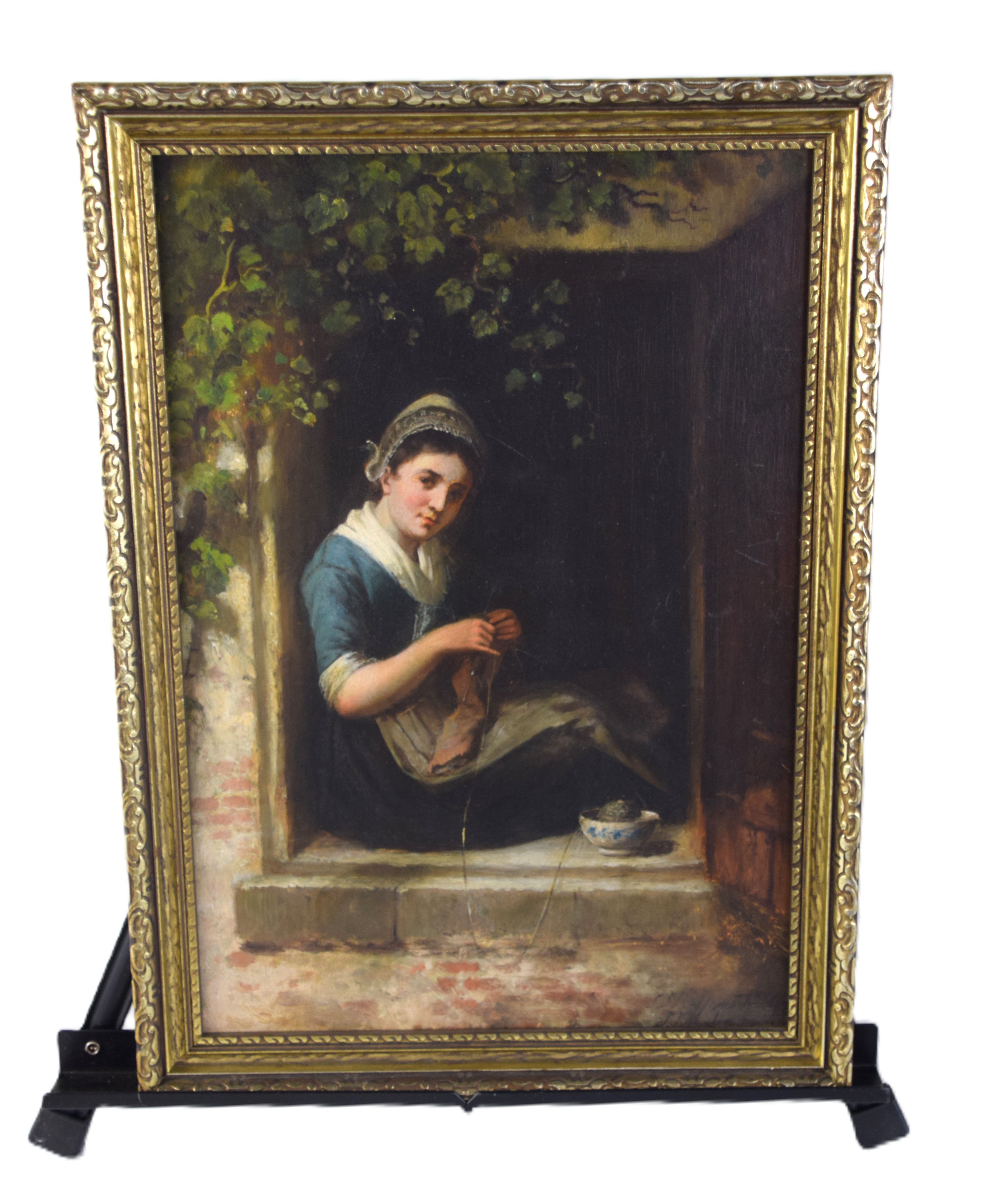 Framed 19th century oil on wood panel of a women knitting on a window ledge. Dimensions: 14″ 9″