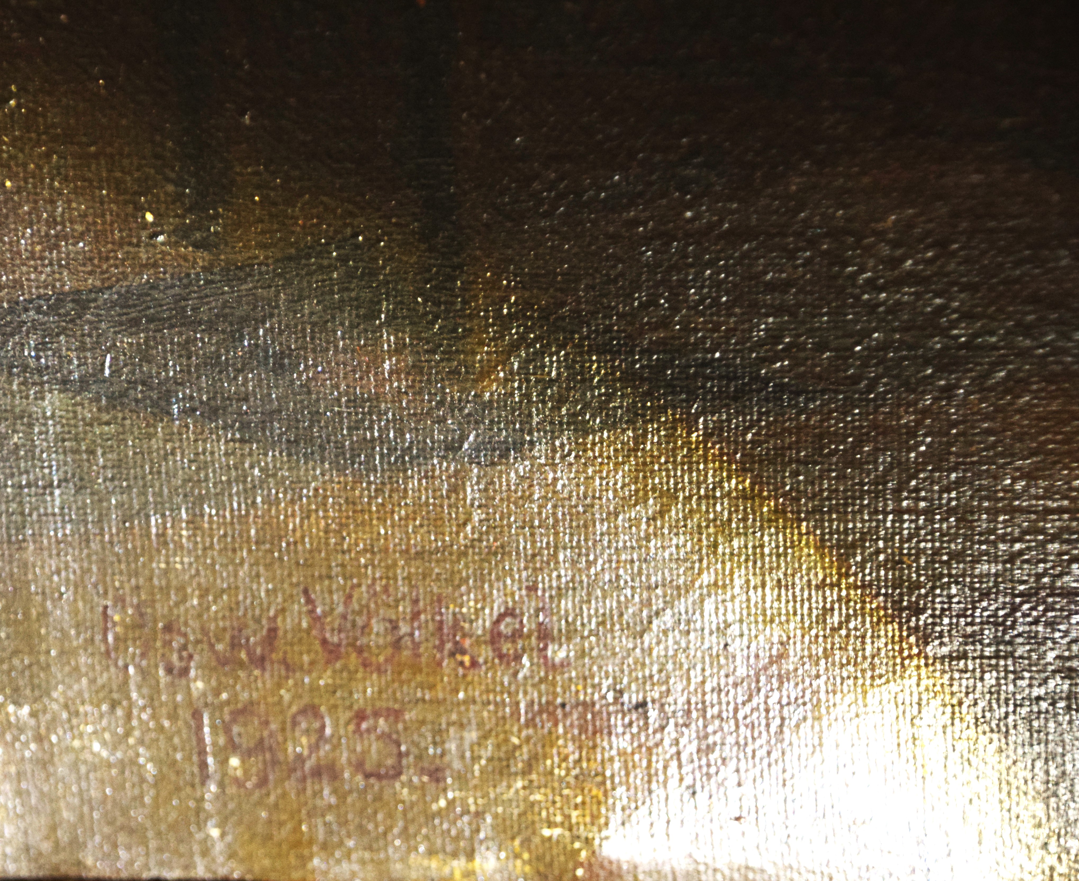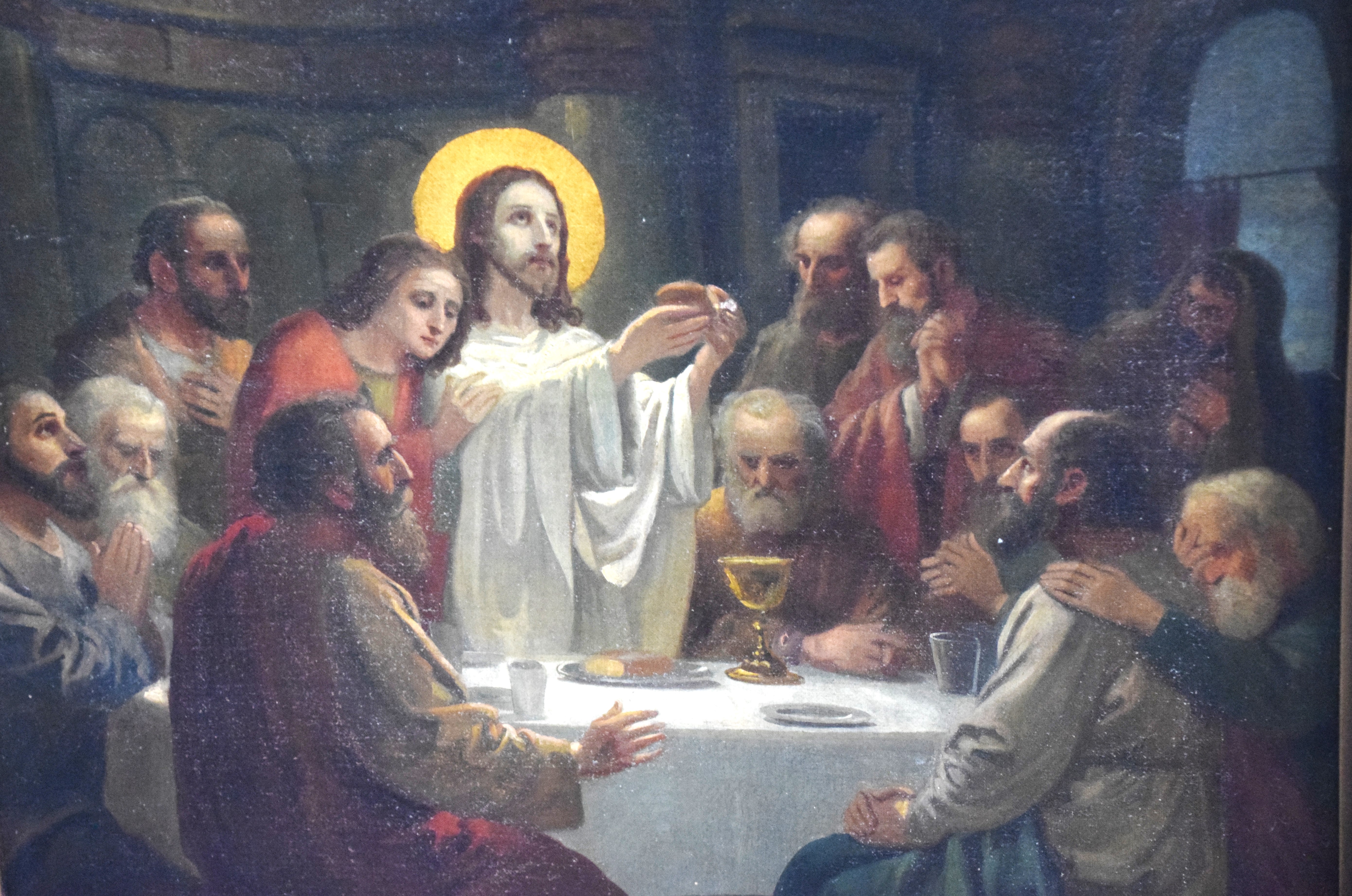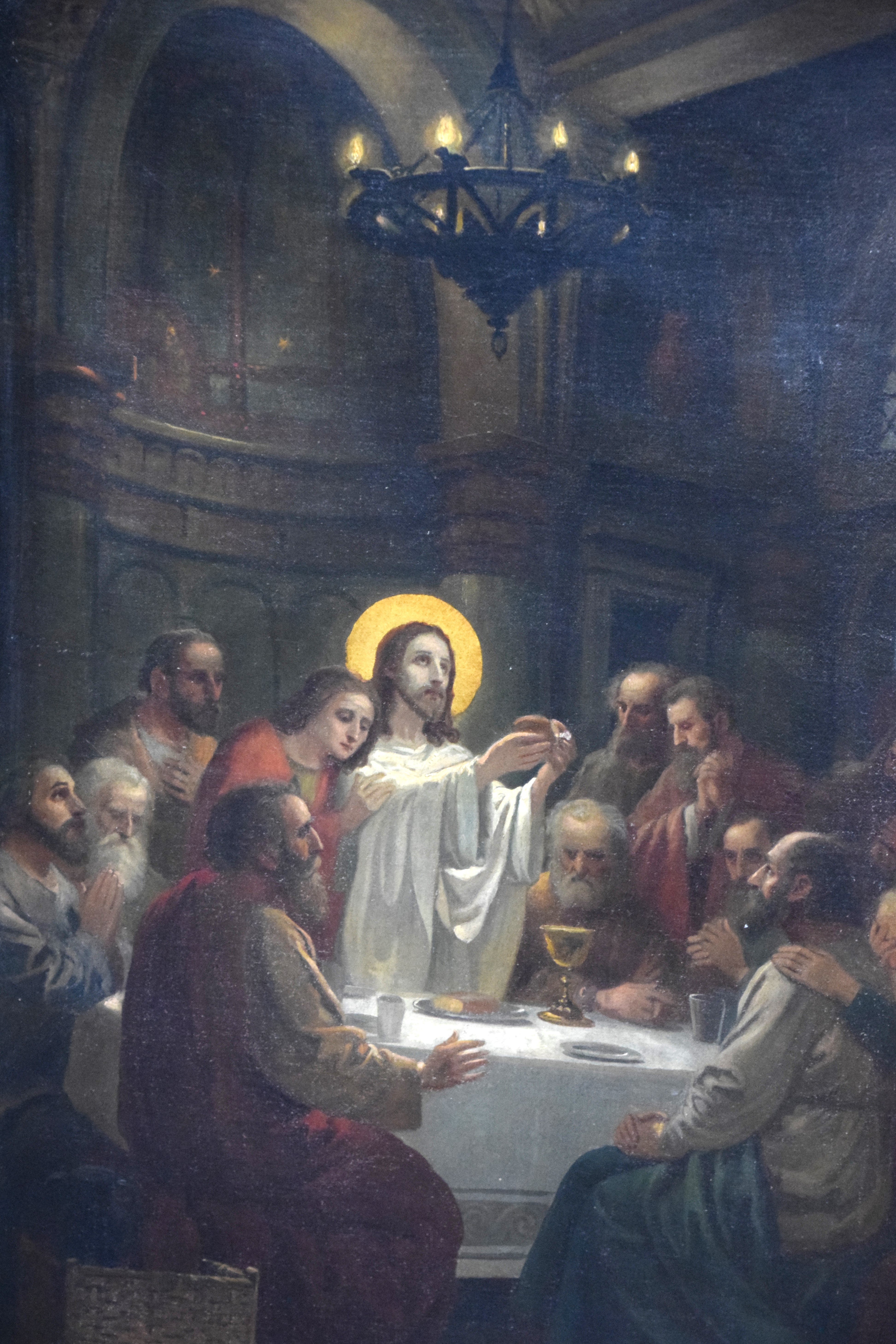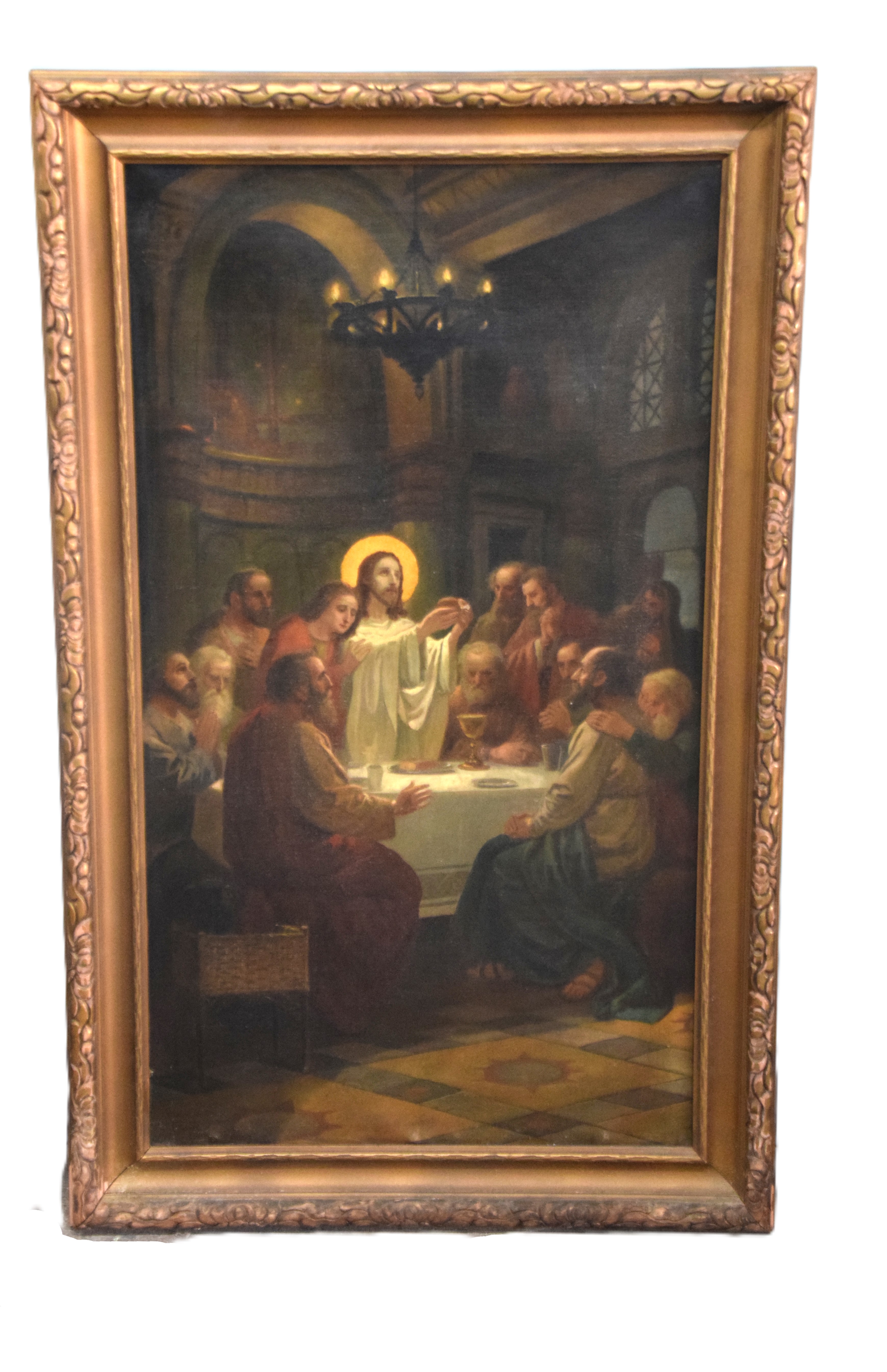 Oil on canvas painting of the Last Supper of Jesus and his disciples. Signed illegibly and dated 1925. Dimensions: 37.5″ x 20.5″