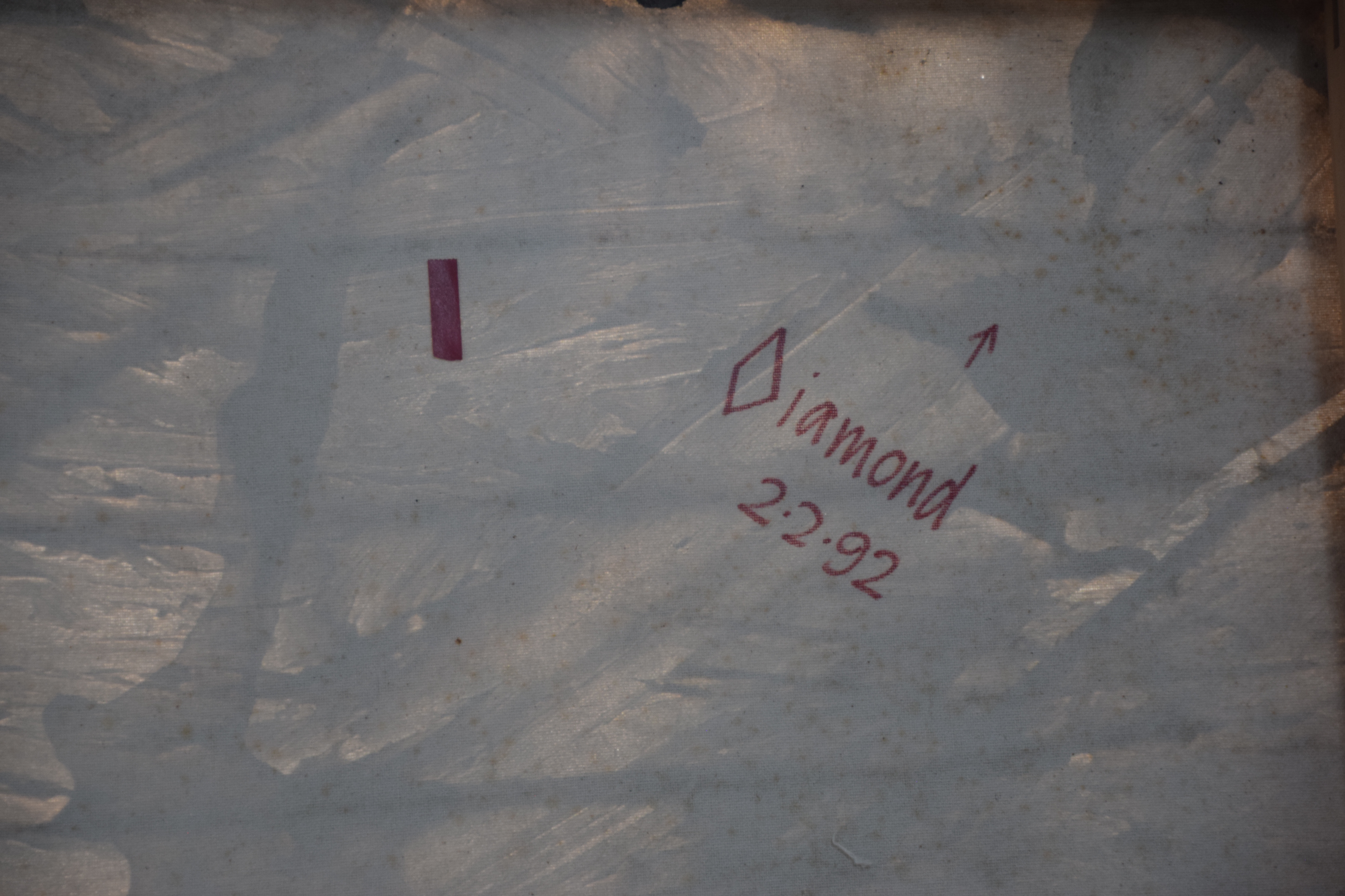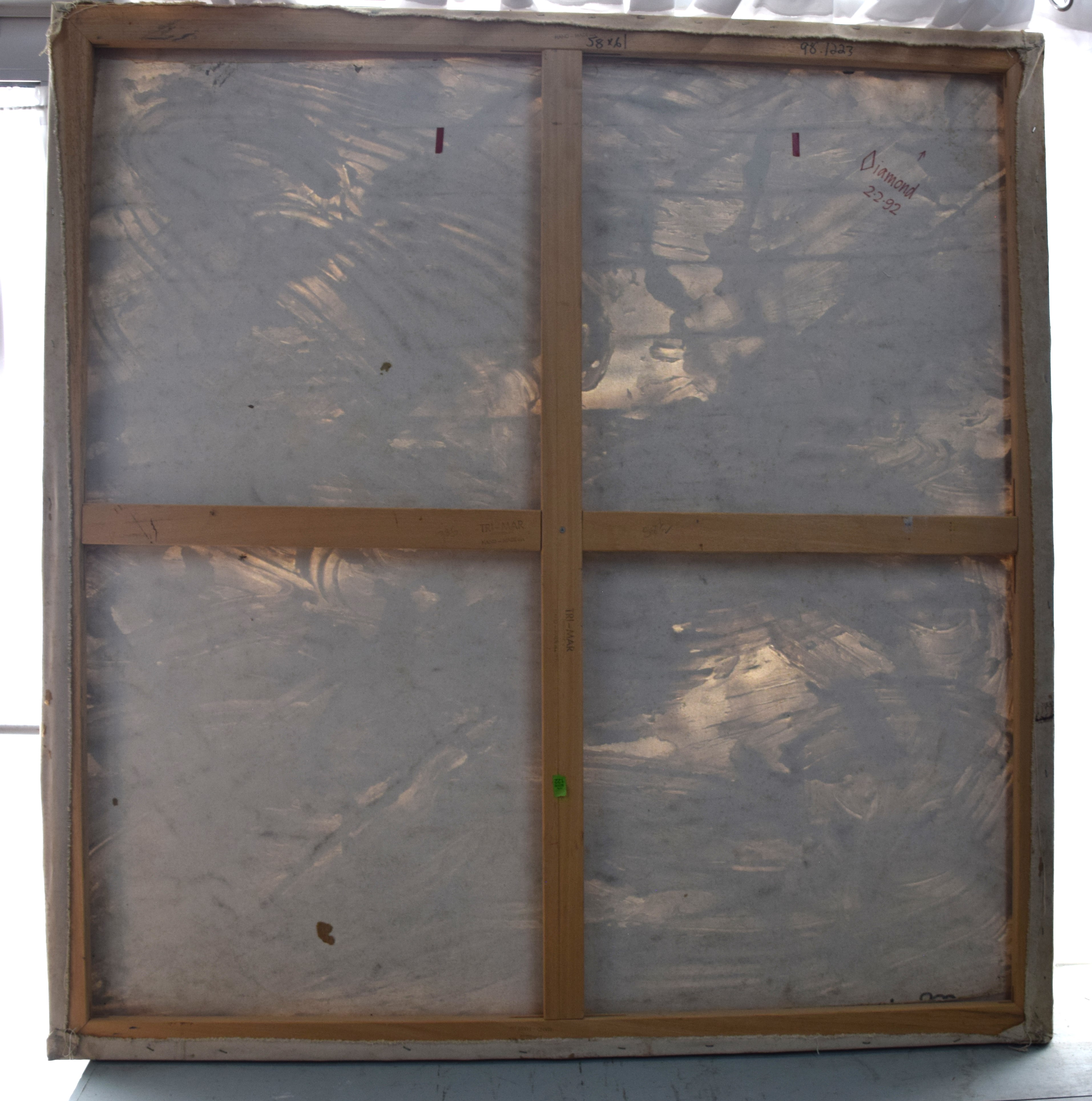 An abstract painting entitled “Diamond”. A gray/green oil painting with great texture dated Feb 2, 1992. . Elyssa Rundle (1932 – 1994) worked in New York and Pennsylvania and is known for Gestural abstract painting (Vincent van Gogh was also known for Gestural techniques). She opened a studio on West 23rd Street in New York City and became a member of the New York School of Gestural Abstract Expressionism. Rundle took bolder risks in her approach to color, composition and proportion, encouraged by the interaction with fellow artists and feed-back by noted art critics of her time including supporters Clem Greenburg and John Russell. Three years after her death, in 1997, her collection of work won a grant from the Judith Rothschild Foundation, established for the purpose of bringing recognition to highly talented, deceased artists. The Rothschild Grant helped create an inventory of the collection, and an exhibit and catalogue called: The Spirit of the Paint, by the Berman Museum. This artwork is from that collection. Dimensions: 60″ x 59″
