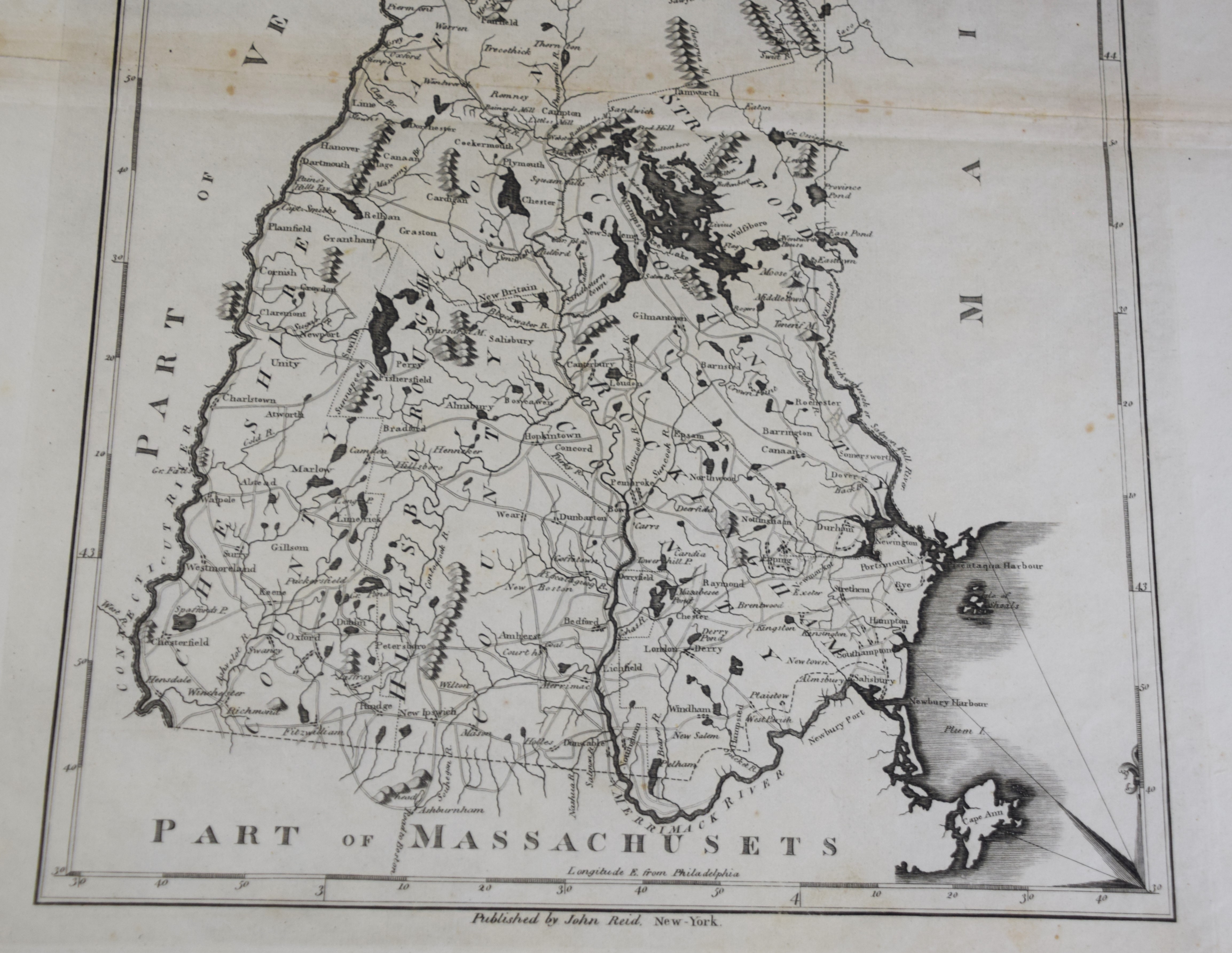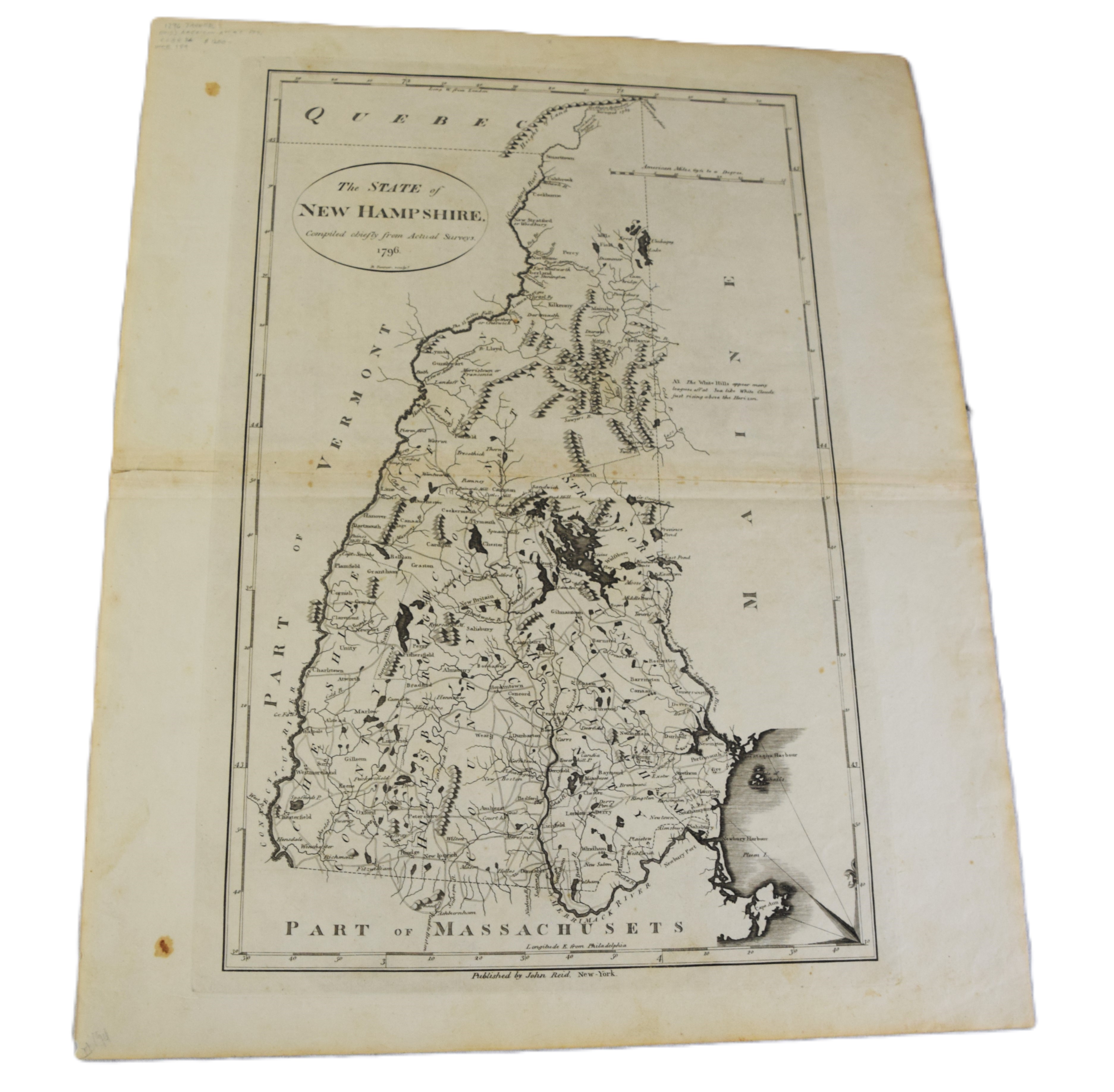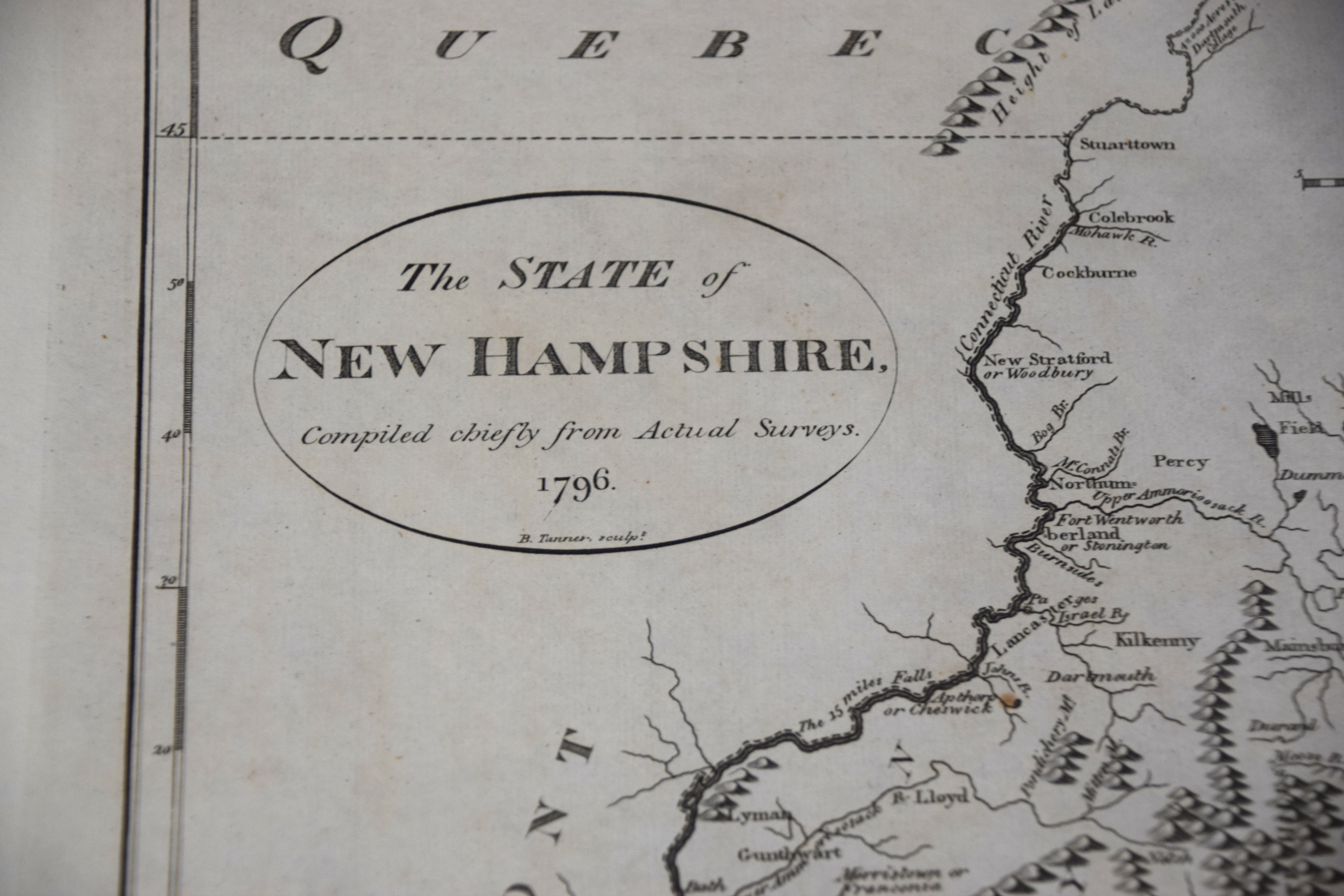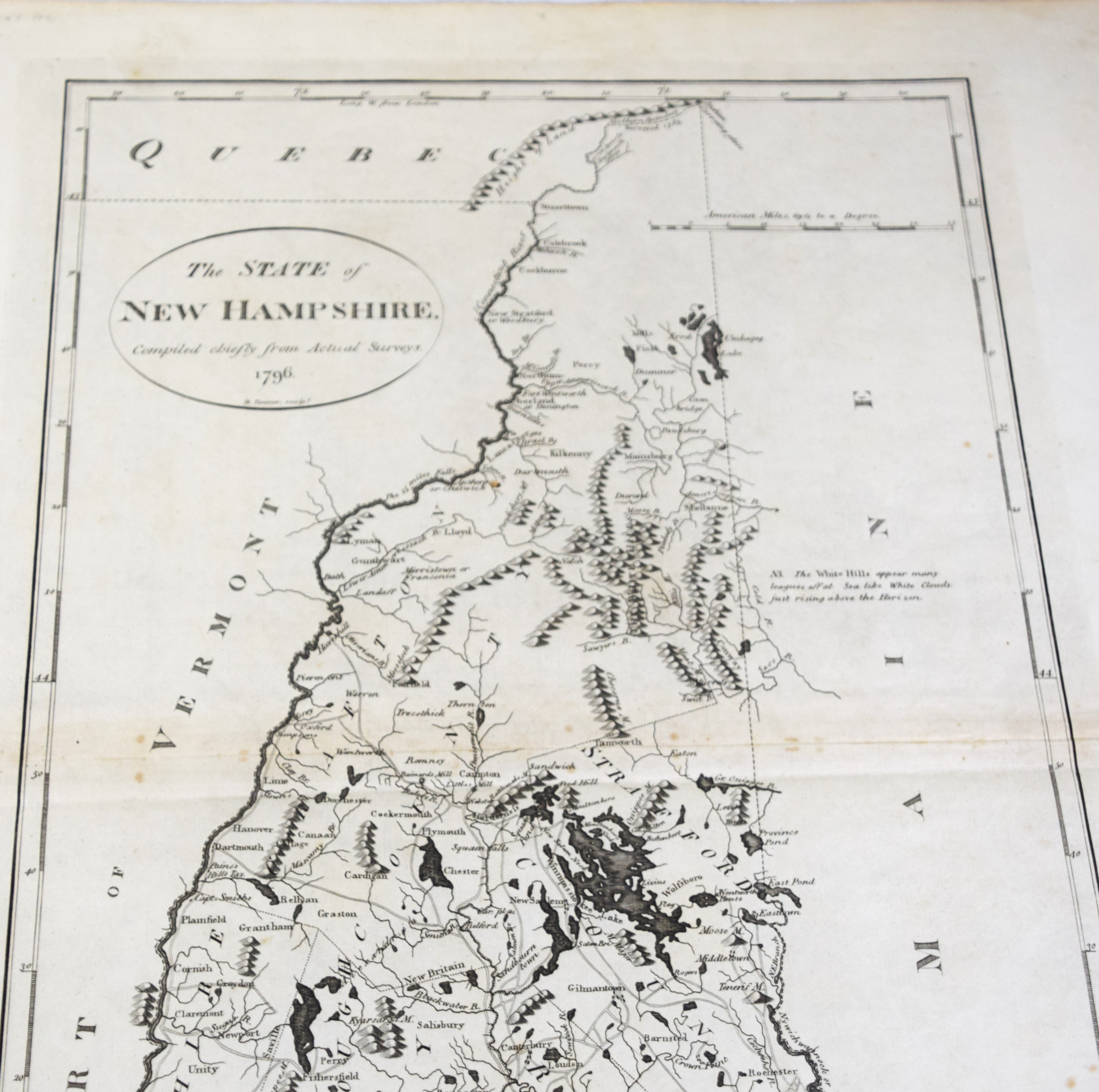The State of New Hampshire map, dated 1796 by Tanner. It was reproduced from Samuel Lewis map (see lot 90) and published in John Reid’s “American Atlas 1796”. Dimensions: 17″ x 11″