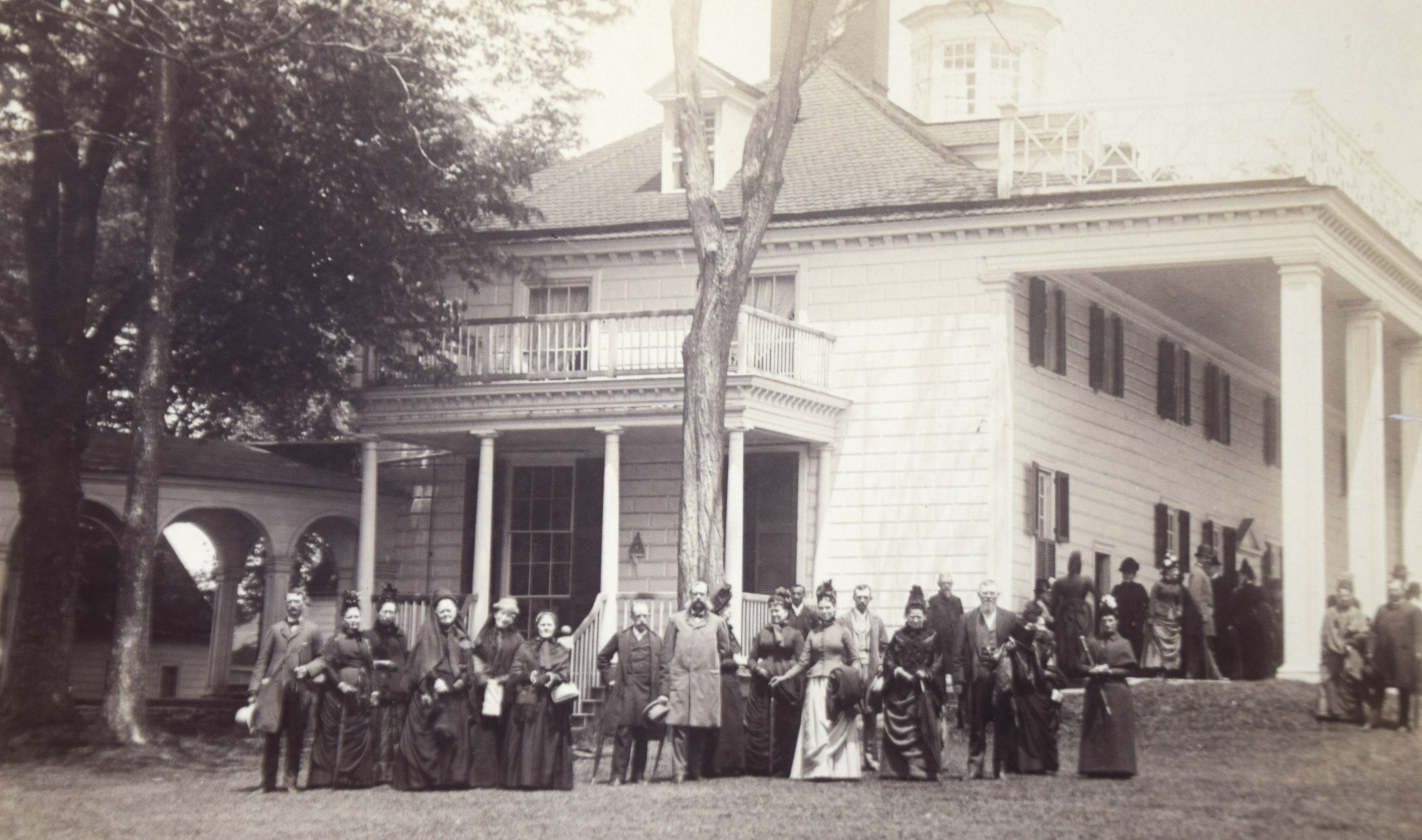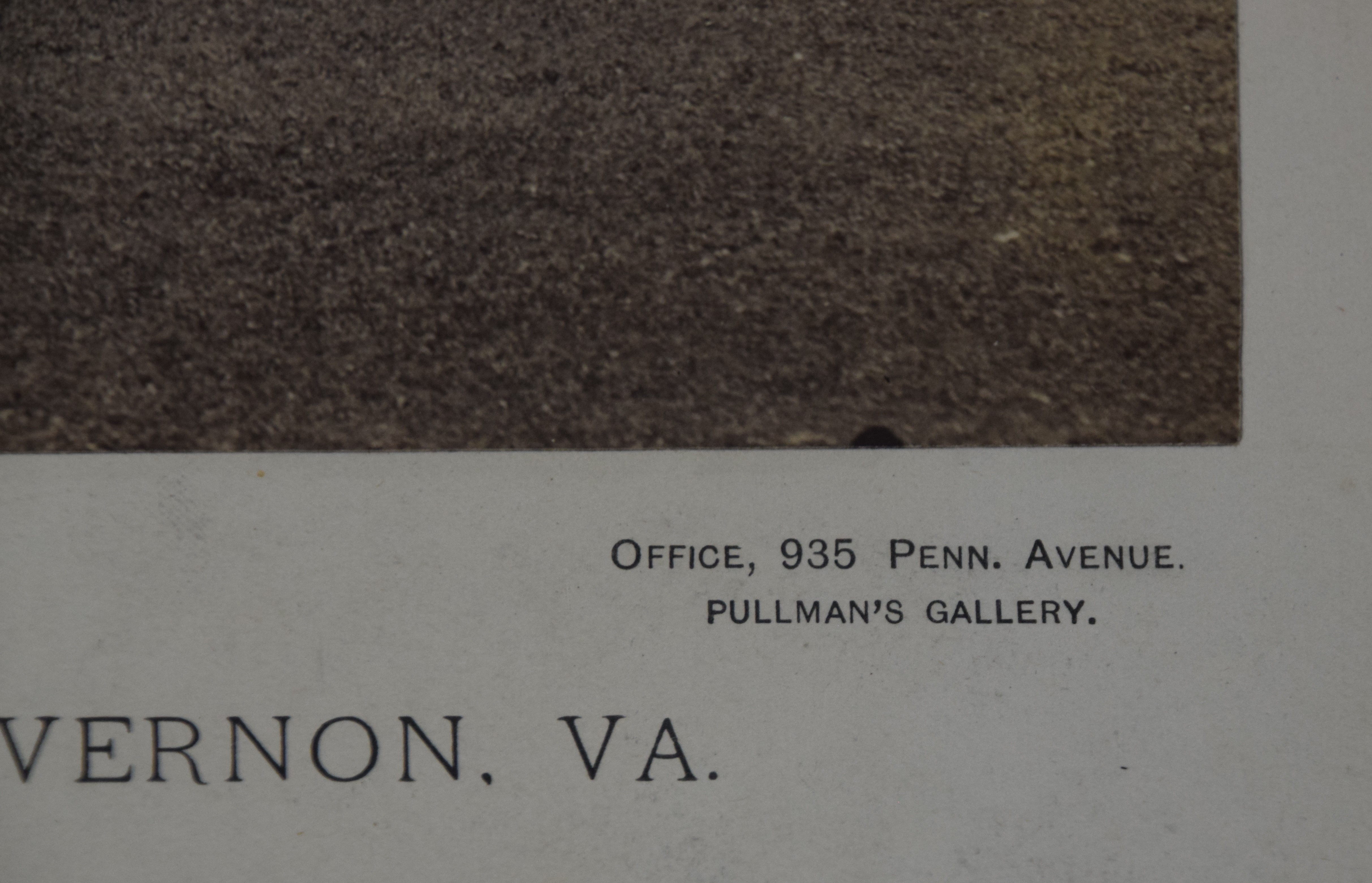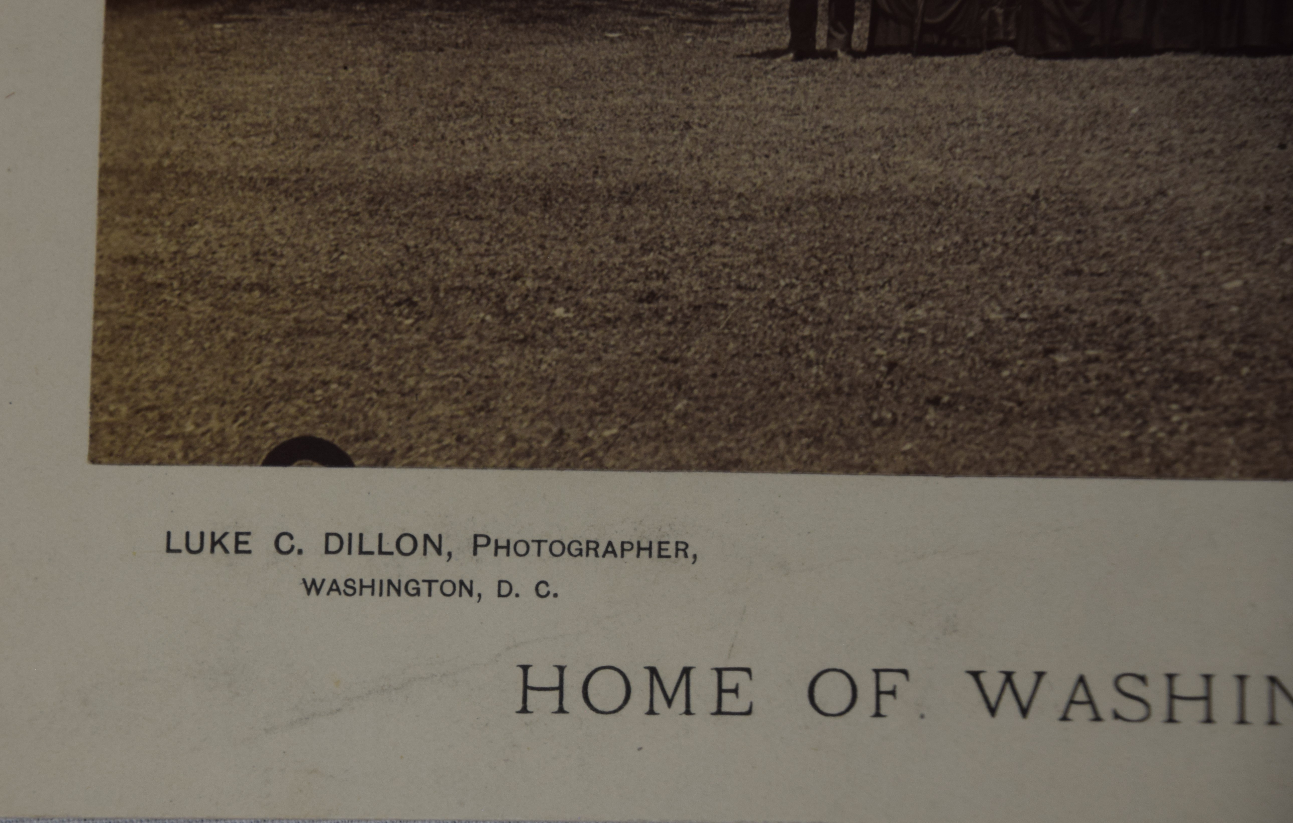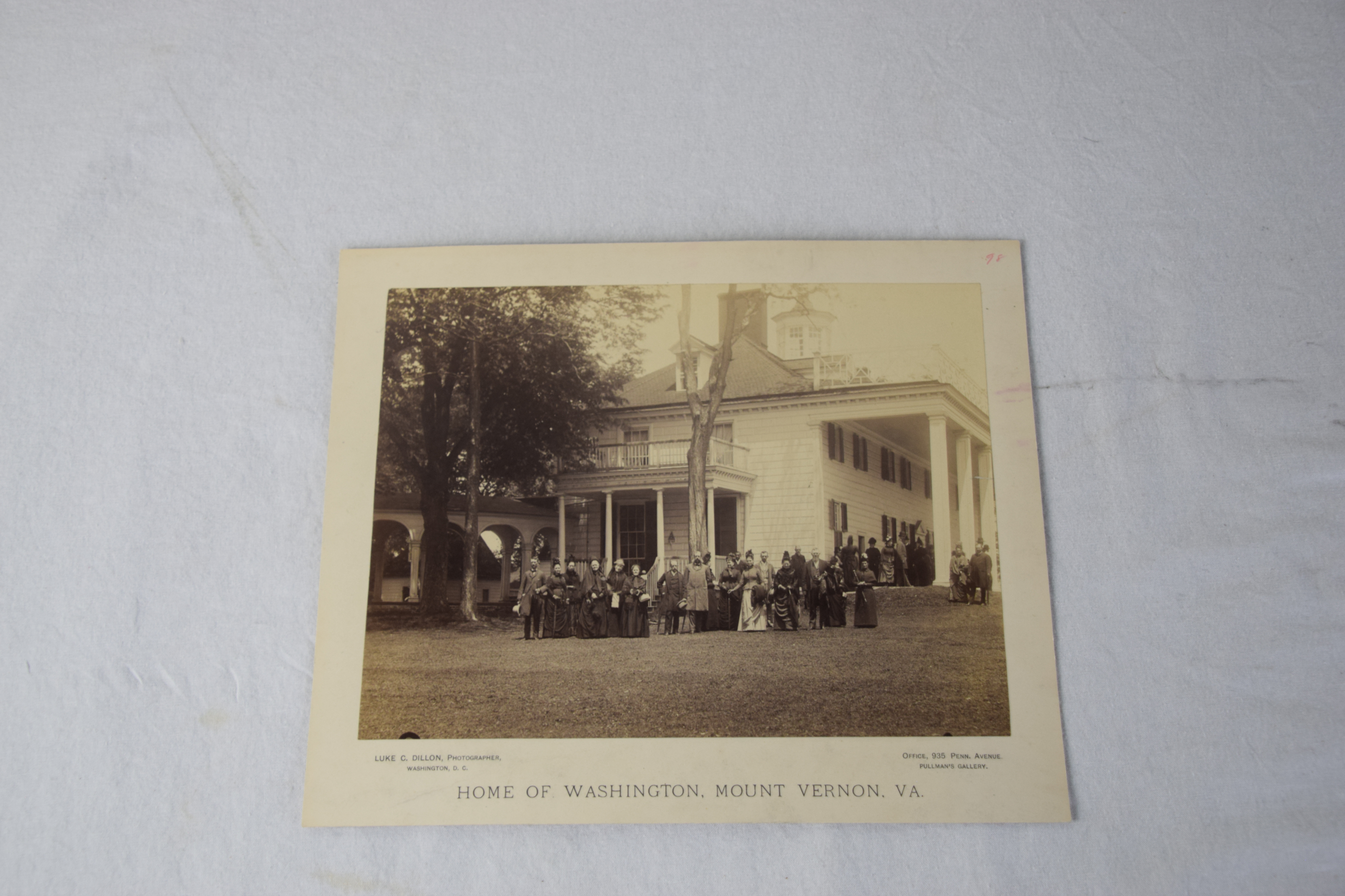 Cabinet photograph of Mount Vernon, Southeast view by Luke C. Dillon on card stock. The Mount Vernon Ladies Association selected Luke Dillon as the next “official” photographer in 1883 until 1894. His approach to taking photographs would be different from either Gardner or Johnson in that “a novel feature has been added to the attractions – visitors are photographed with the house itself.” Dimensions: 7″ x 9 3/8″