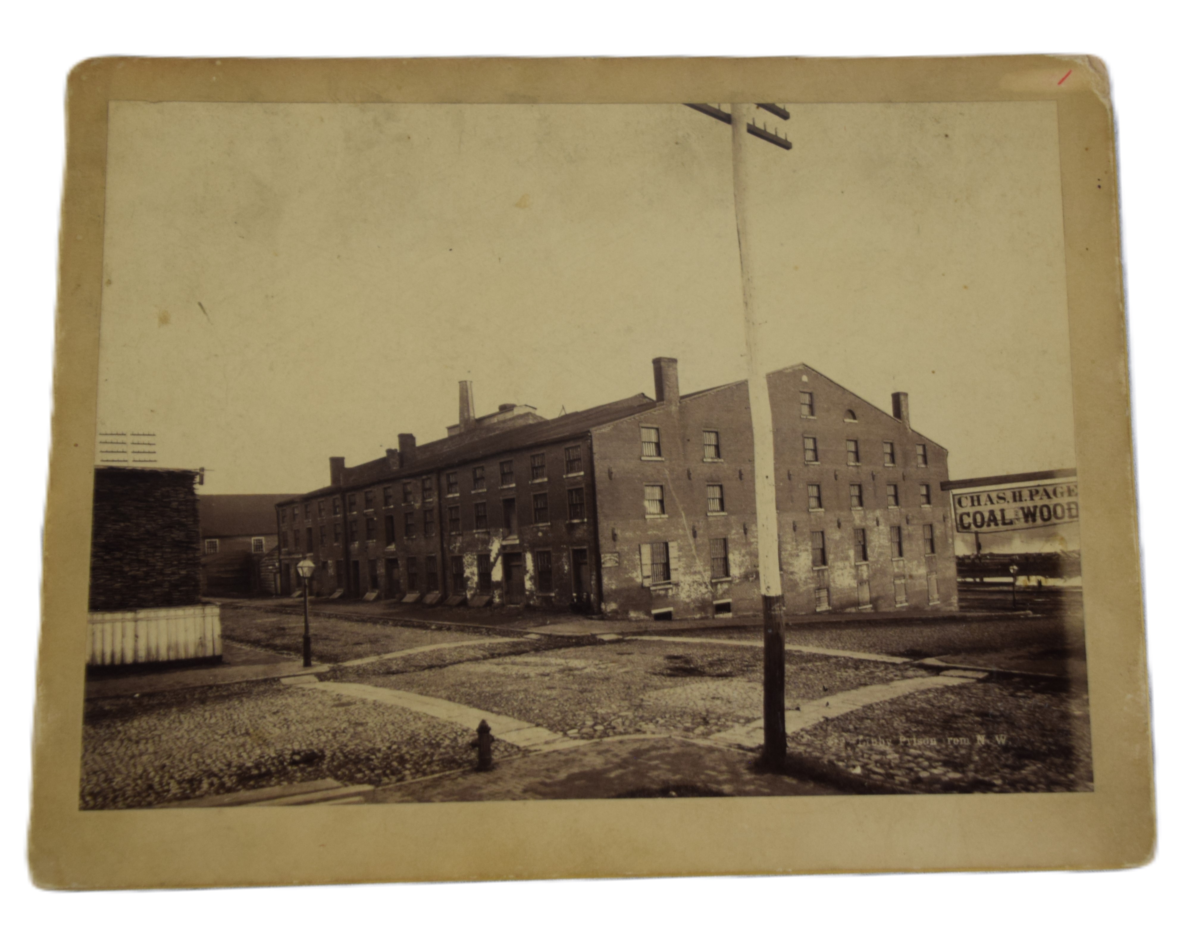 Photograph of Libby Prison, Richmond, Va., exterior view from Northwest by the Loeber Brothers circa 1880 using the Loeber Brothers folding camera. Libby Prison was used almost exclusively for officers, though it was also the receiving depot for prisoners through Richmond. Thus, enlisted men would come to Libby Prison, be registered as POWs, and then be transferred elsewhere. Dimensions: 6′ x 8 1/8″