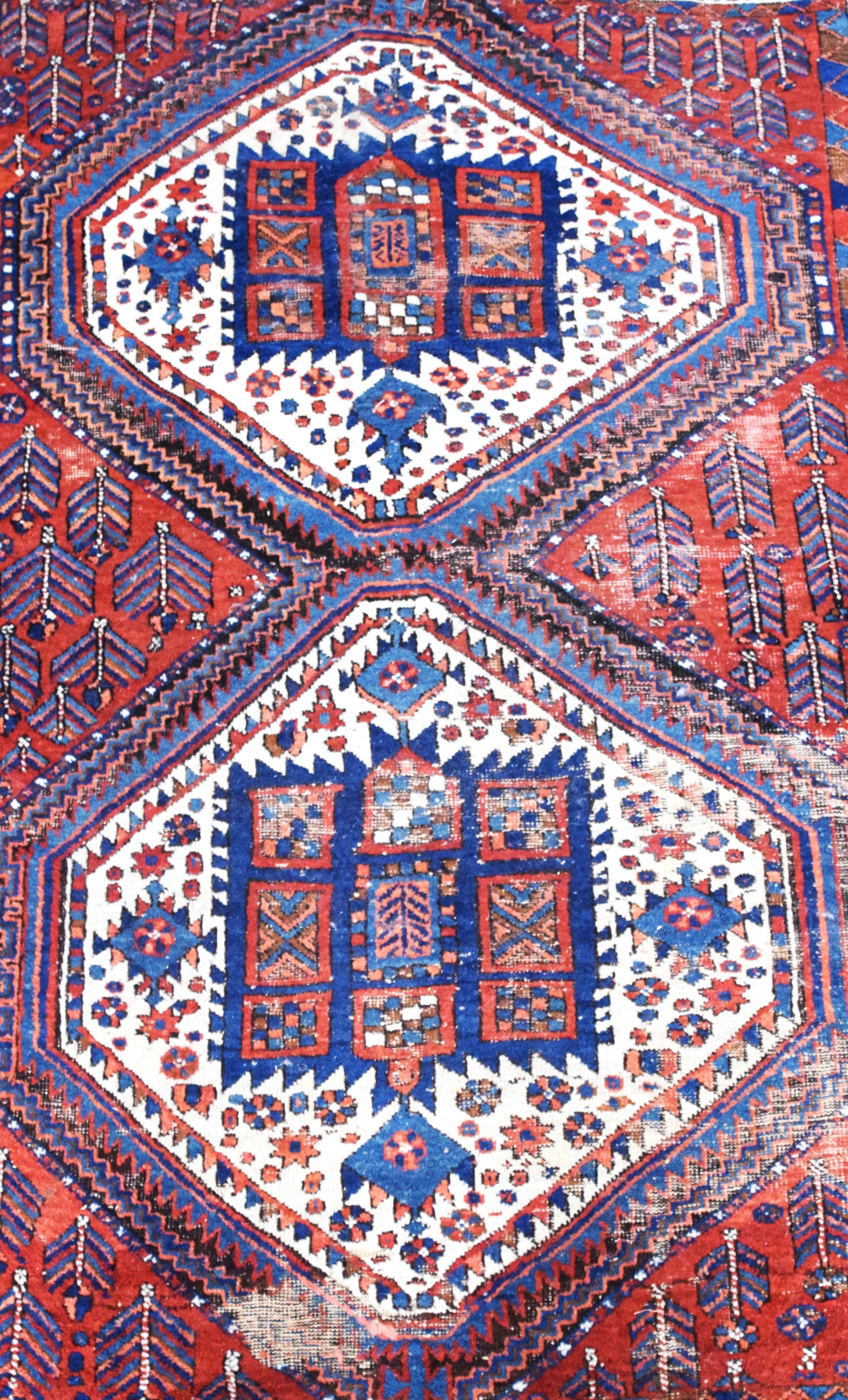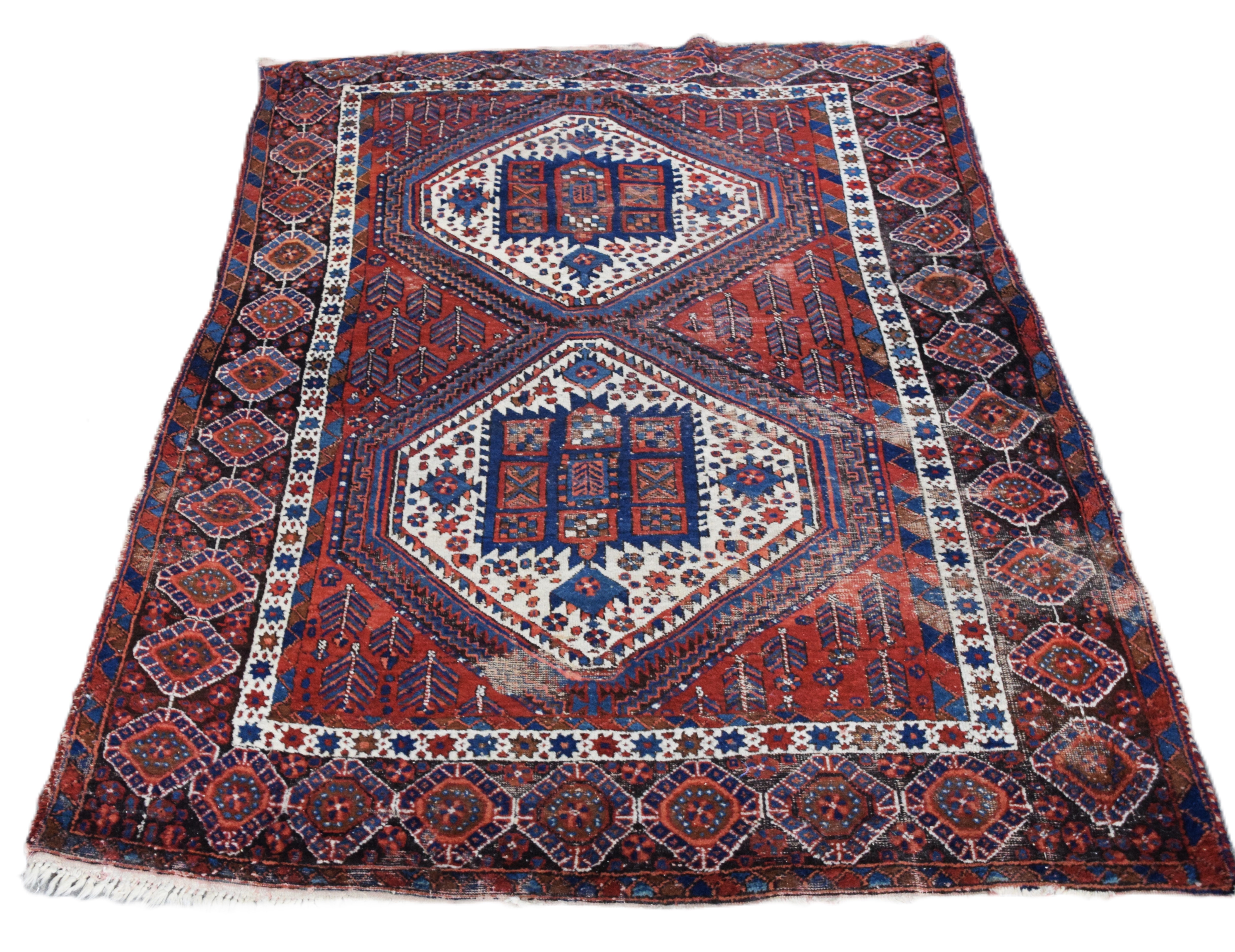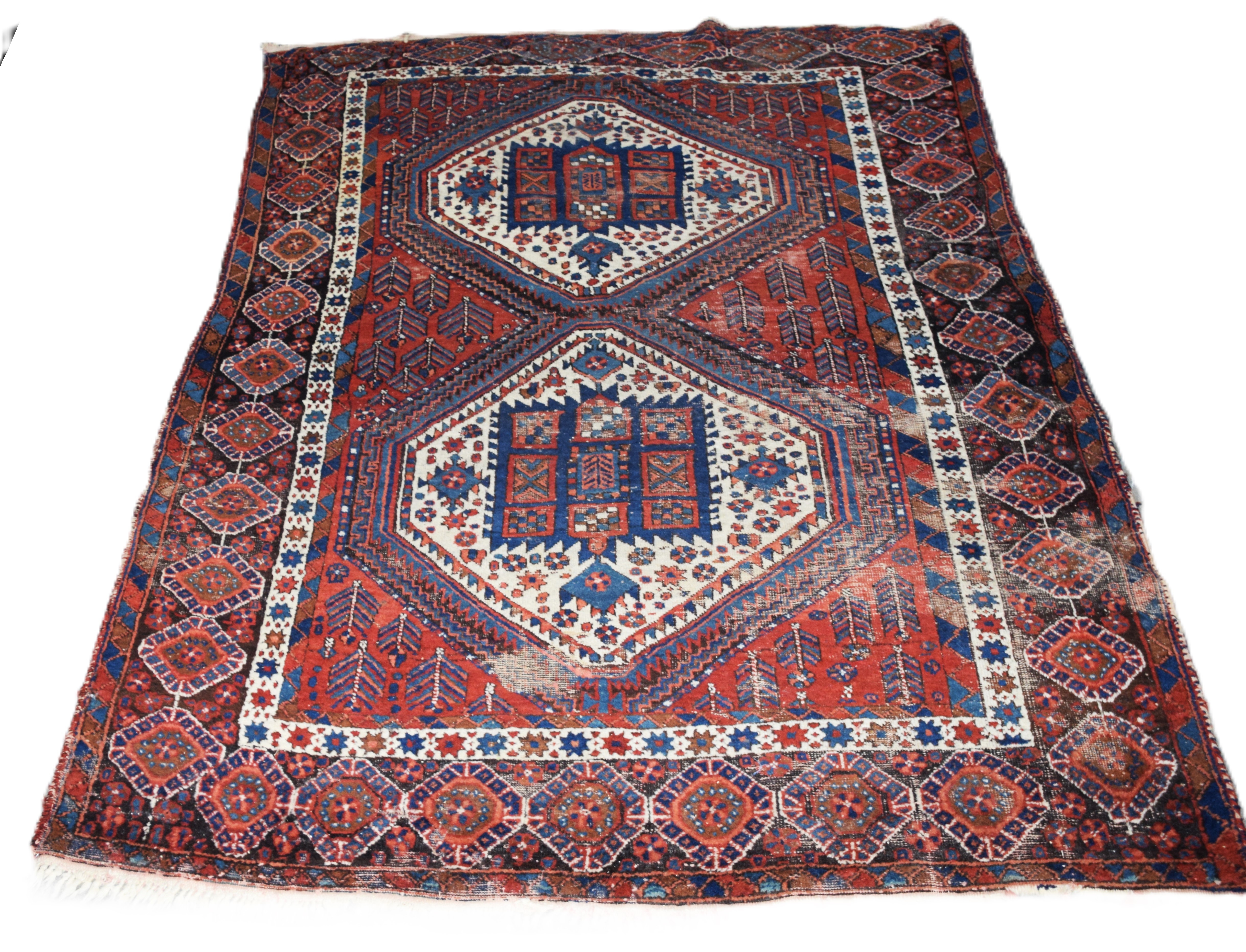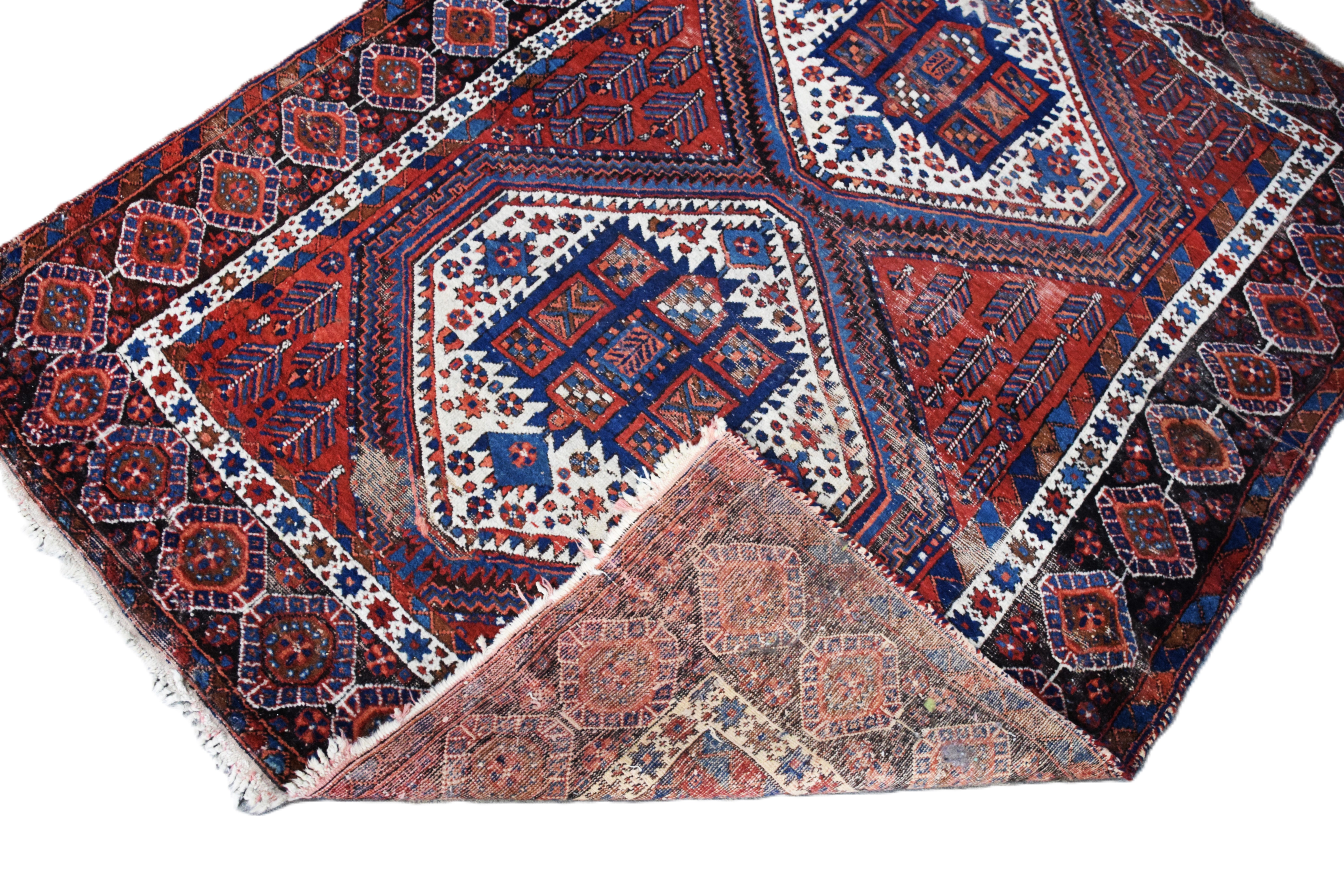 Oriental Tribal scatter rug. Older example with multi-color designs. Dimensions: 4’10” x 6’1″