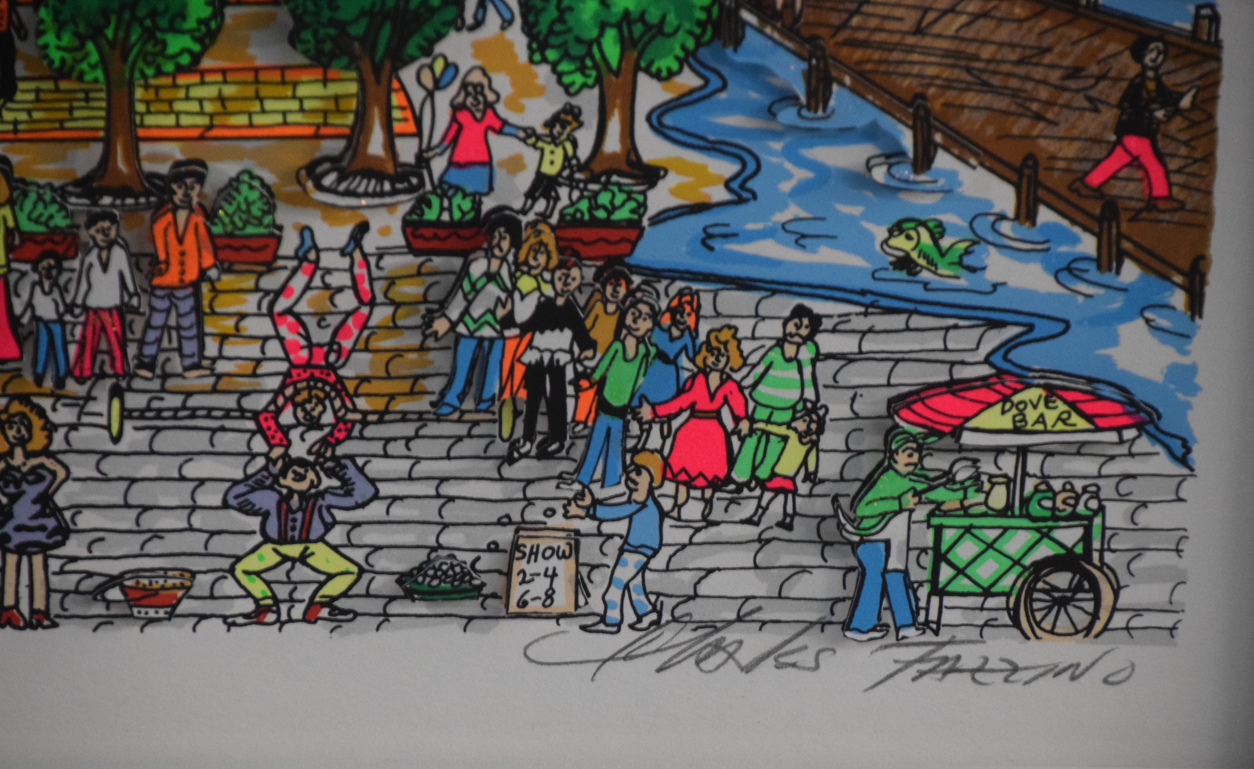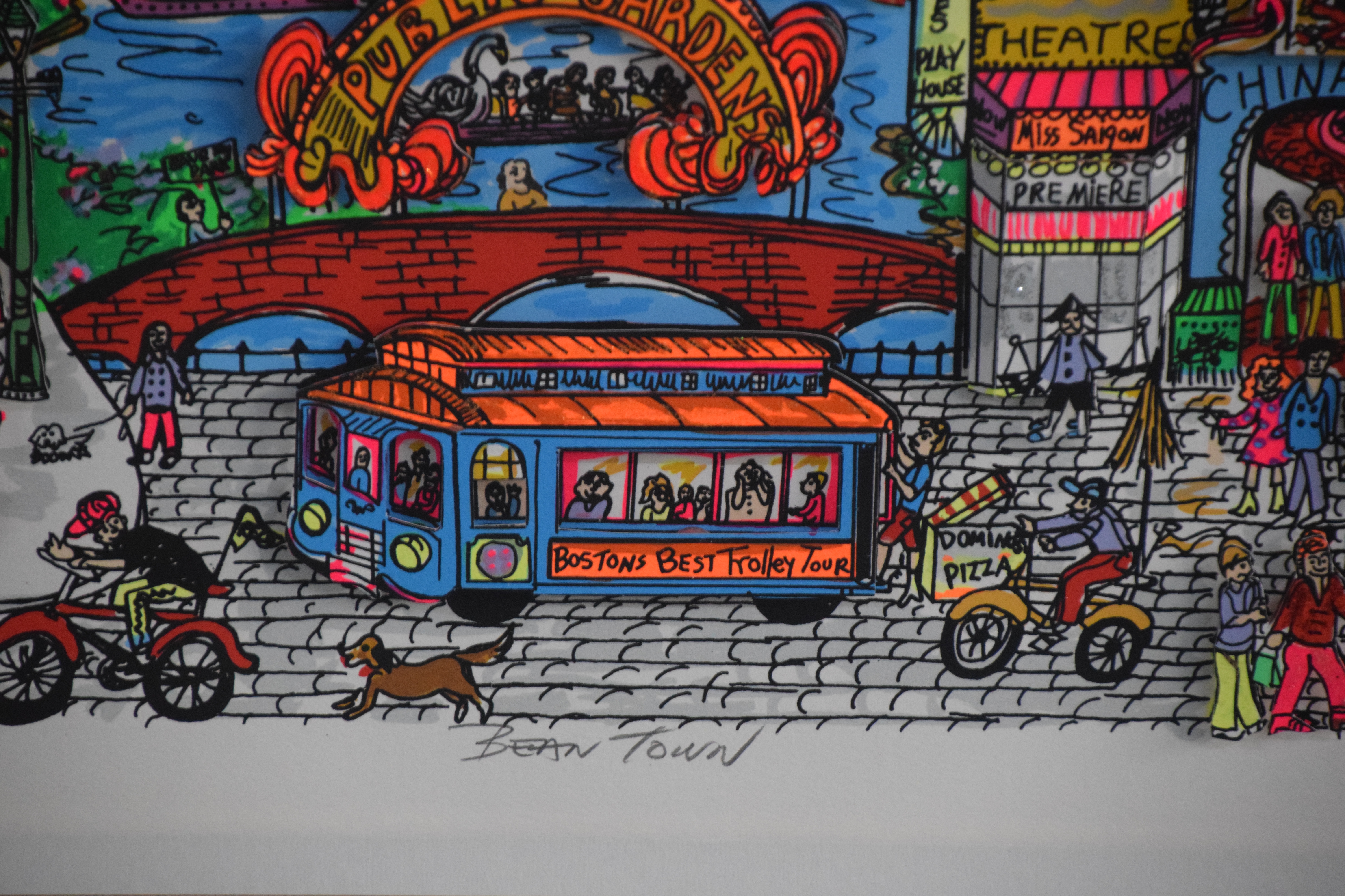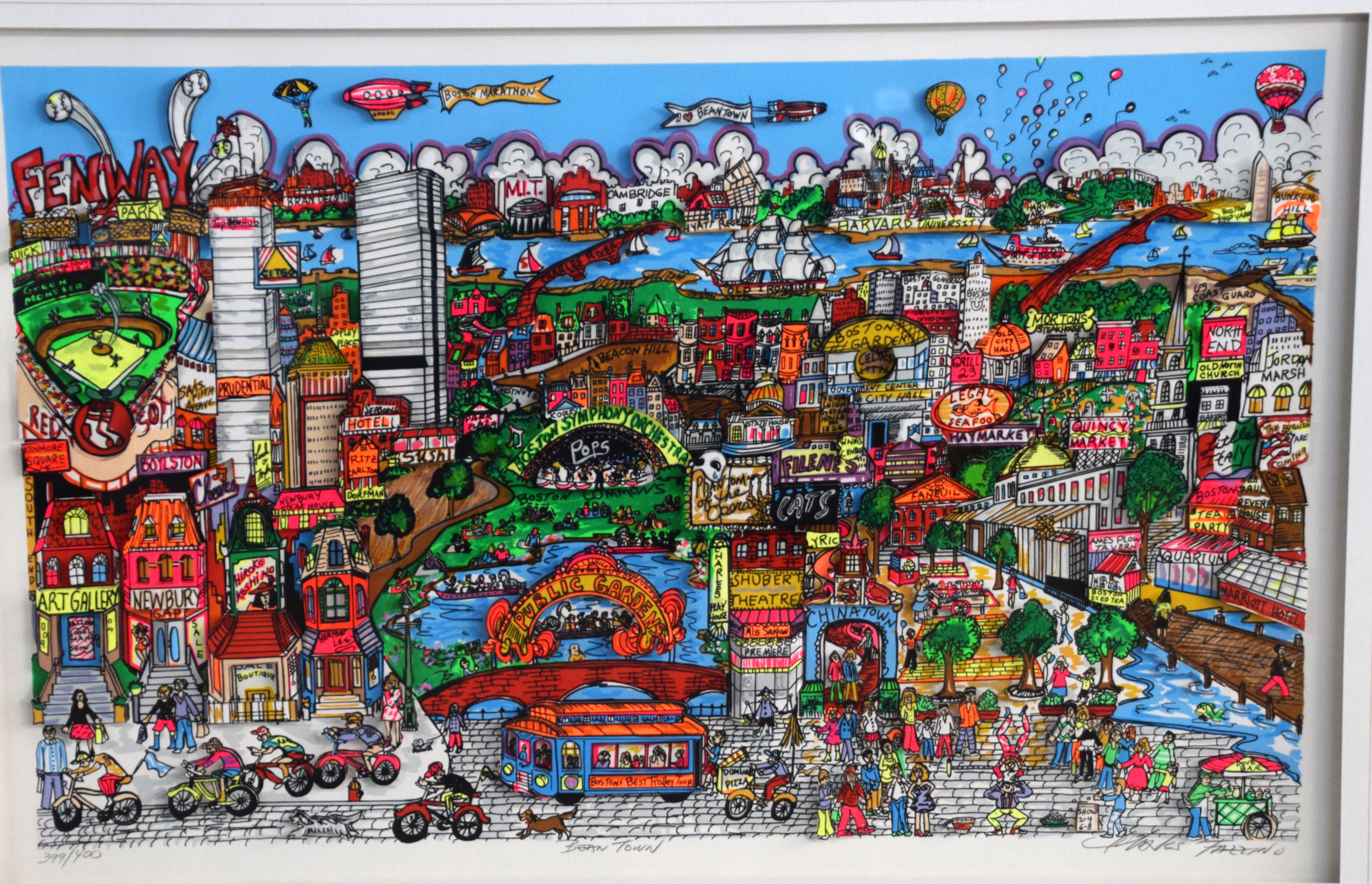 Colorful, framed and signed, 3-D Serigraph titled “Bean Town” by Charles Fazzino on museum board. Edition number 399 of 400 with Certificate of Authenticity, dated 1991. Charles Fazzino (Born 1955) works in New York and is known for 3-D graphics, kinetic sculpture, serigraphs. Fazzino has also immortalized locales such as New York, Baltimore and Philadelphia. Dimensions: 17″ x 27″ Image size
