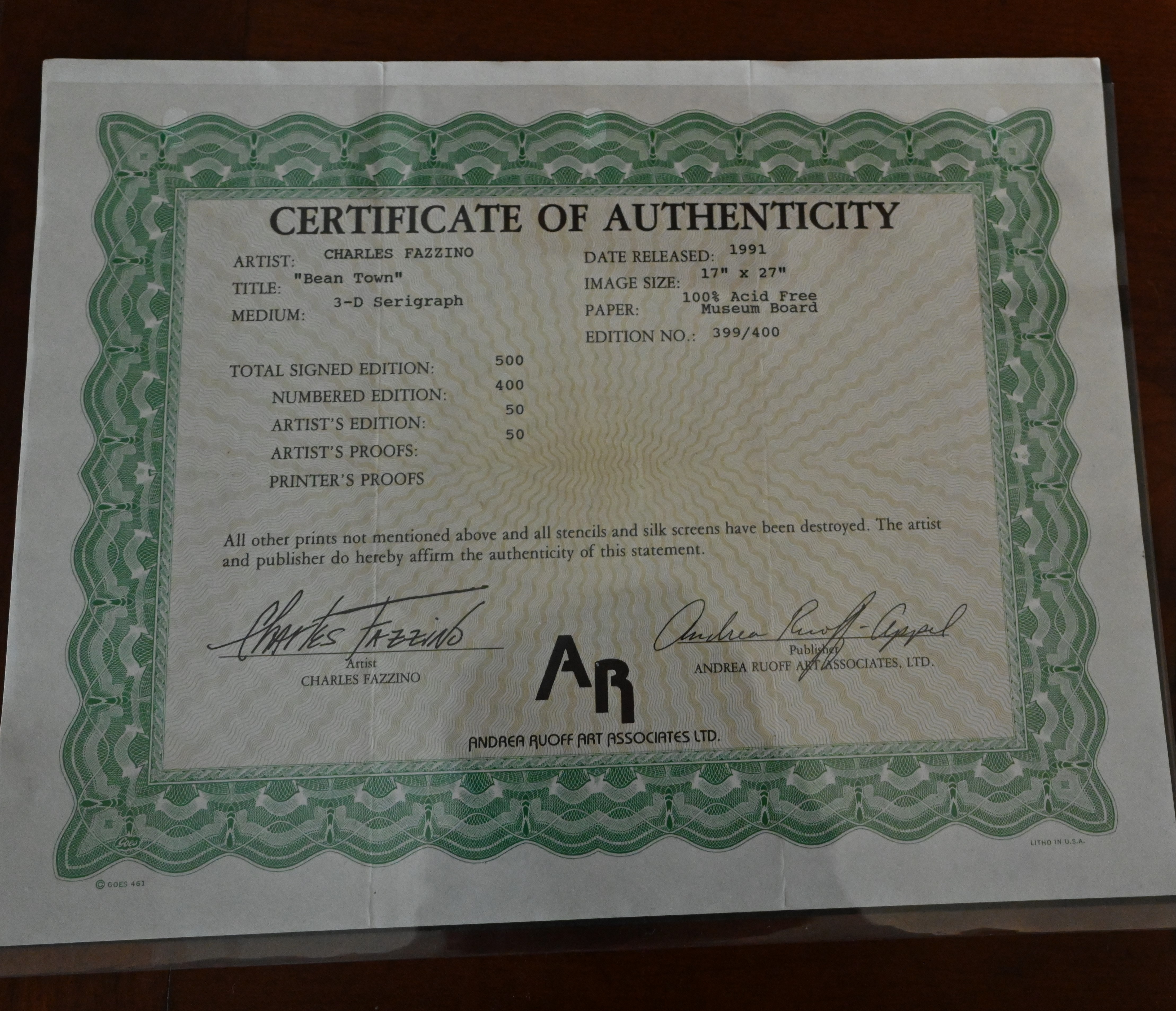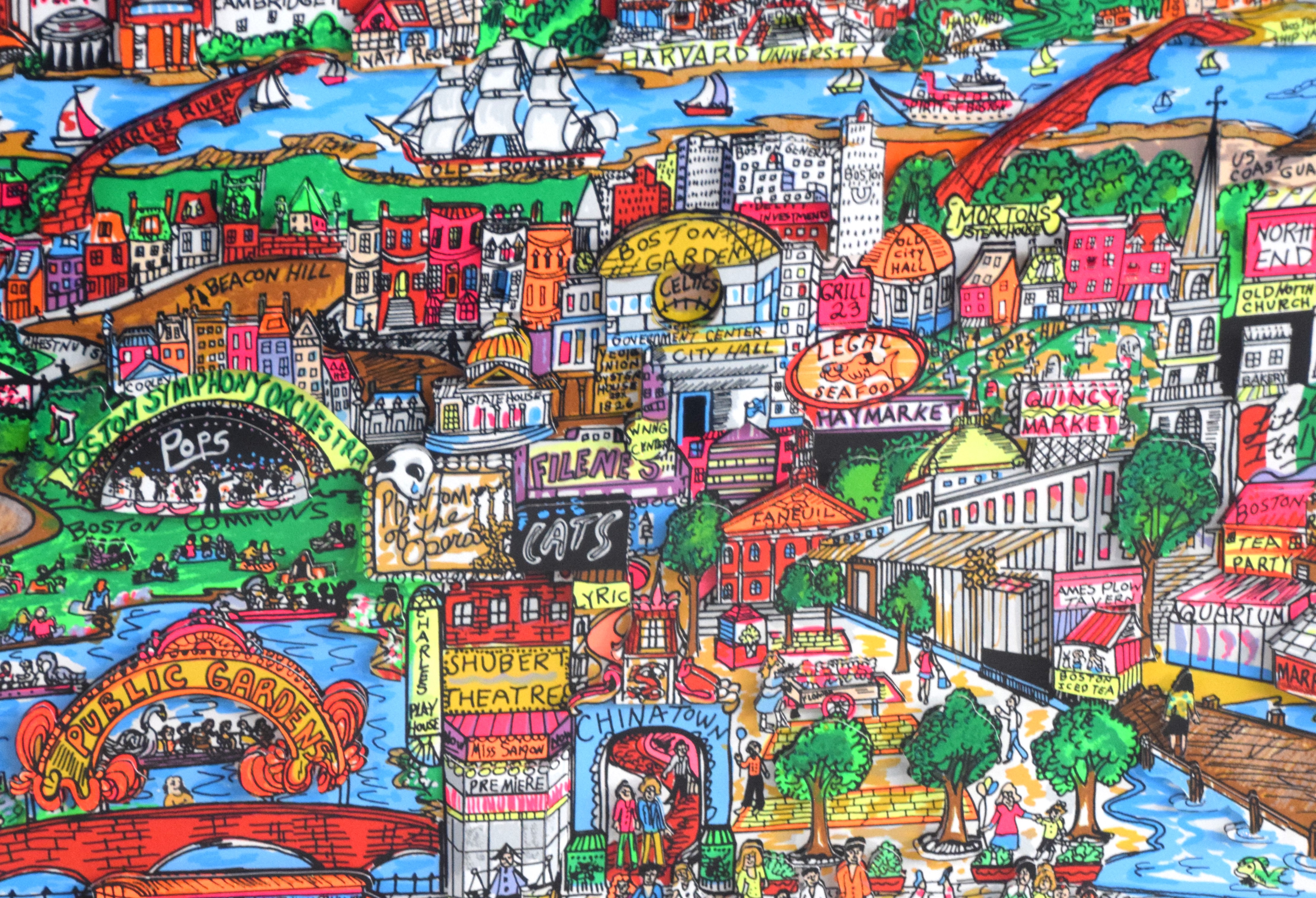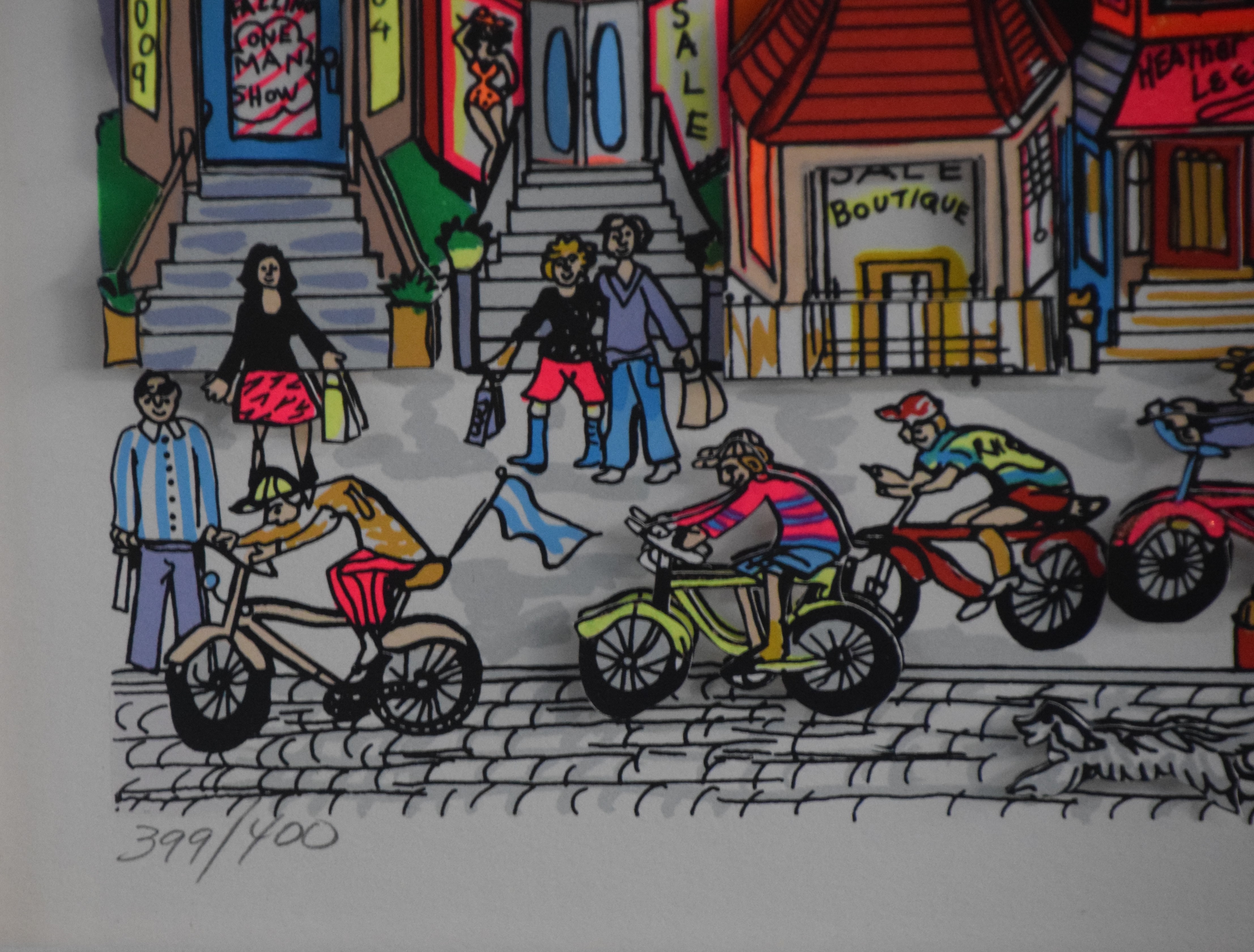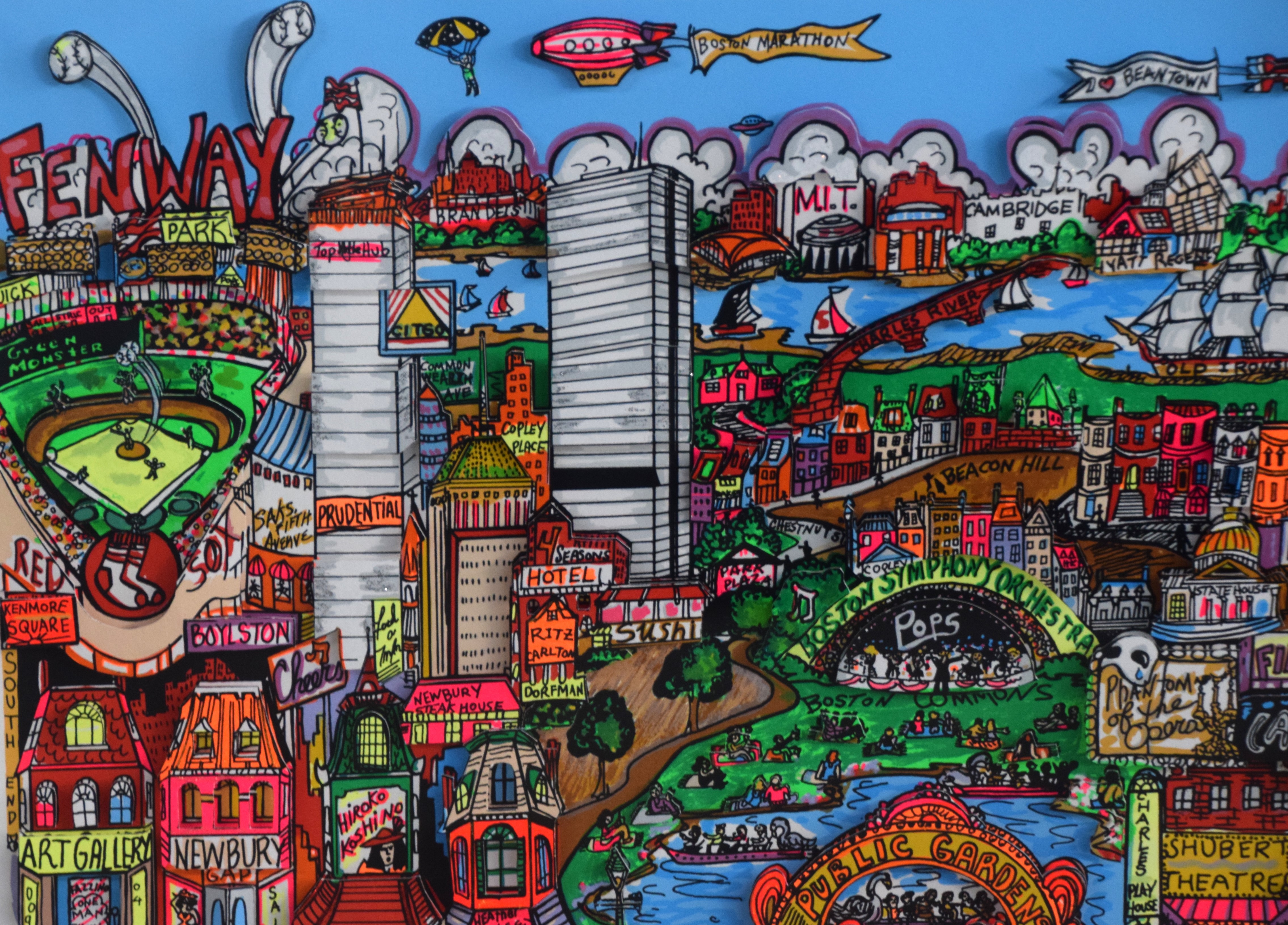 Colorful, framed and signed, 3-D Serigraph titled “Bean Town” by Charles Fazzino on museum board. Edition number 399 of 400 with Certificate of Authenticity, dated 1991. Charles Fazzino (Born 1955) works in New York and is known for 3-D graphics, kinetic sculpture, serigraphs. Fazzino has also immortalized locales such as New York, Baltimore and Philadelphia. Dimensions: 17″ x 27″ Image size