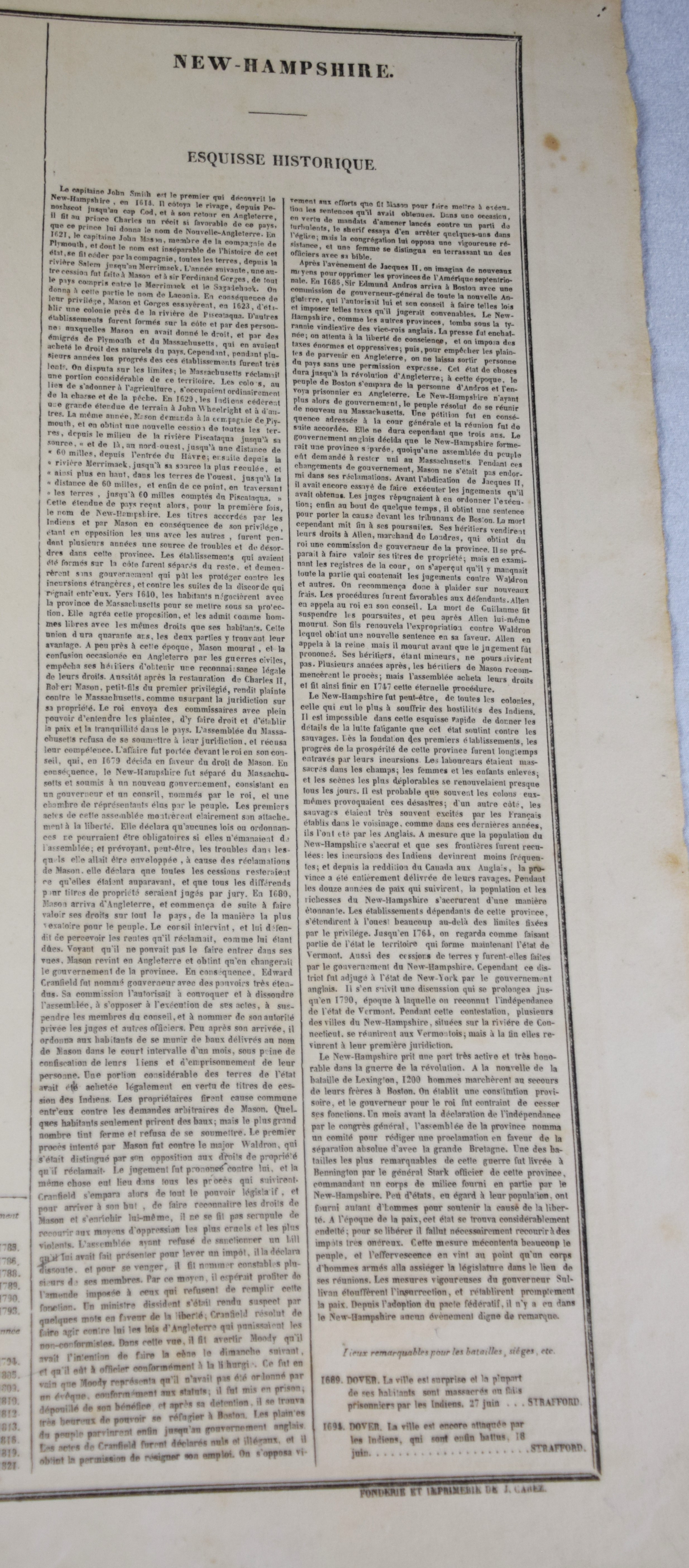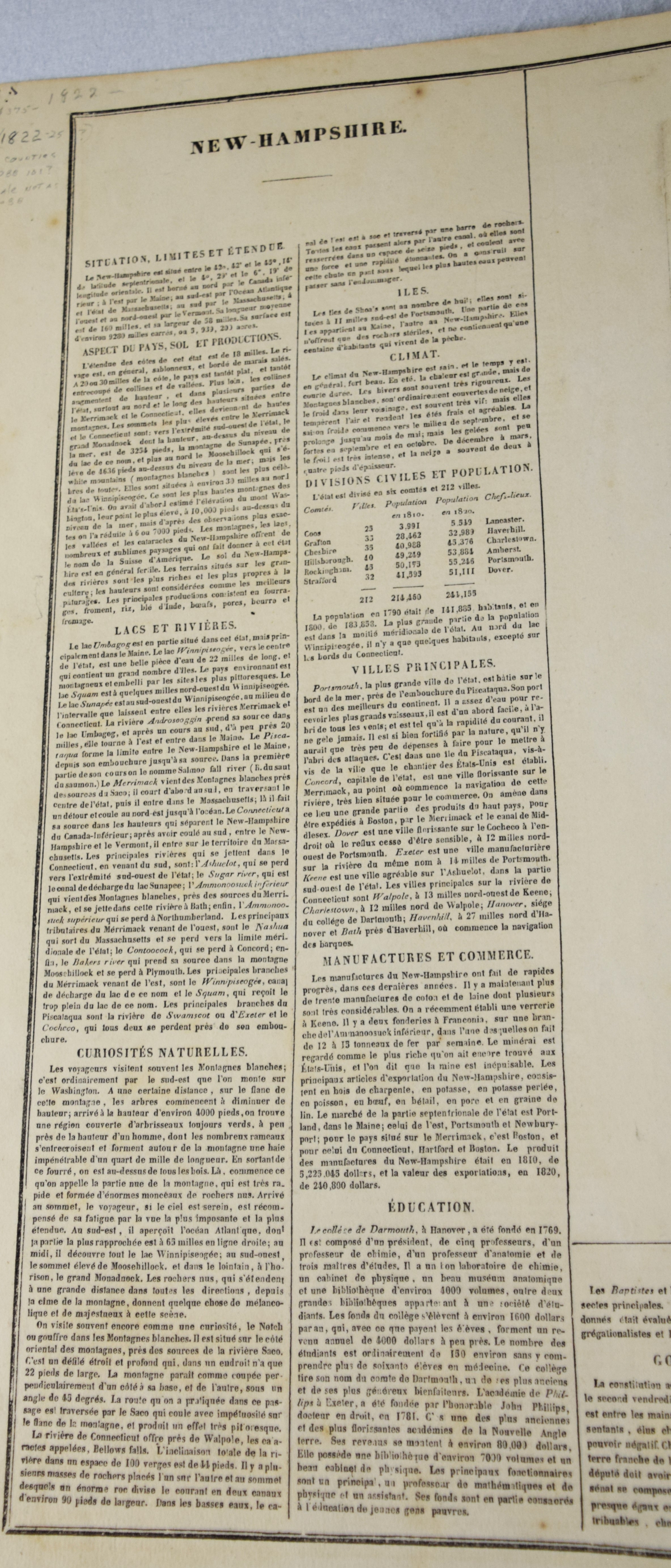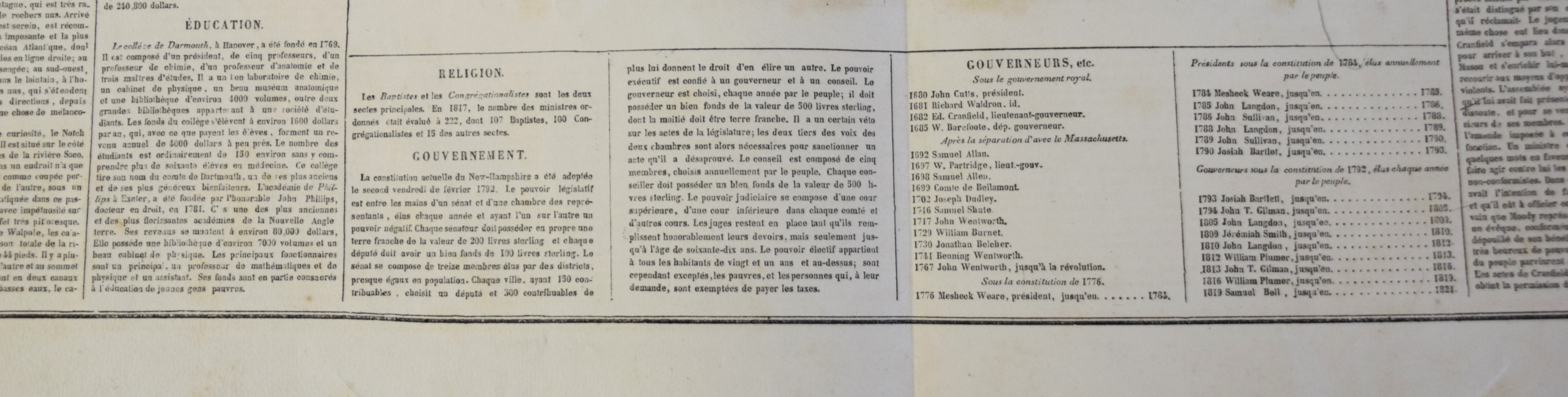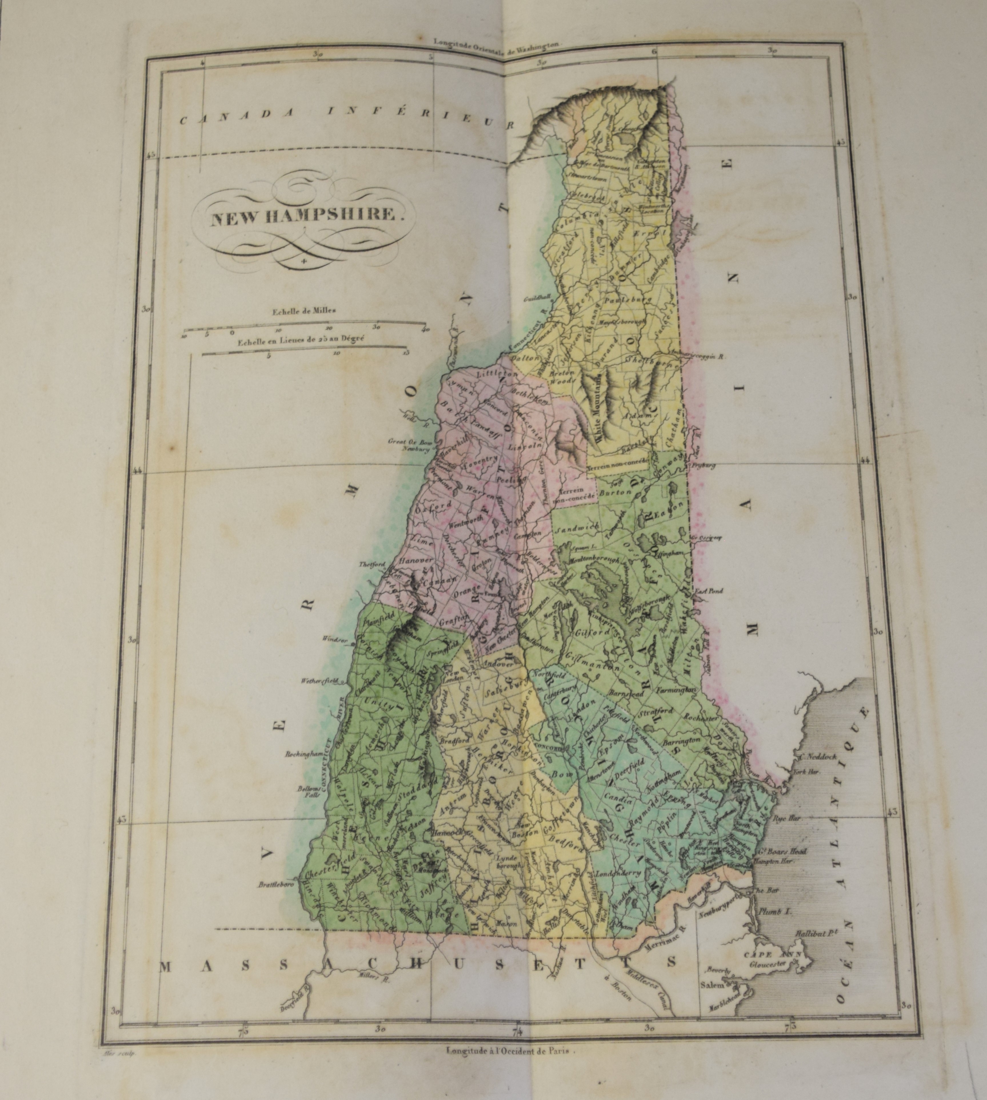 Geographical, Statistical and Historical Map of New Hampshire in an American and French version, circa 1825. An interesting historic and geographic overview of New Hampshire from the first quarter of the 19th century. This detailed map of New Hampshire presents the state organized into townships and counties, the latter delineated by fine hand color. The White Mountains are prominently depicted in a pictorial fashion ; while other geographic features, transportation routes, and “places remarkable for battles, sieges, etc.” are also shown. The sheet was issued as plate number 11 in the 1826 edition of Carey & Lea’s A Complete Historical, Chronological, and Geographical American Atlas. Dimensions: 18″ x 22″