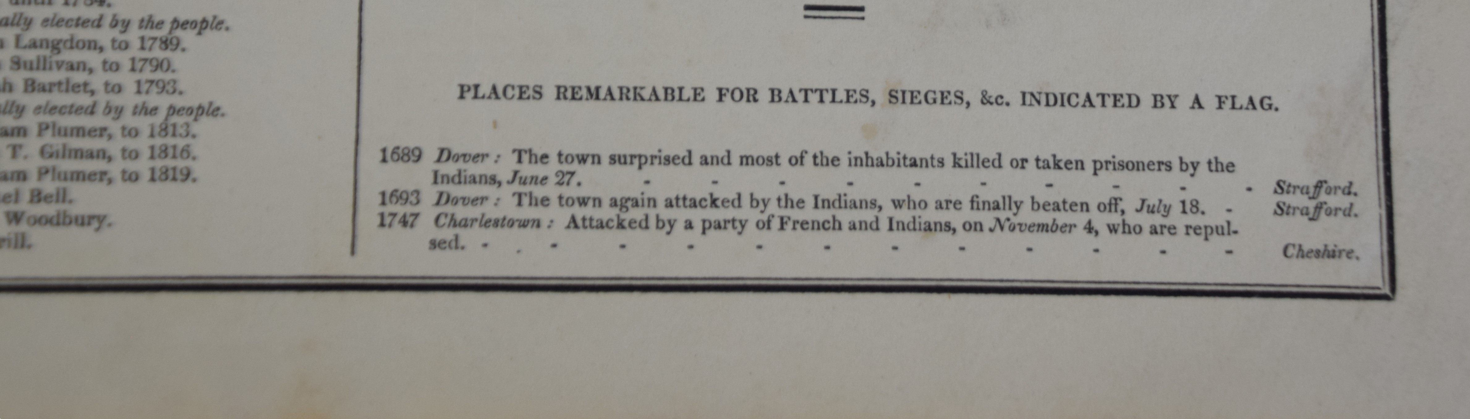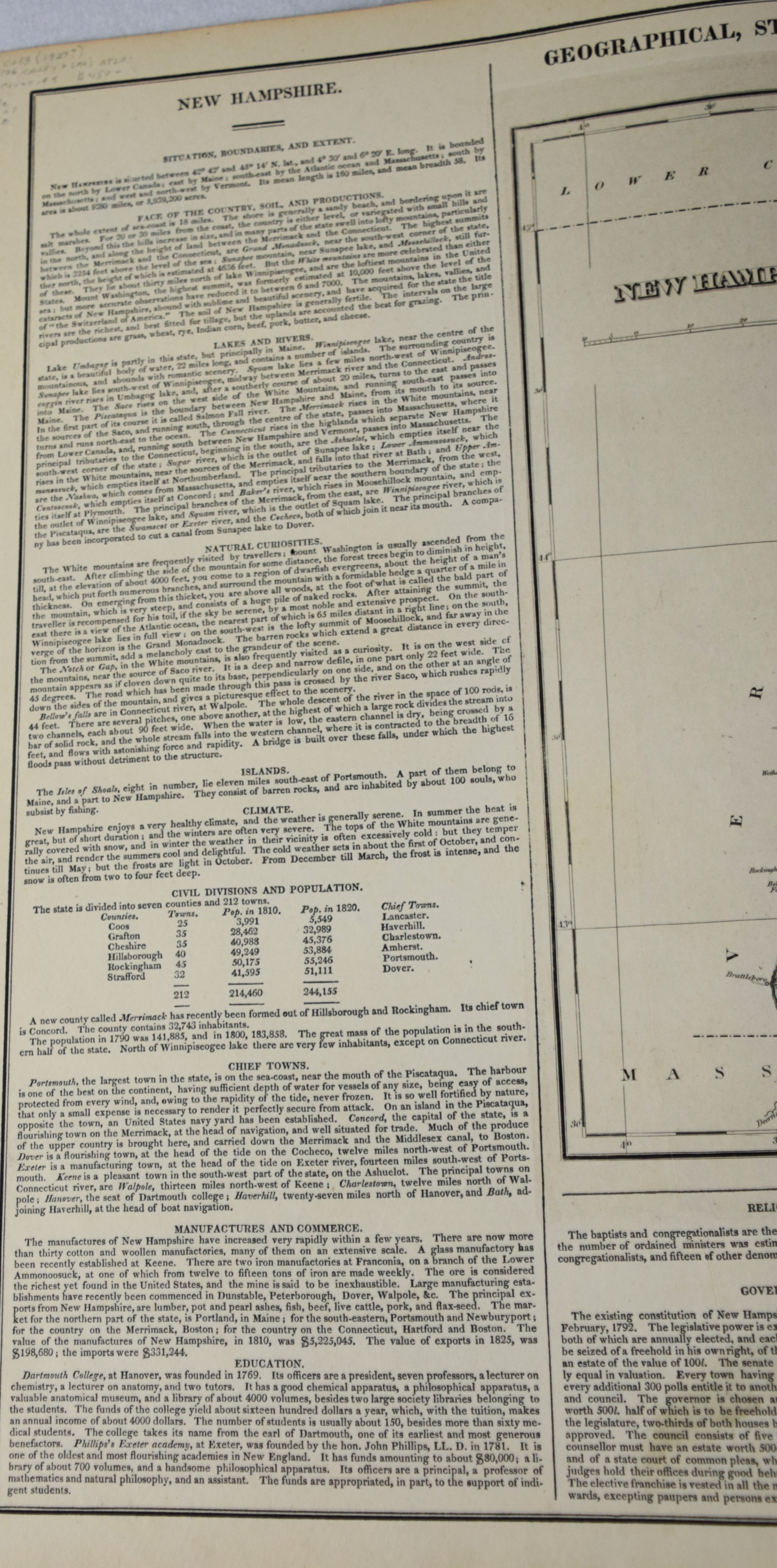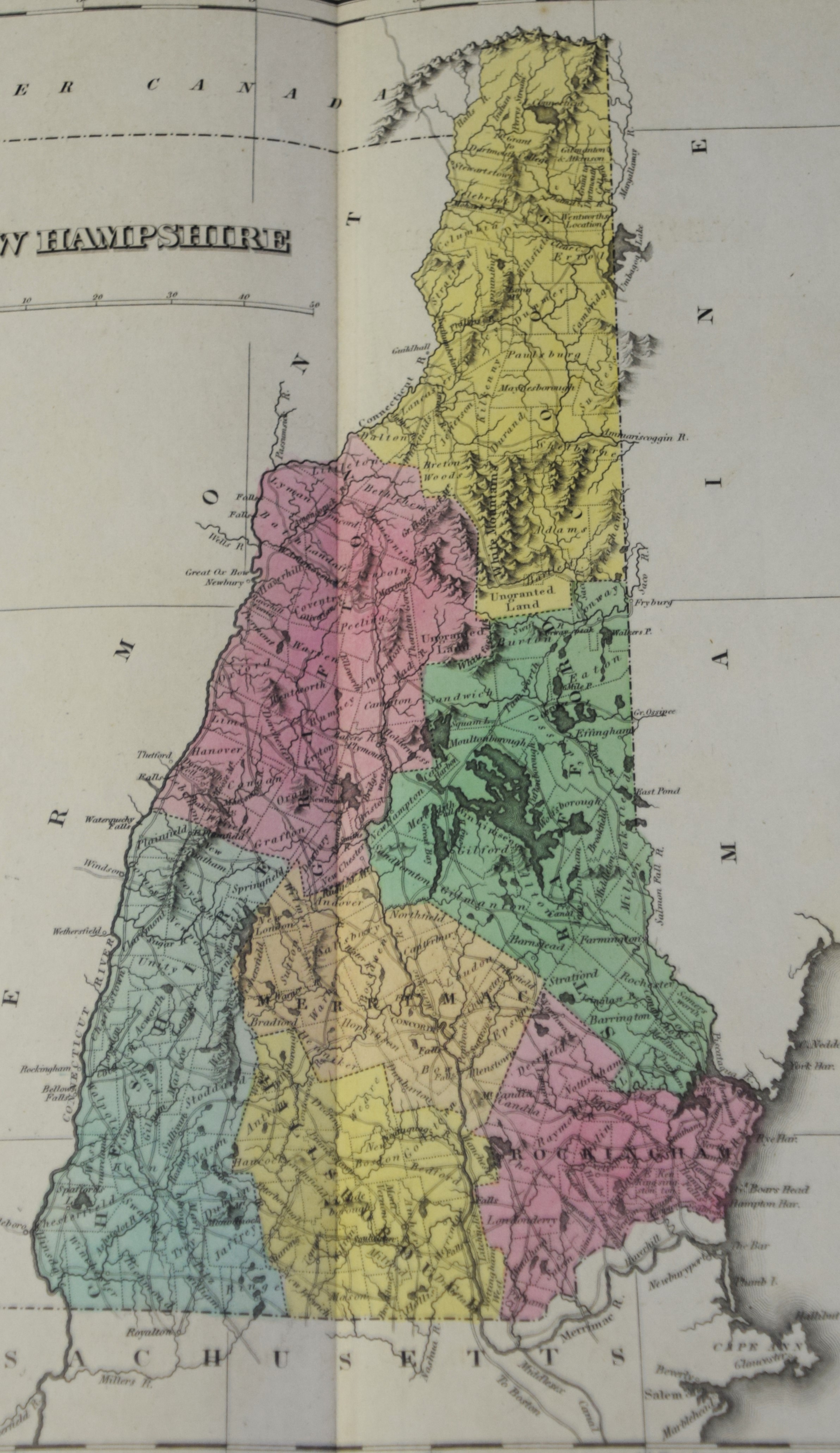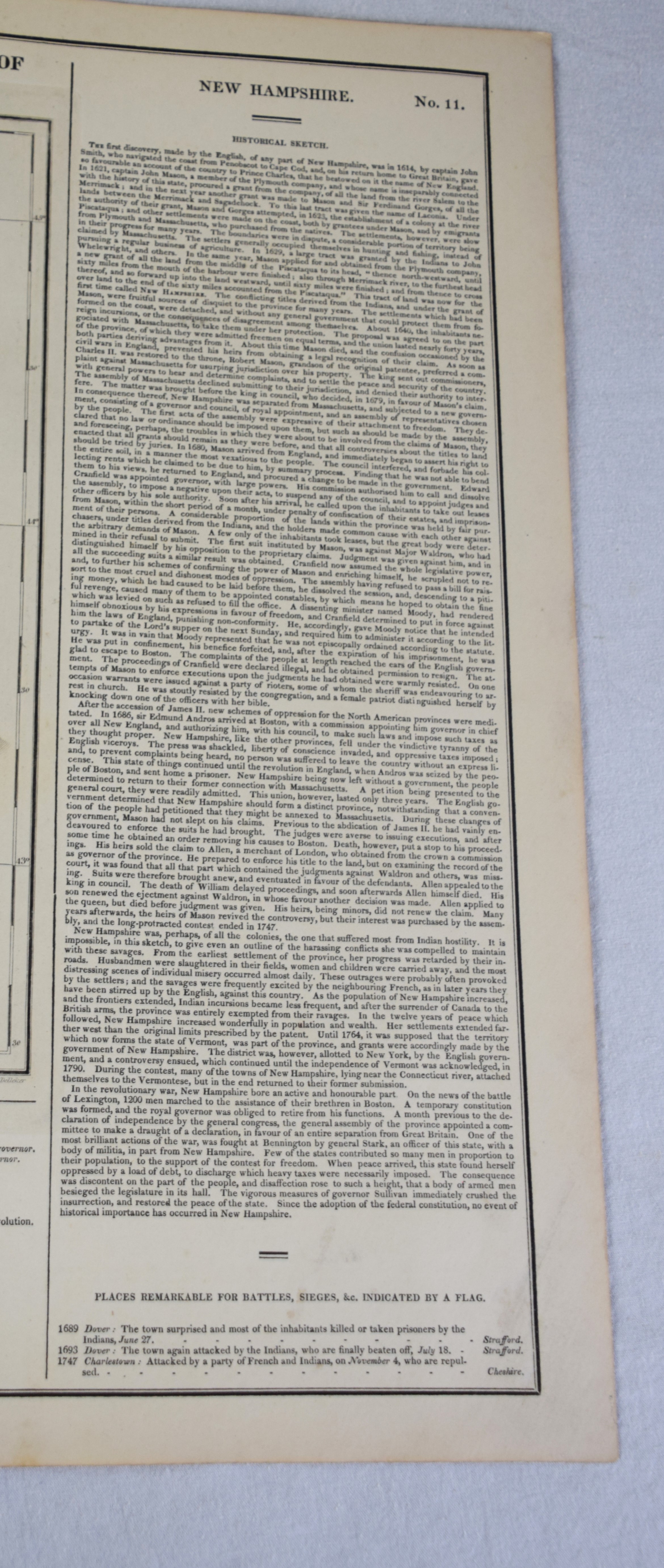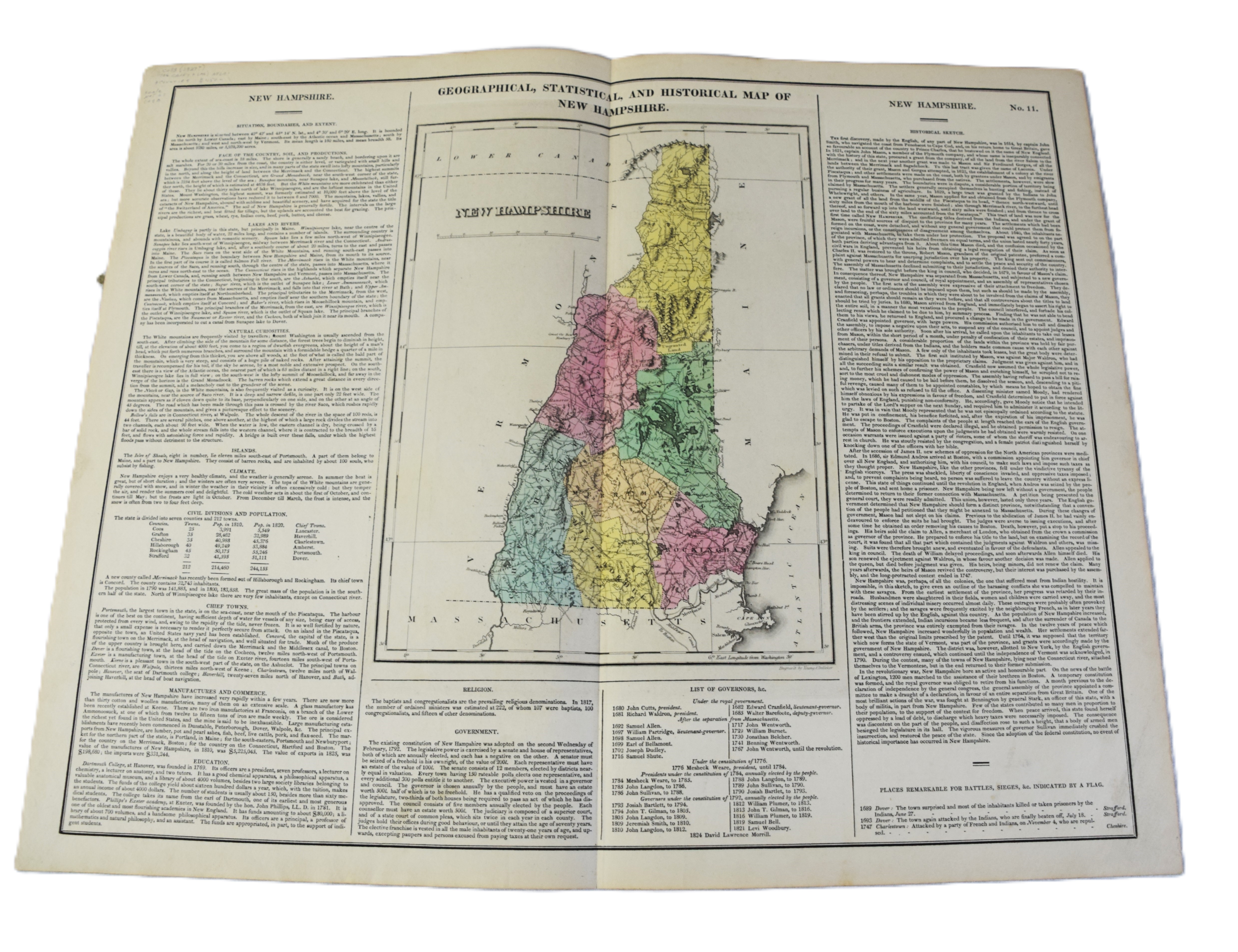 Geographical, Statistical and Historical Map of New Hampshire in an American and French version, circa 1825. An interesting historic and geographic overview of New Hampshire from the first quarter of the 19th century. This detailed map of New Hampshire presents the state organized into townships and counties, the latter delineated by fine hand color. The White Mountains are prominently depicted in a pictorial fashion ; while other geographic features, transportation routes, and “places remarkable for battles, sieges, etc.” are also shown. The sheet was issued as plate number 11 in the 1826 edition of Carey & Lea’s A Complete Historical, Chronological, and Geographical American Atlas. Dimensions: 18″ x 22″