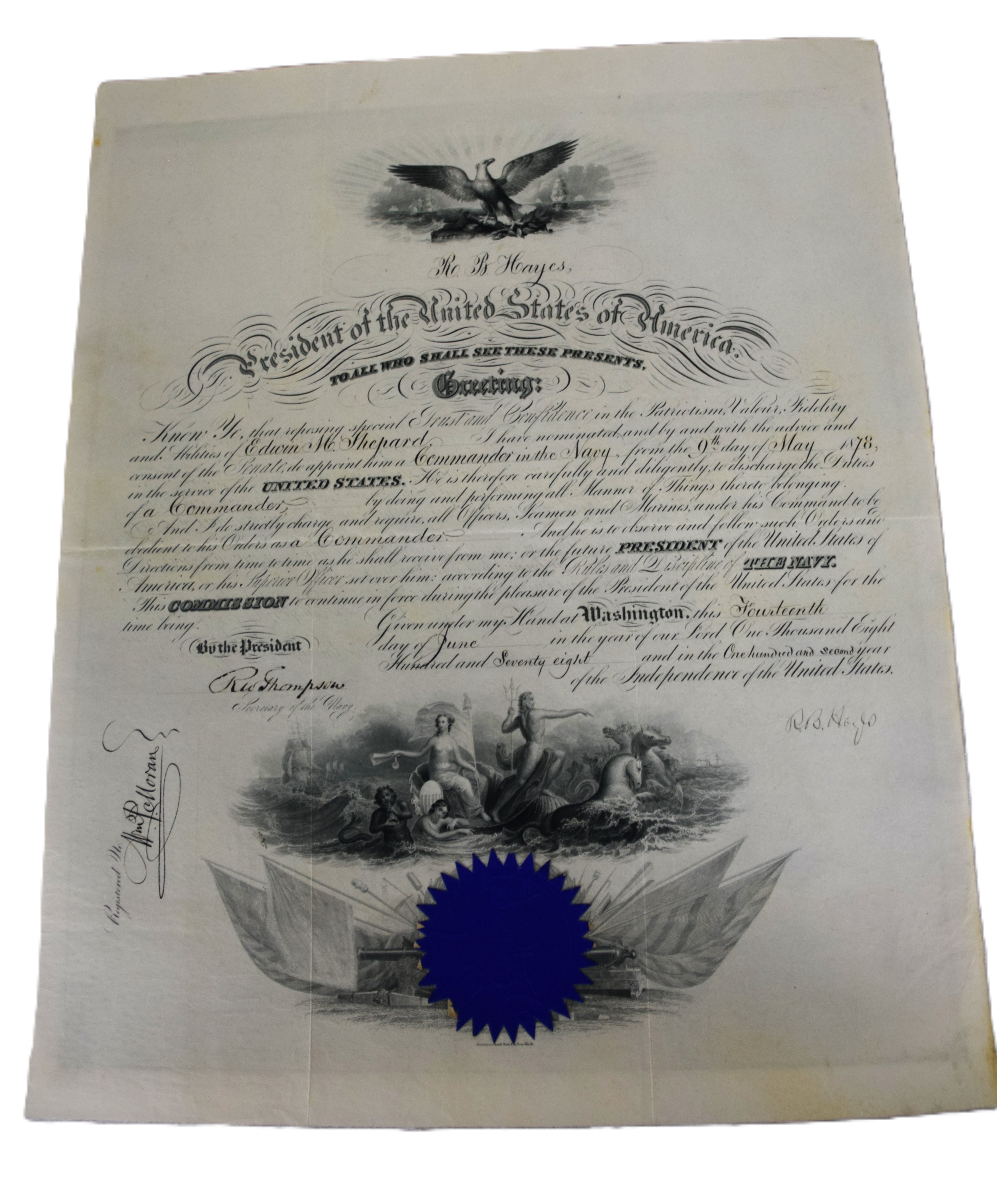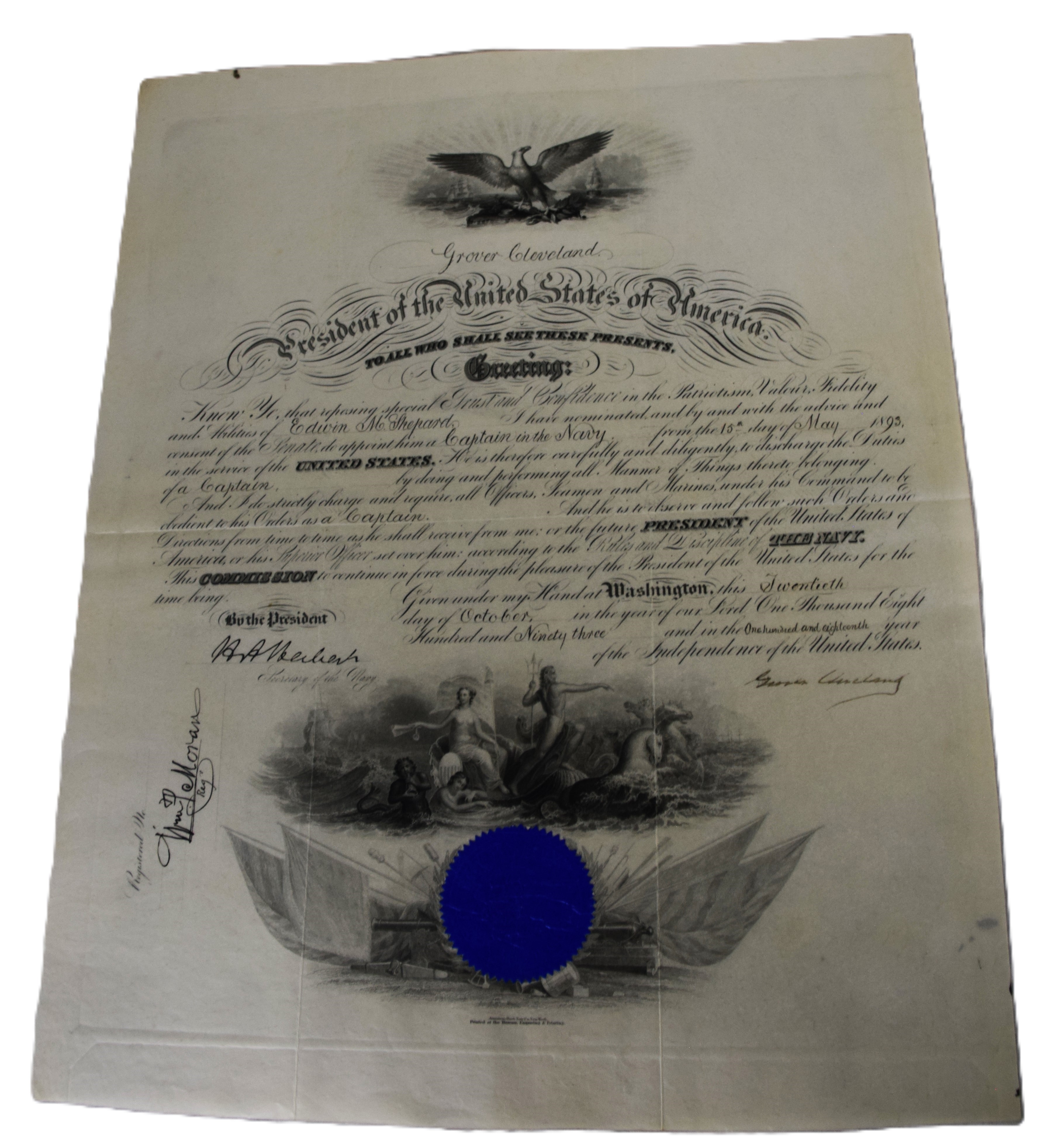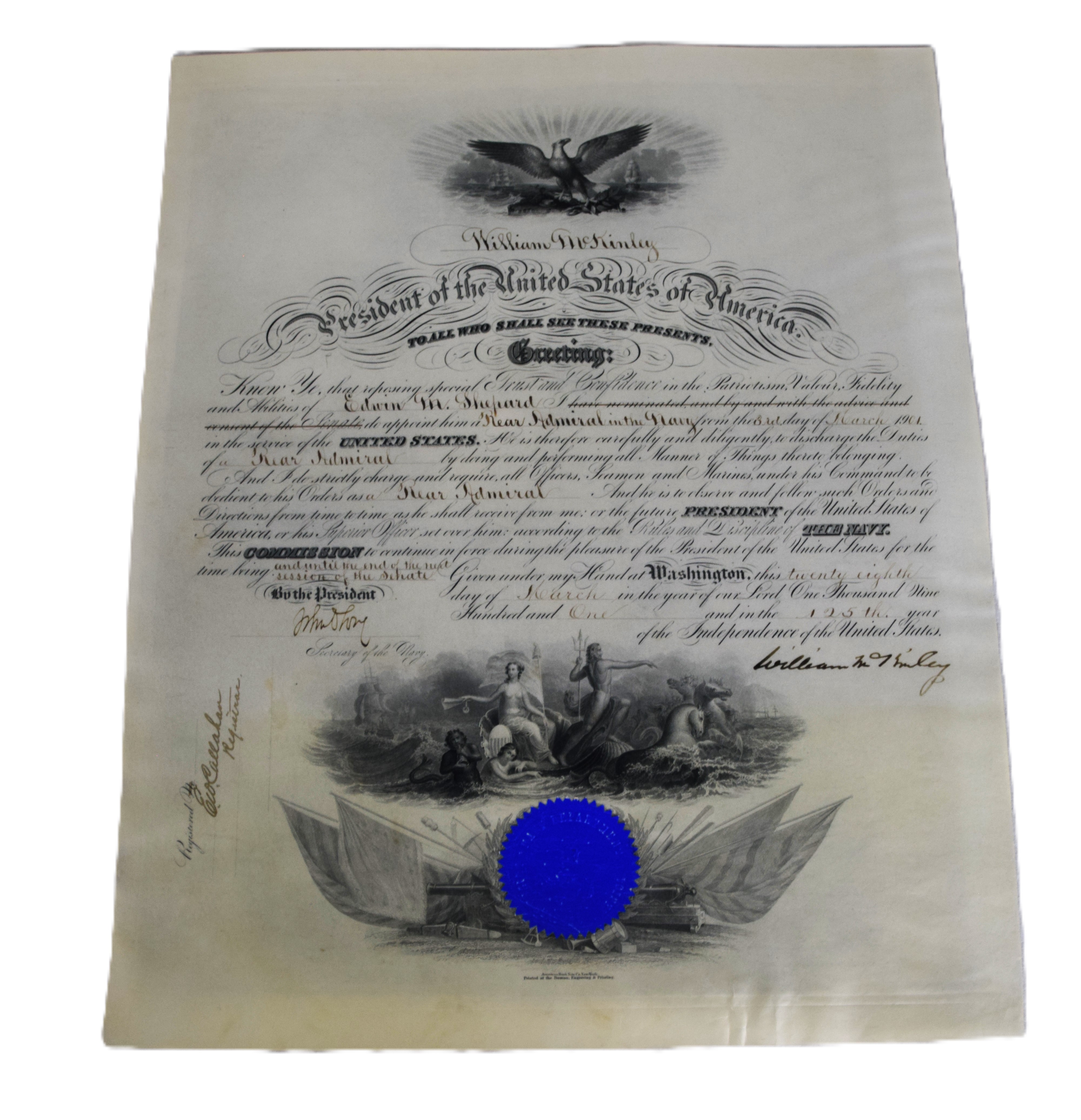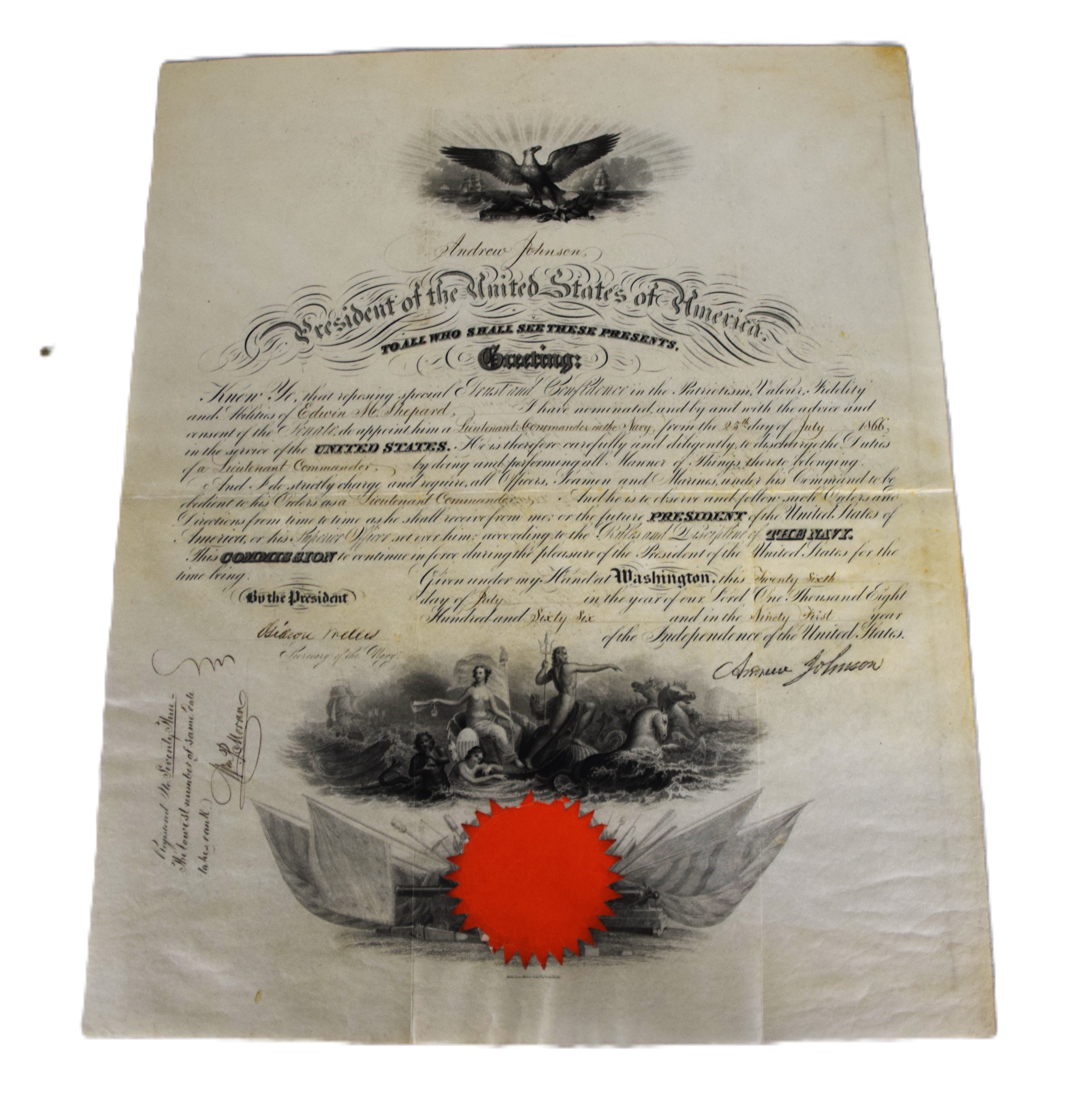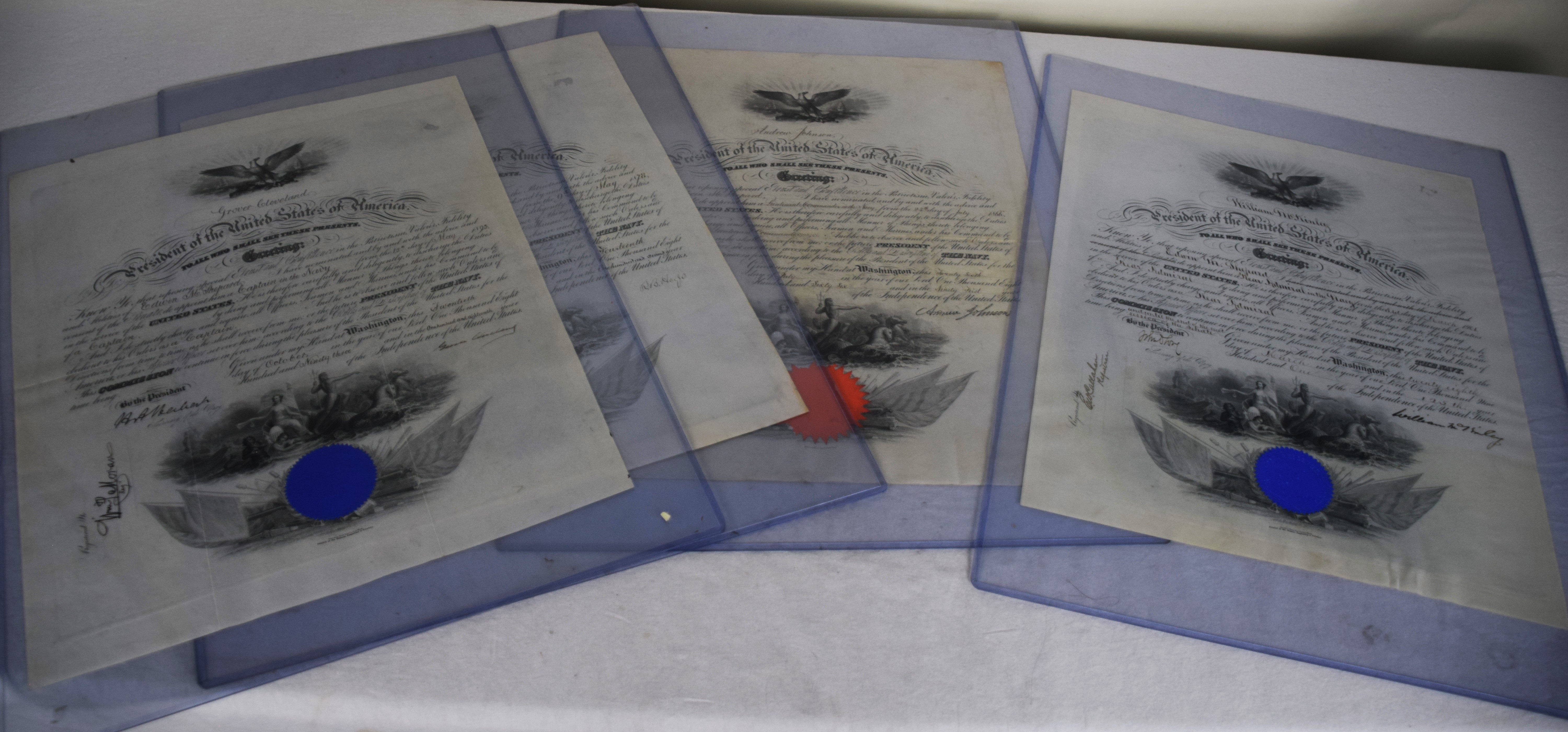 Four President-signed commissions for Rear Admiral Edwin M. Shepard- one by President Andrew Johnson in 1866, one by Rutherford B. Hayes in 1878. another by Grover Cleveland in 1893 and lastly, one by William McKinley in 1901 making Shepard a Rear Admiral. Edwin Malcolm Shepard (1843 – 1904) was a rear admiral of the United States Navy, who served during the Civil War. Shepard served on the monitor Mahopac during the siege of Charleston, South Carolina, then on the steam sloop Wachusett during the capture of the Confederate privateer Florida on October 7, 1864. Shepard became the first flag officer to become a student at the Naval War College. Dimensions: 20″ x 16″