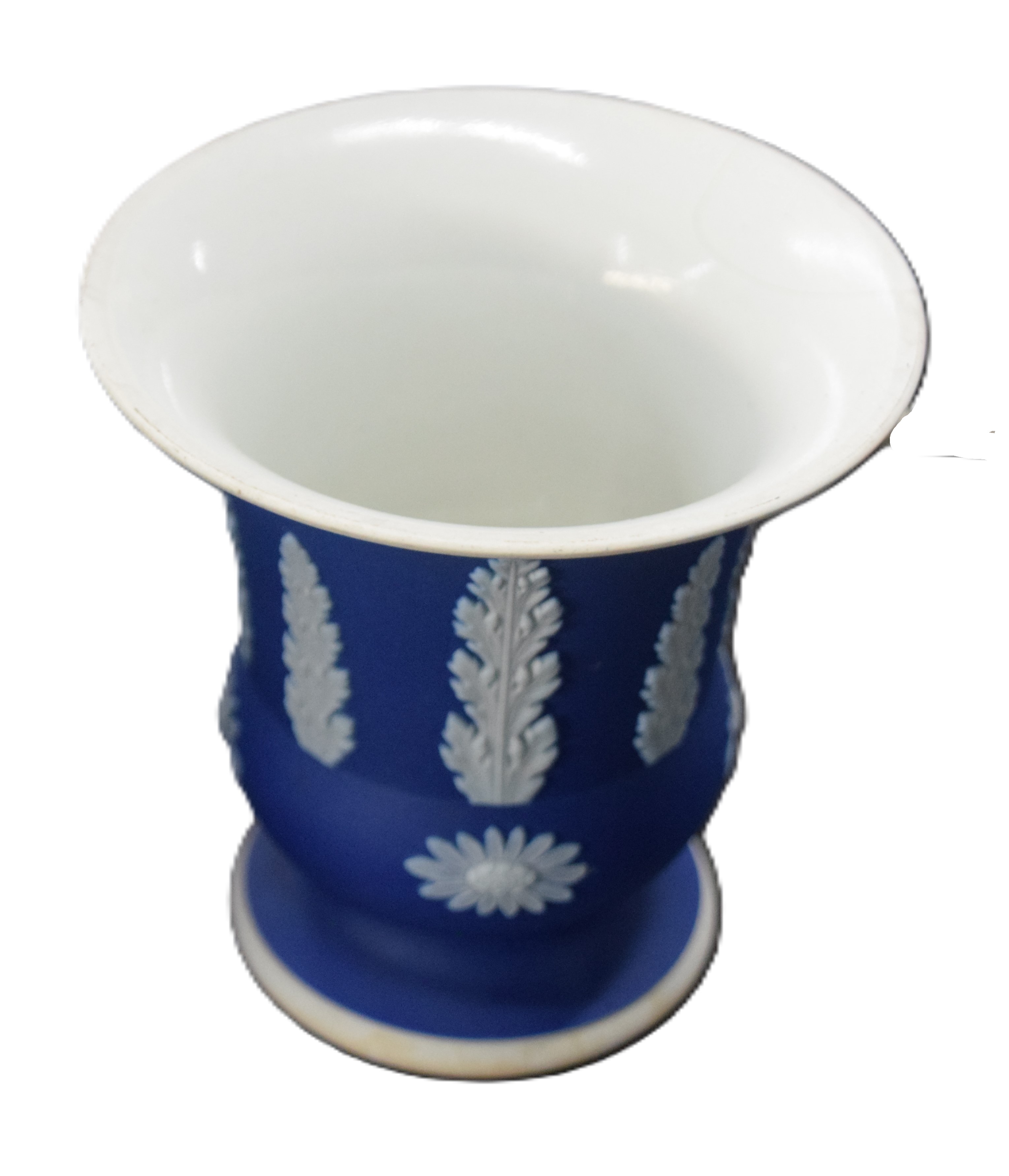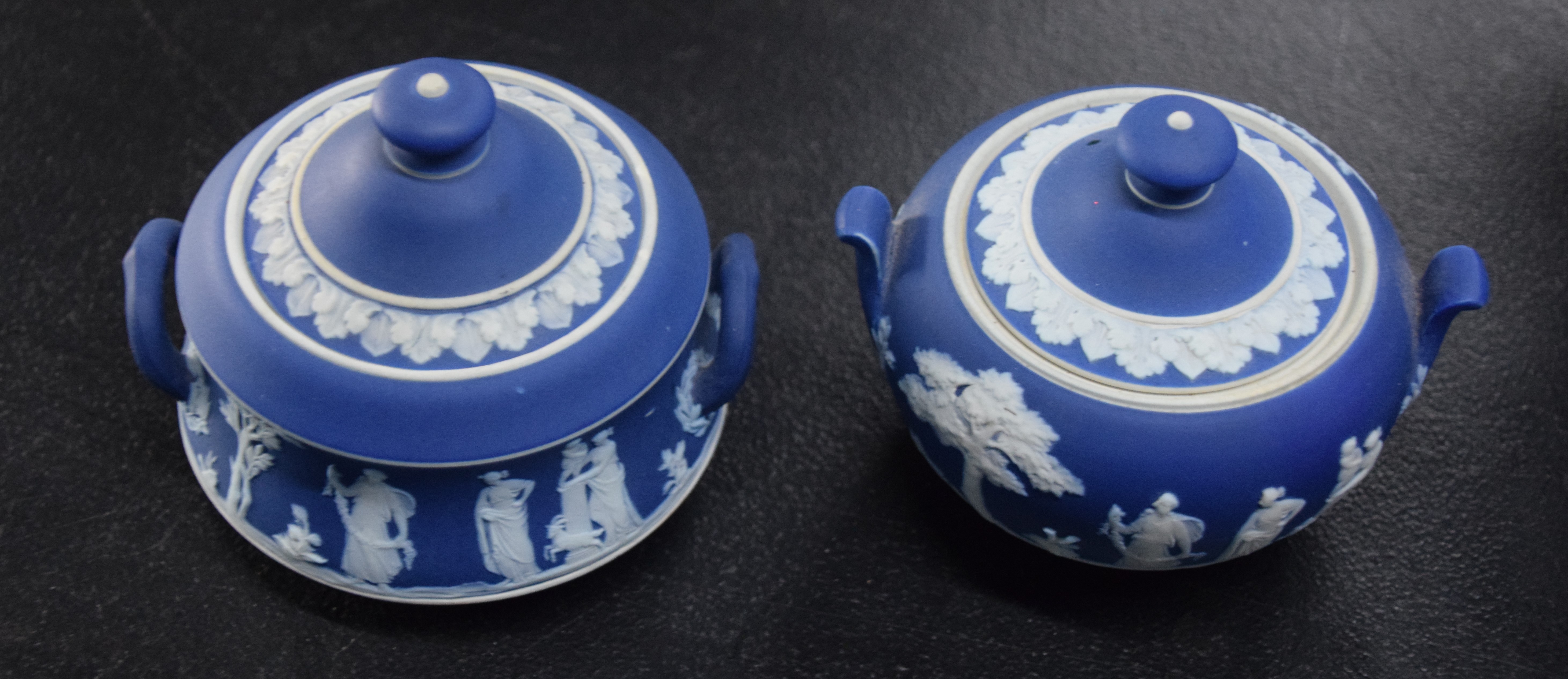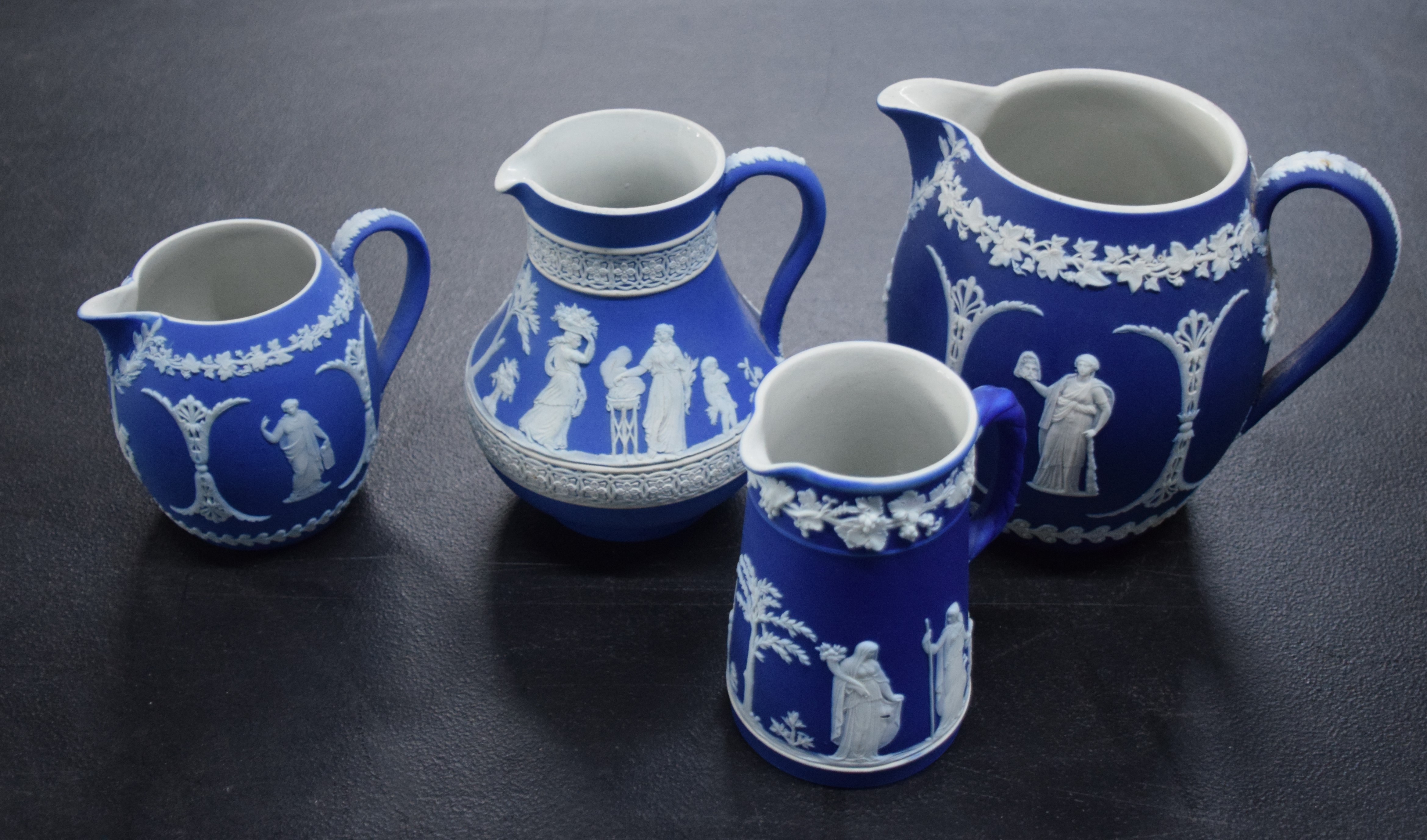 Eight piece of blue and white jasperware Wedgewood to include 4 pitchers with handles (4″, 5.5″, 5″, 6″), two covered sugars with lids (4″ H) and round circular covered box (5″ Dia.) and a vase, all marked and of earlier design. From the David Sargent Collection, New London, NH.