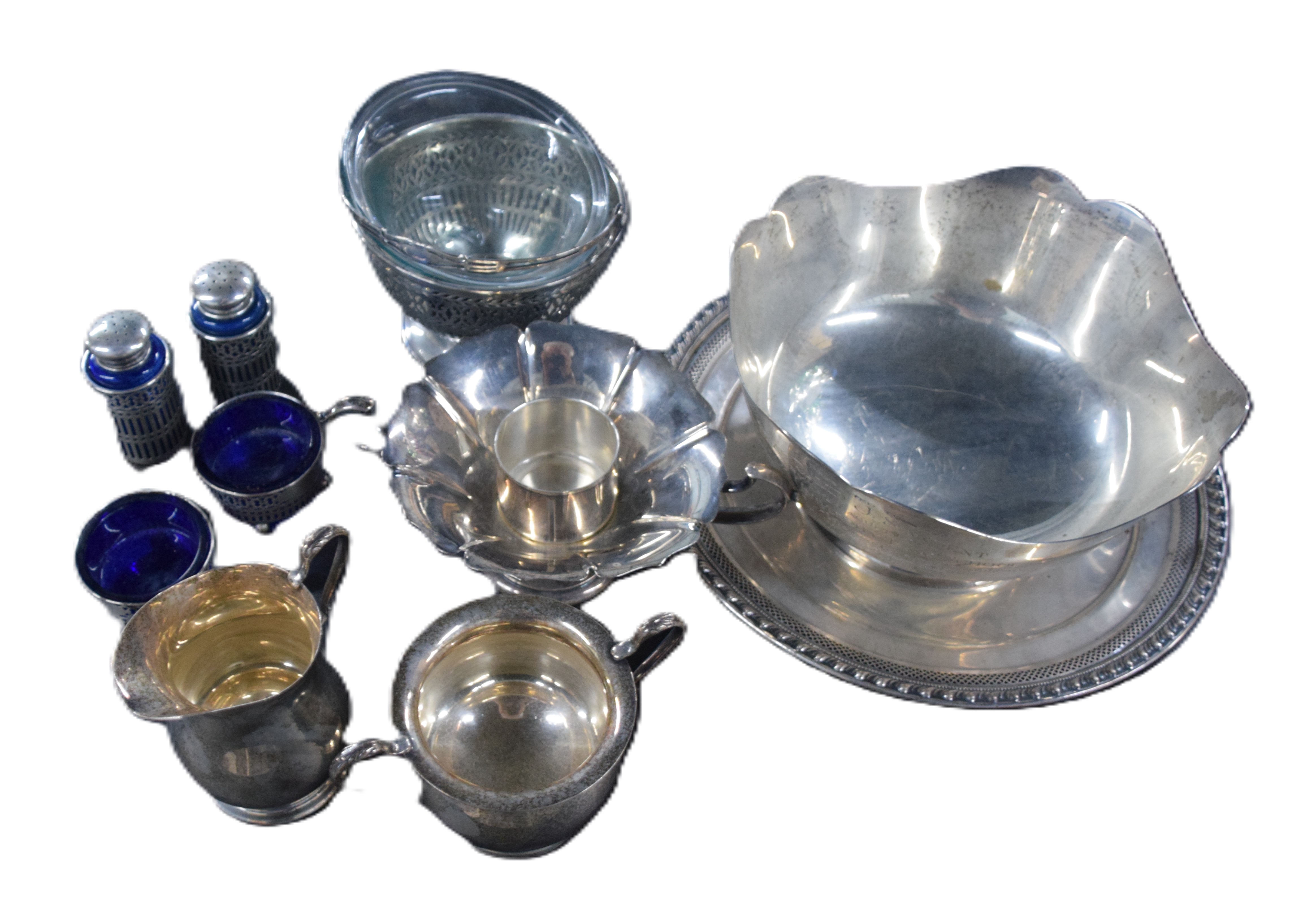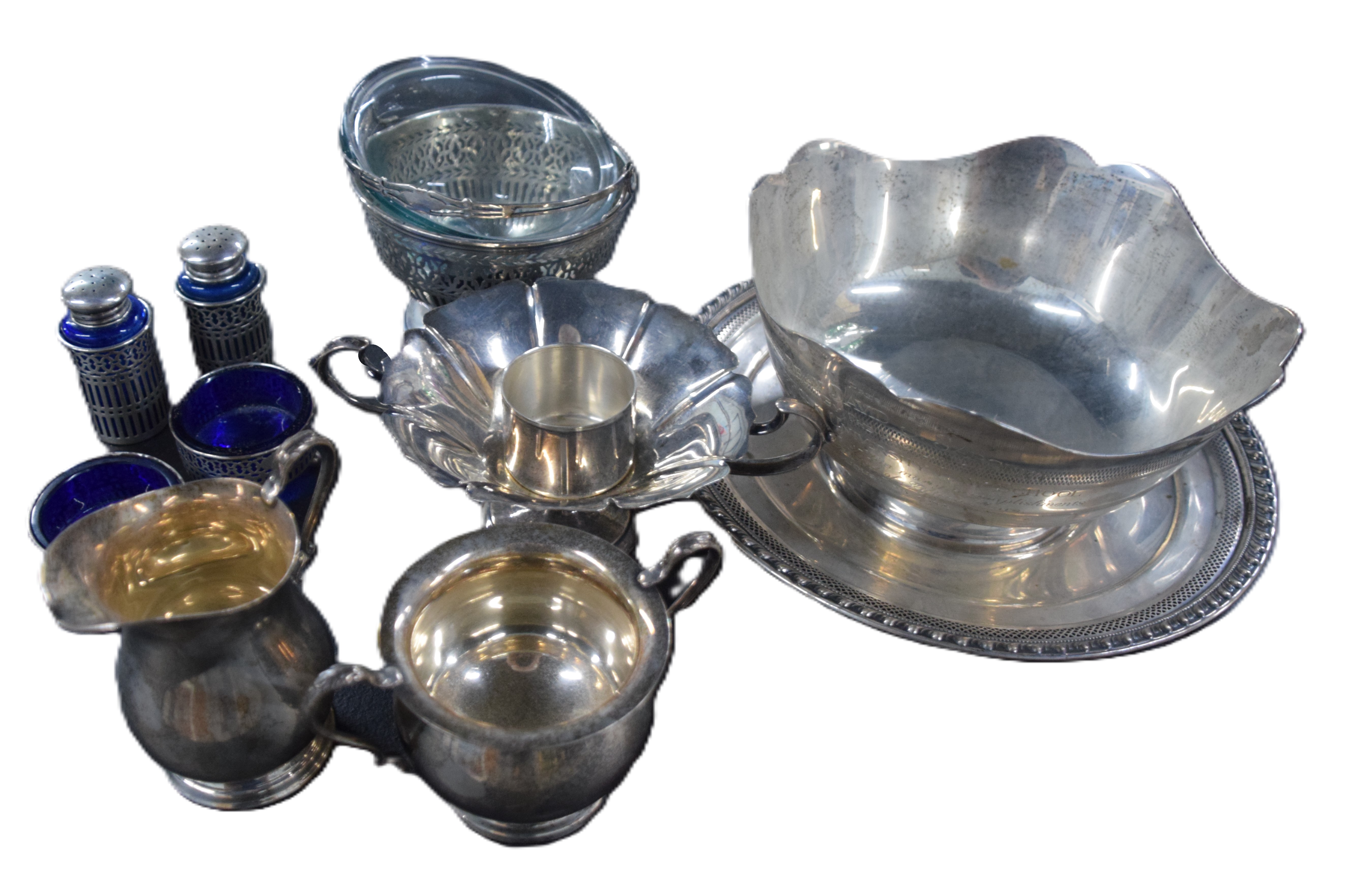 Ten piece Sterling silver tableware lot to include a shaped bowl (8″ Dia), circular dish (11″ Dia), creamer and sugar, handled basket, salt, and two handled candy dishes. Approximately 39 Troy Oz weighable silver