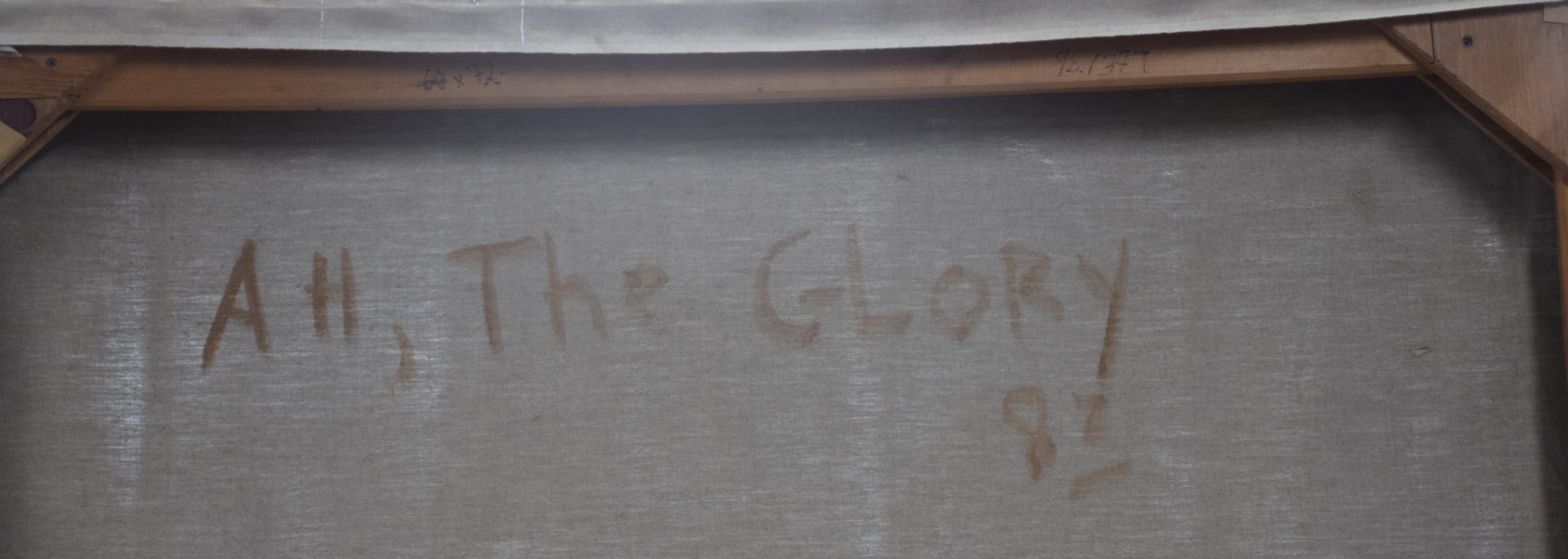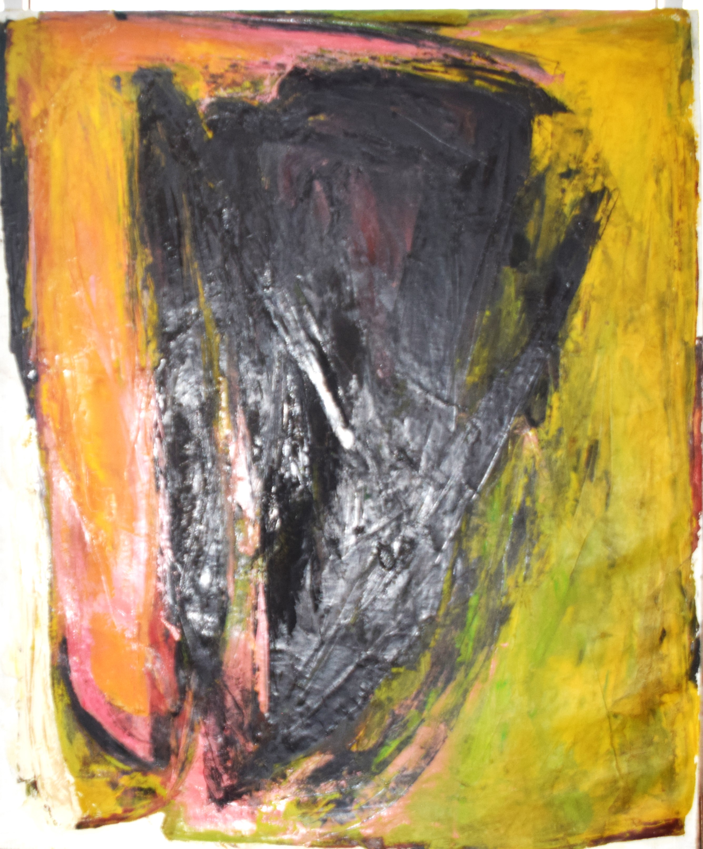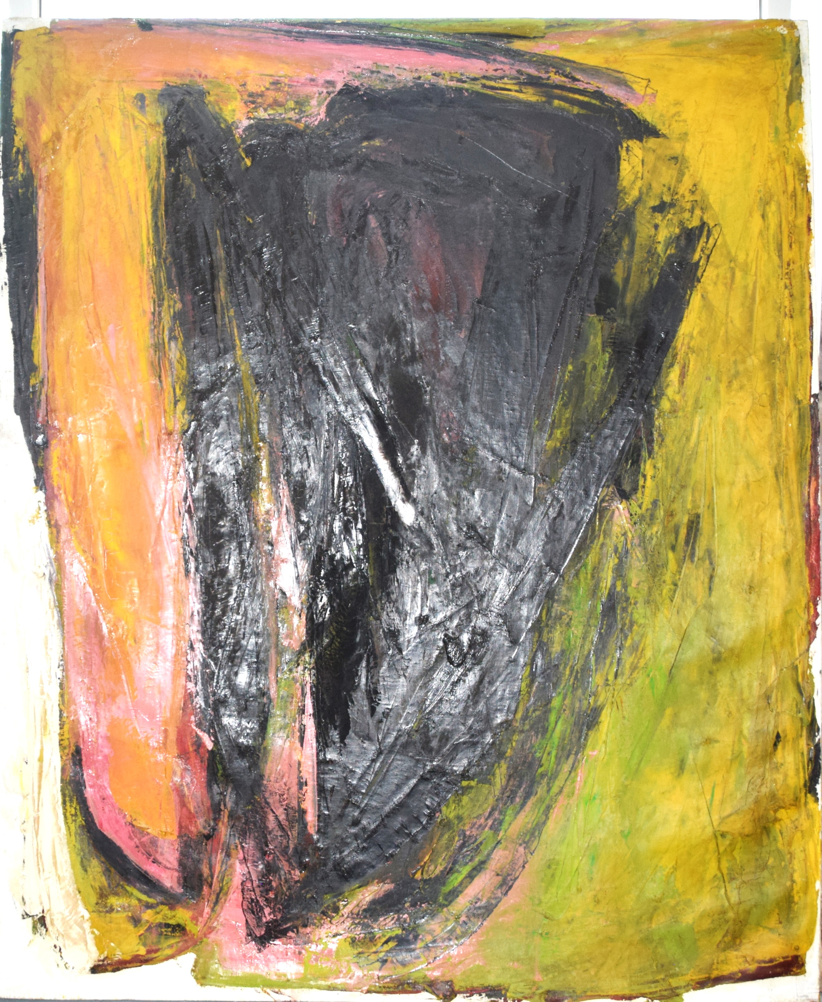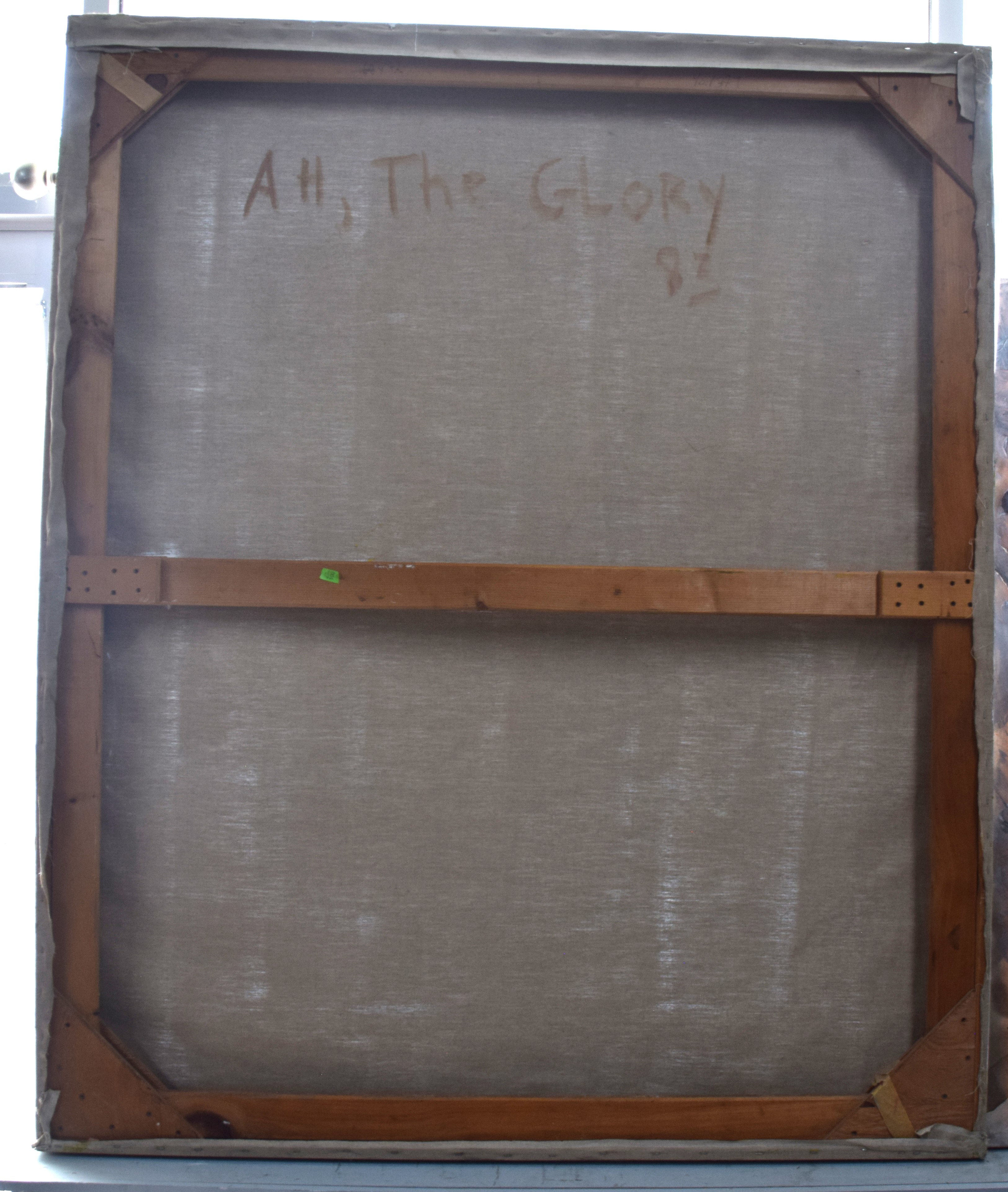 An abstract, multicolored painting entitled “All The Glory” dated 1987. Elyssa Rundle (1932 – 1994) worked in New York and Pennsylvania and is known for Gestural abstract painting (Vincent van Gogh was also known for Gestural techniques). She opened a studio on West 23rd Street in New York City and became a member of the New York School of Gestural Abstract Expressionism. Rundle took bolder risks in her approach to color, composition and proportion, encouraged by the interaction with fellow artists and feed-back by noted art critics of her time including supporters Clem Greenburg and John Russell. Three years after her death, in 1997, her collection of work won a grant from the Judith Rothschild Foundation, established for the purpose of bringing recognition to highly talented, deceased artists. The Rothschild Grant helped create an inventory of the collection, and an exhibit and catalogue called: The Spirit of the Paint, by the Berman Museum. This artwork is from that collection. Dimensions:72″ x 60″
