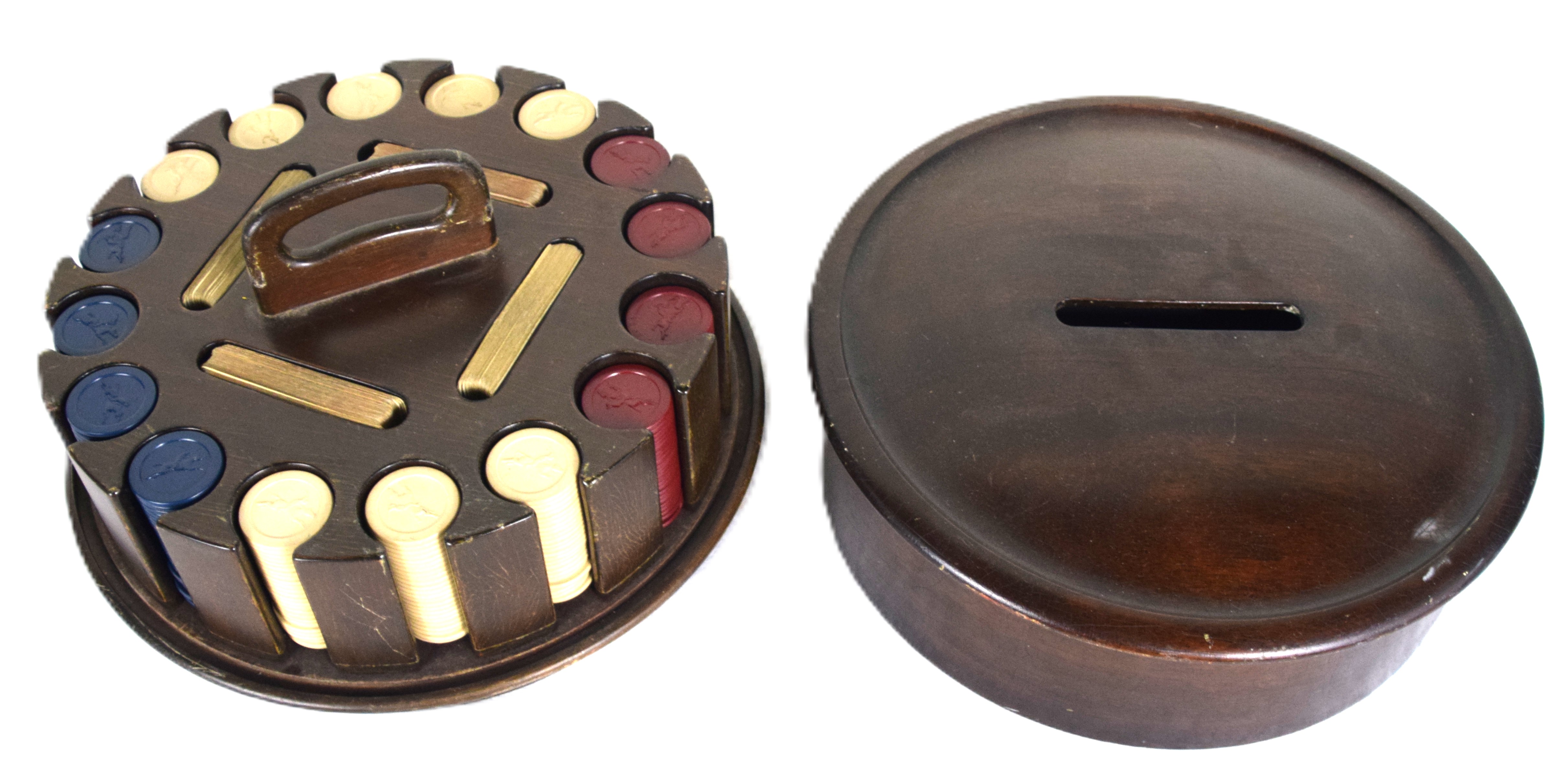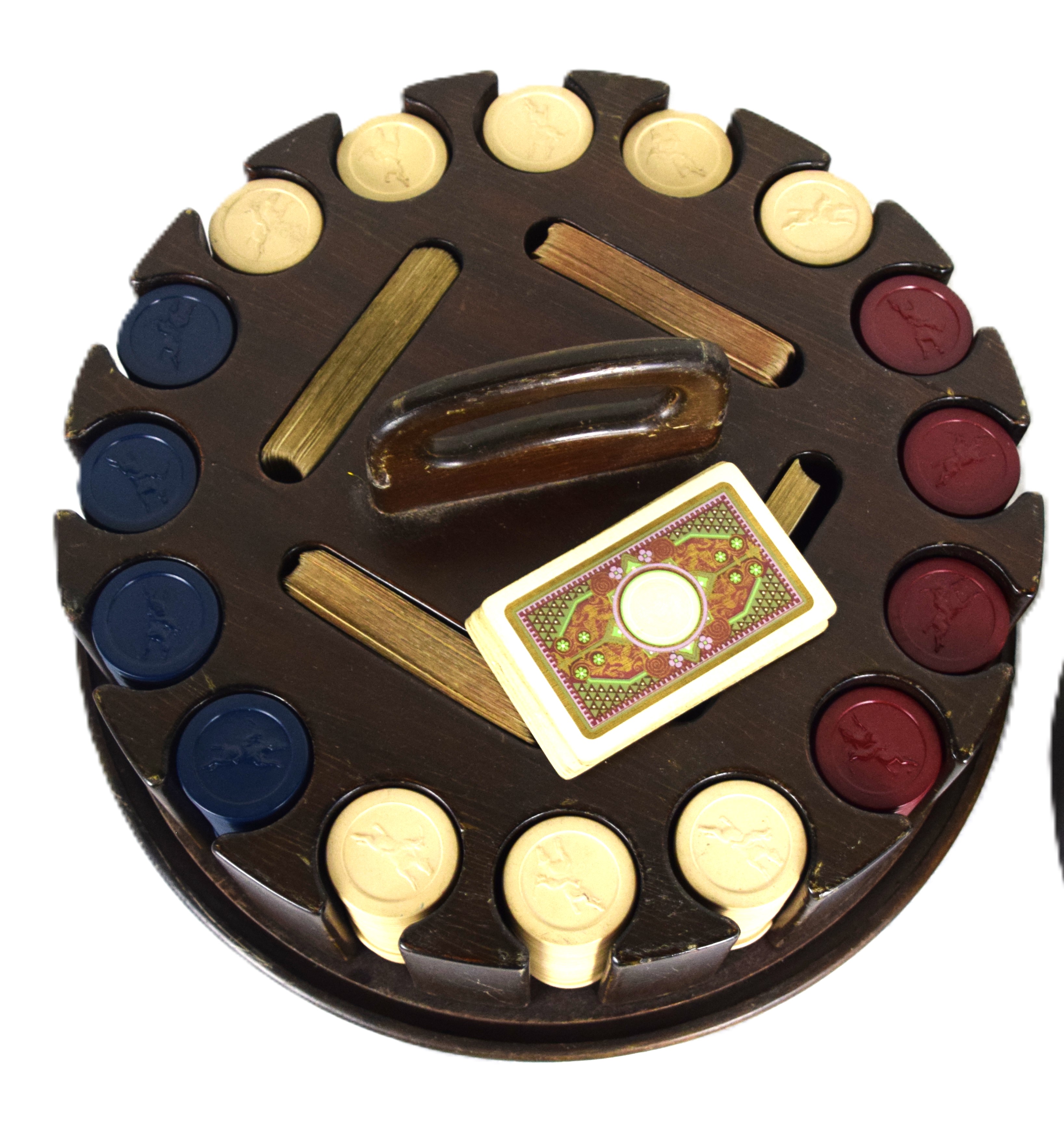 Wooden covered poker chip holder with four deck of cards and poker chips on a revolving base. Dimensions: 13.5″ Dia