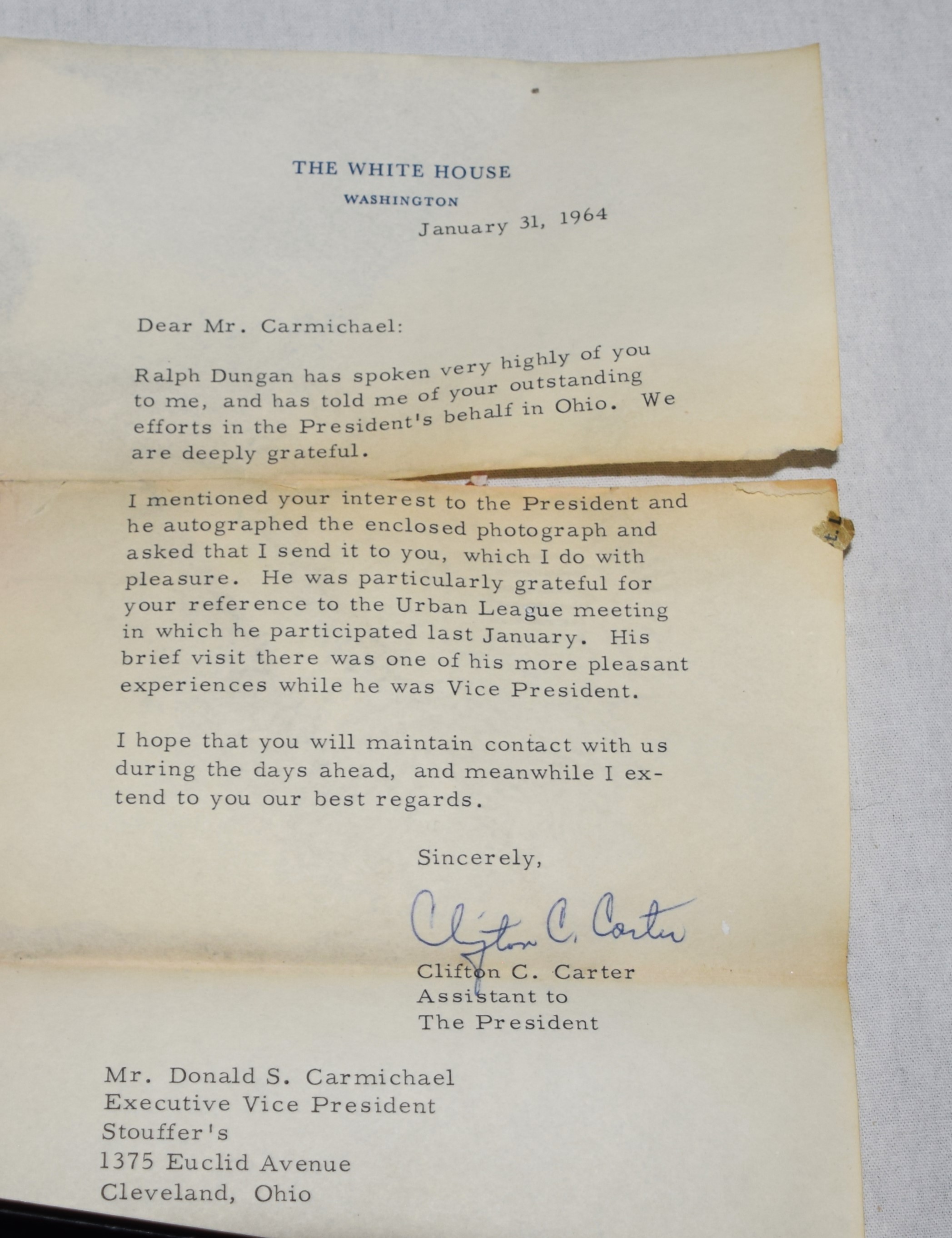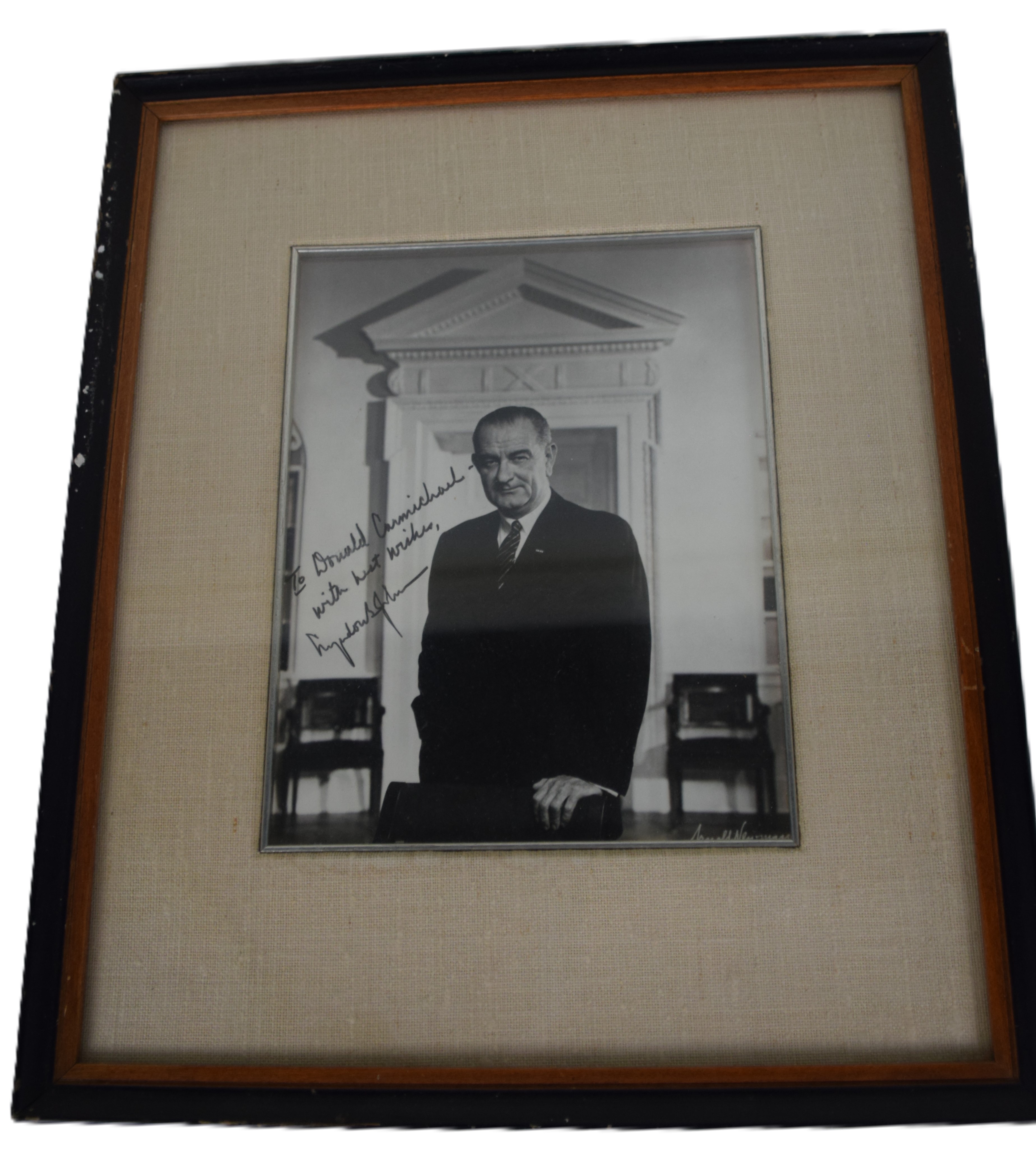A framed hand-signed portrait of President Lyndon Baines Johnson and a letter written by Clifton Carter, Assistant to the President. Dimensions: 16.5″ x 14″