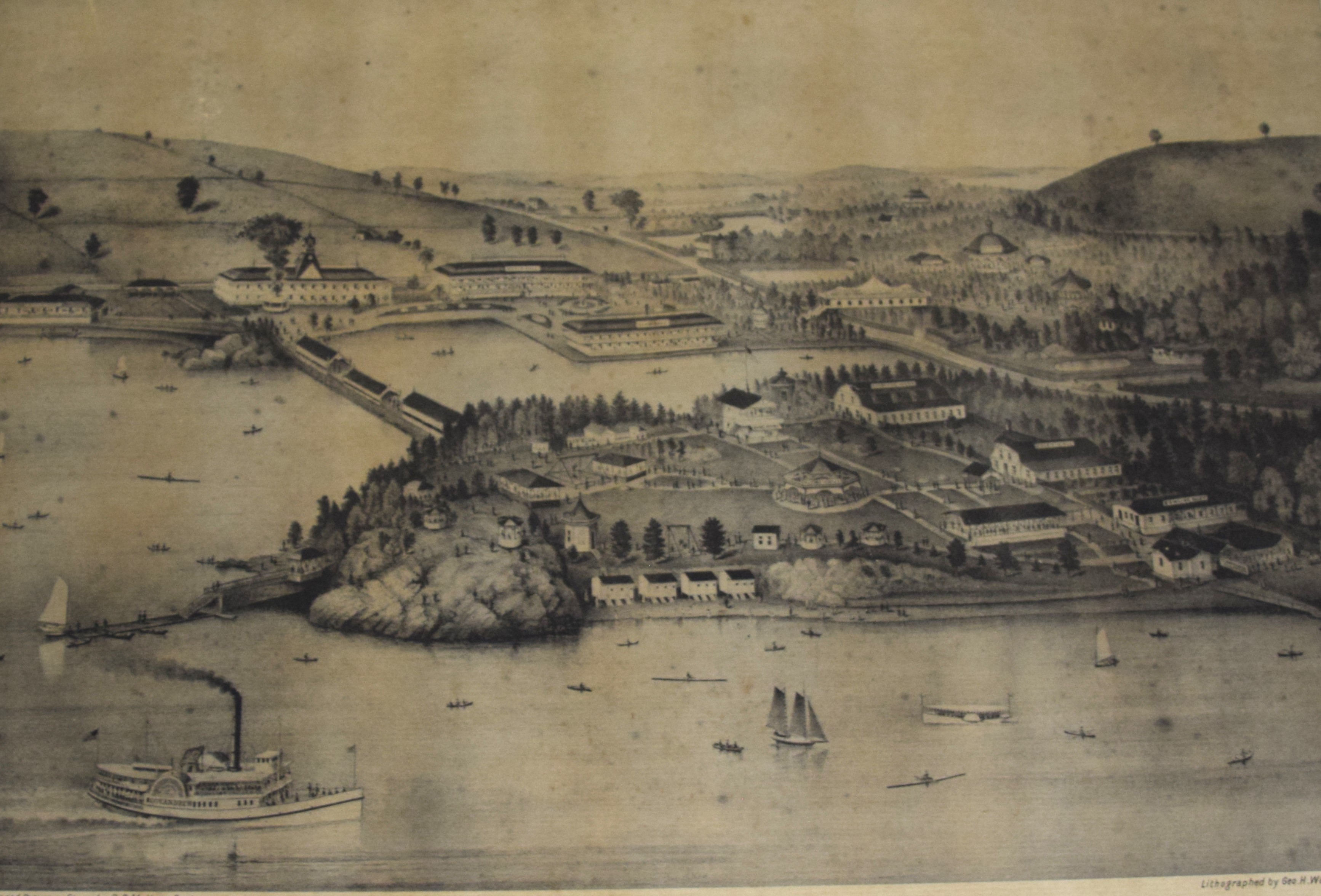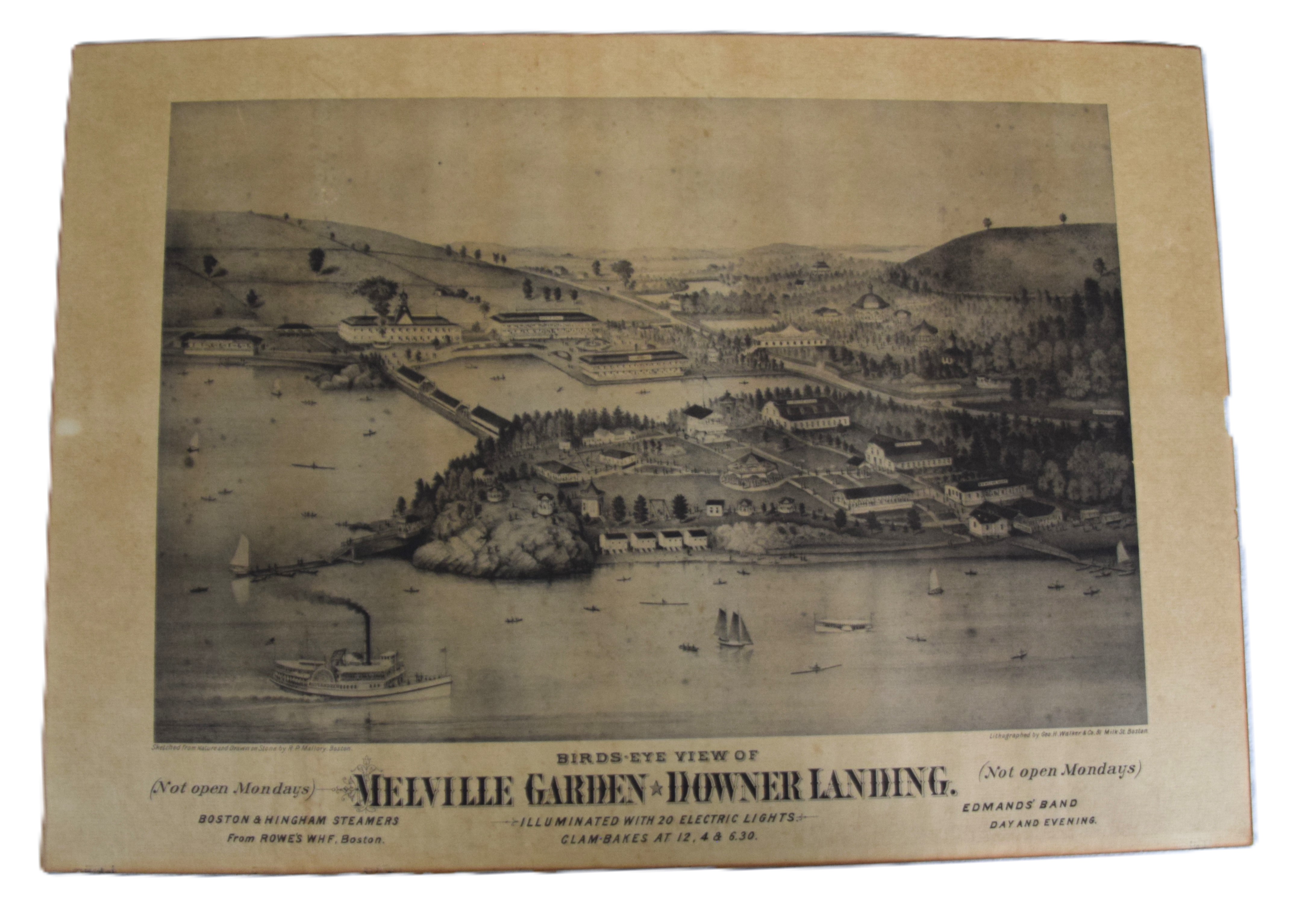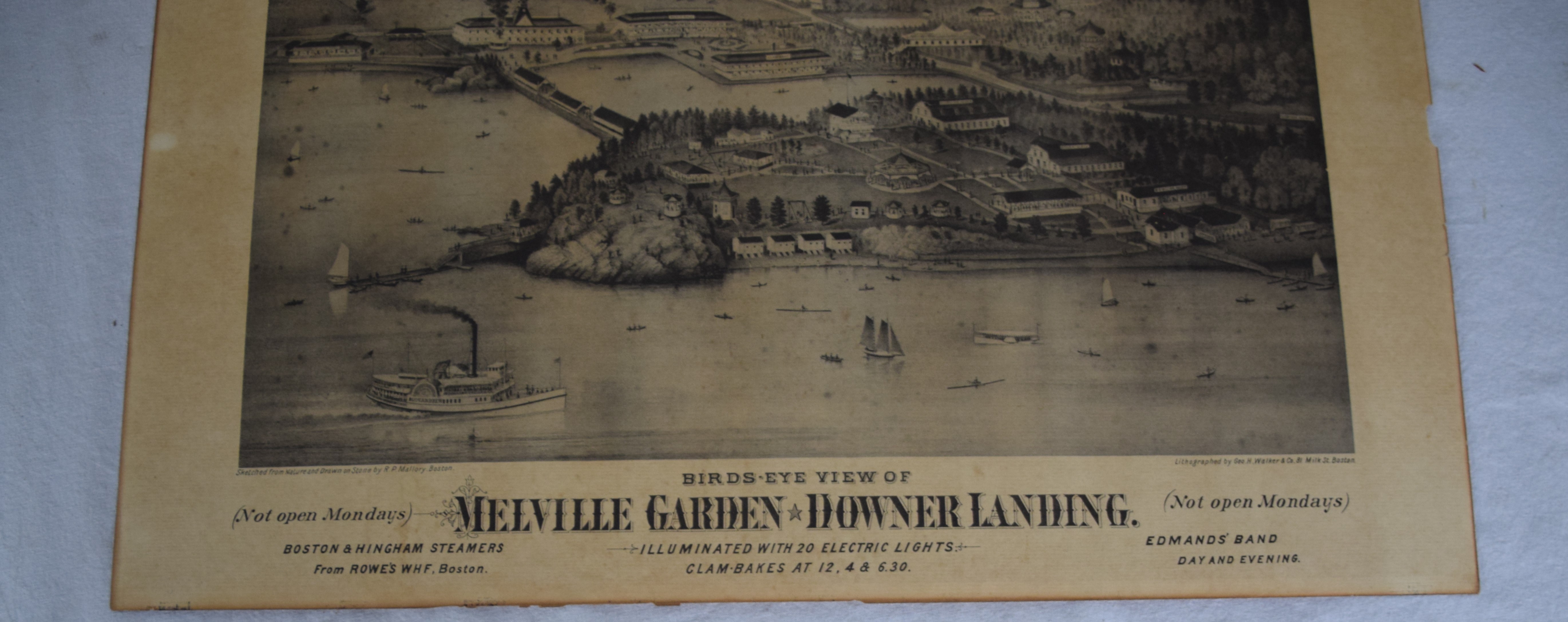 Birds-eye View Map of Melville Garden-Downer Landing which was “illuminated with 20 electric lights and clam bakes at 12, 4, and 6:30”. Printed by Boston & Hingham Steamer from Rowe’s Wharf, Boston. Dimensions: 14″ x 20″