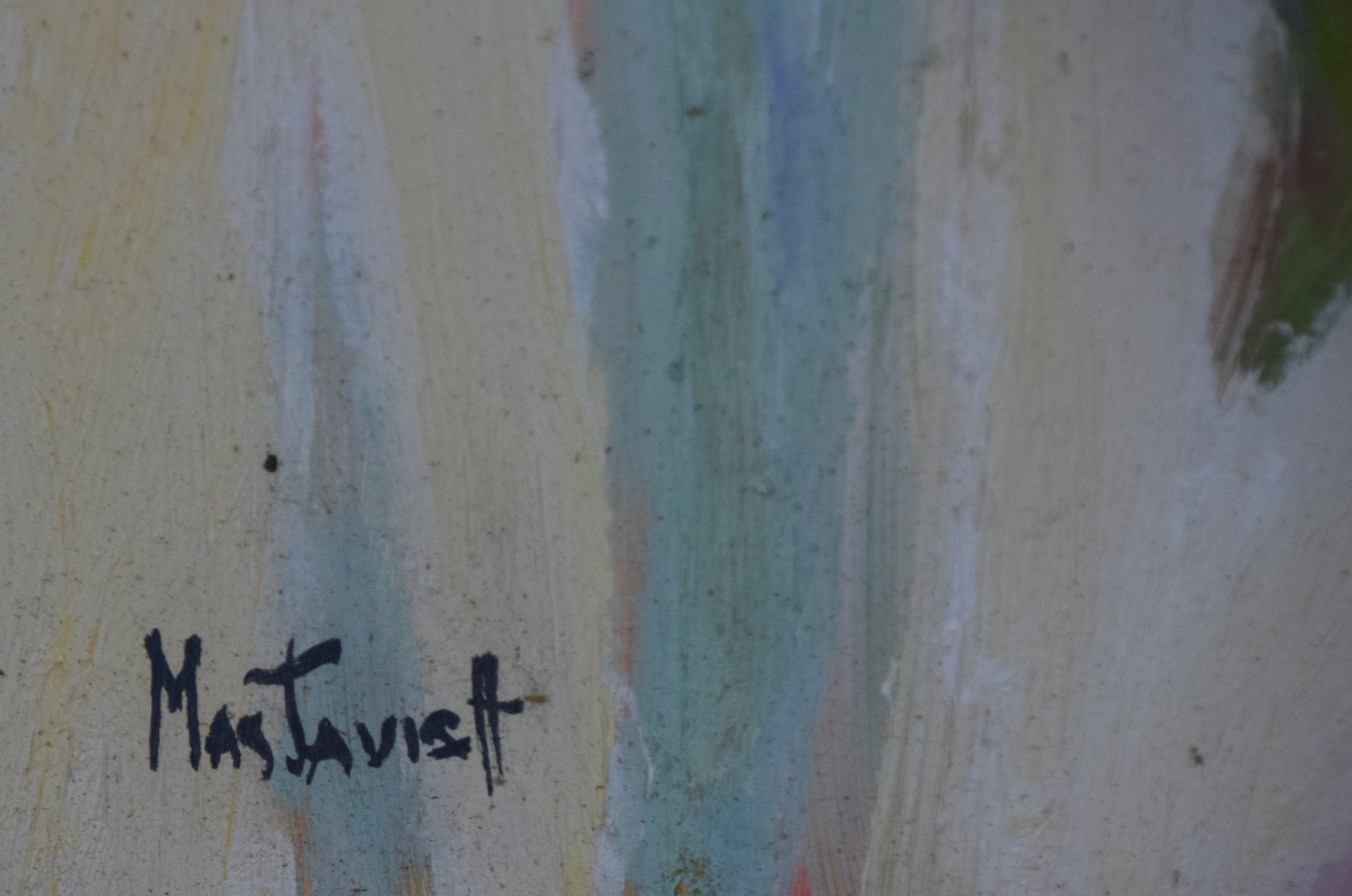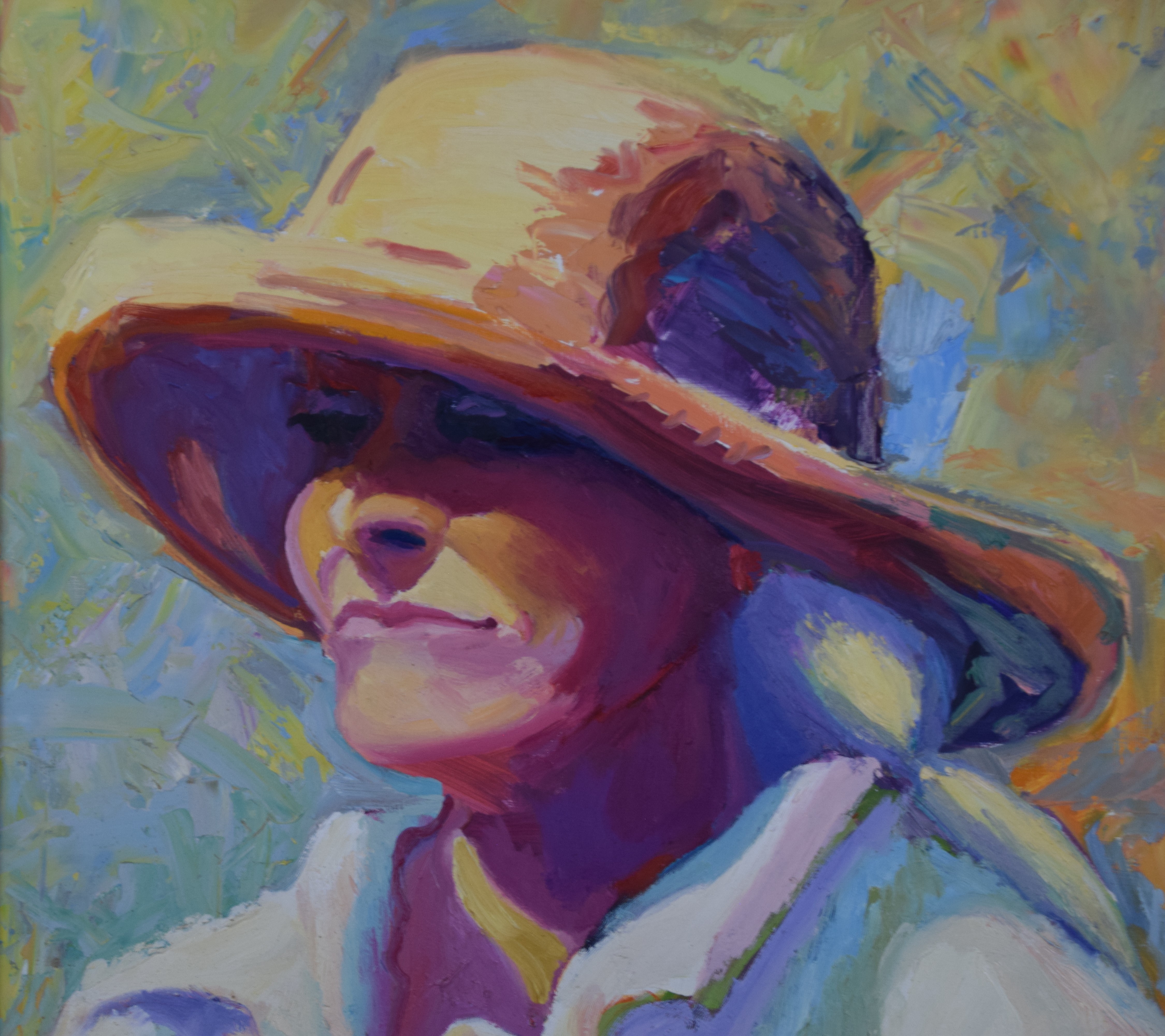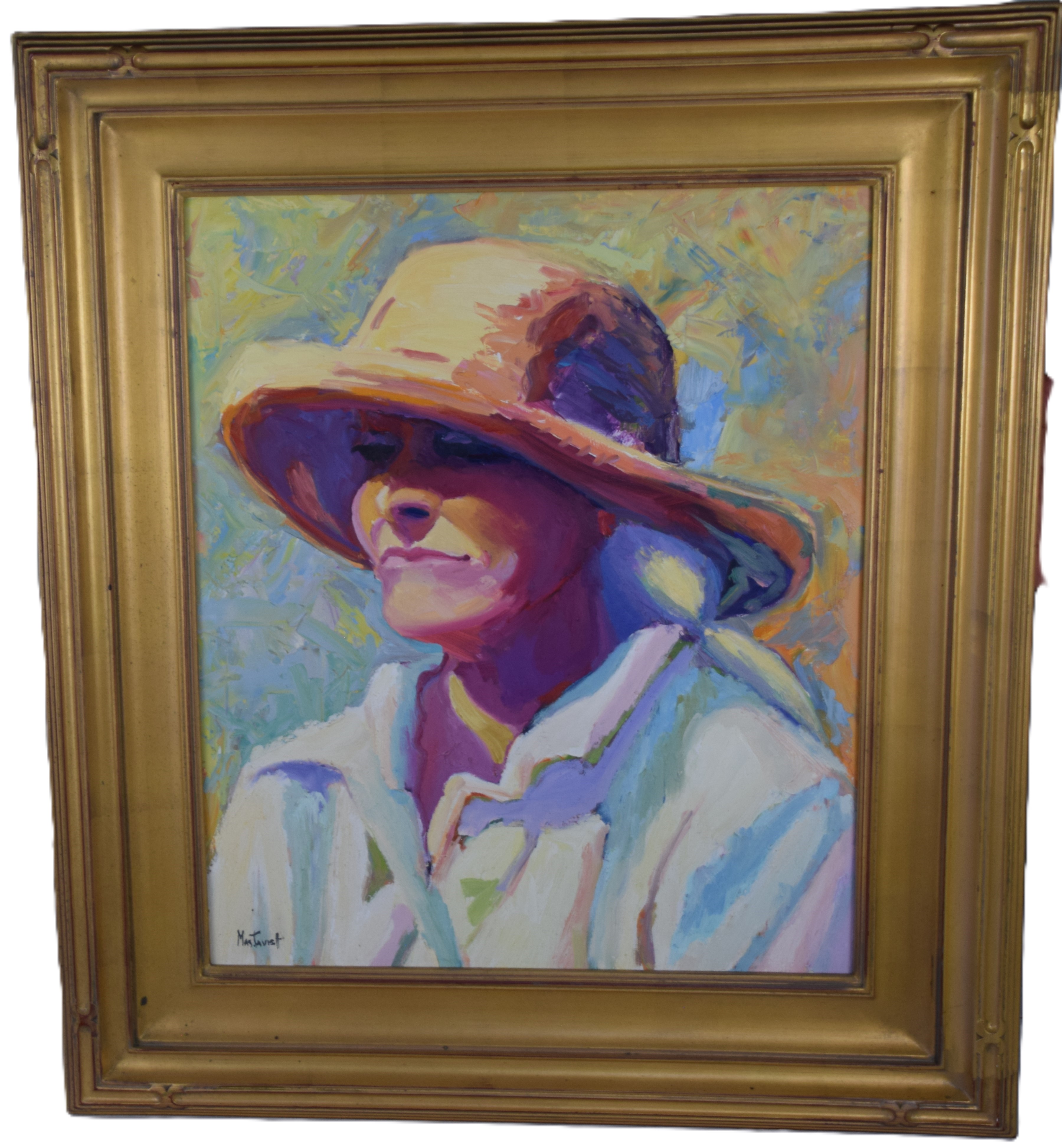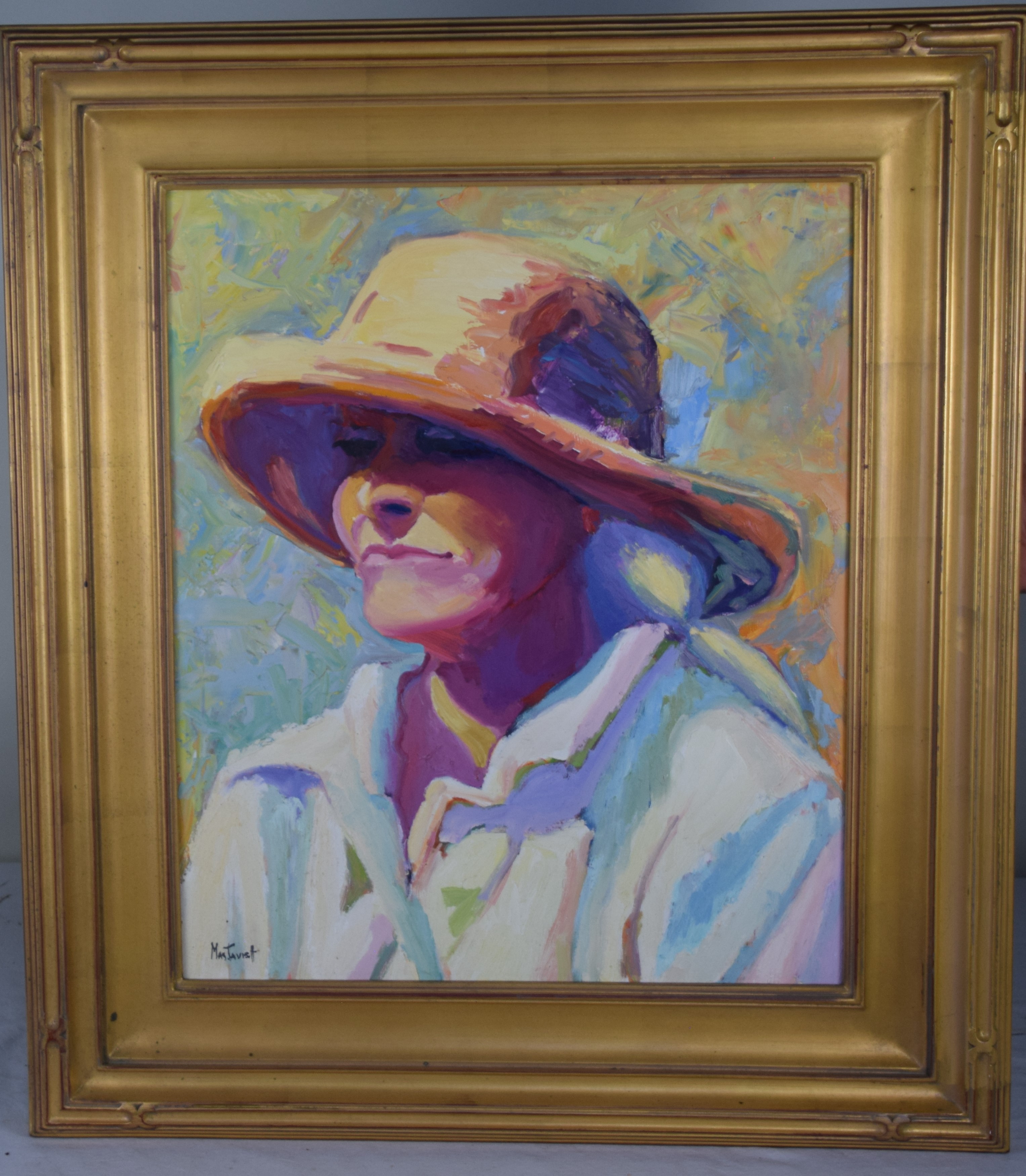 Oil on canvas painting of a Lady with hat, signed lower left-Mag Javiett, in an elegant gilt frame. Dimensions: 24″ x 19.5″ Image size