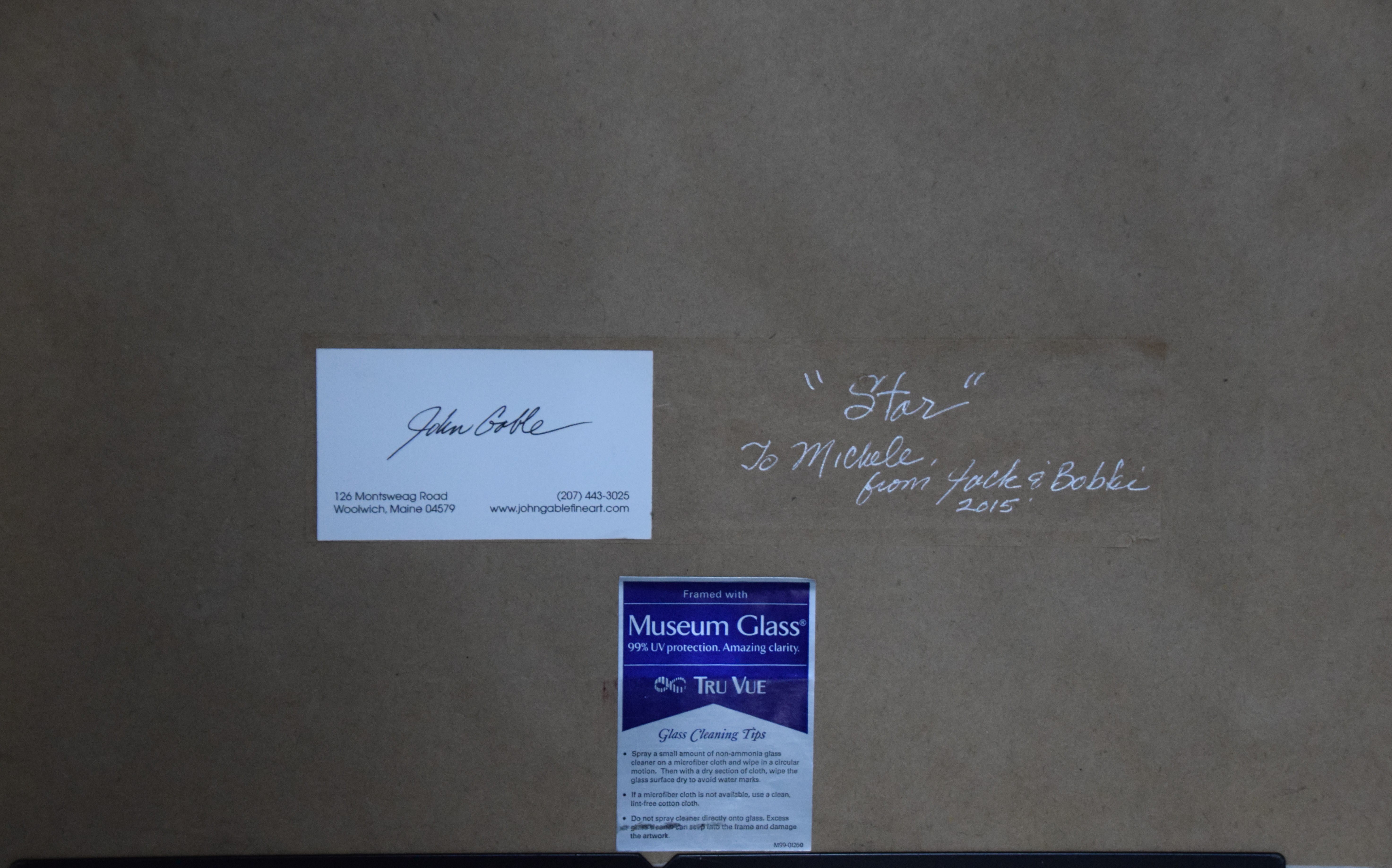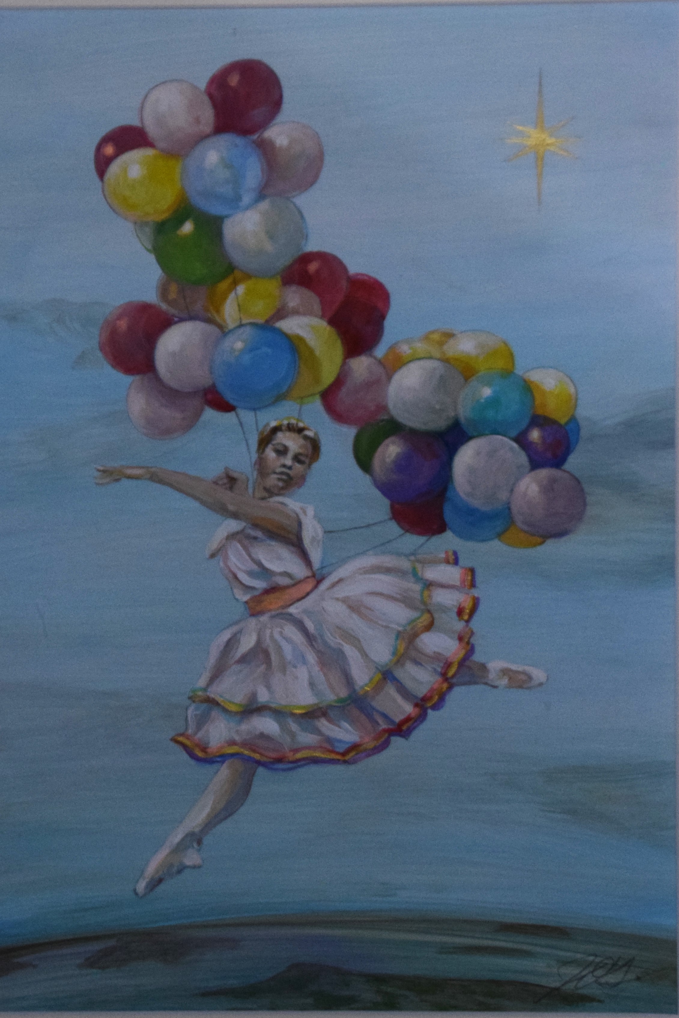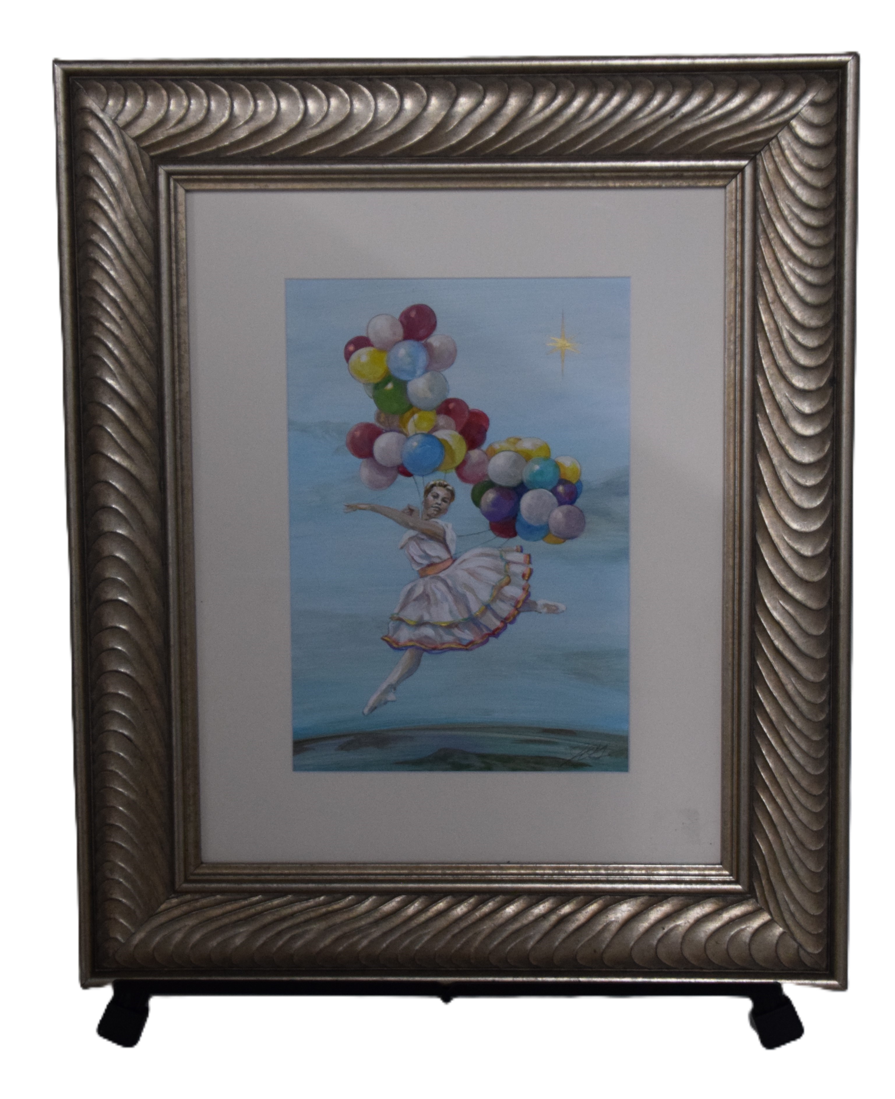 Framed watercolor of a ballet dancer with balloons, titled “Star”. John Gable (Born 1944) worked in Massachusetts and is known for portraits and landscapes. Dimensions: 10″ x 7″ Image size