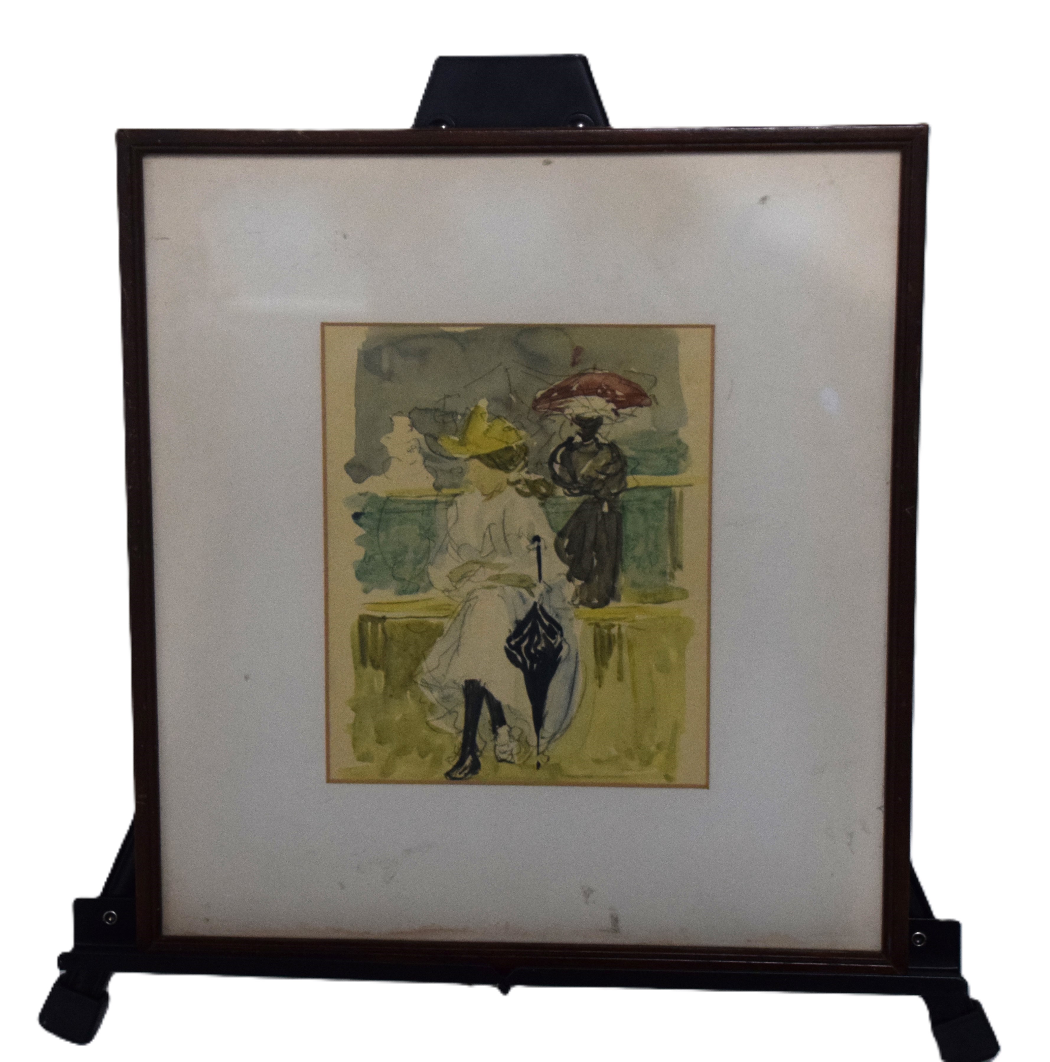 Framed watercolor of two fashionable ladies. Dimensions: 7″ x 5 3/4″ Image size