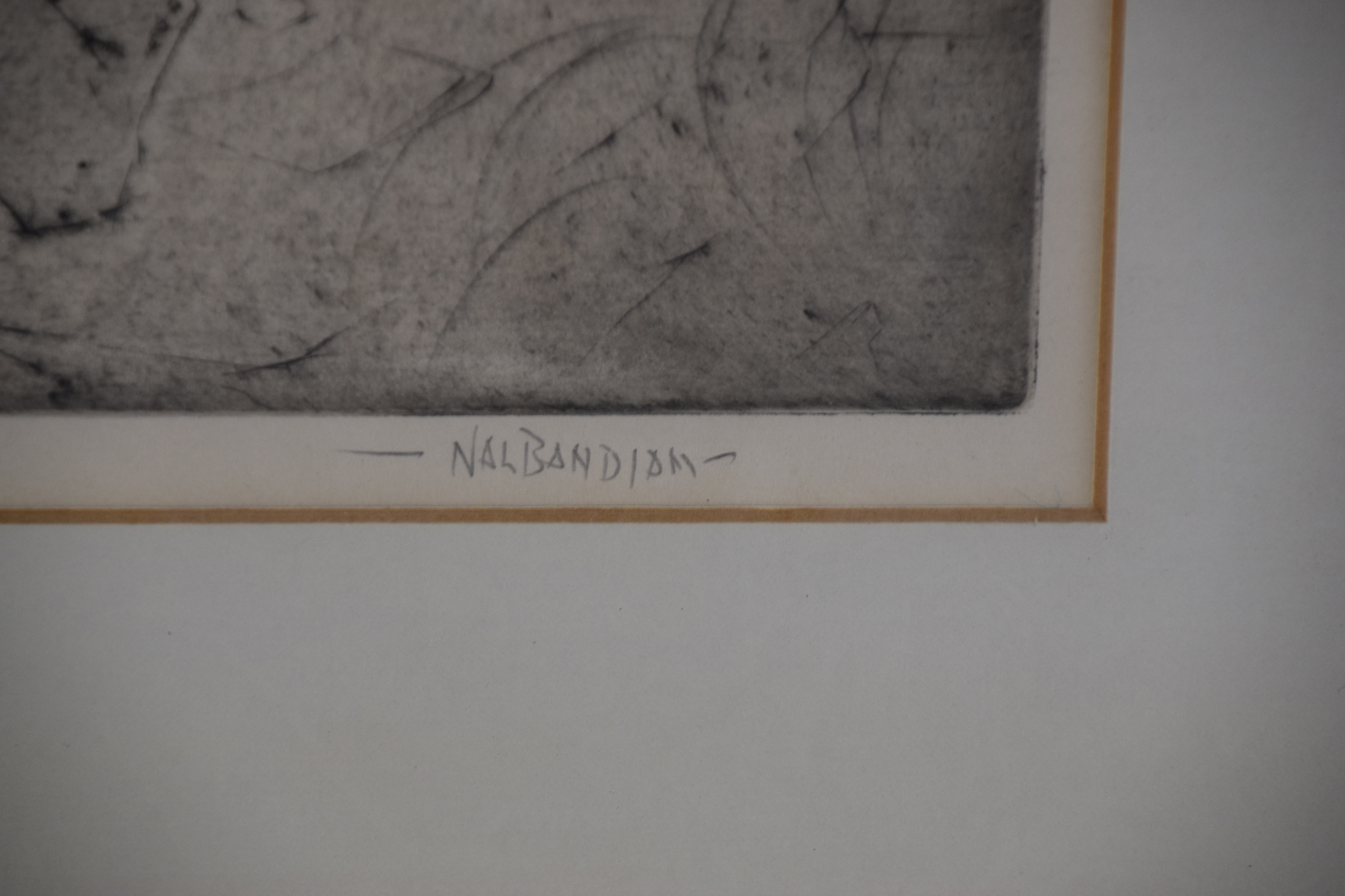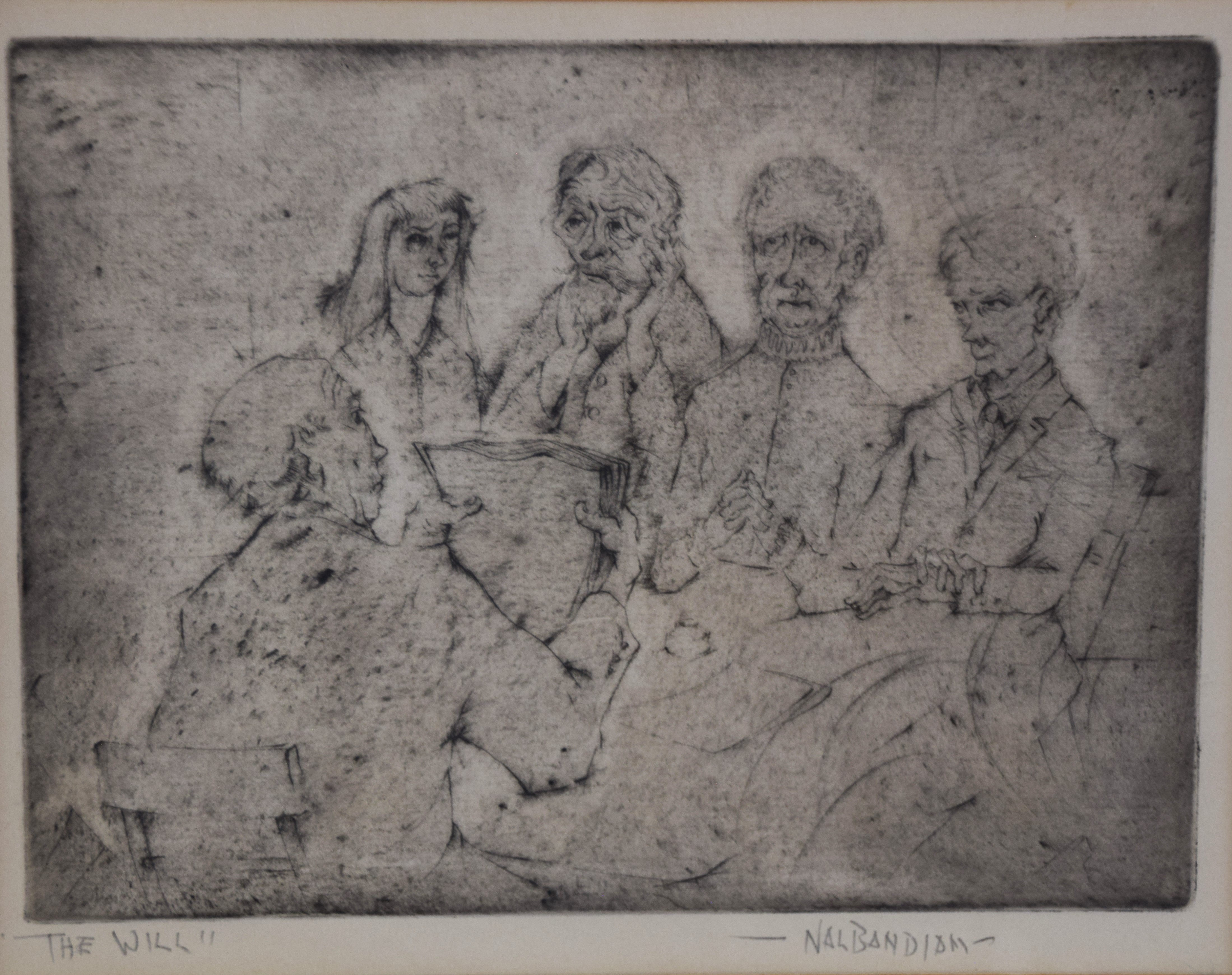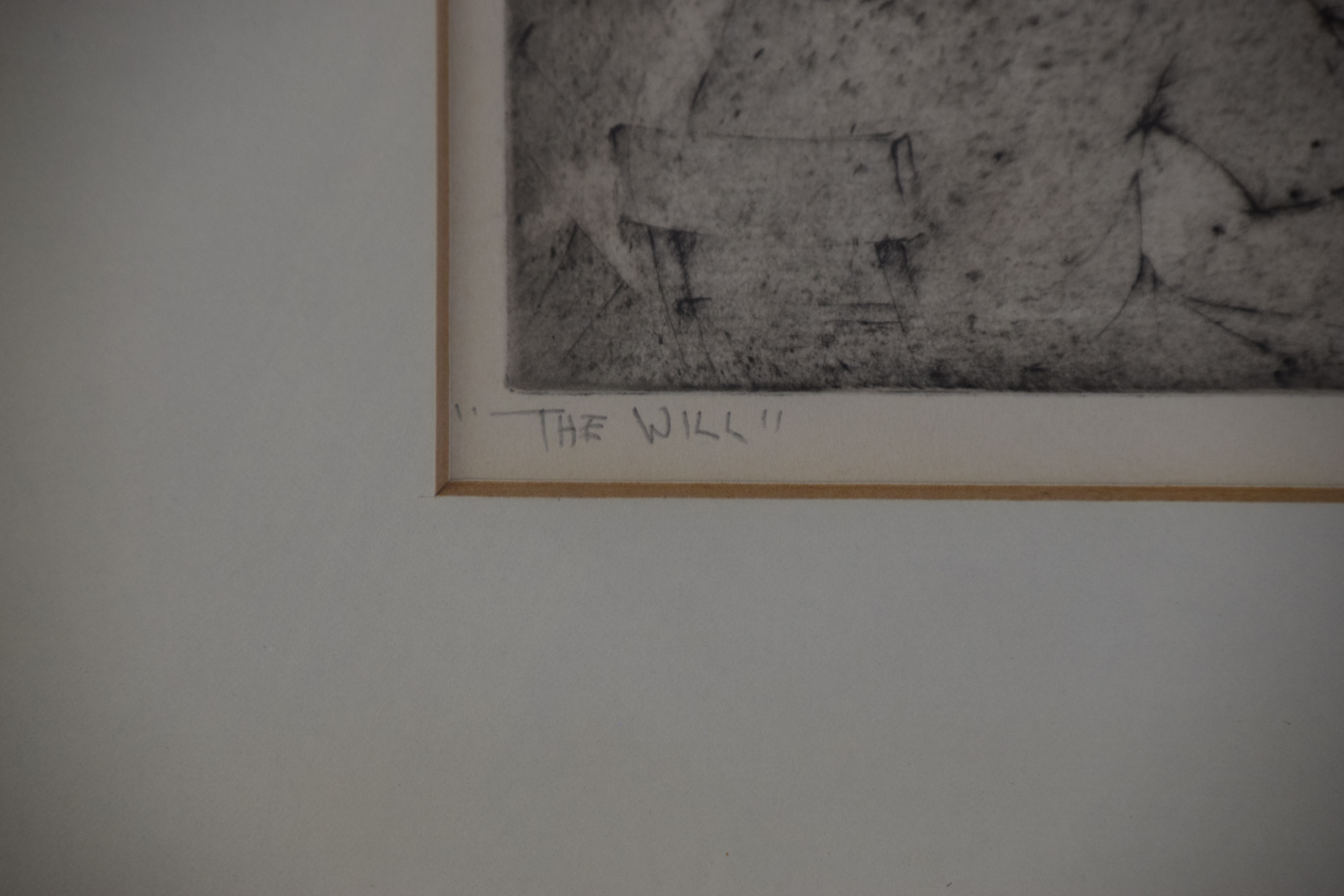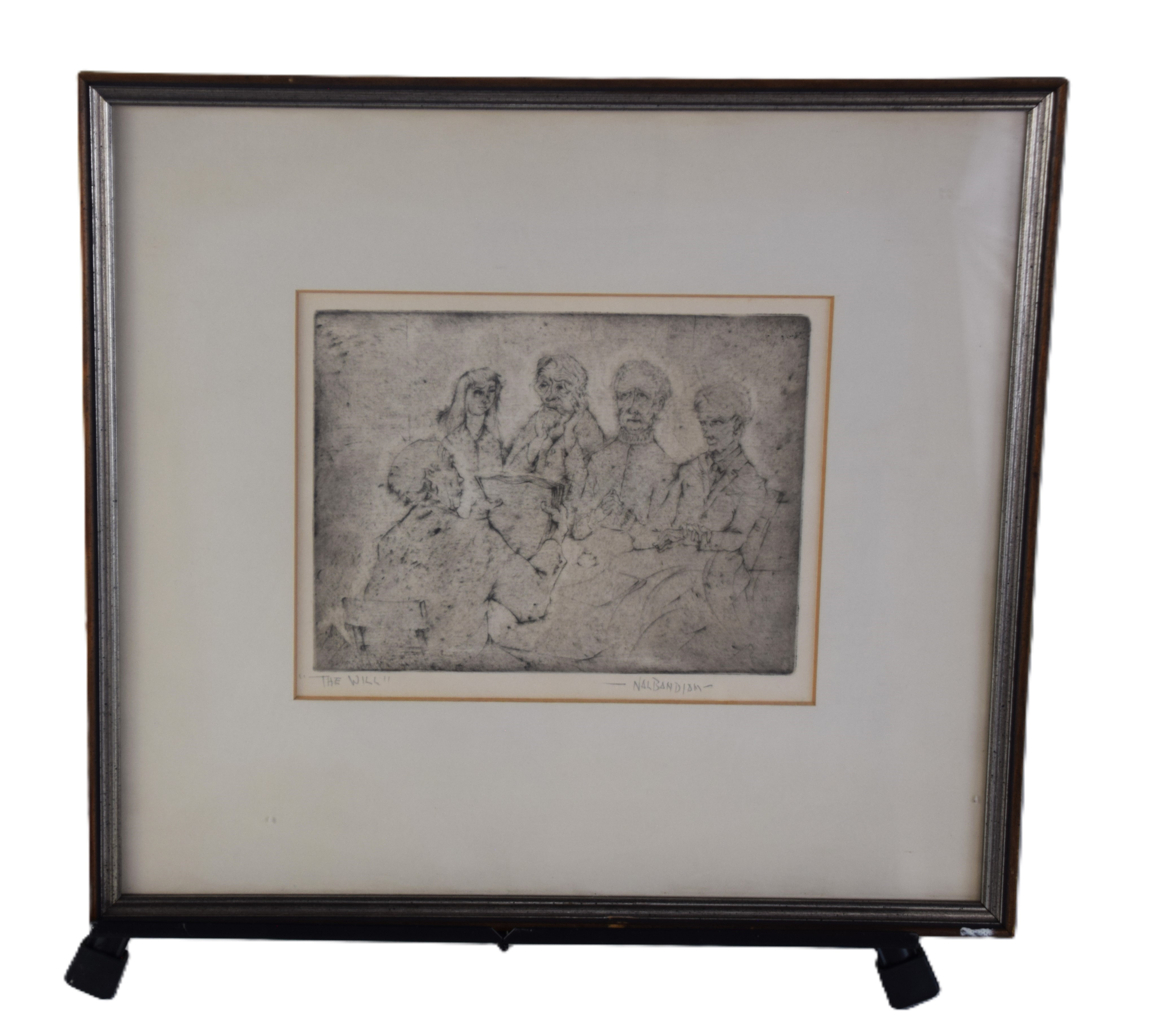 A drawing/etching titled “The Will” , signed Nalbandian. Karnig Nalbandian (Born 1916) worked in Rhode Island and is known for etchings. Dimensions: 6″ x 8″
