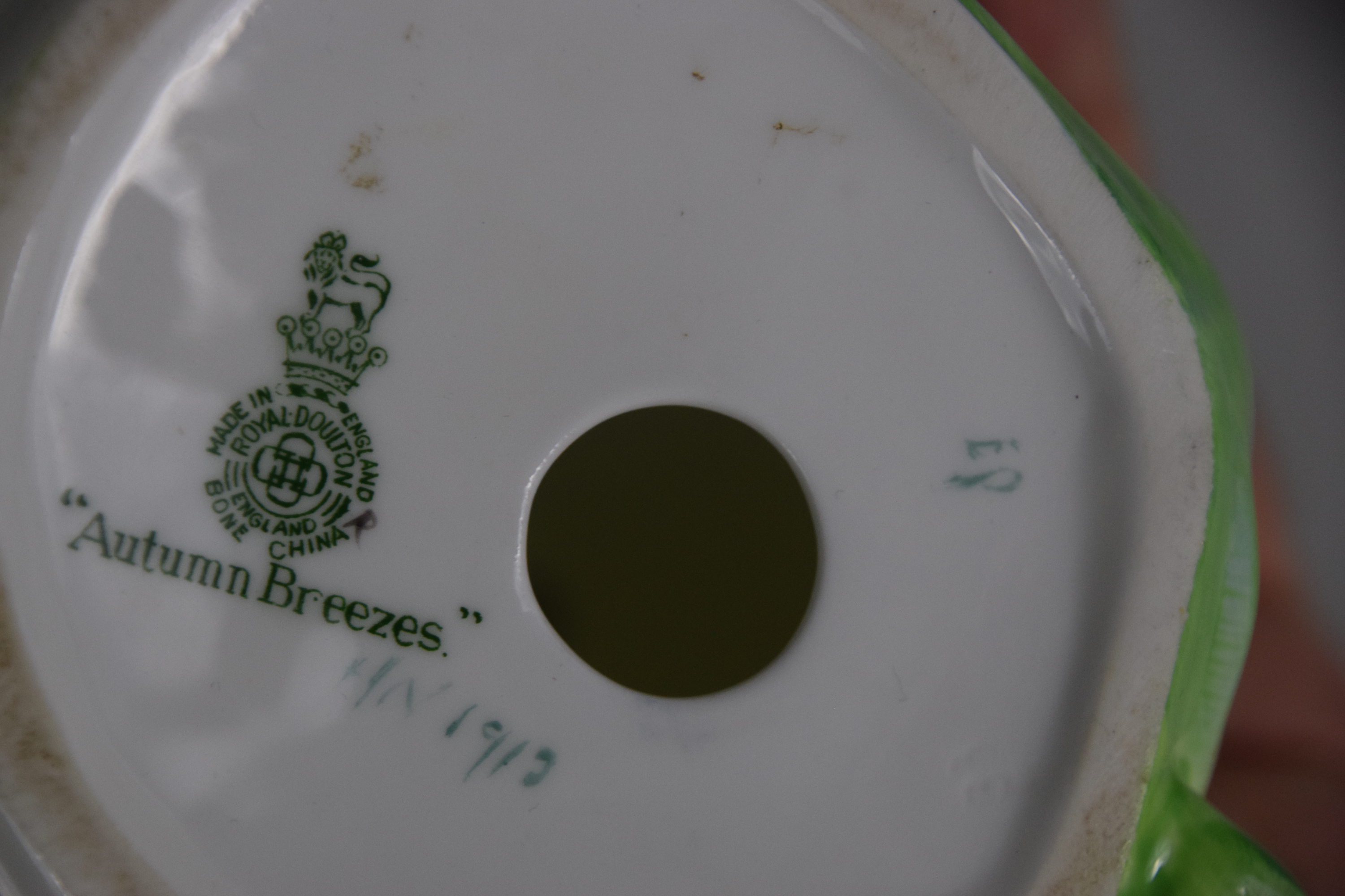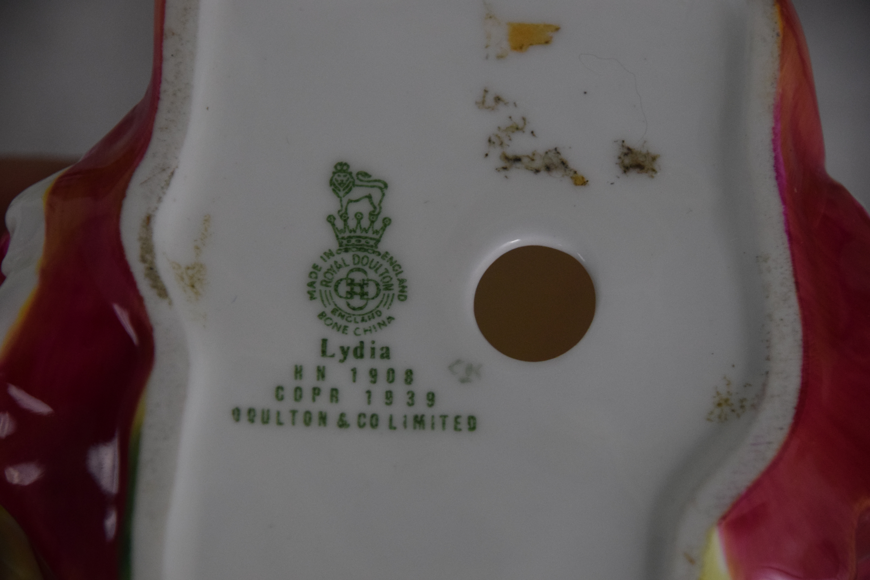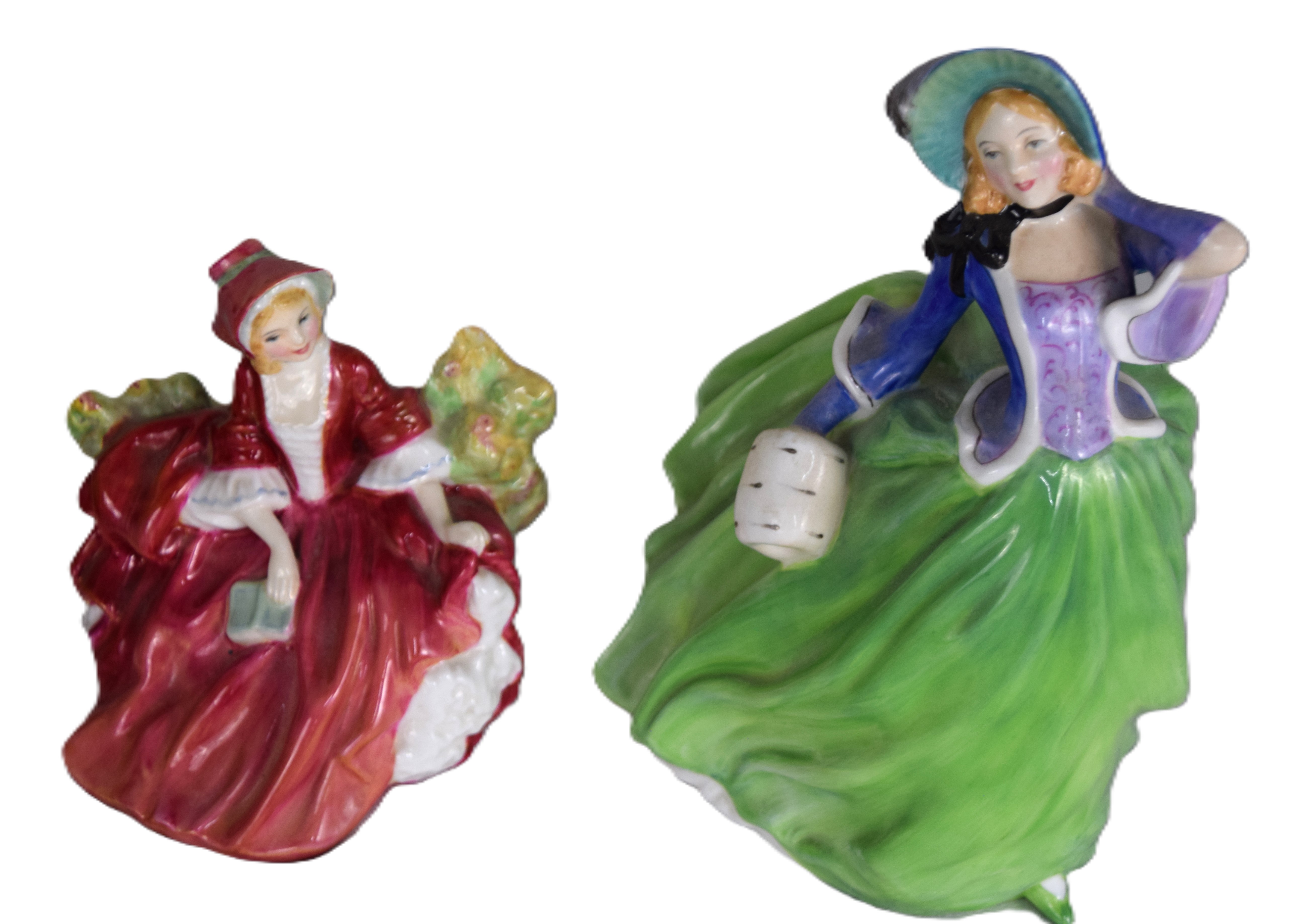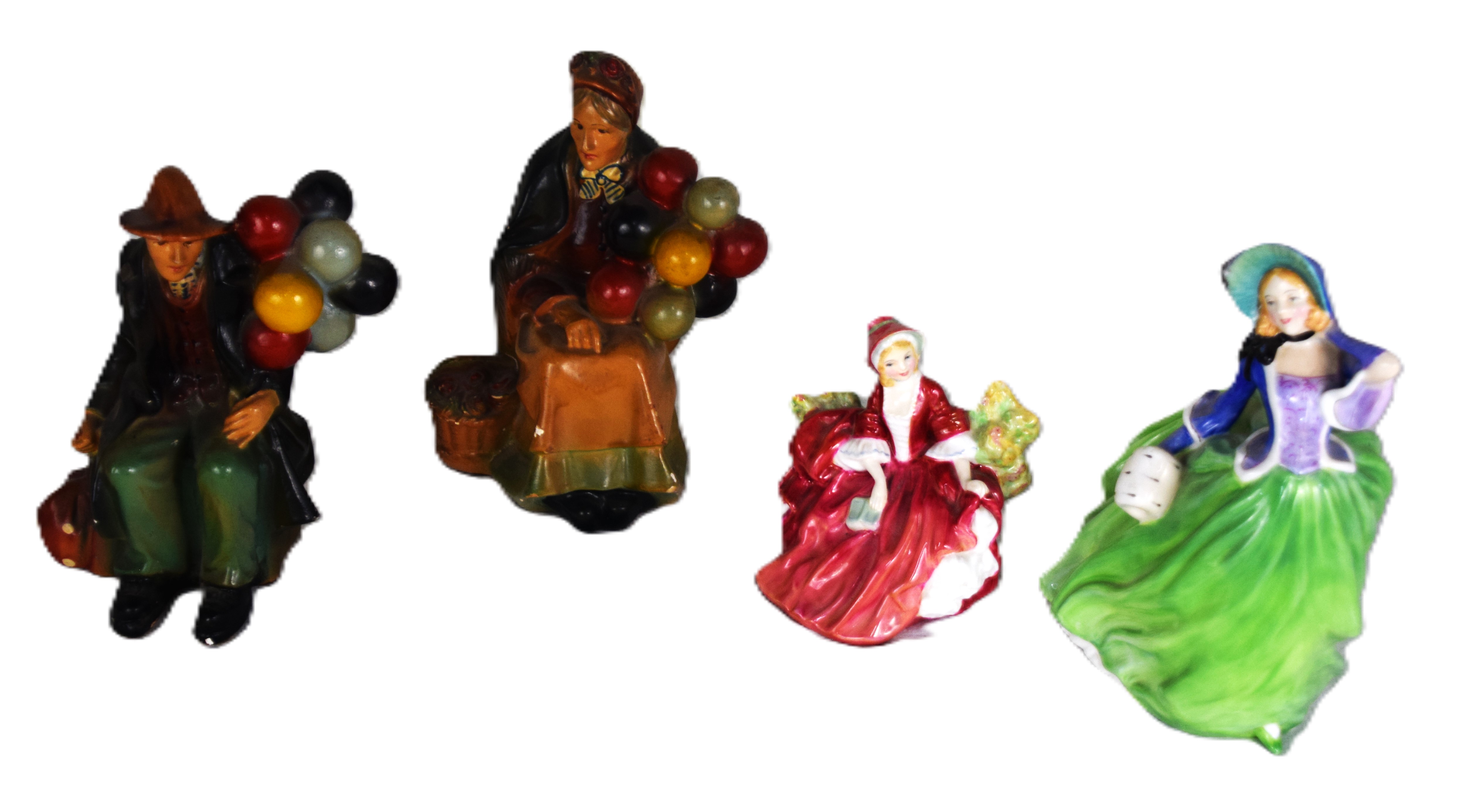 Two Royal Doulton figurines including “Lydia (5” H ) and “Autumn Breezer” (8″ H ). Also included are two figures-The Saloon Lady and Balloon Man (8.5″ H)