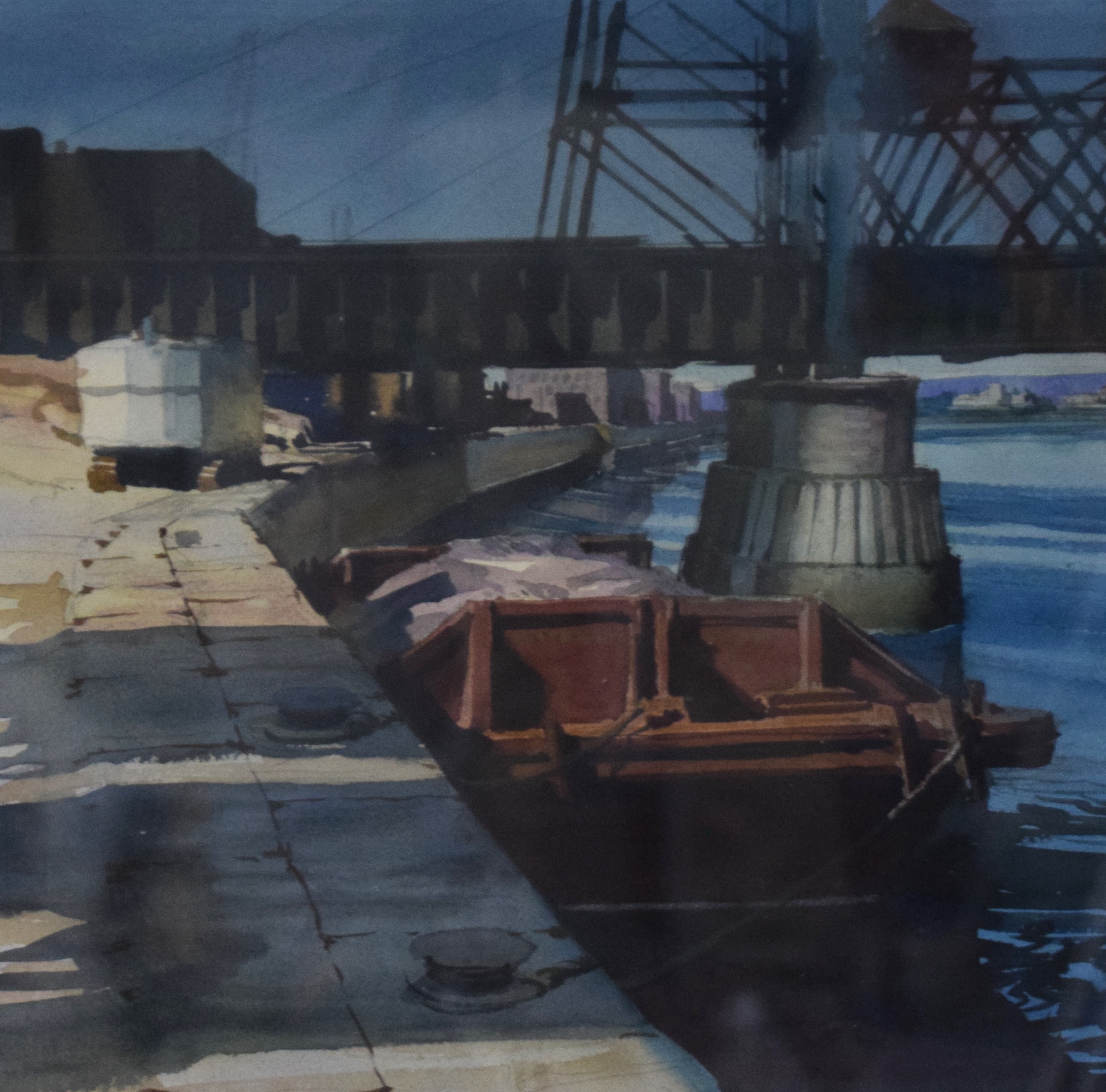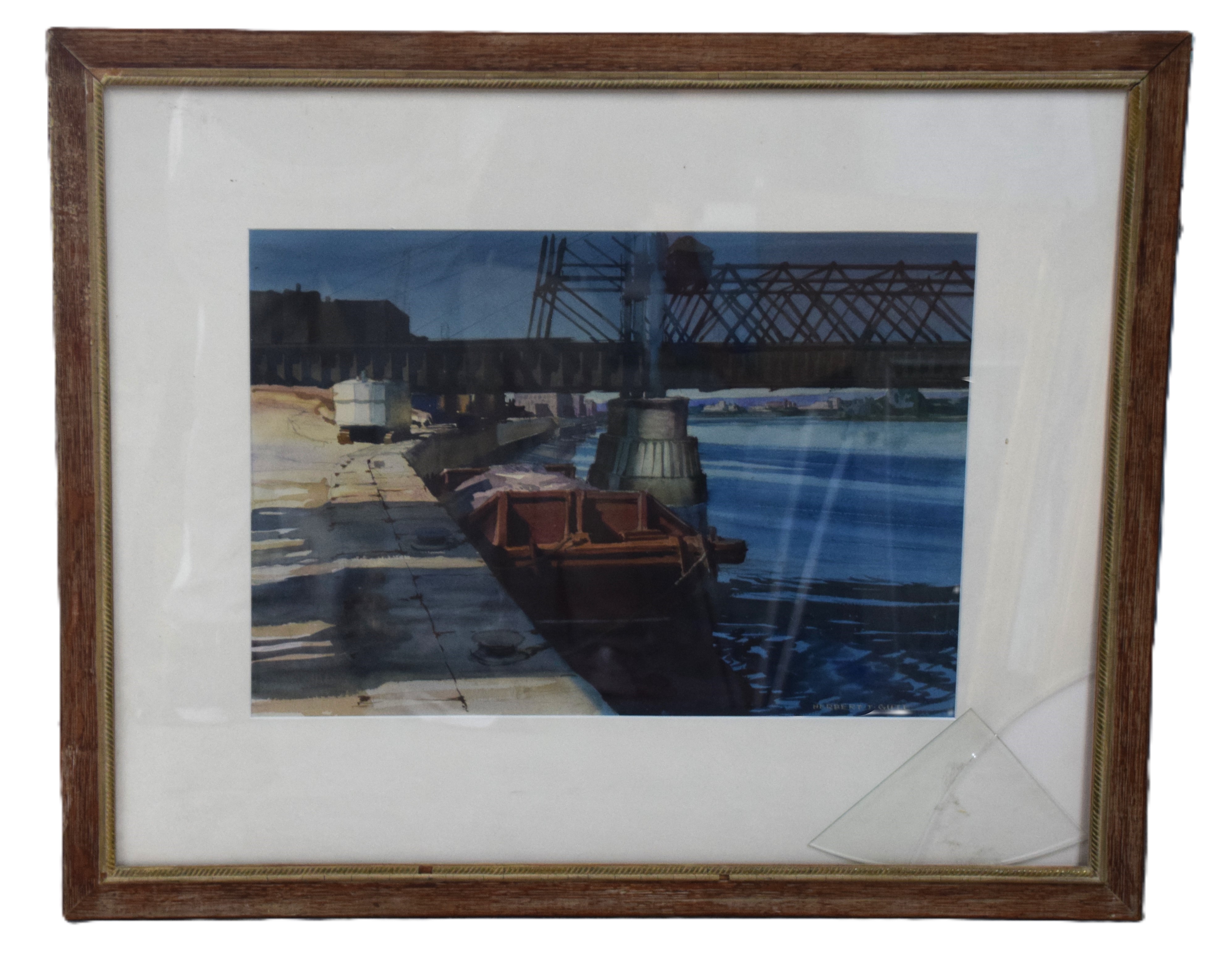 Nice watercolor of an industrial scene with a bridge, barge and wharf by Herbert Gute. Herbert Jacob Gute (1907 – 1977) was worked in Connecticut and is known for Illustration, genre and sea-landscape watercolor paintings. Dimensions: 13″ x 25″
