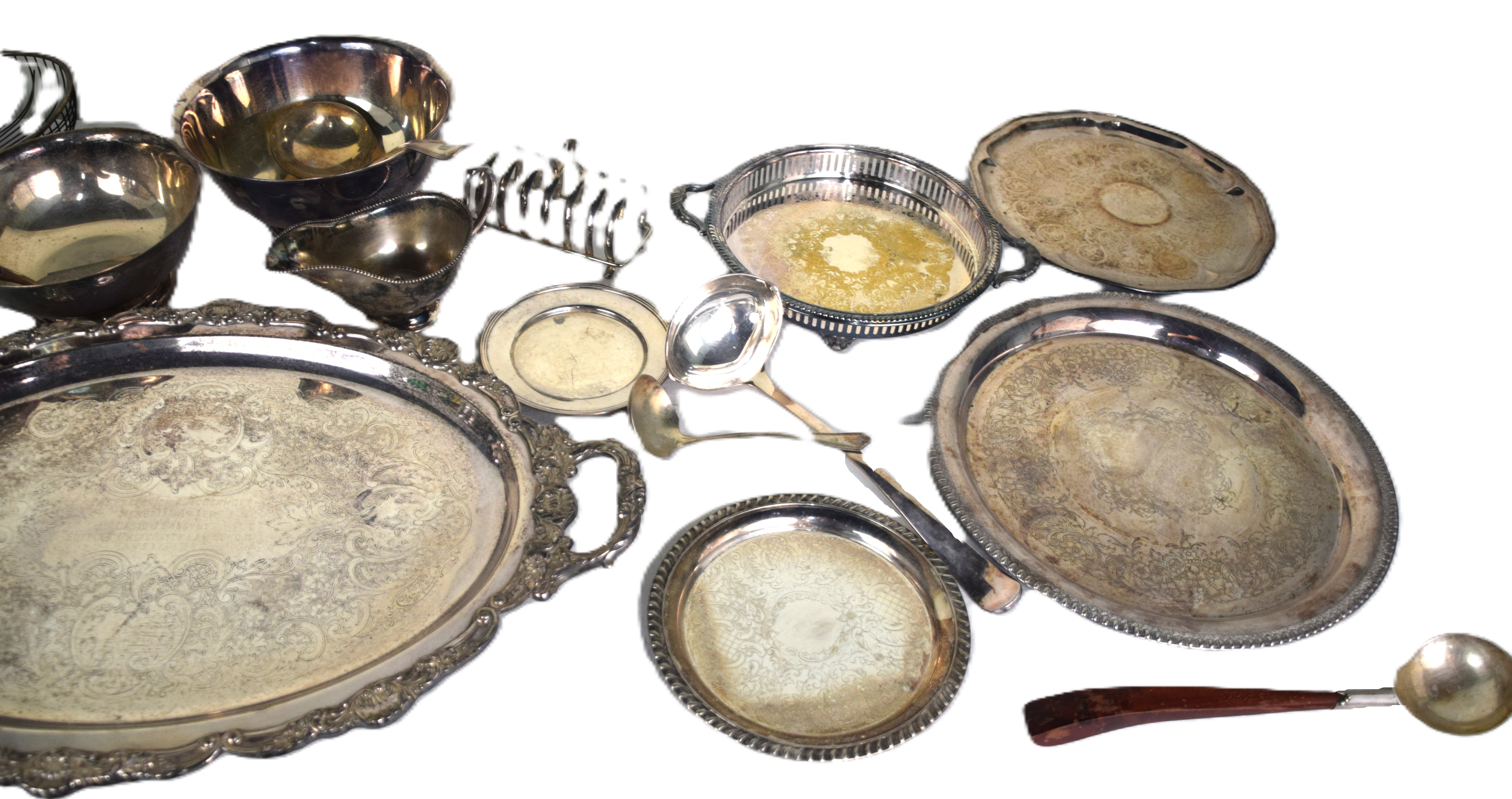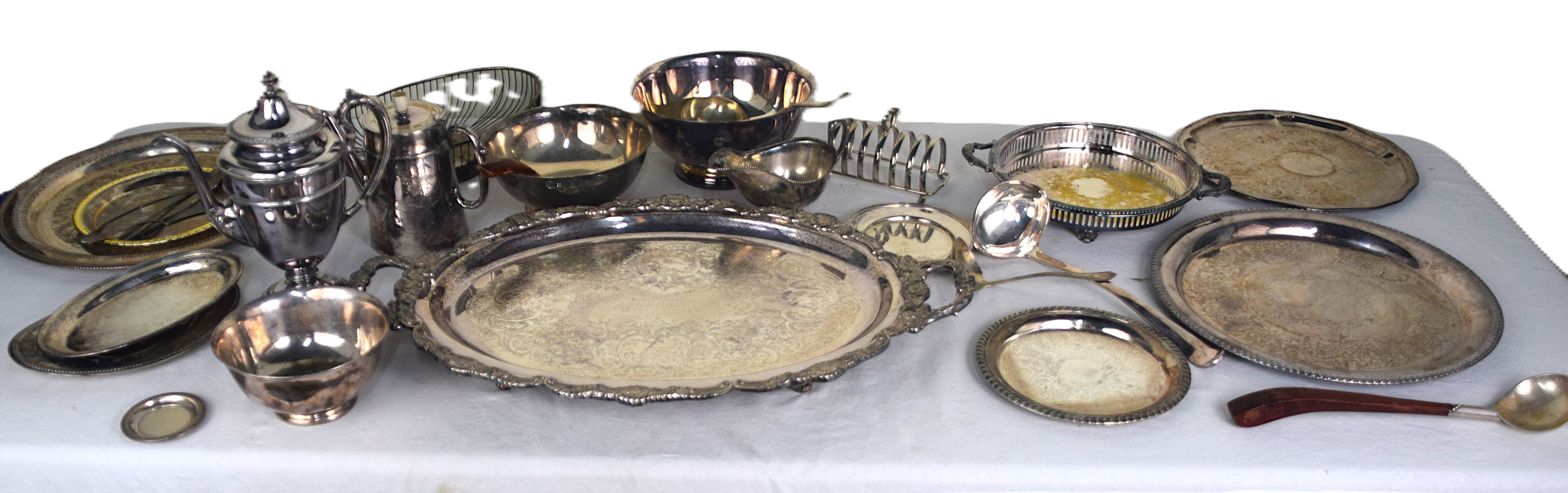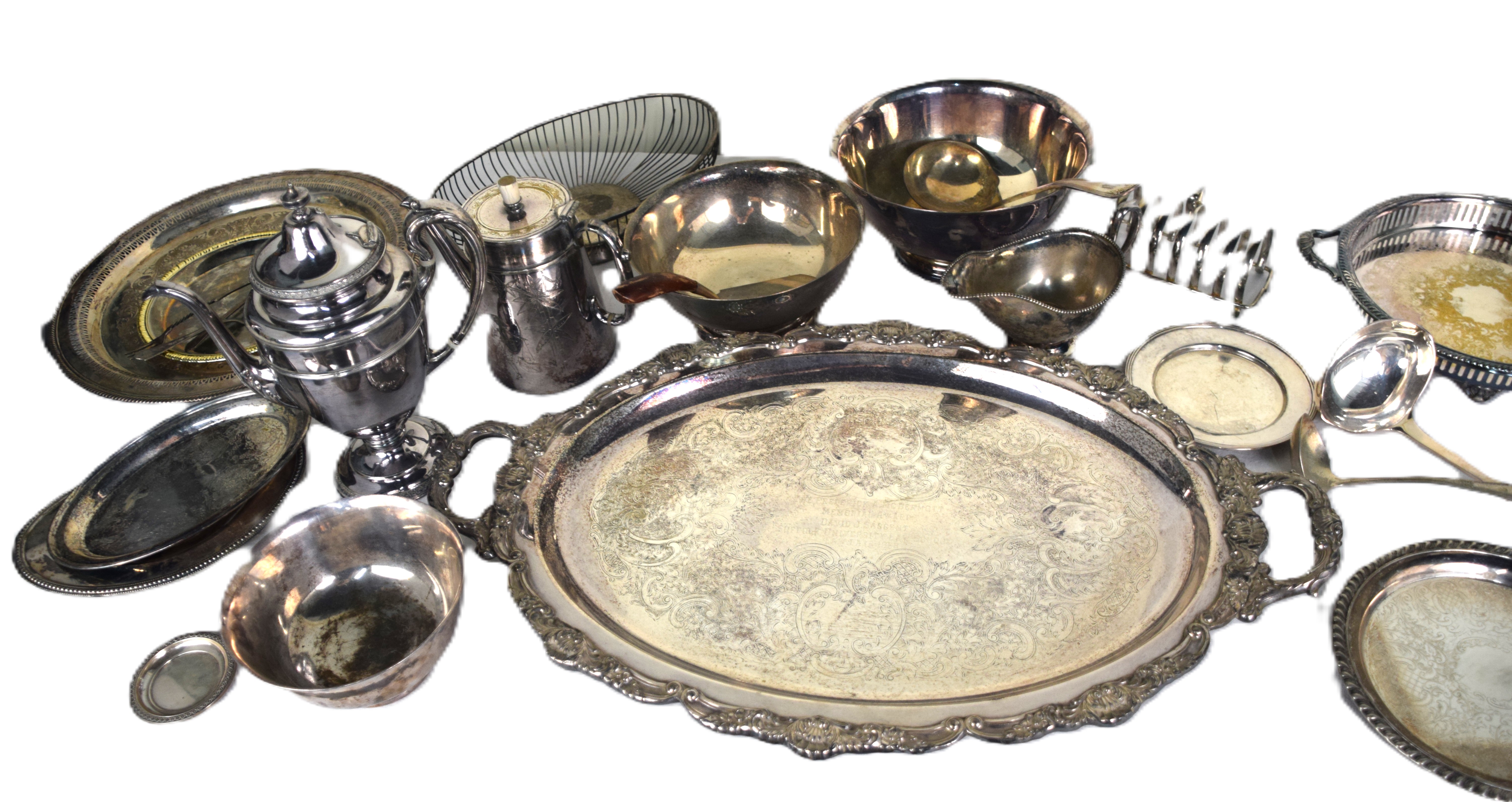 Large lot of silver plated tableware to include a large tray, other trays, bowls, ladles, wired basket, etc. all in various sizes
