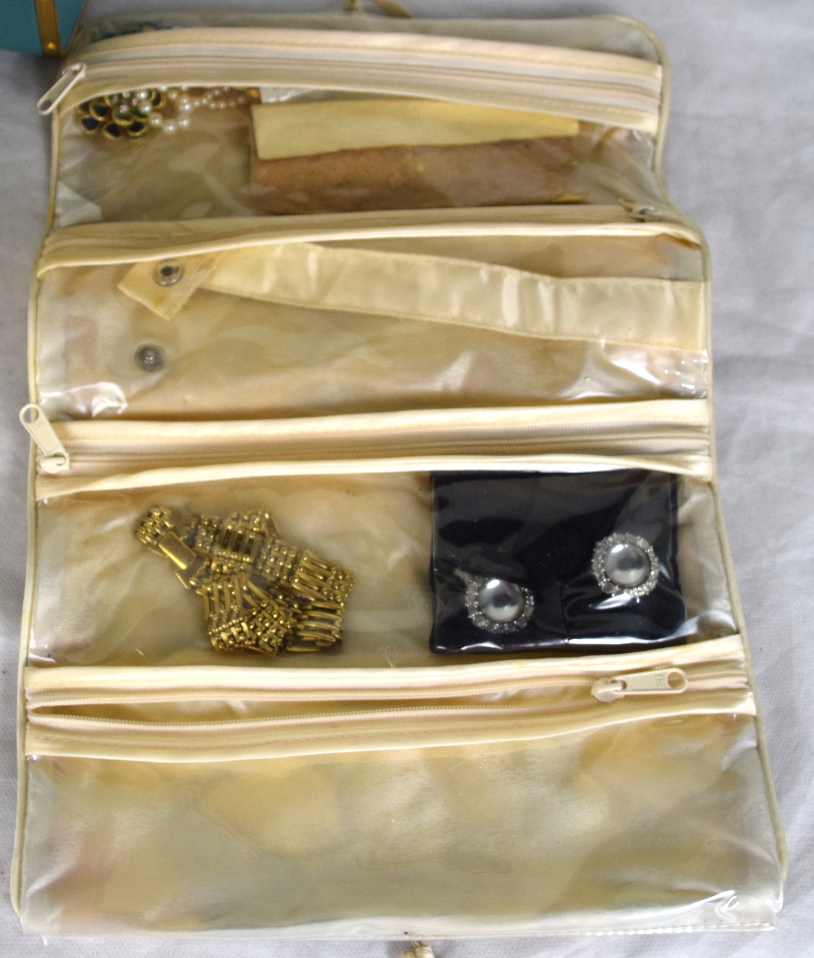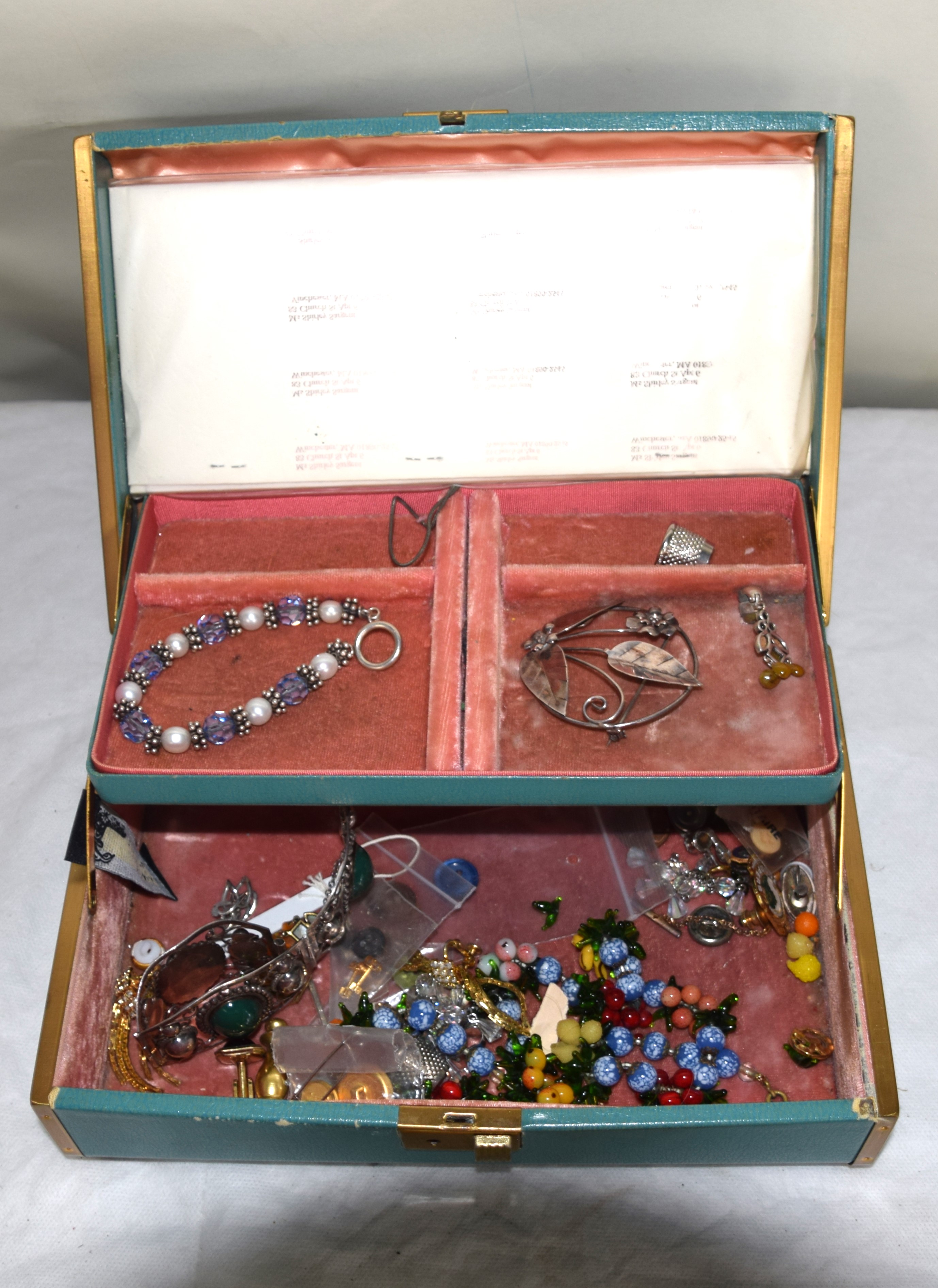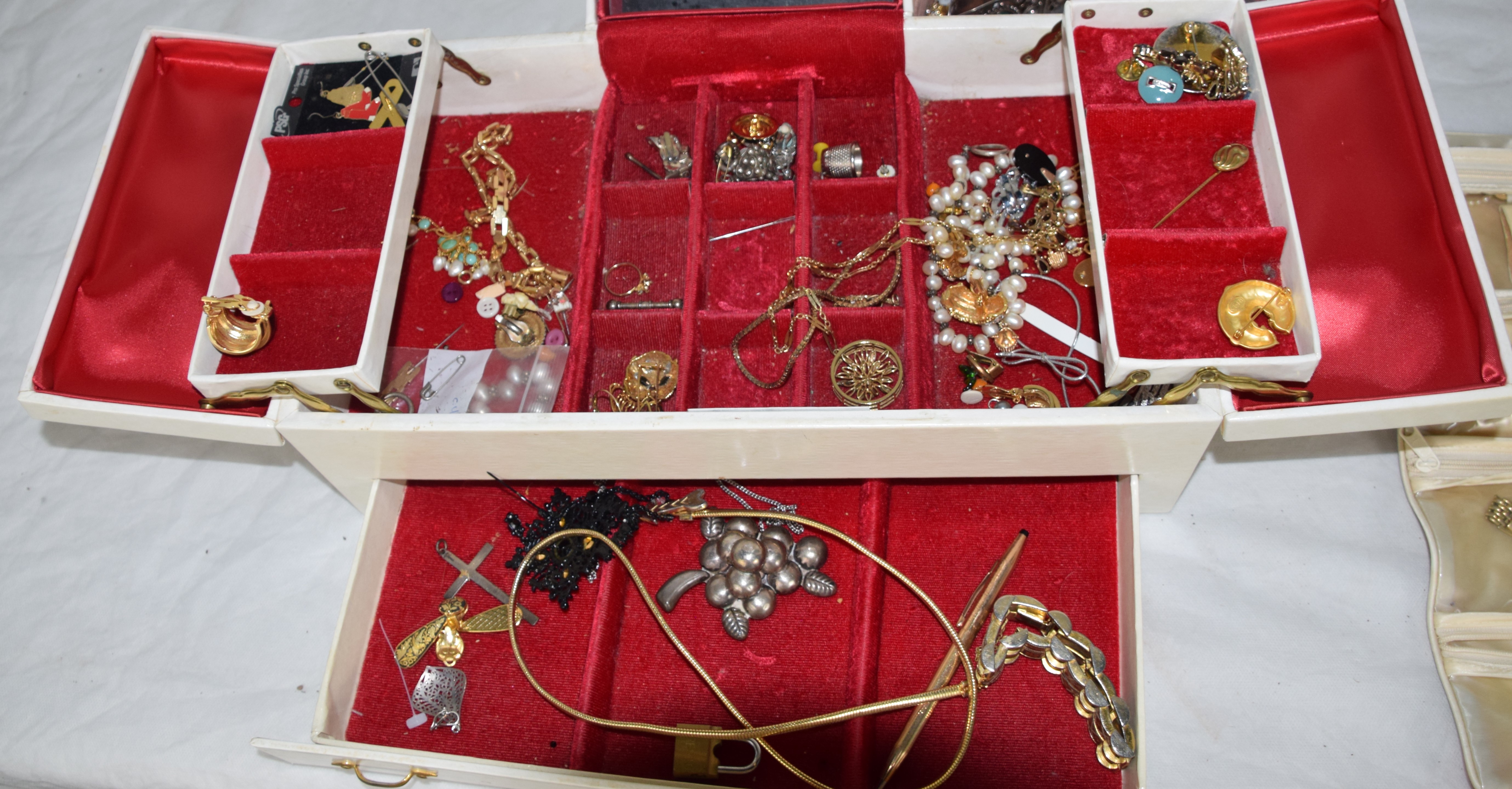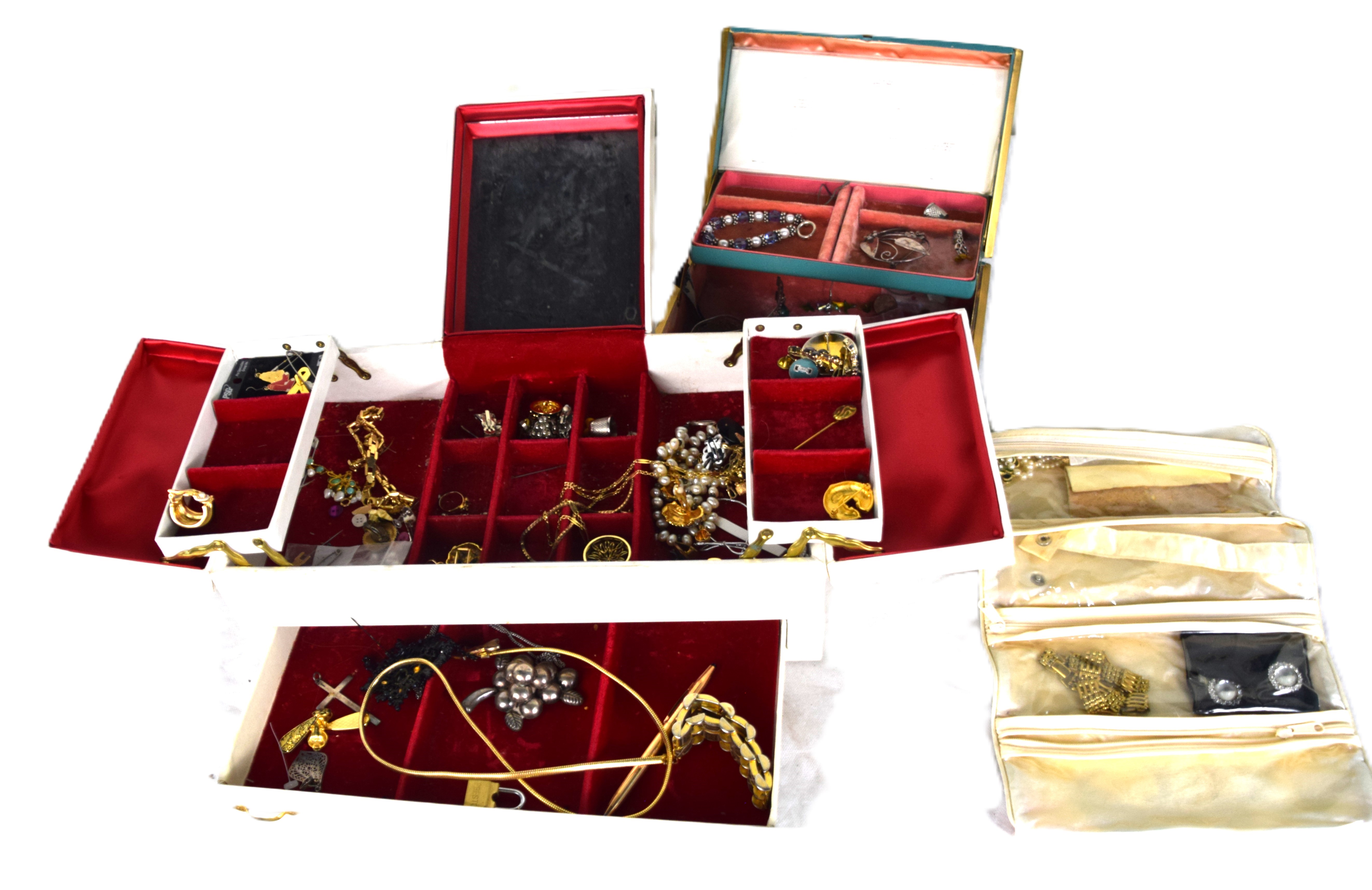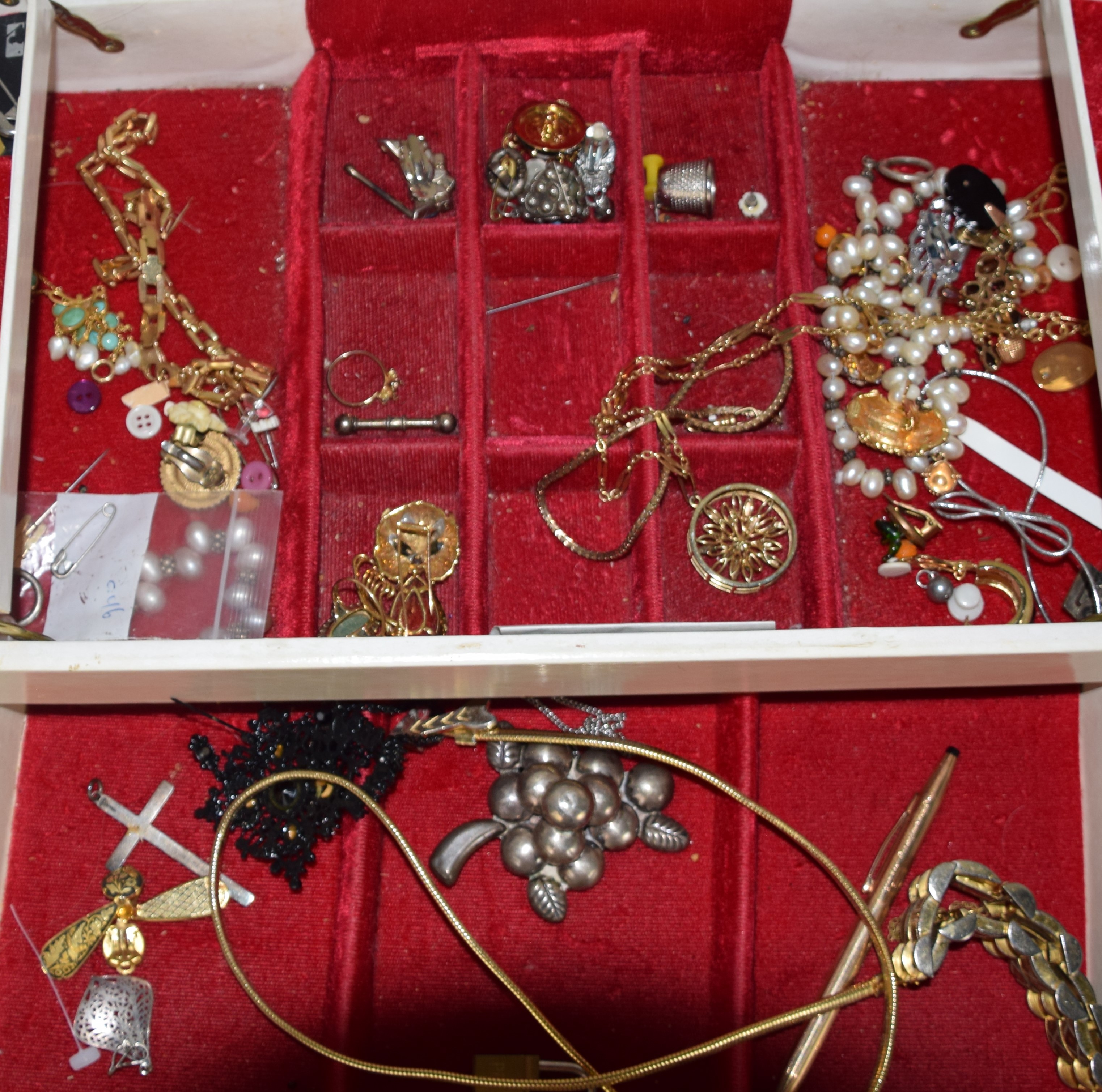 Large collection of vintage costume jewelry including sterling silver bracelet, pins, rings, pendants, gold cross pen and more. Provenance: David Sargent collection, New London, NH