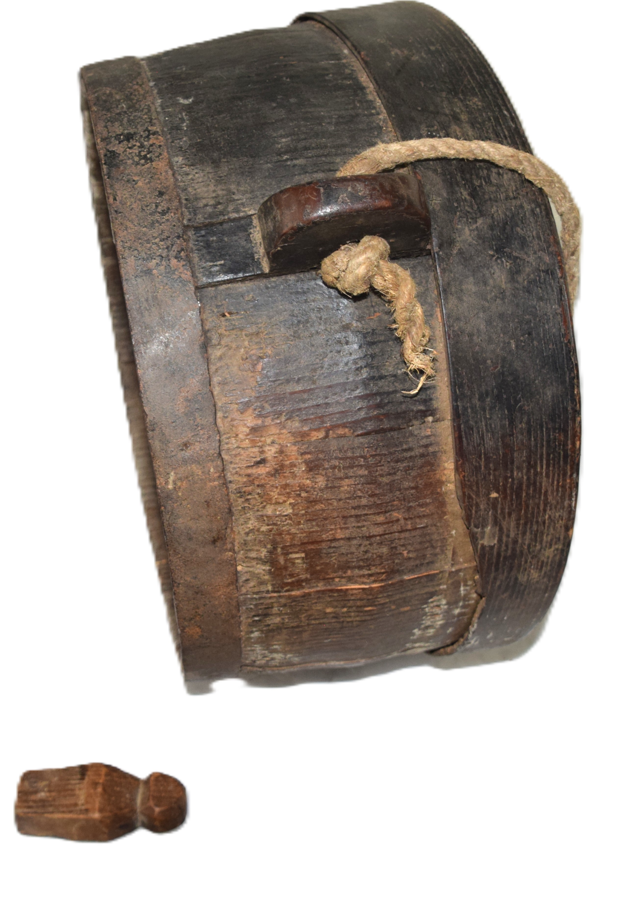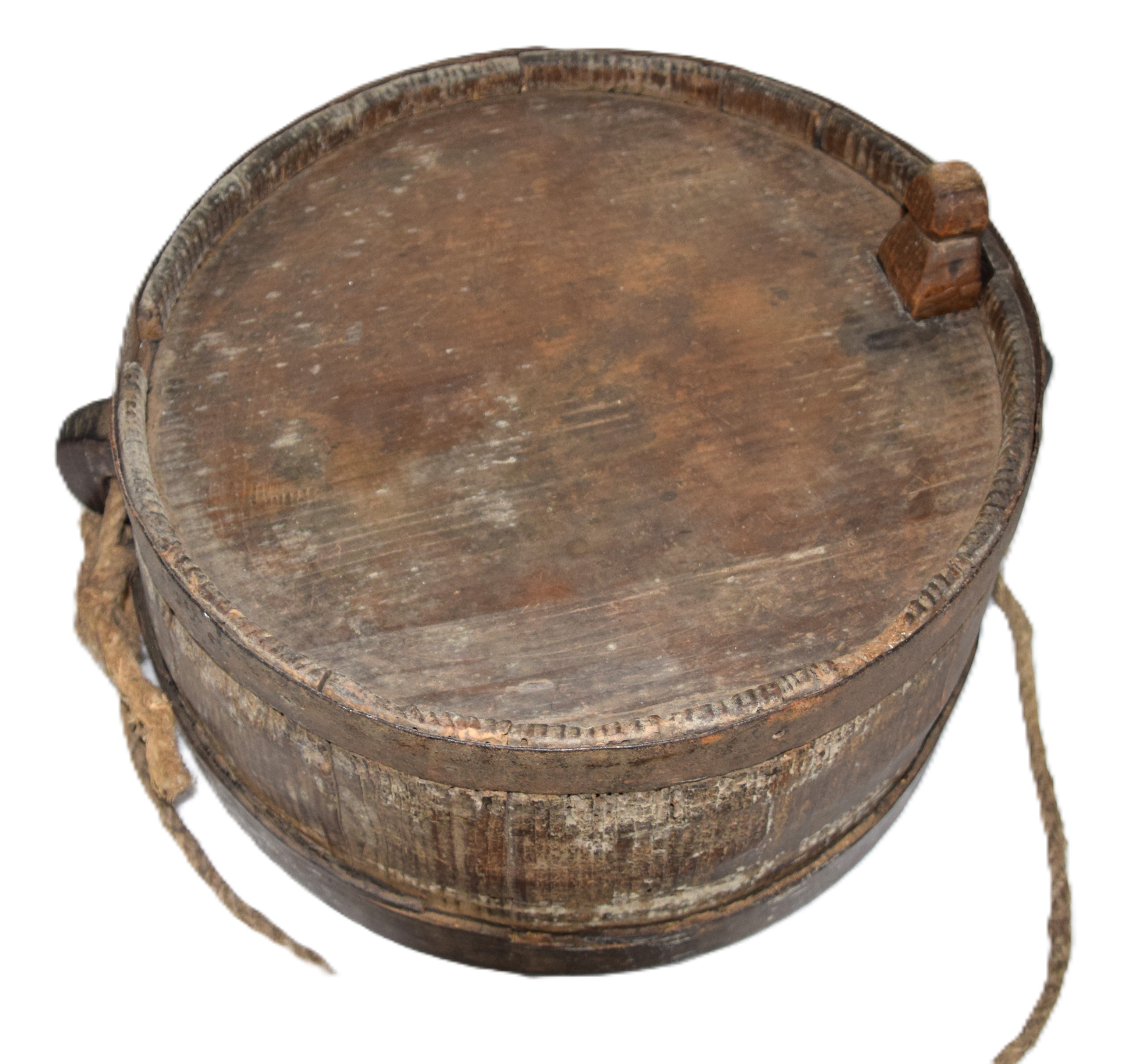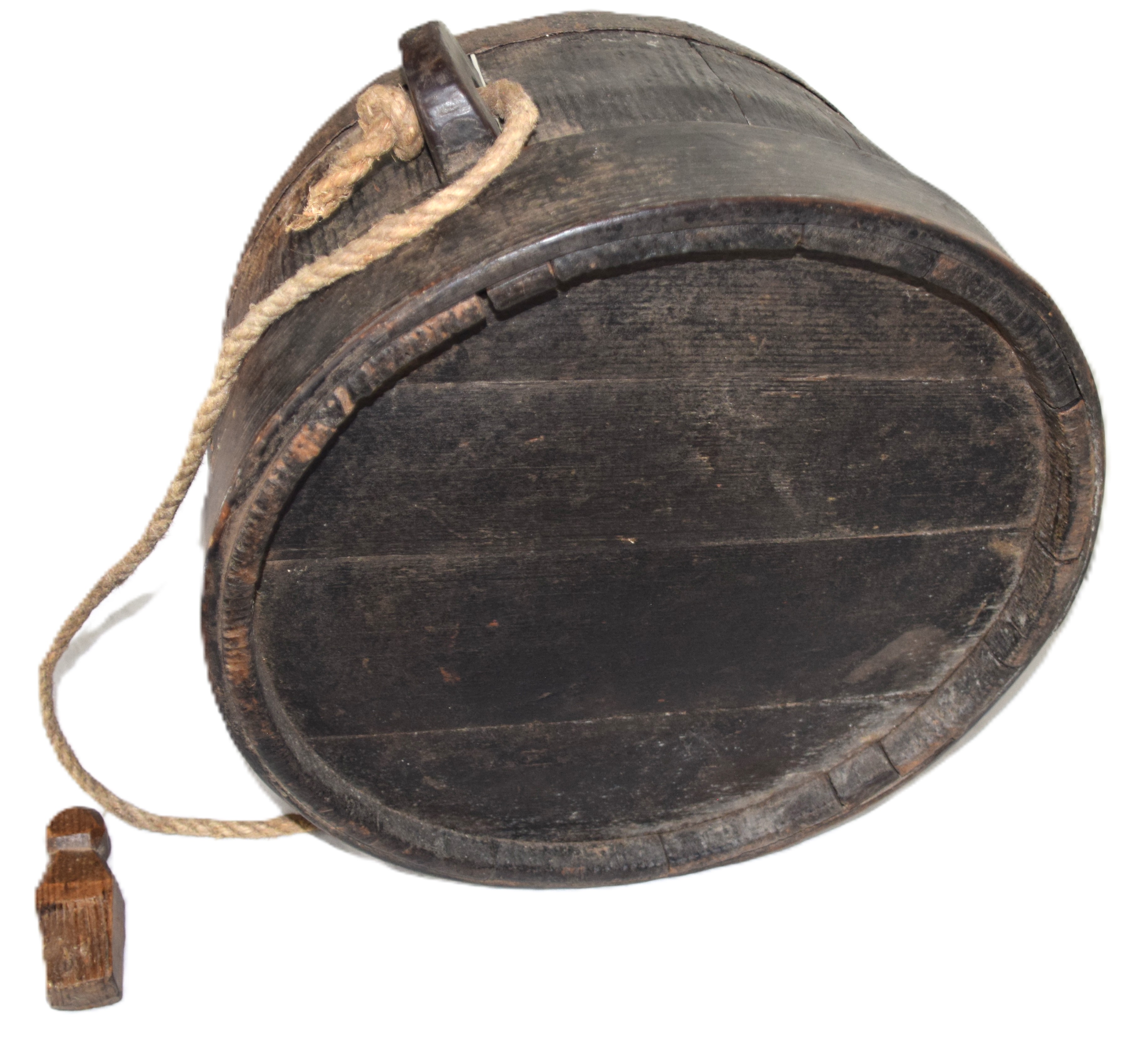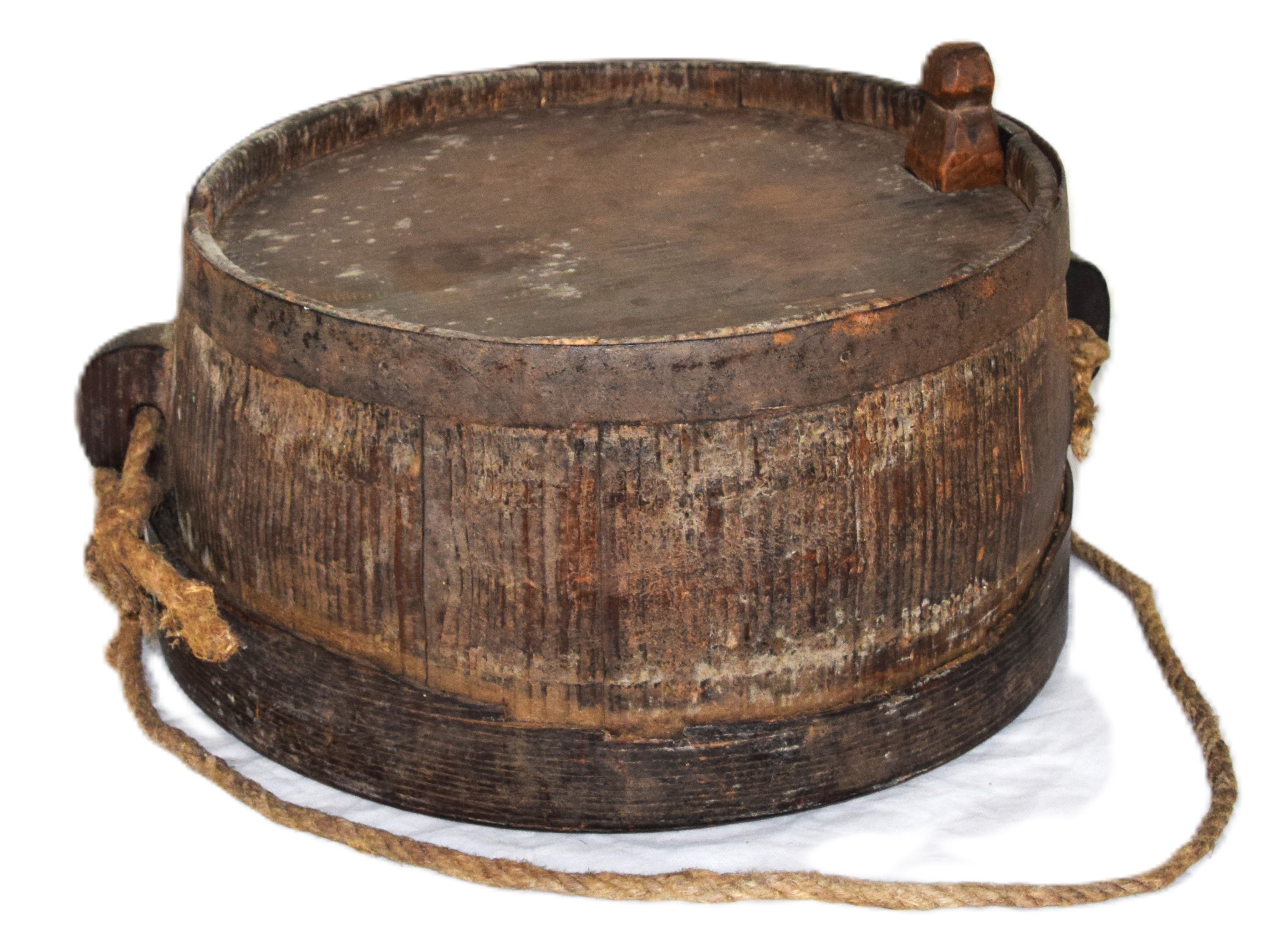 Revolutionary War/War of 1812 large black powder keg probably used for artillery or re-supply. Wooden keg with one metal band , wooden stopper, rope handles. Dimensions: 8″ H, 15″ Diameter