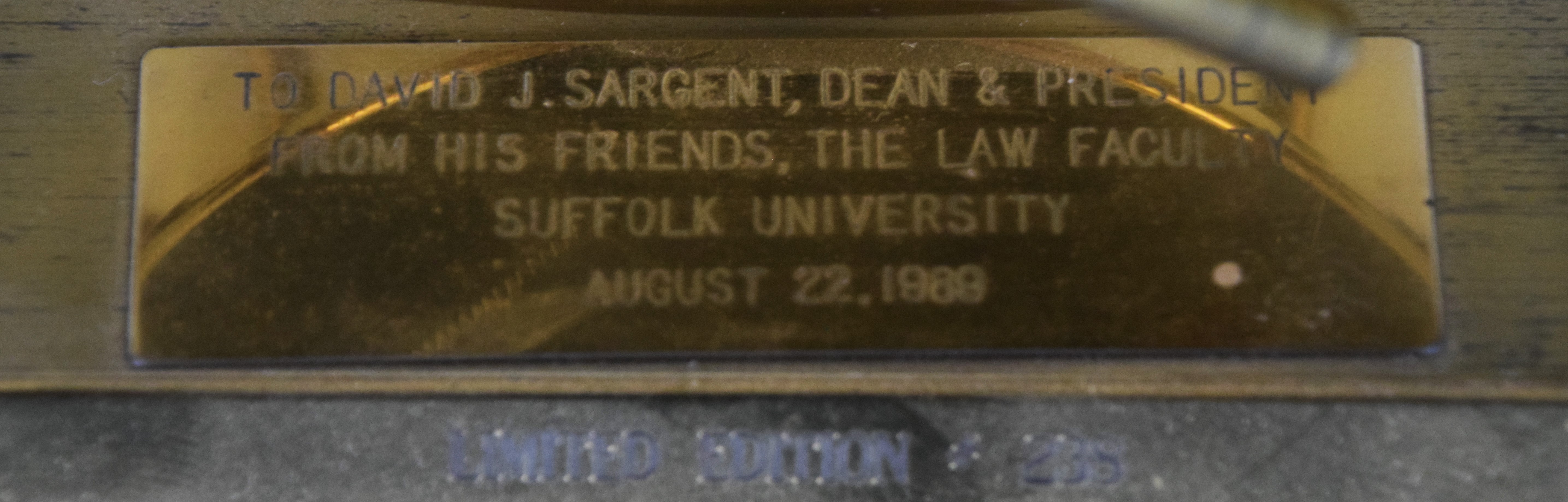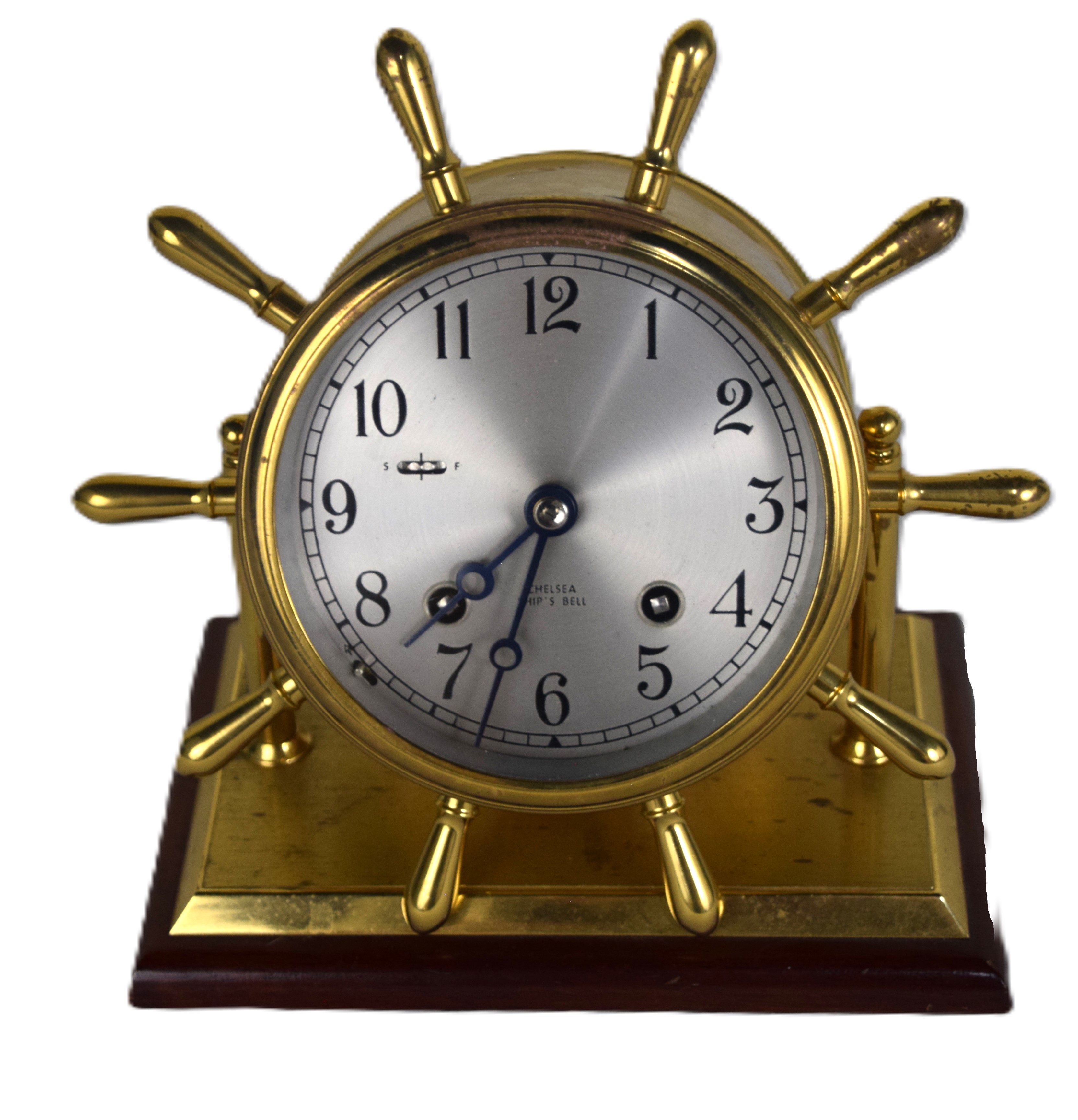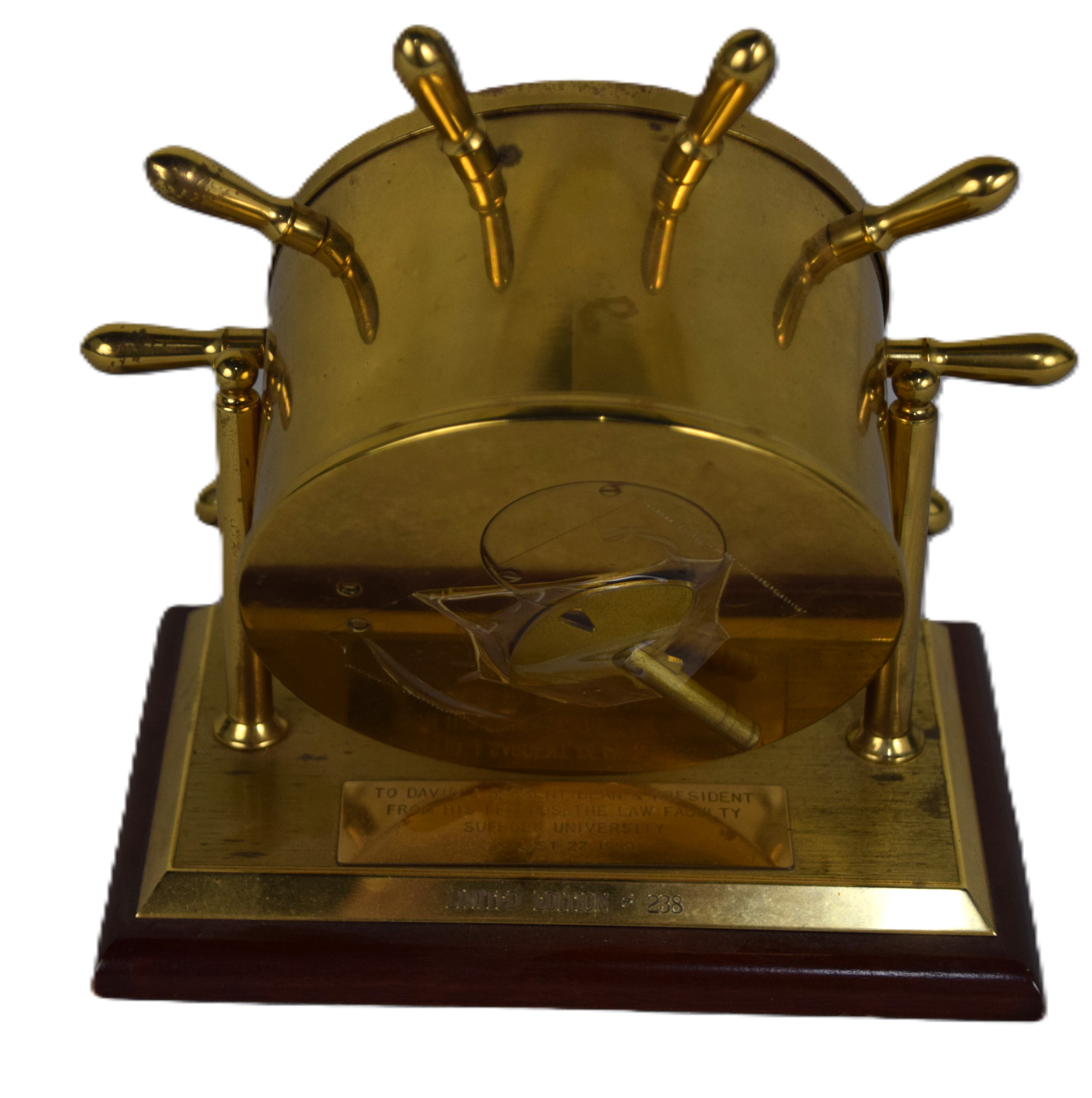 Brass Chelsea ship’s bell clock with mark on dial, with ship’s wheel design on a brass and wooden base. Limited edition #238. With a presentation “To David J. Sargeant, Dean and President, From his friends, the Law Faculty, Suffolk University”. From the David Sargent Collection, New London, NH. Dimensions: 4″ Dial