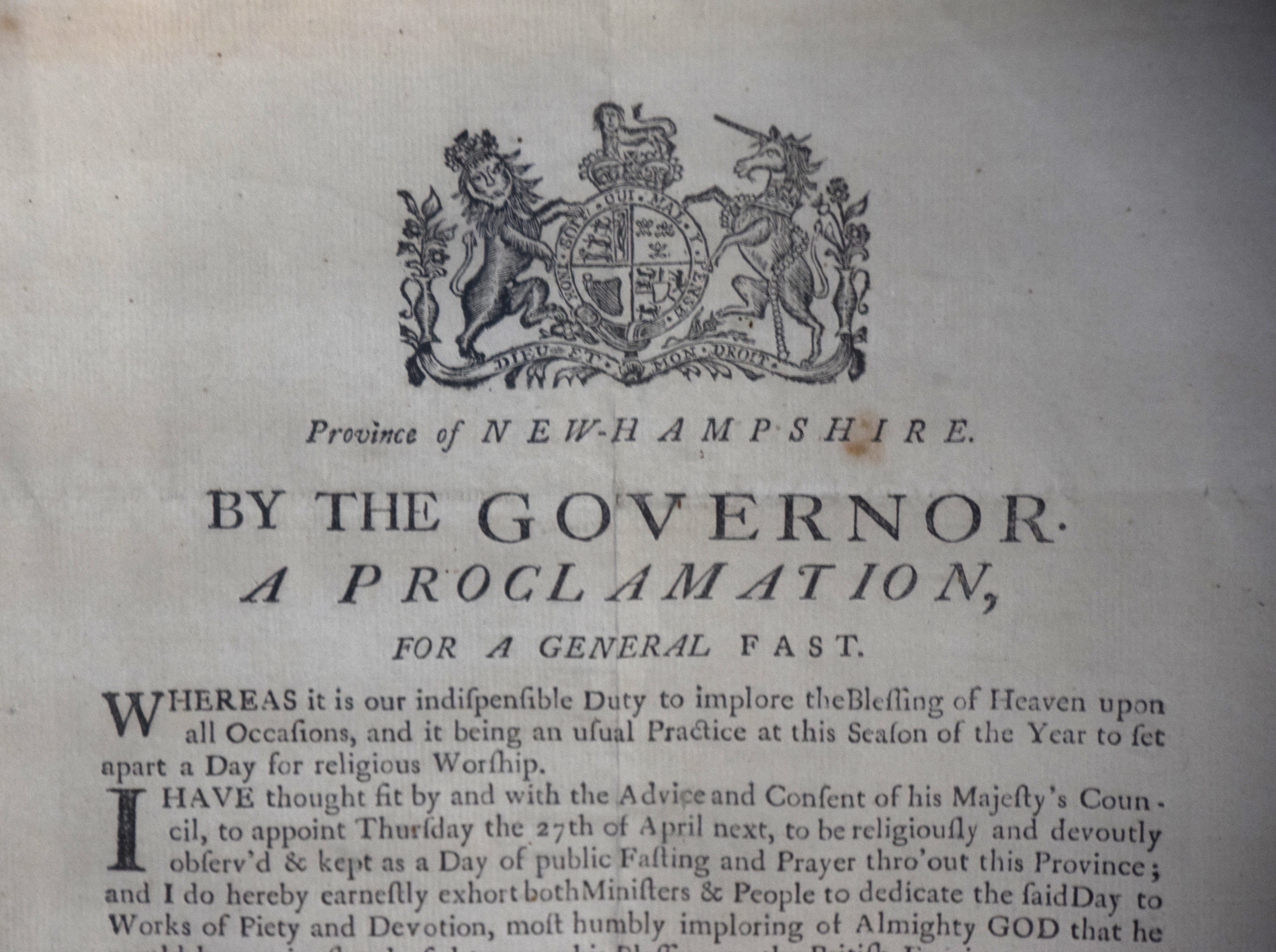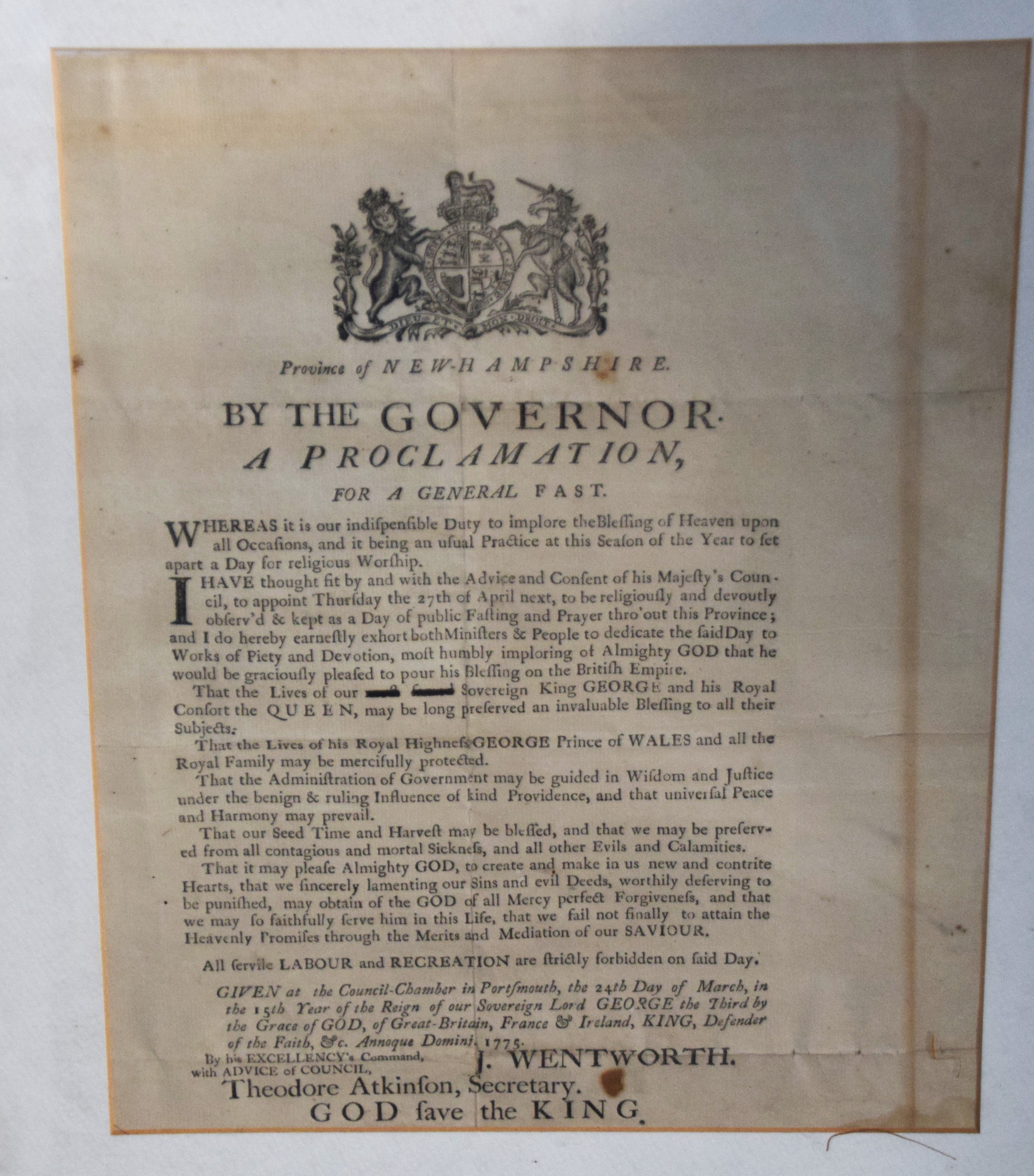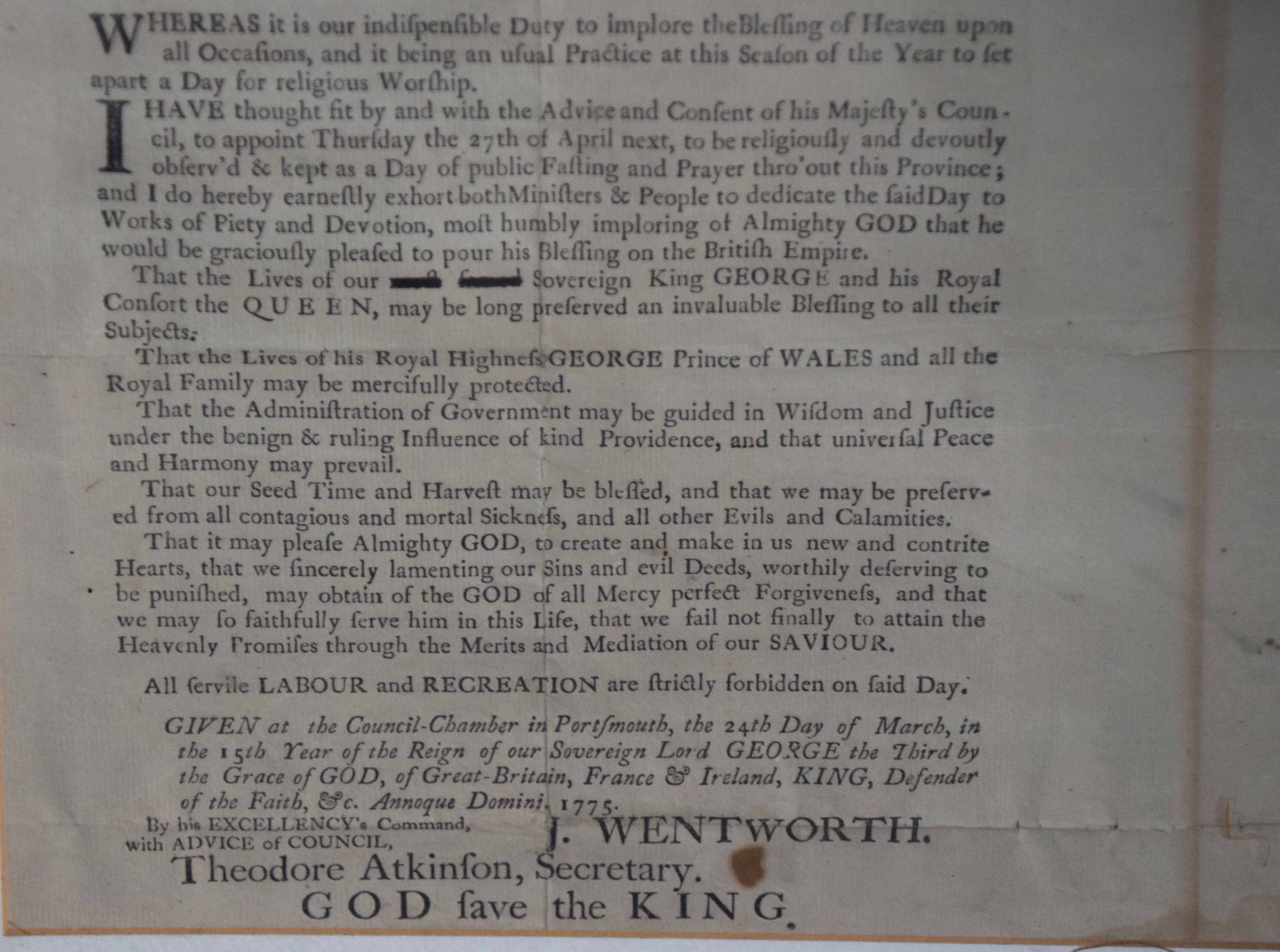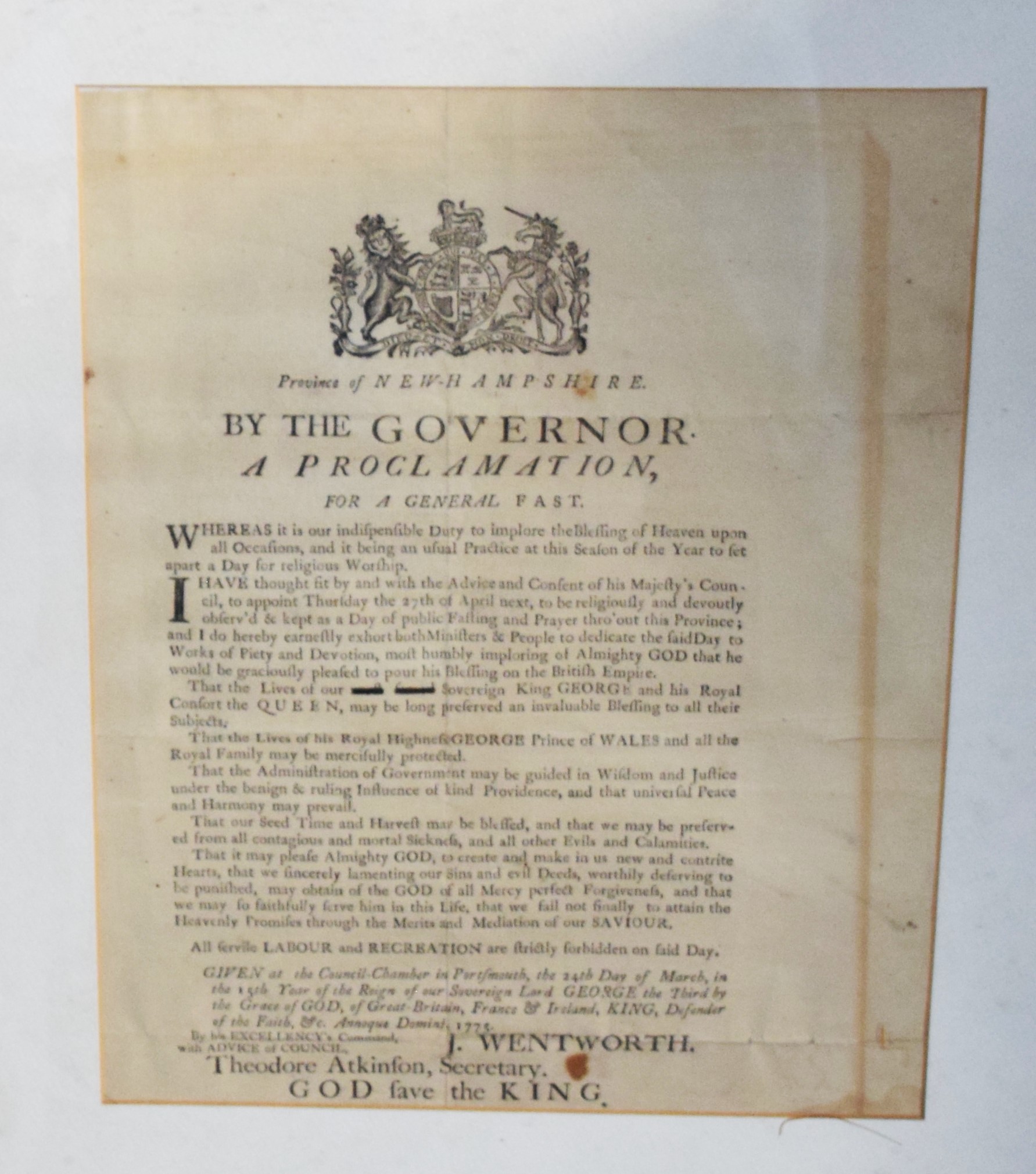A framed proclamation by Governor Wentworth of New Hampshire proclaiming a general fast and prayer for King George and his family. Proclaimed in Portsmouth, NH on 24 March 1775. Note on 19 April 1775 the battle of Lexington and Concord took place. Governor Wentworth soon fled to Nova Scotia. This is a rare and probably his last proclamation. Also note the words “most favored” was deleted in front of Sovereign King. On 1700s laid paper. Dimensions: 13.5″ x 10″, 22″ x 17″