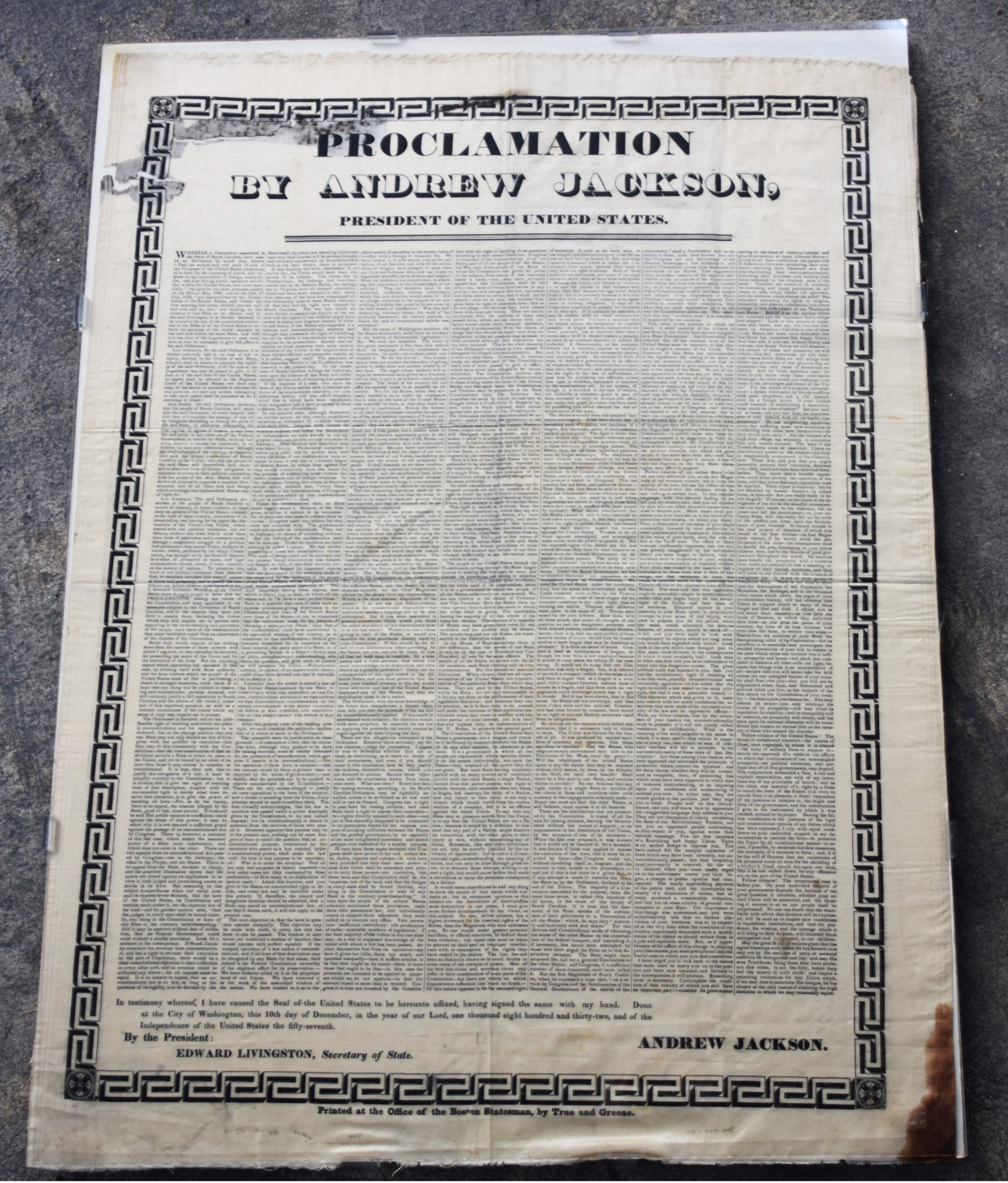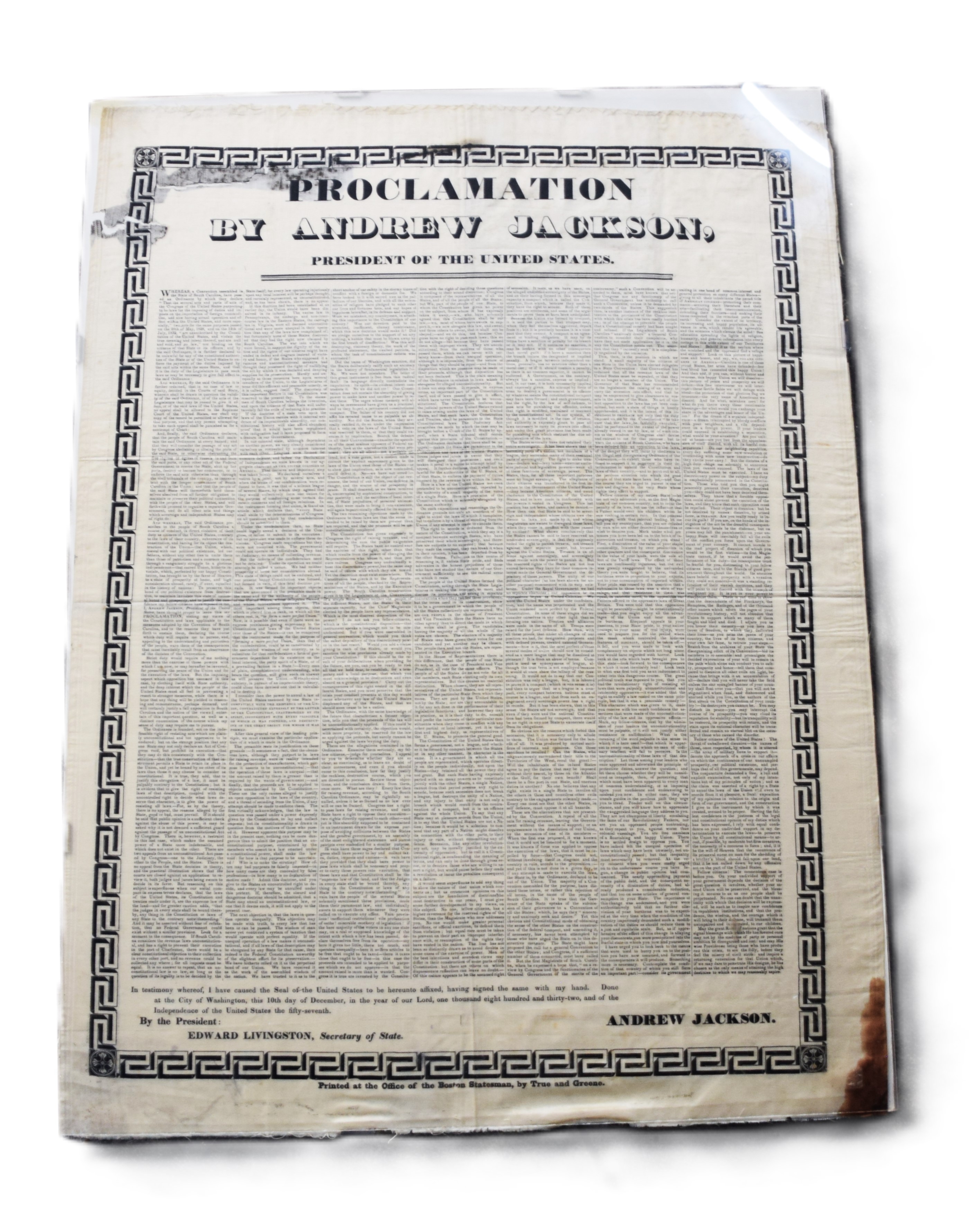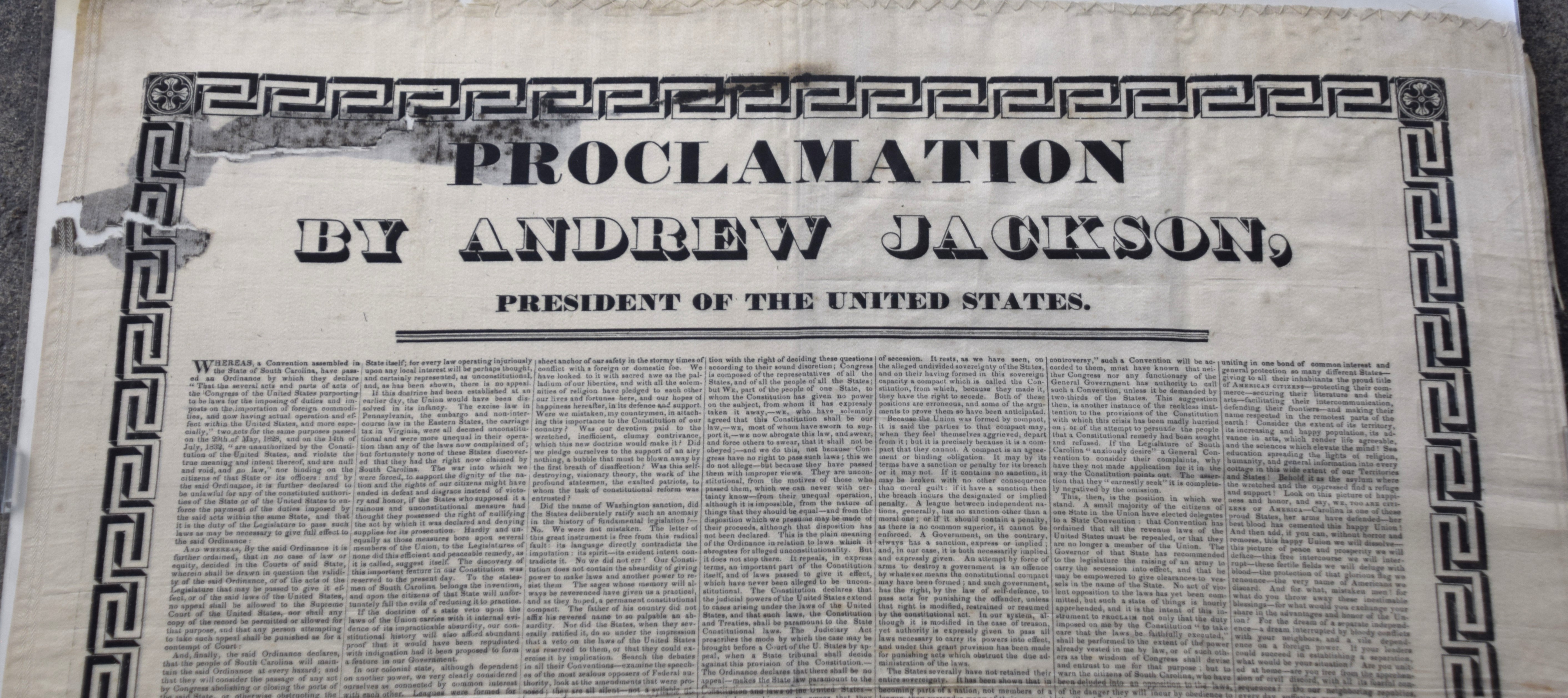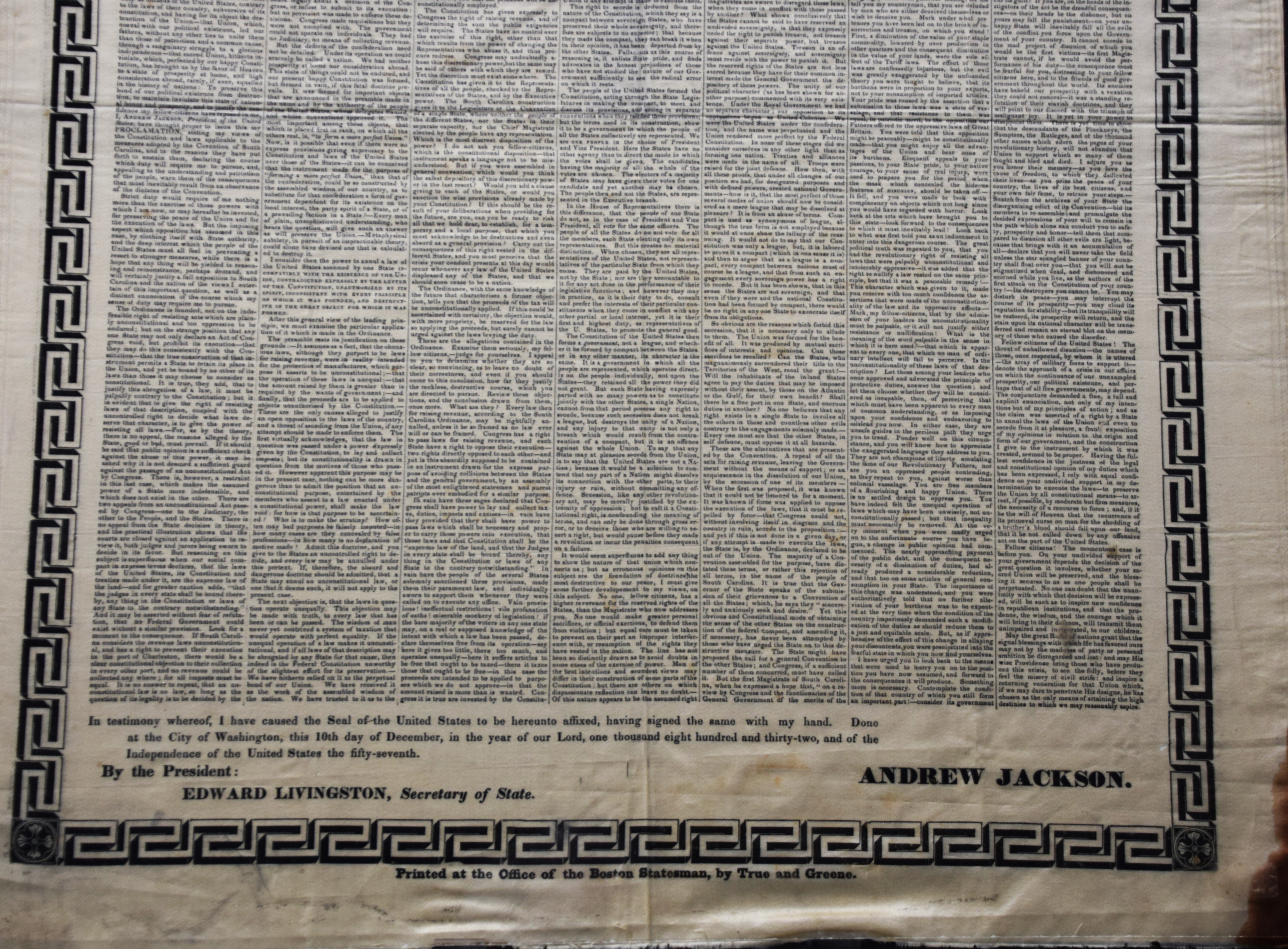 A proclamation on silk by President Andrew Jackson’s to South Carolina during the Nullification crisis of 1832. The Nullification Crisis was a significant conflict between South Carolina and the federal government over tariffs, highlighting tensions between state rights and federal authority, ultimately foreshadowing the Civil War. On December 10, 1832, Jackson issued his “Proclamation to the People of South Carolina,” asserting the supremacy of the federal government and warning that “disunion by armed force is treason.” The proclamation states “The ordinance (nullification) is founded, not on the indefeasible right of resisting acts which are plainly unconstitutional and too oppressive to be endured but on the strange position that any one state may not only declare an act of Congress void but prohibit its execution…” Dimensions: 27″ x 20″