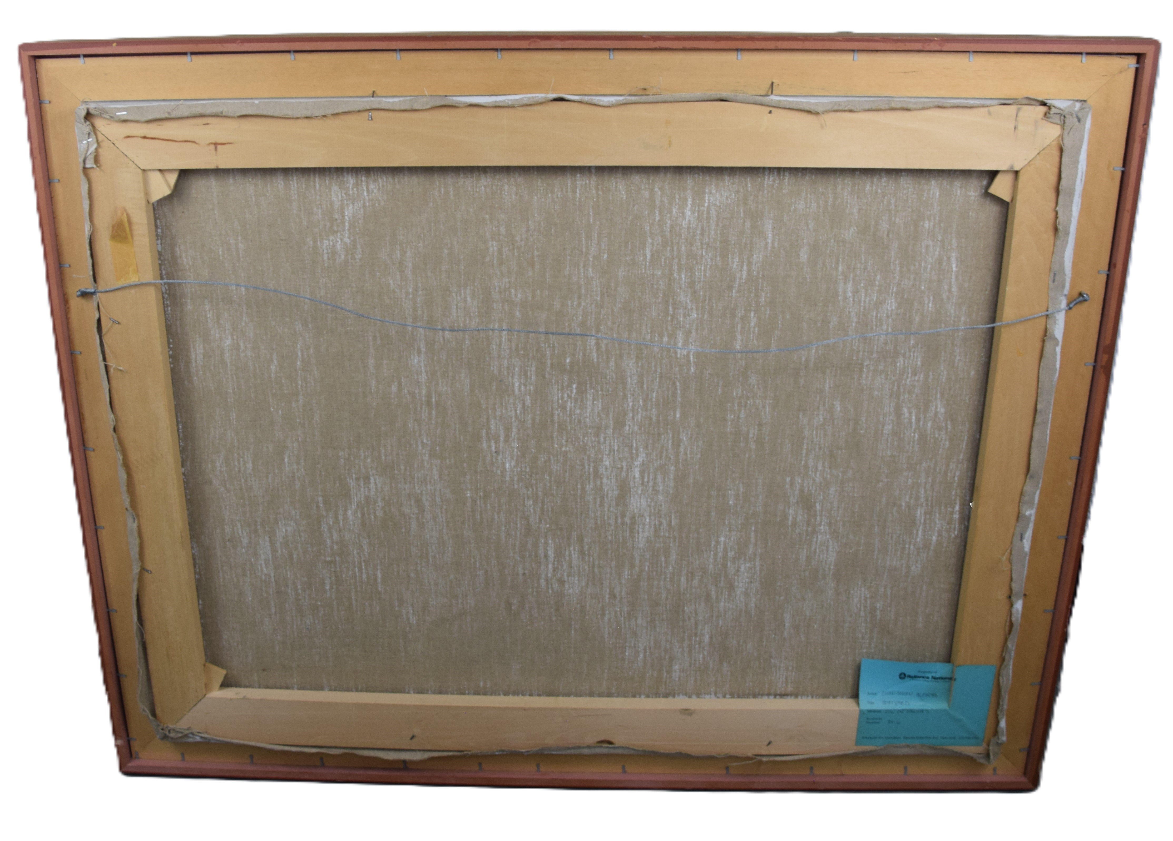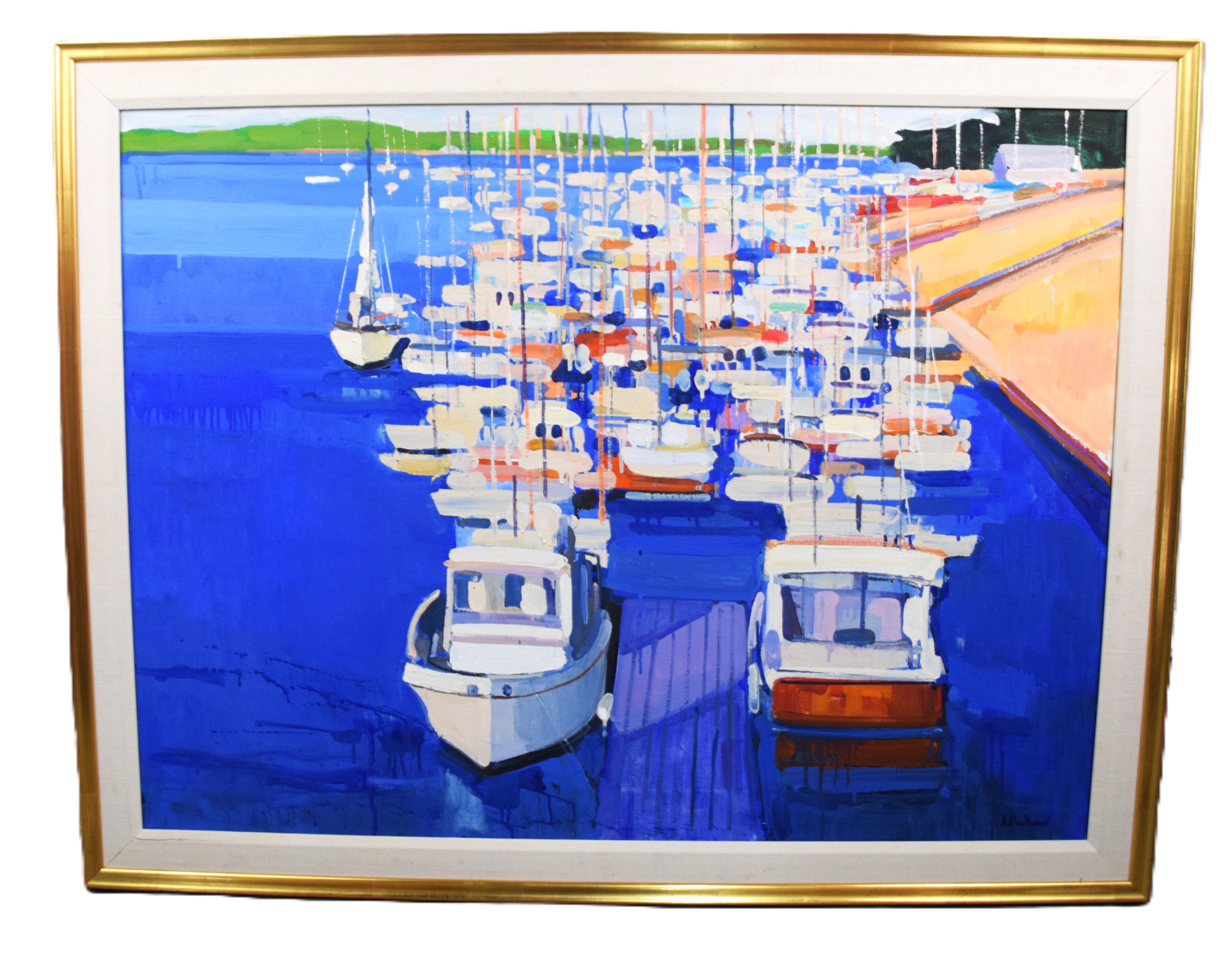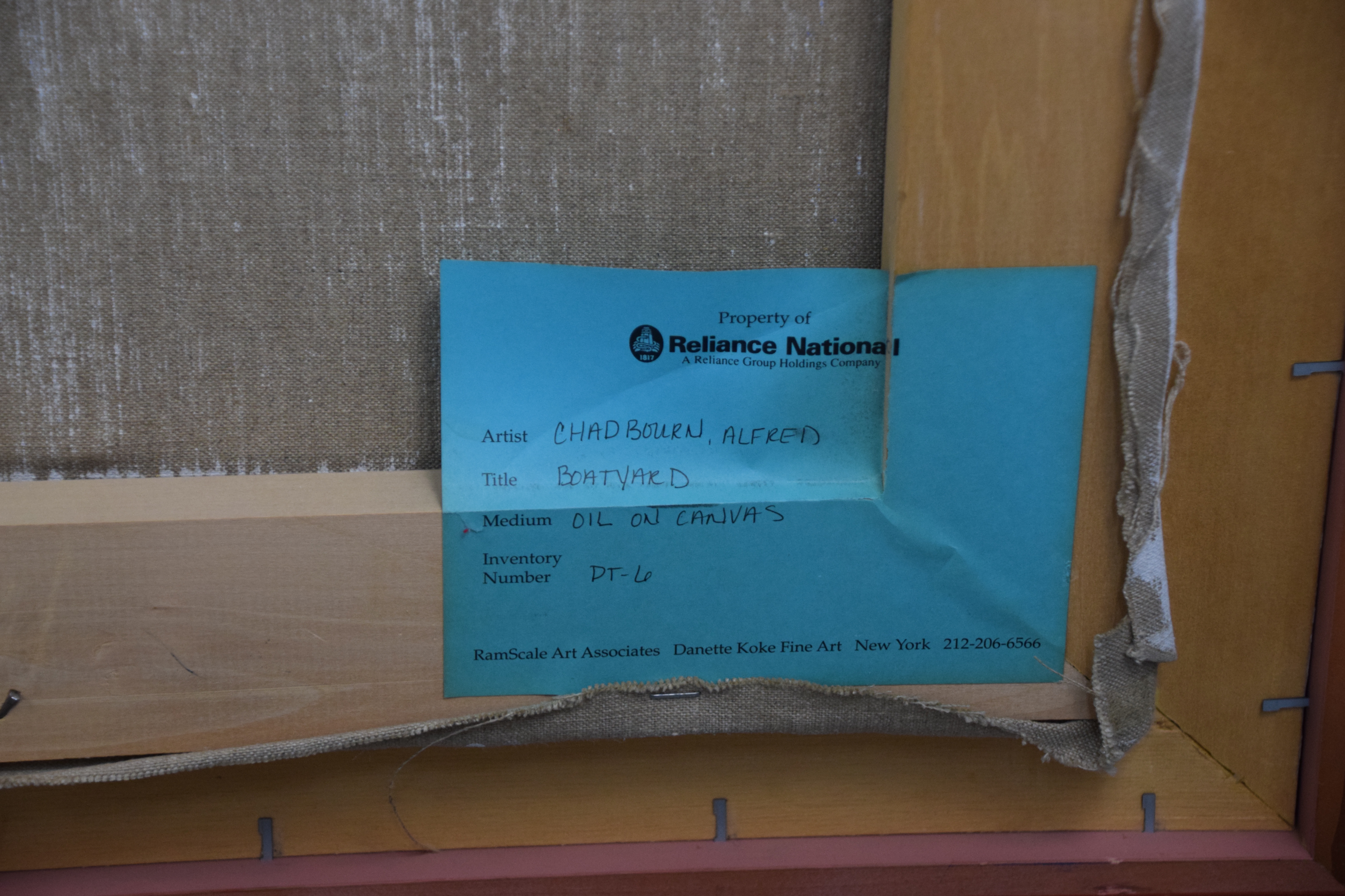 Framed oil on canvas boatyard scene by Alfred Chadbourn, signed lower right. Alfred Cheney Chadbourn (1921 – 1998) was a member of the National Academy of Design and worked primarily in Maine and is known for landscapes and still life. He taught art at Queen’s College in New York and at the Portland Art School in Maine from 1973 to 1981 Dimensions: 30″ x 40″ Image size