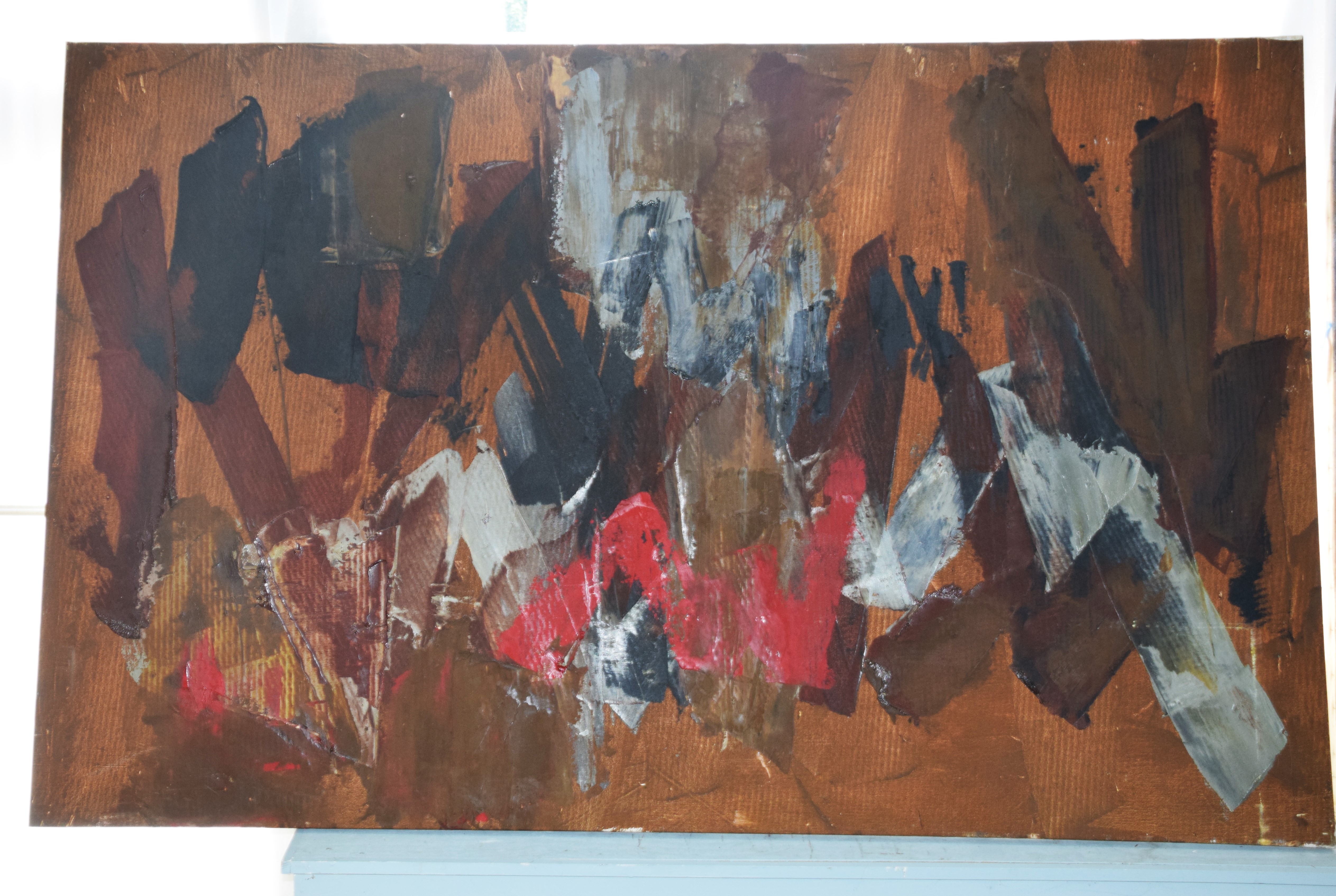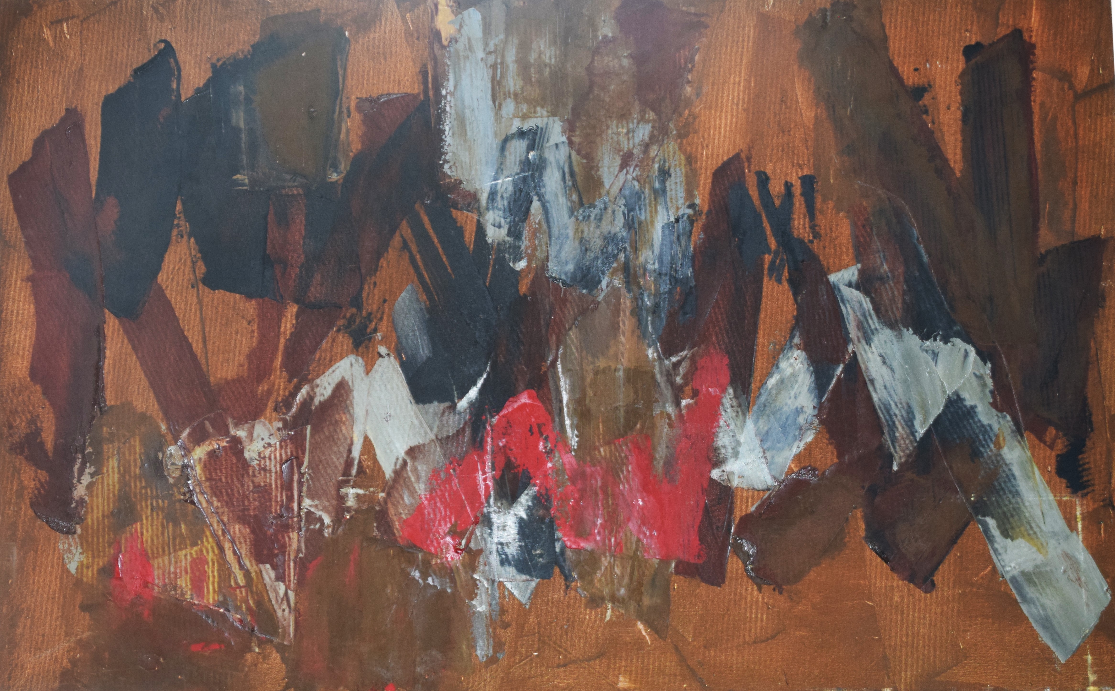 A Gestural abstract painting, with brown and black colors. Elyssa Rundle (1932 – 1994) worked in New York and Pennsylvania and is known for Gestural abstract painting (Vincent van Gogh was also known for Gestural techniques). She opened a studio on West 23rd Street in New York City and became a member of the New York School of Gestural Abstract Expressionism. Rundle took bolder risks in her approach to color, composition and proportion, encouraged by the interaction with fellow artists and feed-back by noted art critics of her time including supporters Clem Greenburg and John Russell. Three years after her death, in 1997, her collection of work won a grant from the Judith Rothschild Foundation, established for the purpose of bringing recognition to highly talented, deceased artists. The Rothschild Grant helped create an inventory of the collection, and an exhibit and catalogue called: The Spirit of the Paint, by the Berman Museum. This artwork is from that collection. Dimensions: 48″ x 76″