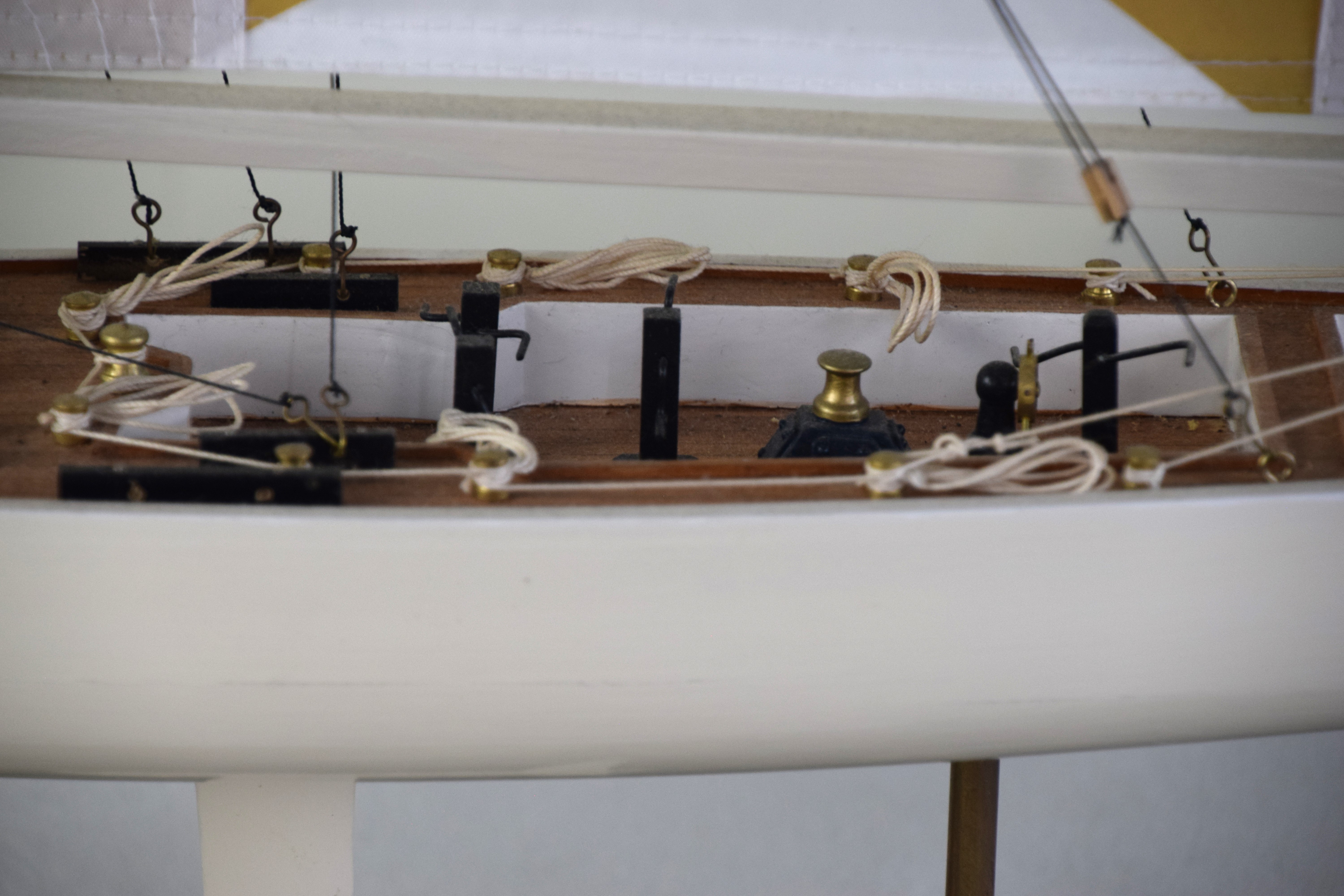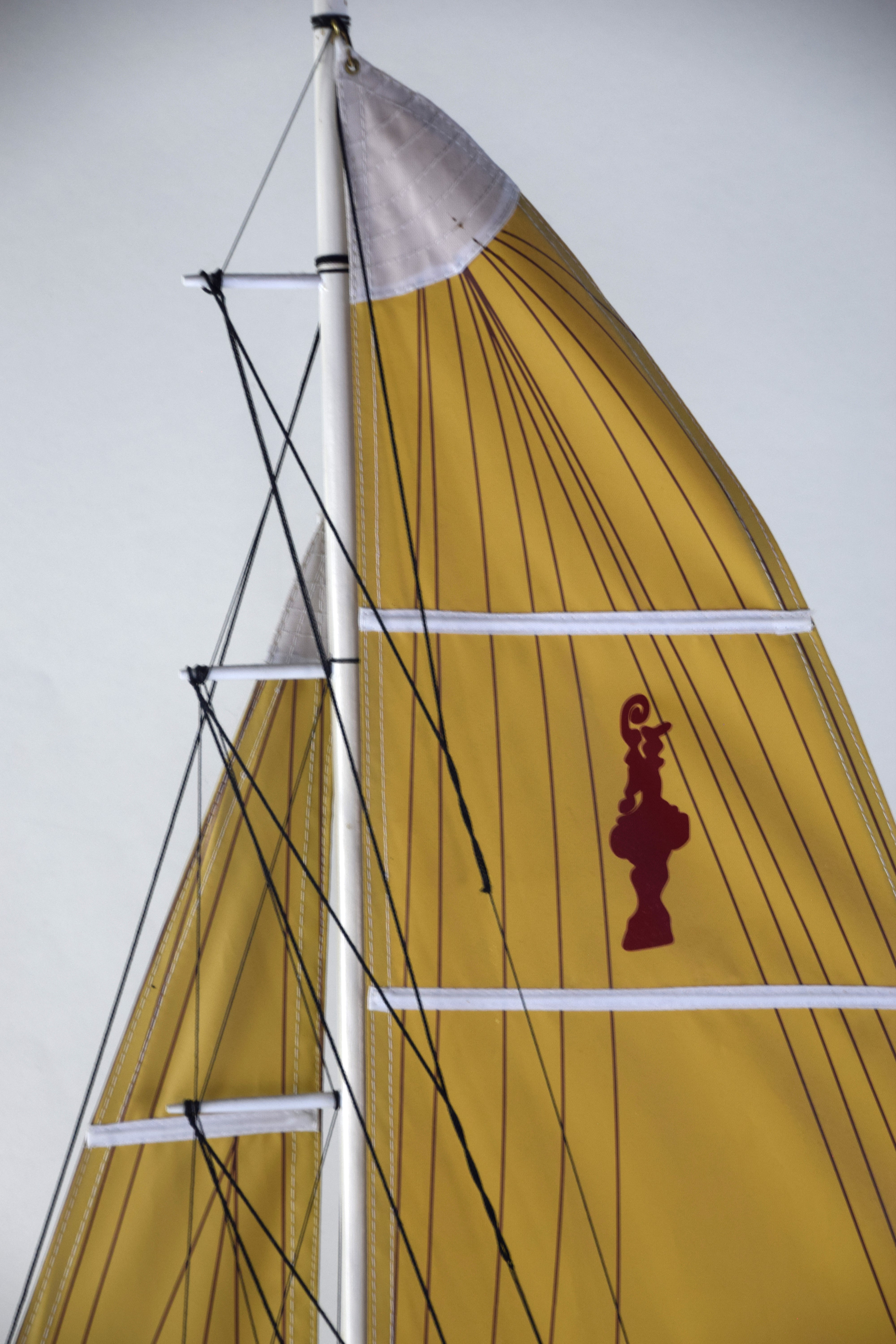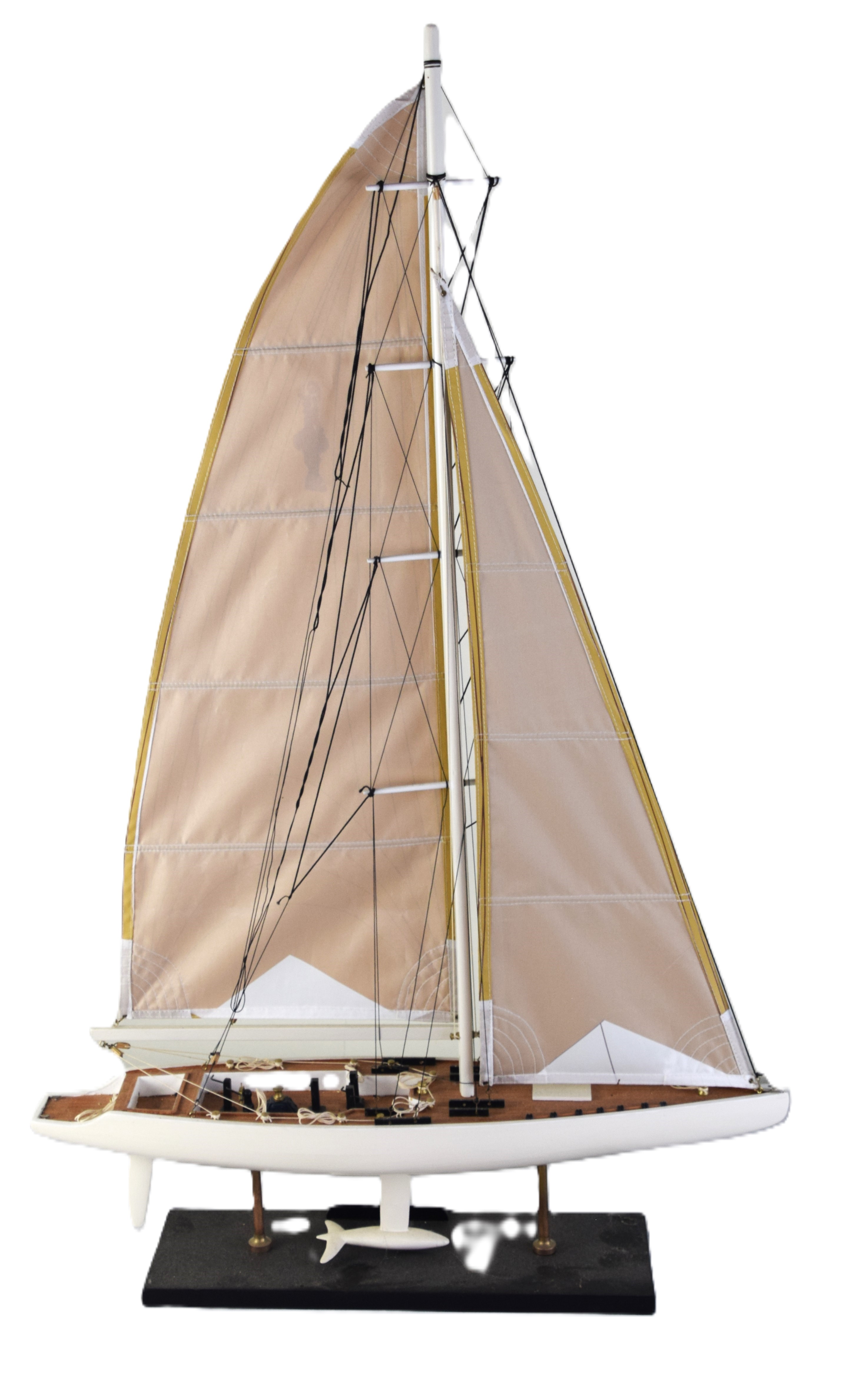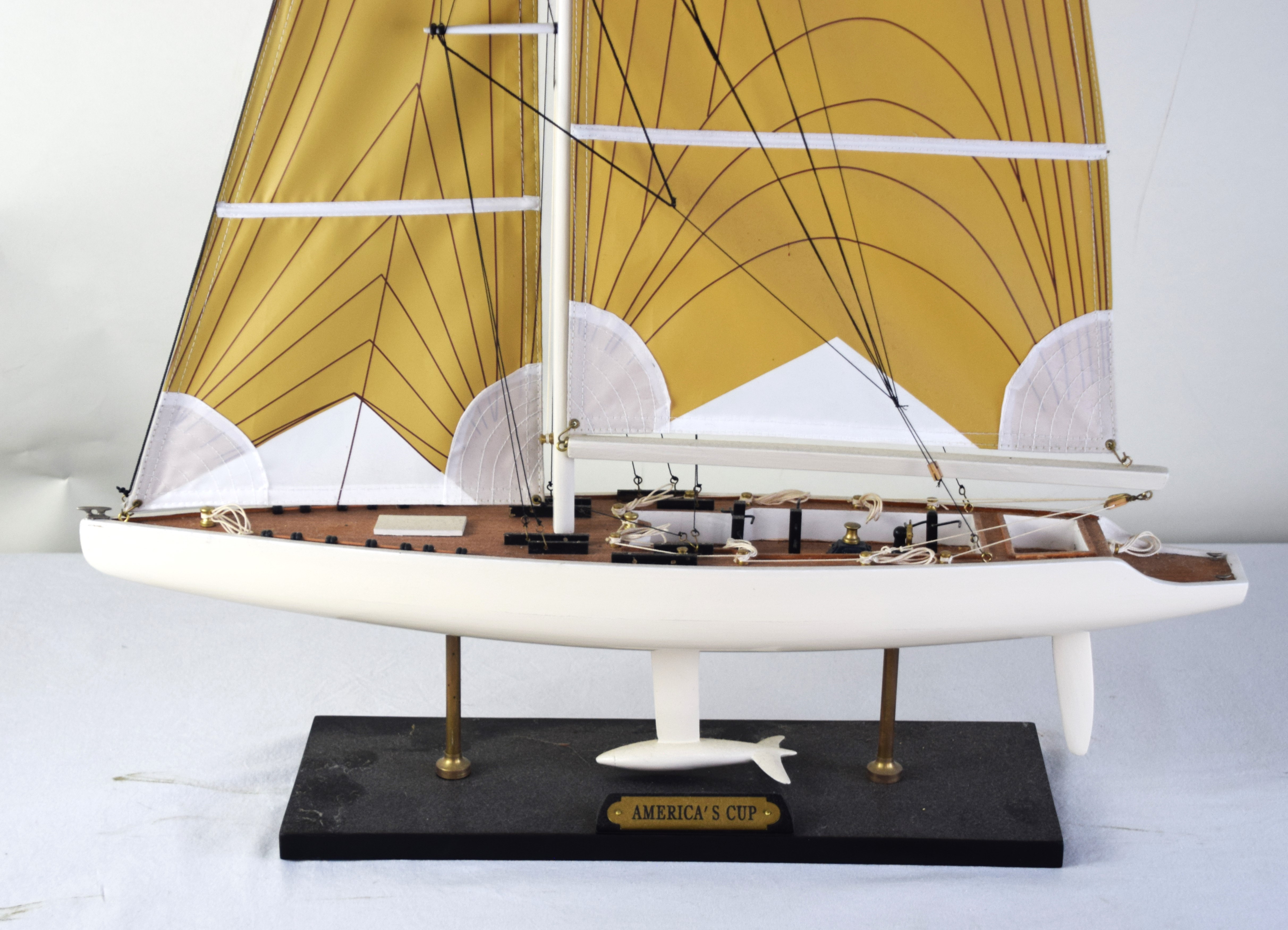 America’s Cup sailing ship model with a double sailing mast and with a label “America’s Cup”, resting on a wooden base. From the David Sargent Collection, New London, NH. Dimensions: 36″ H x 24″ L
